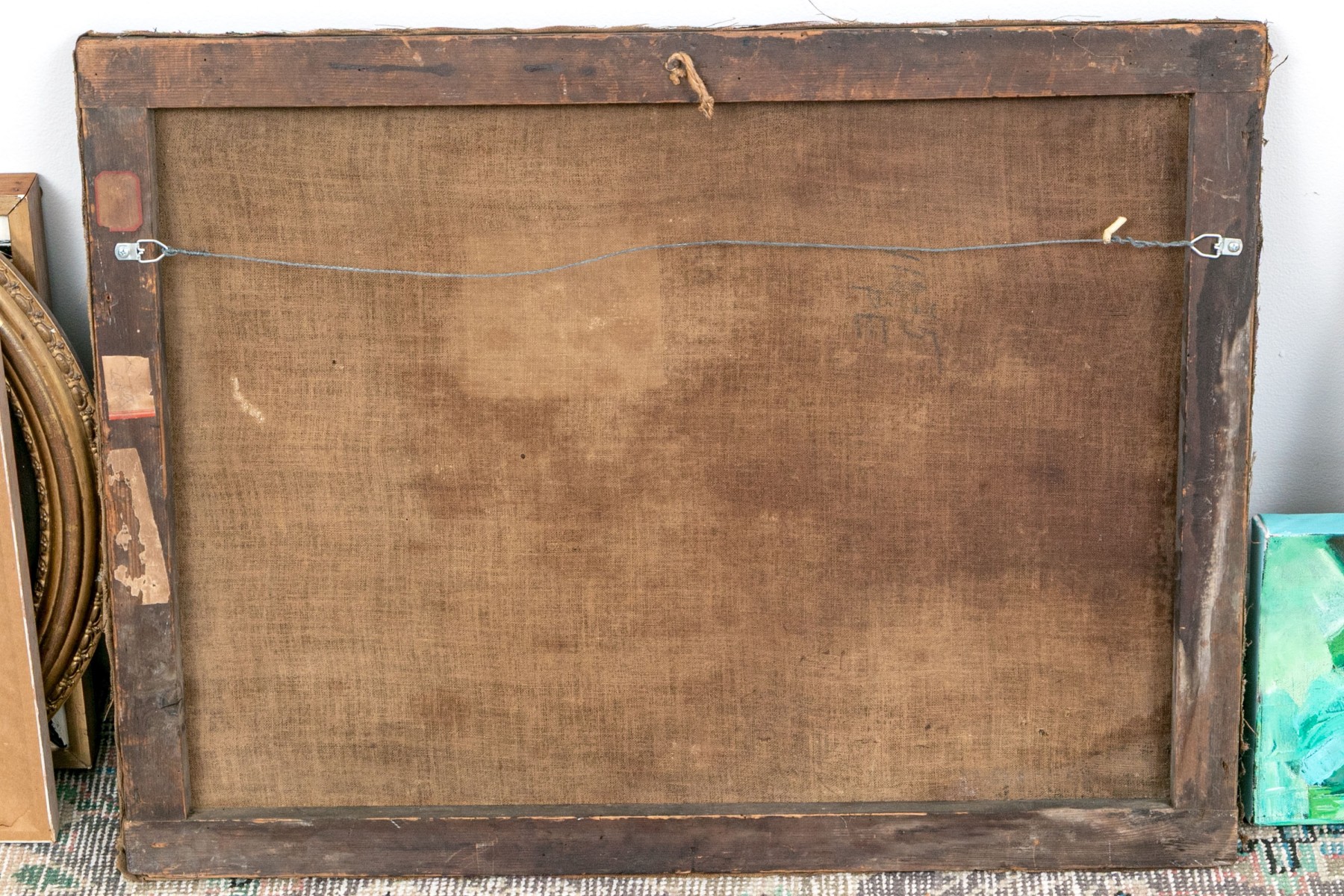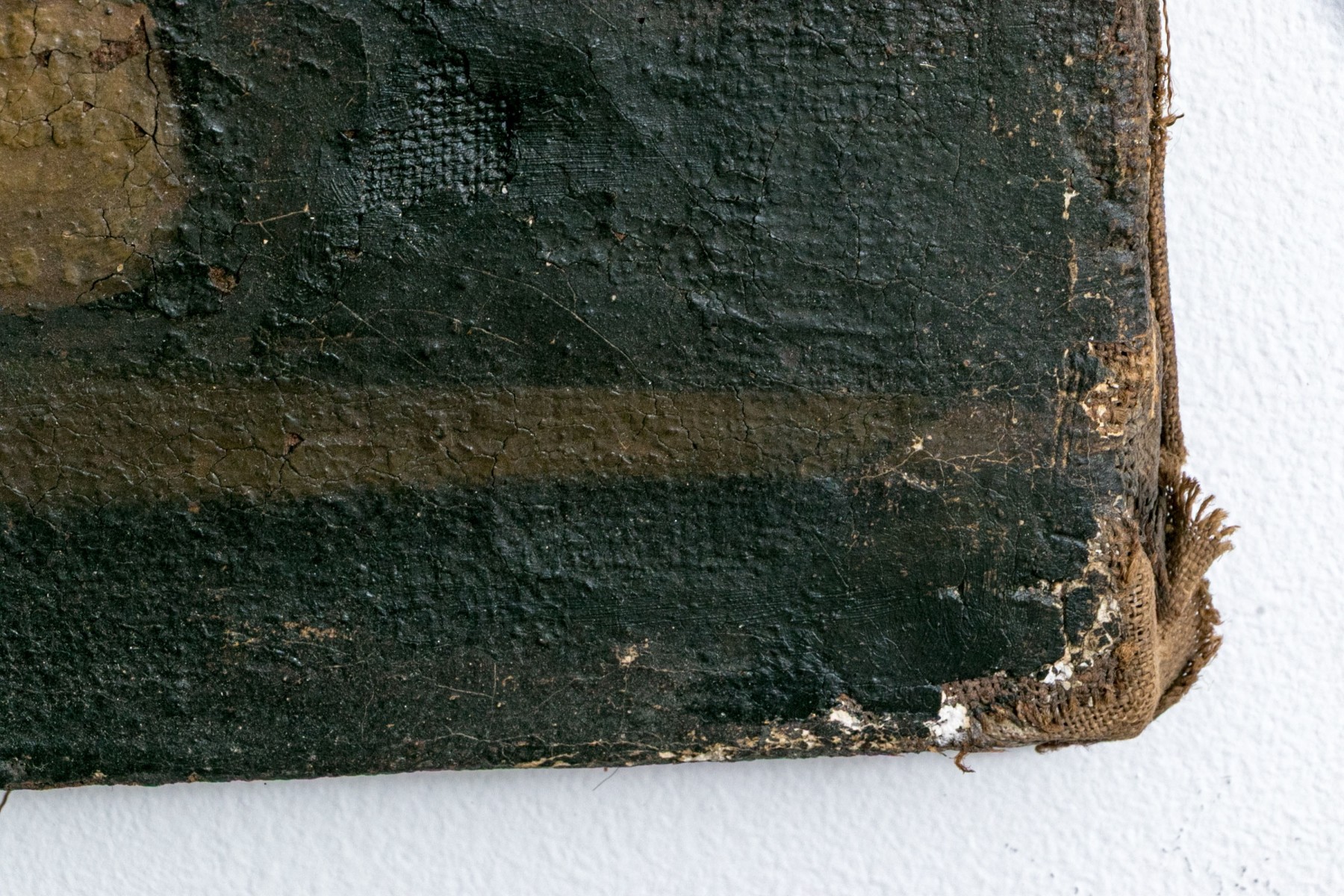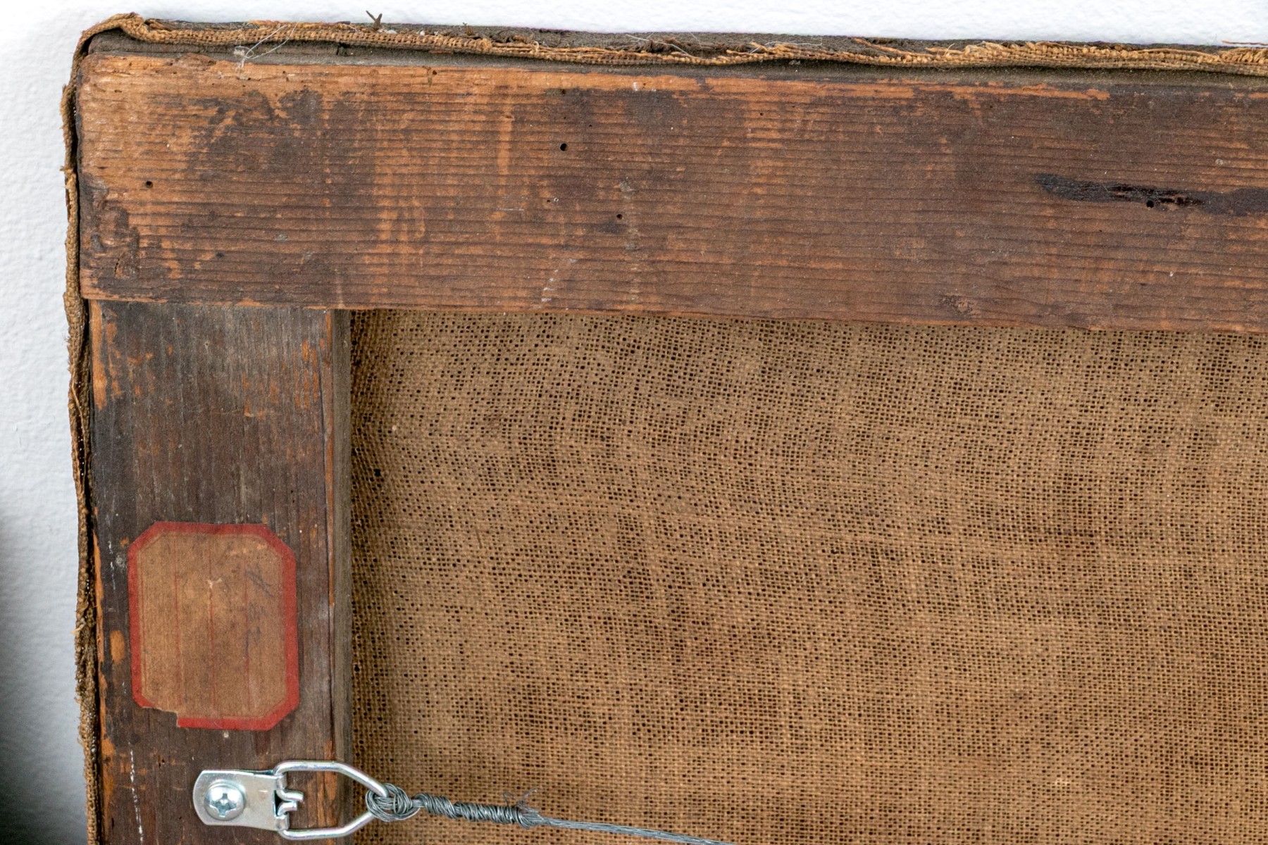 Wear including an approximately 2 1/2" tear to the canvas in the lower center, a water stain to the lower left corner, and spots of paint loss most notably a small area flaked off to the upper right.