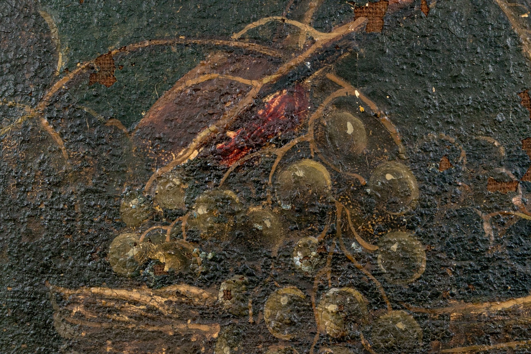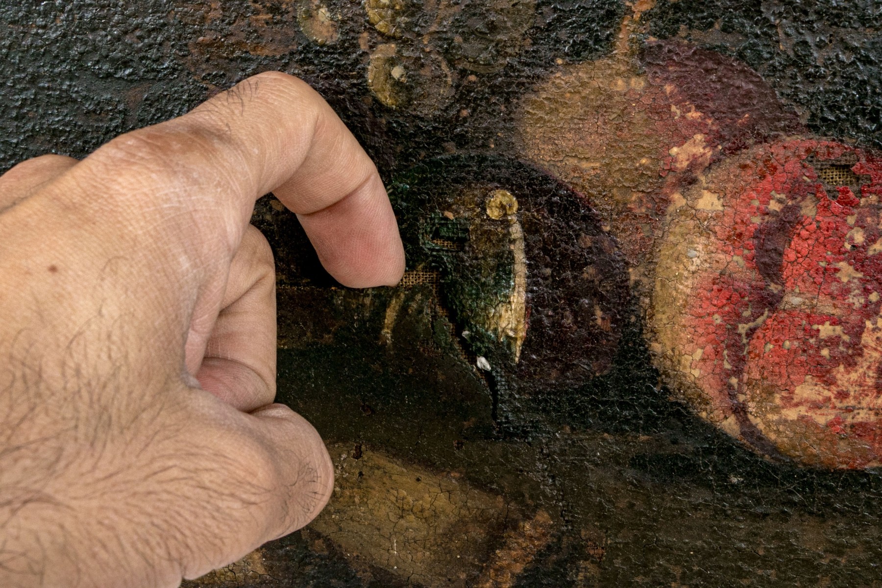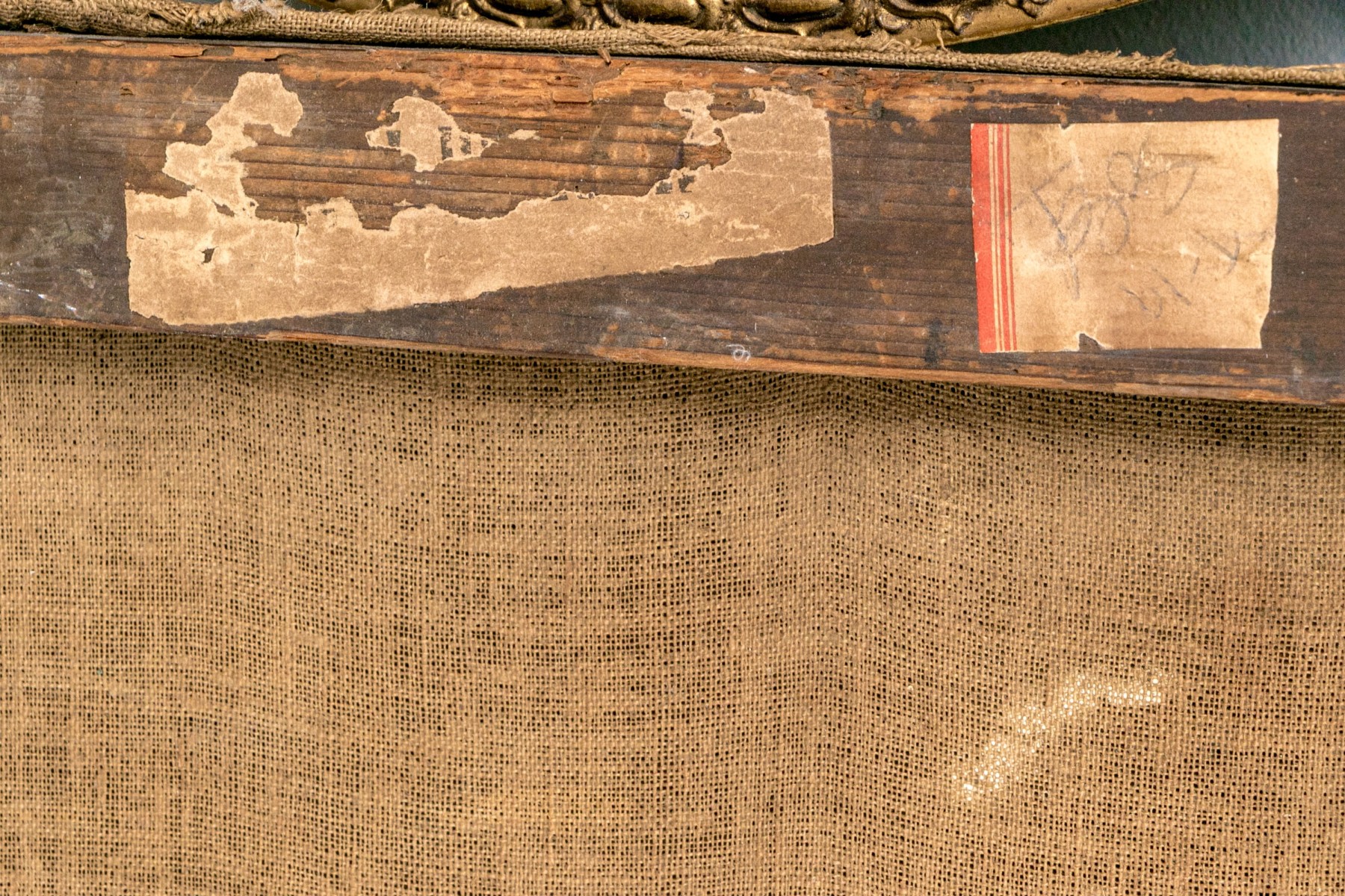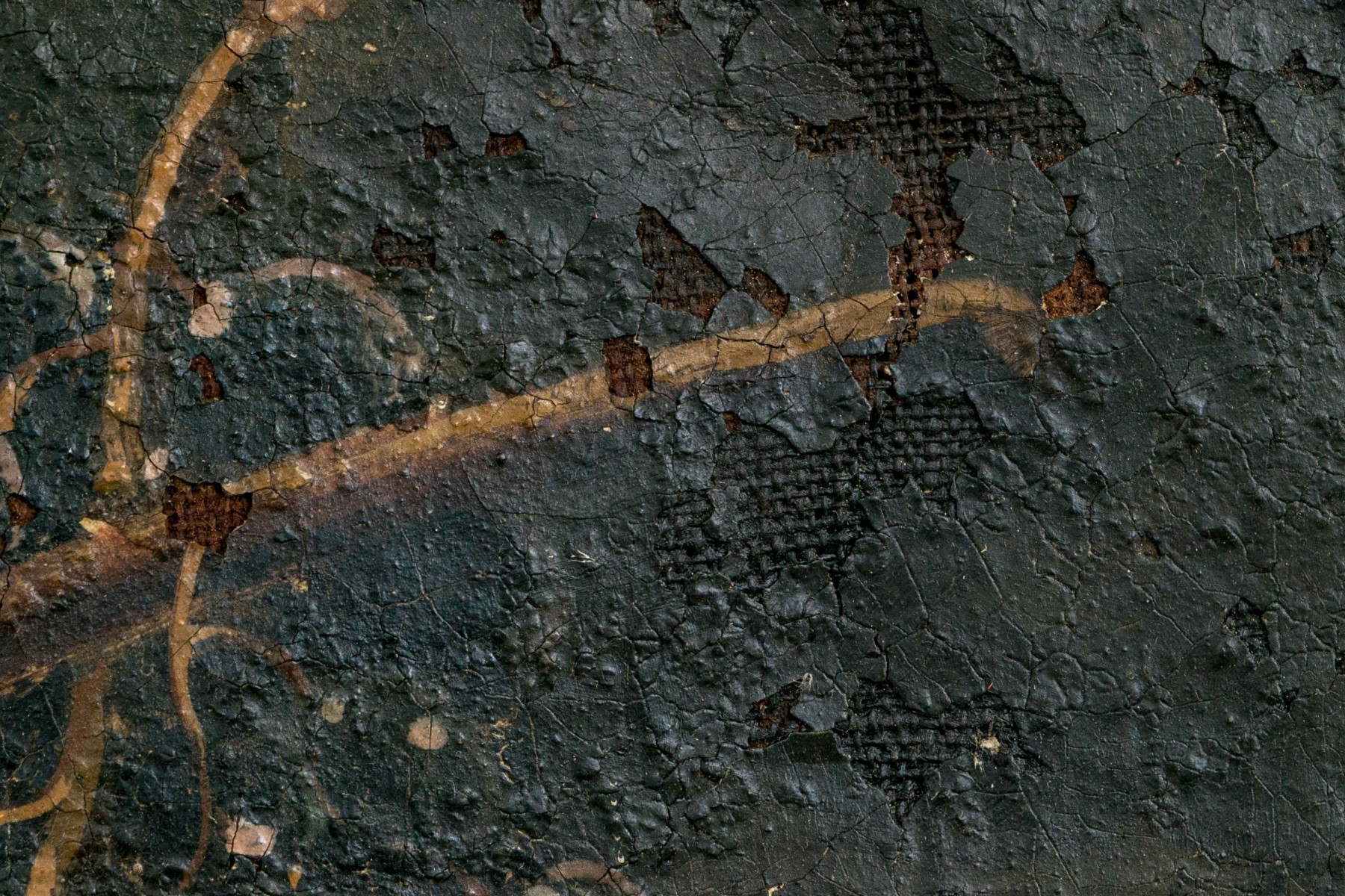 Wear including an approximately 2 1/2" tear to the canvas in the lower center, a water stain to the lower left corner, and spots of paint loss most notably a small area flaked off to the upper right.