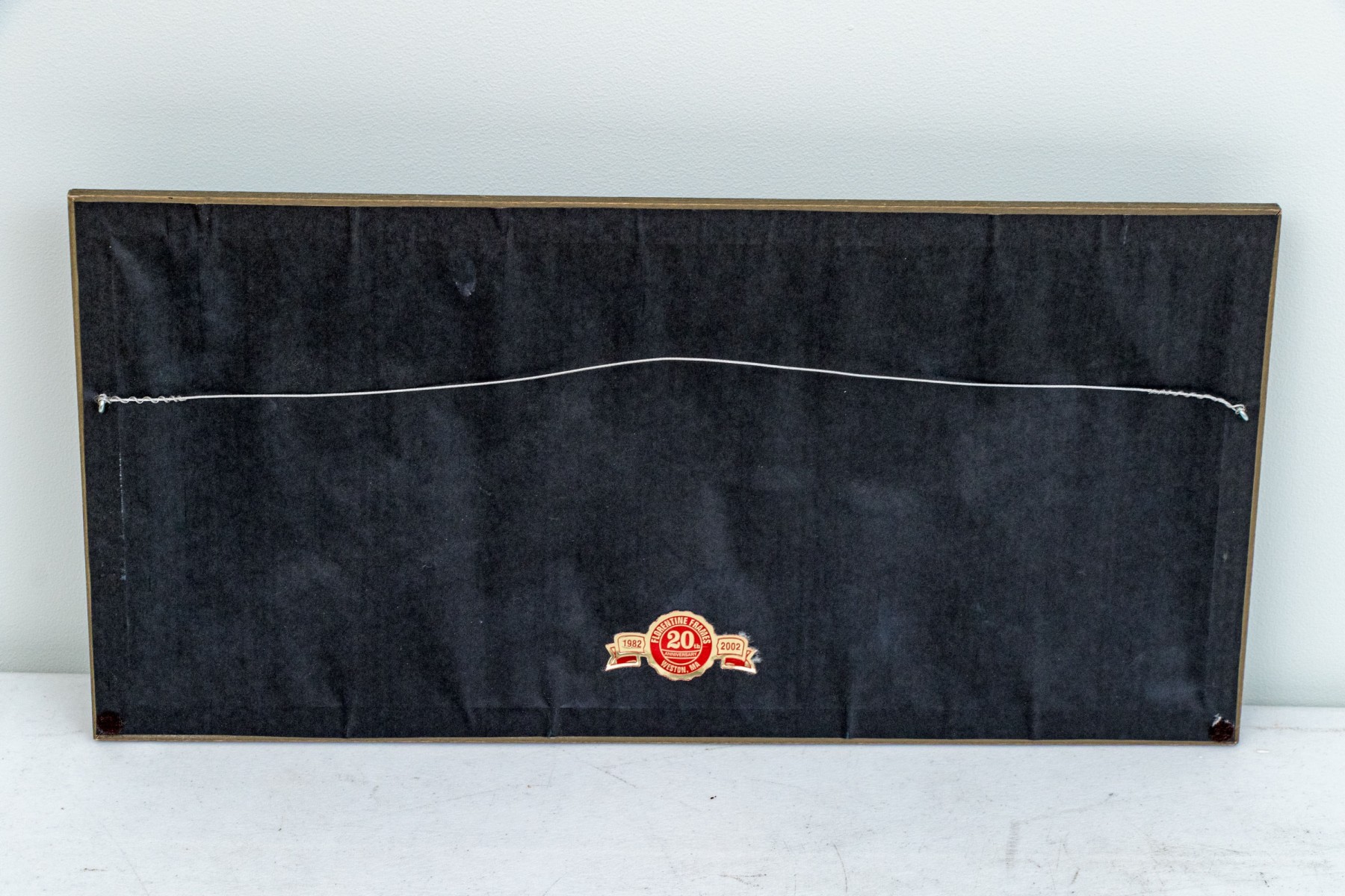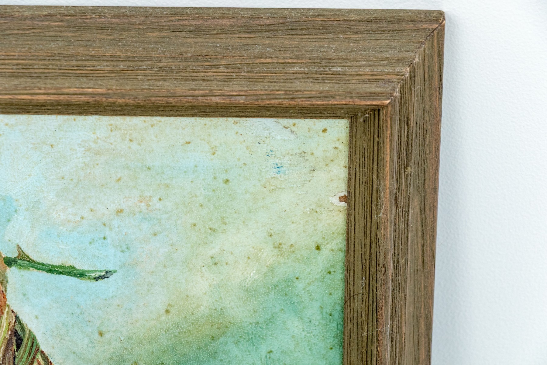 Losses to the painted finish with foxing to the canvas and scuffs.
