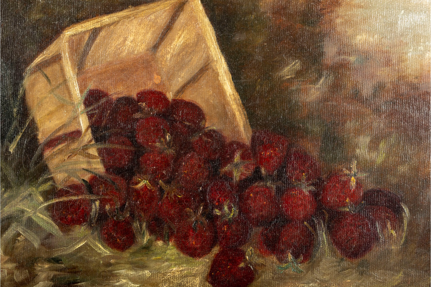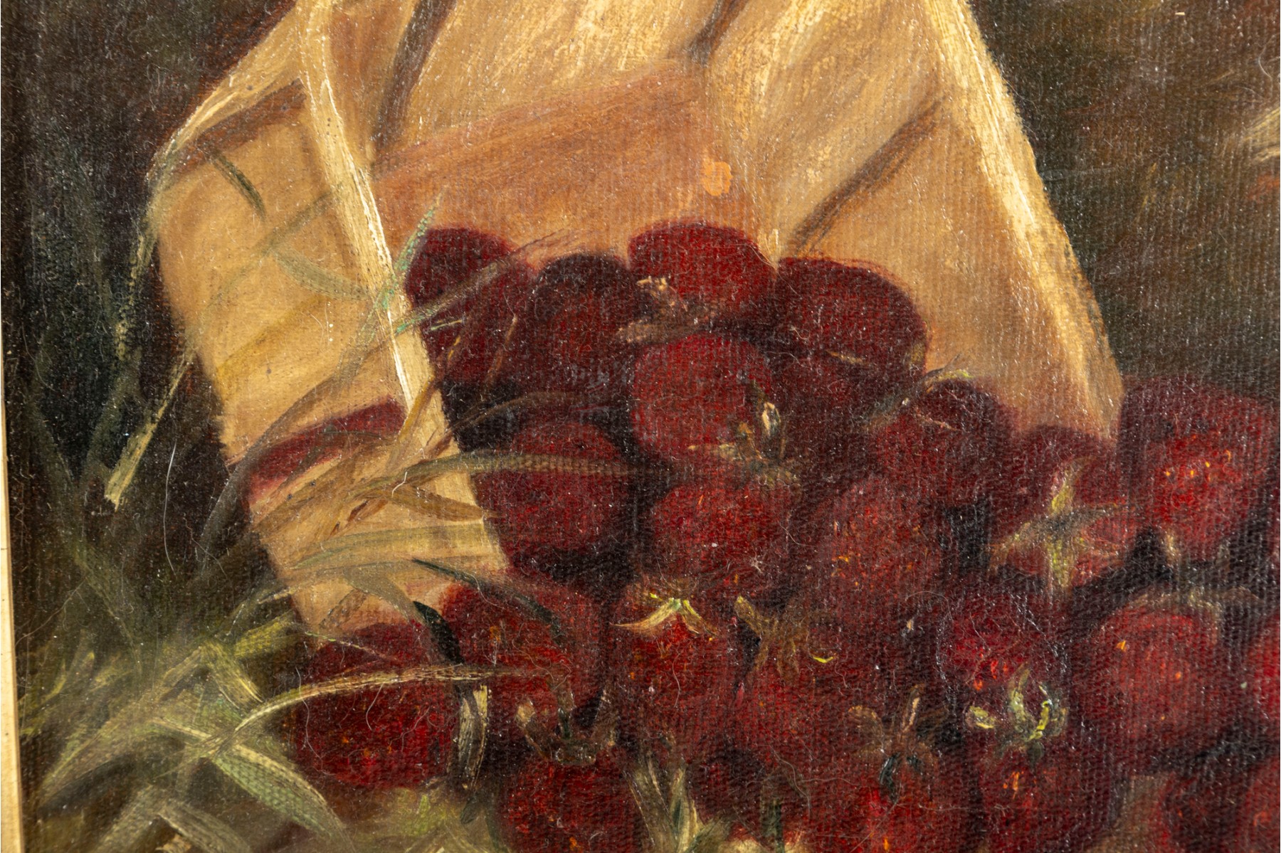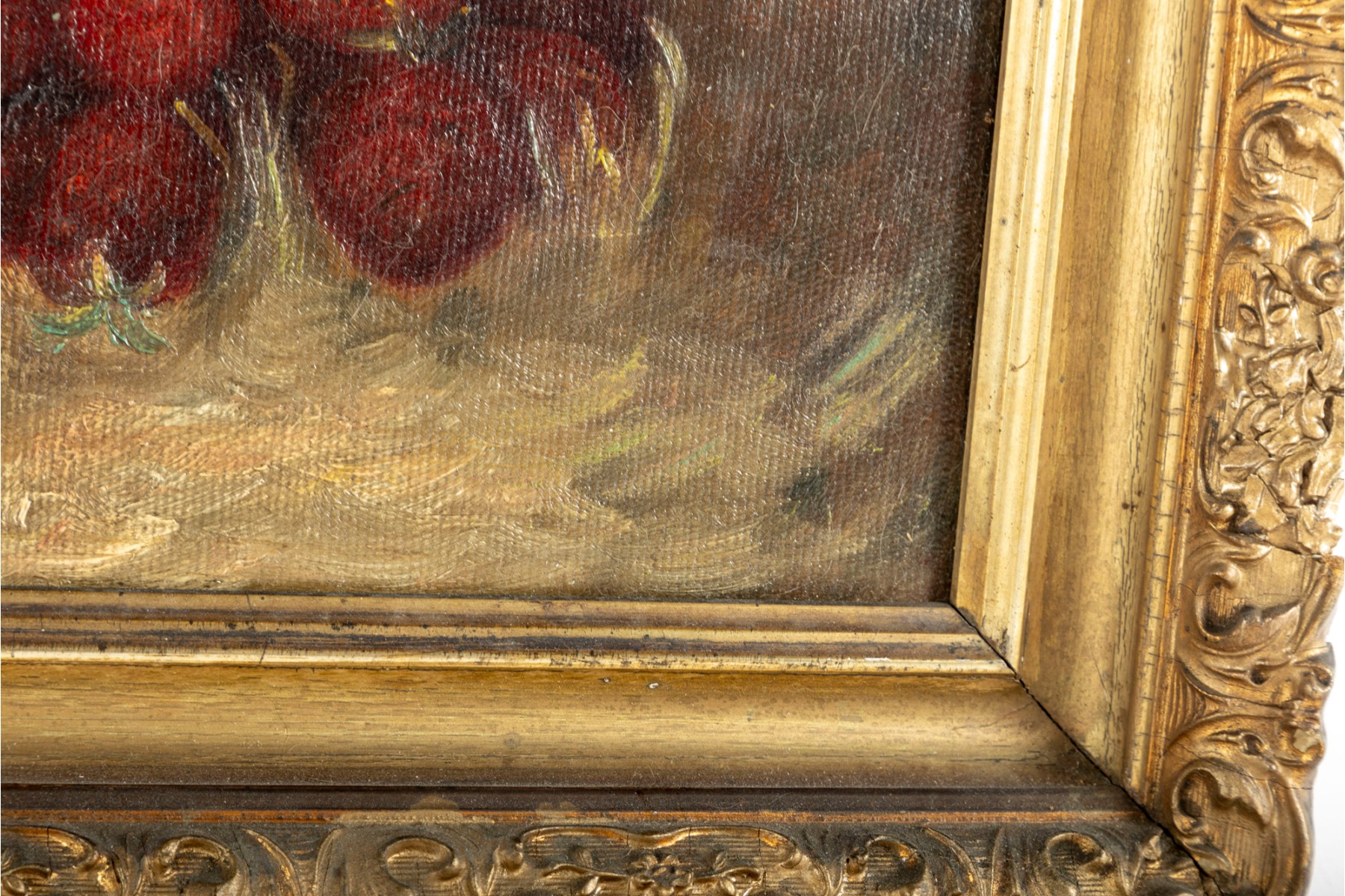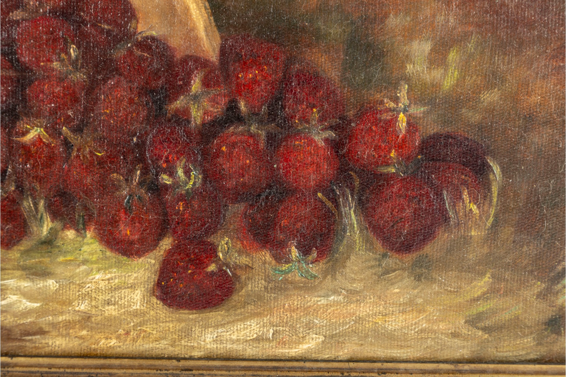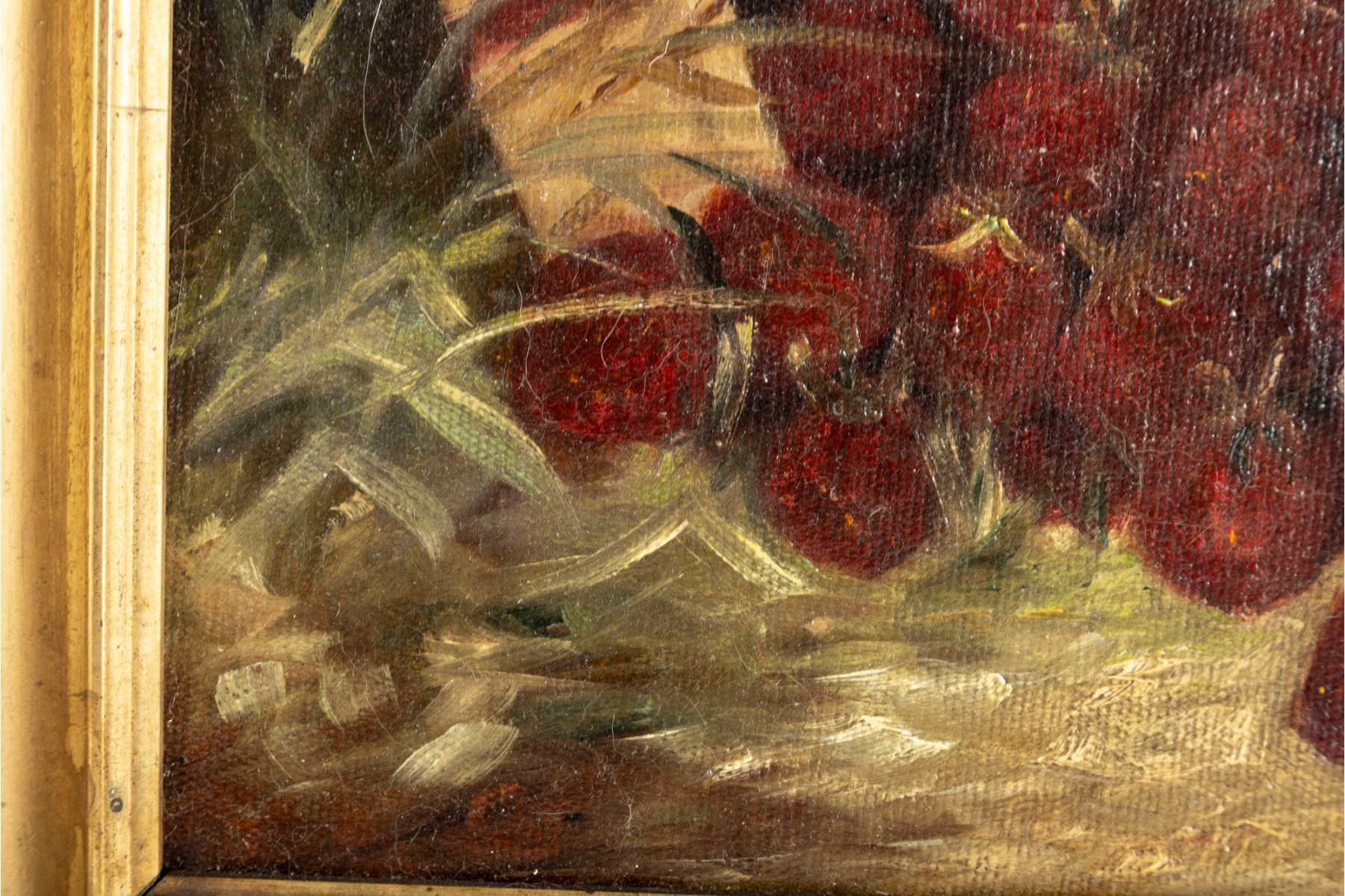 A small oil on canvas strawberry still life painting, circa early 20th century -- no signatures found. The painting is presented within a small, carved gilt-wood frame.