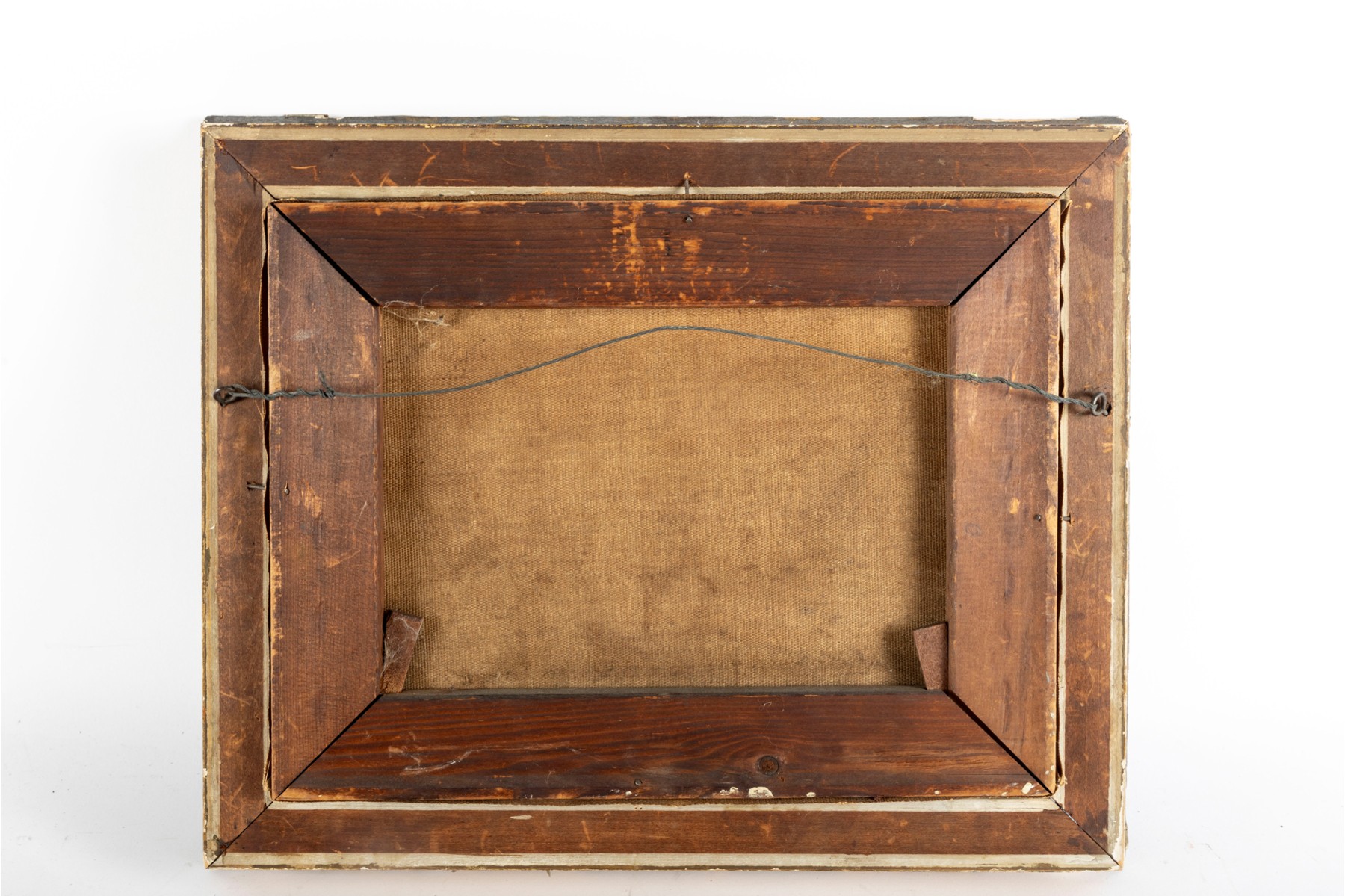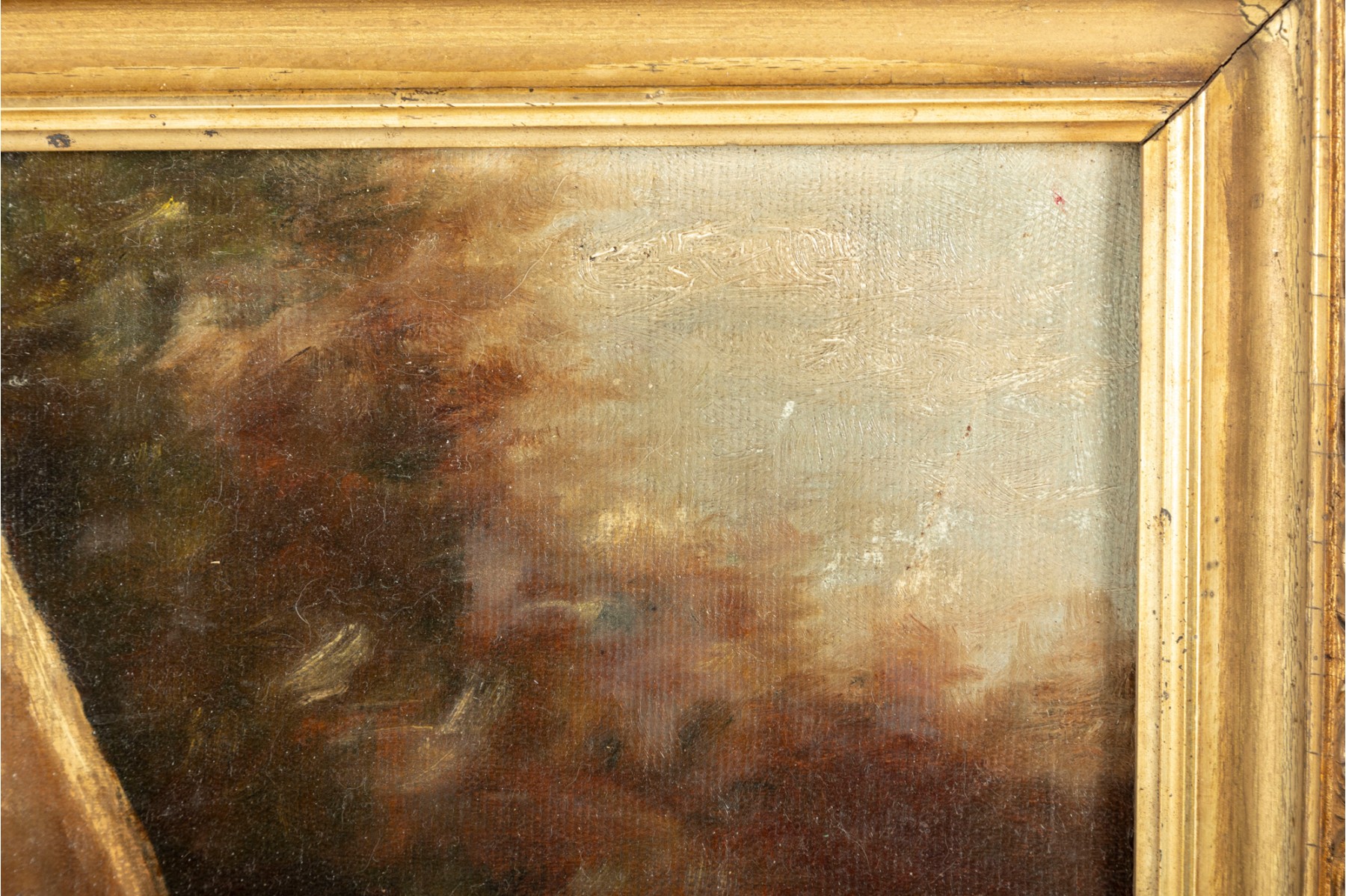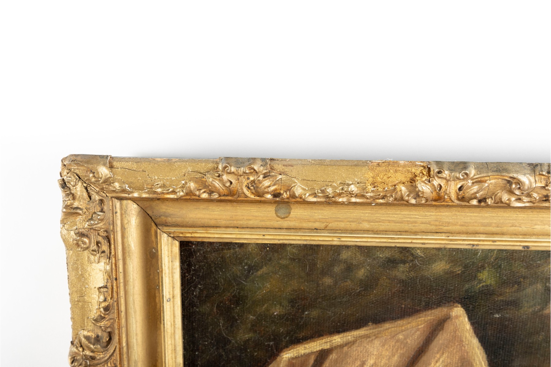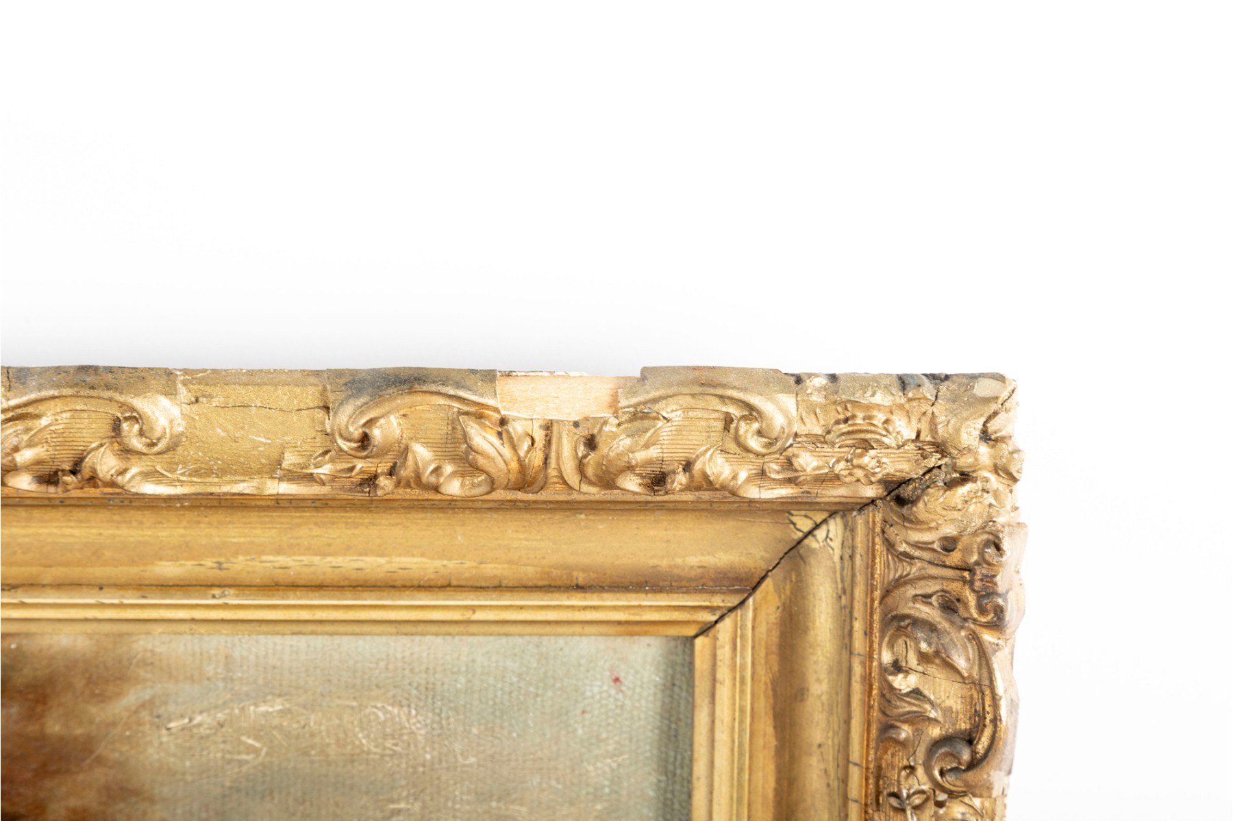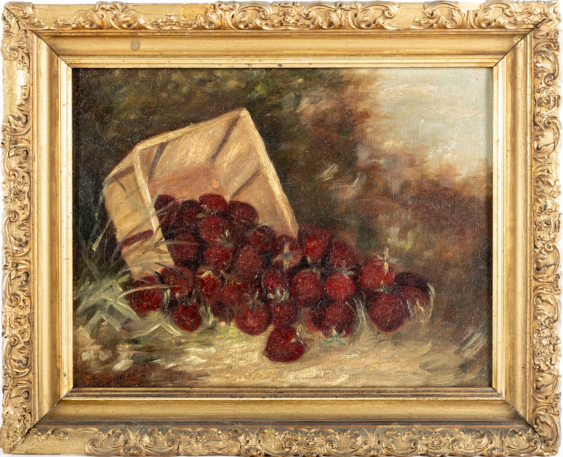 A small oil on canvas strawberry still life painting, circa early 20th century -- no signatures found. The painting is presented within a small, carved gilt-wood frame.