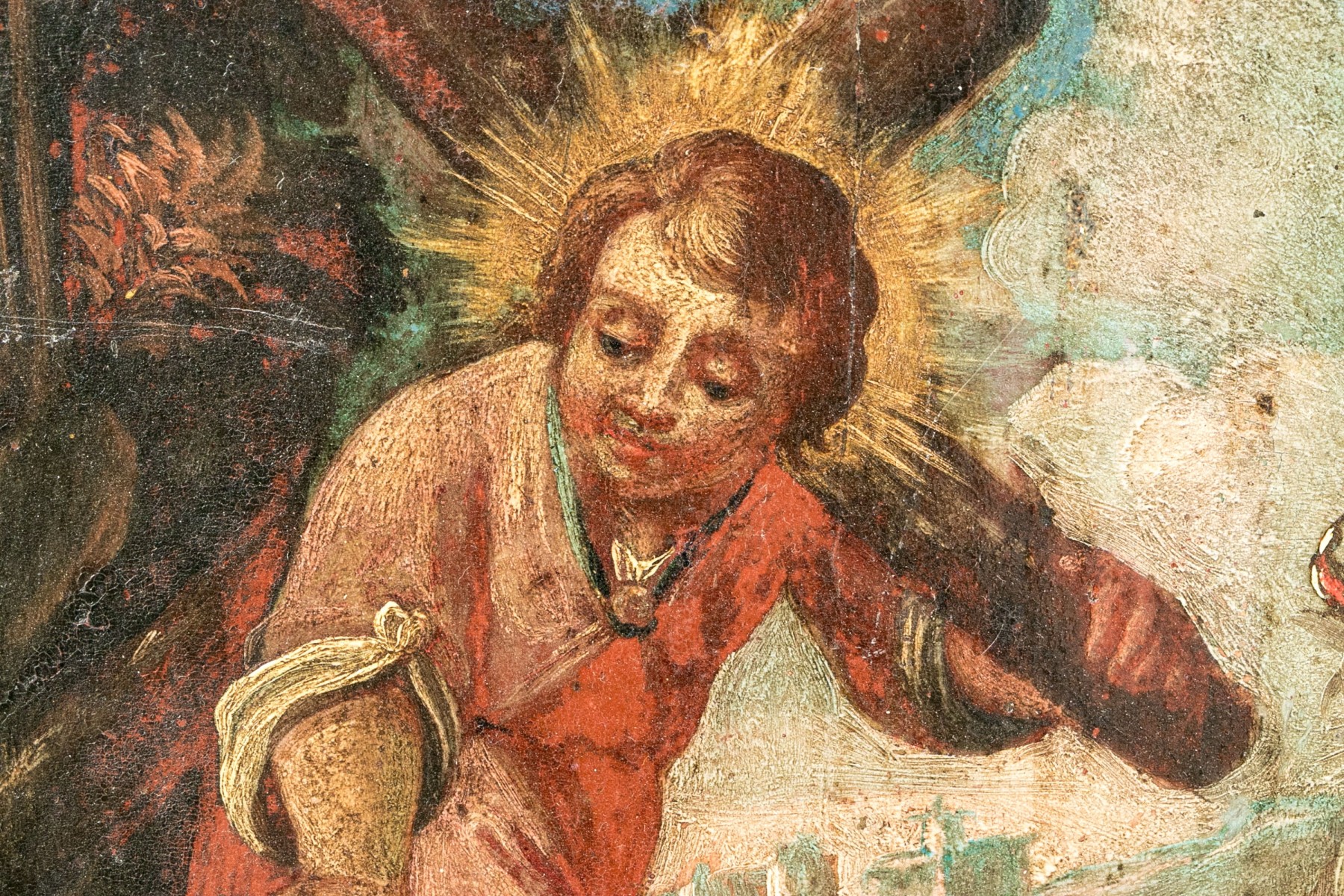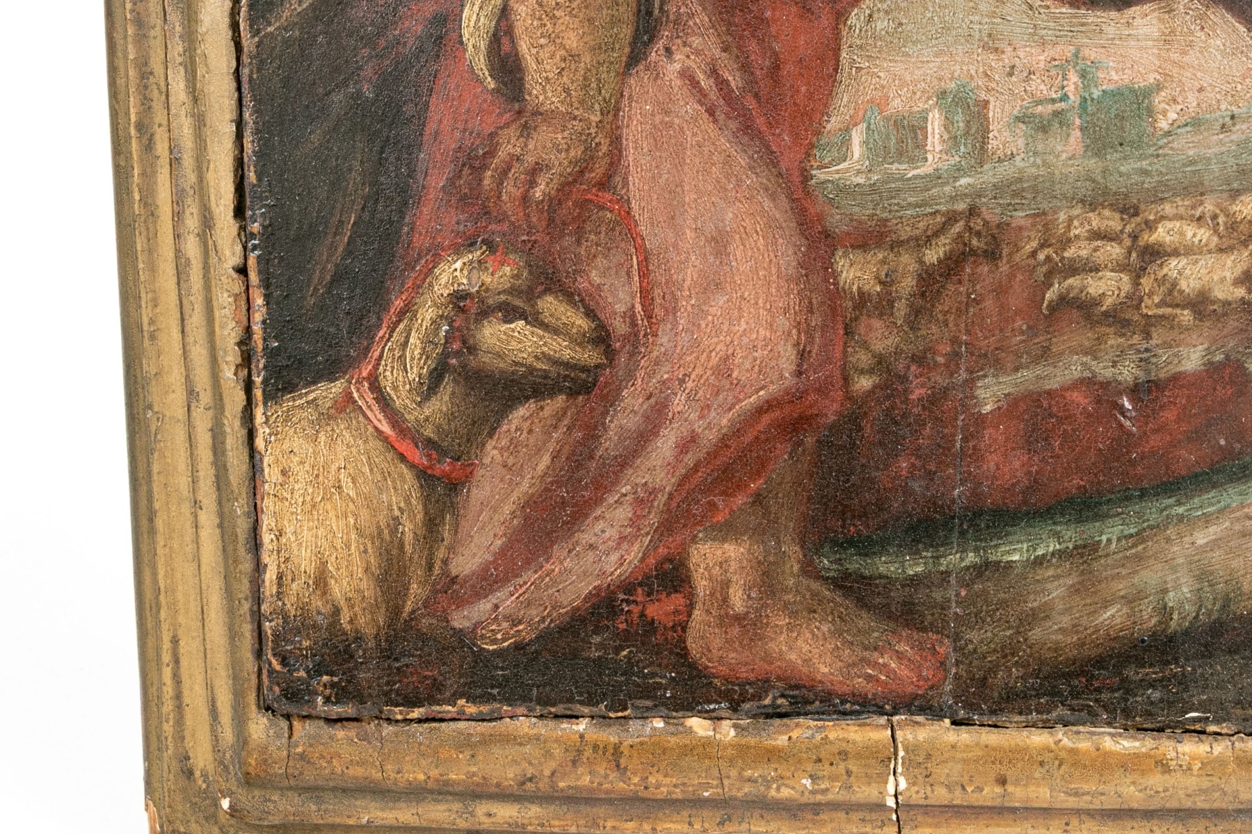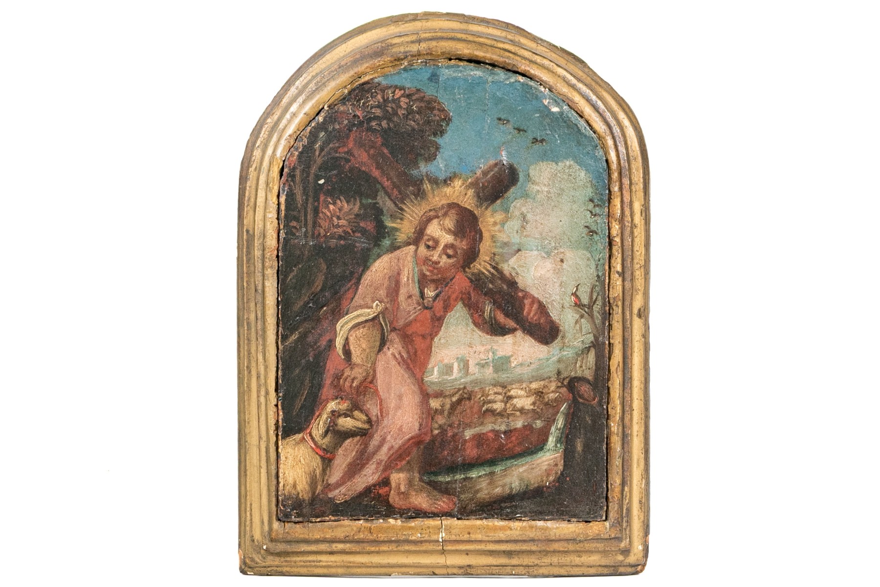 A well rendered antique oil painting on panel depicting an allegorical scene of Christ the Good Shepherd in pink and red carrying a cross and leading a lamb to a flock with architecture in the distance beneath a clouded blue sky.