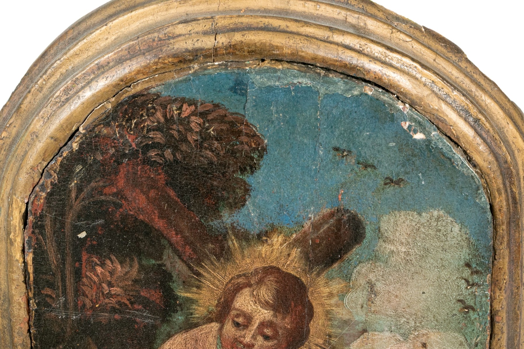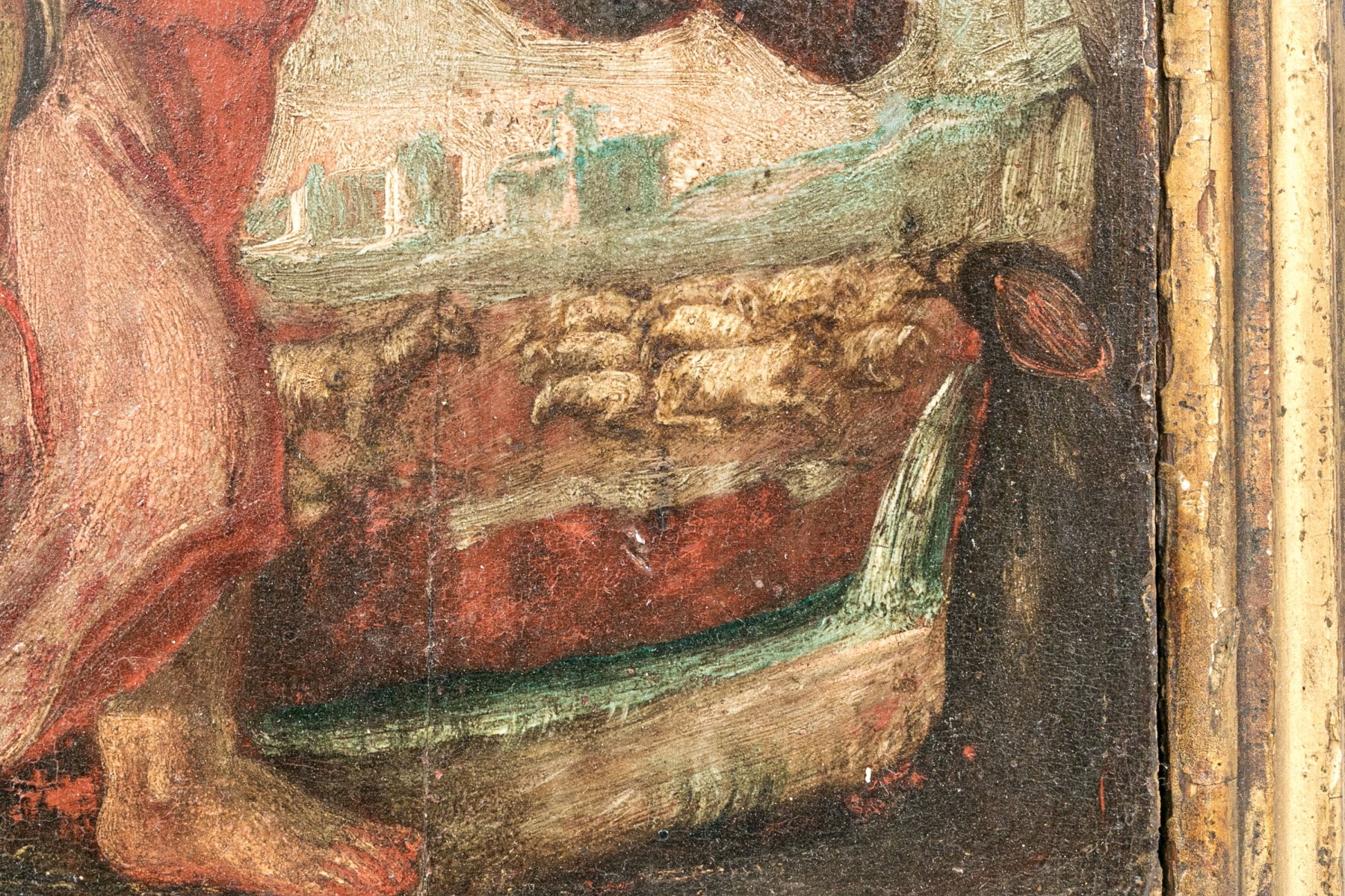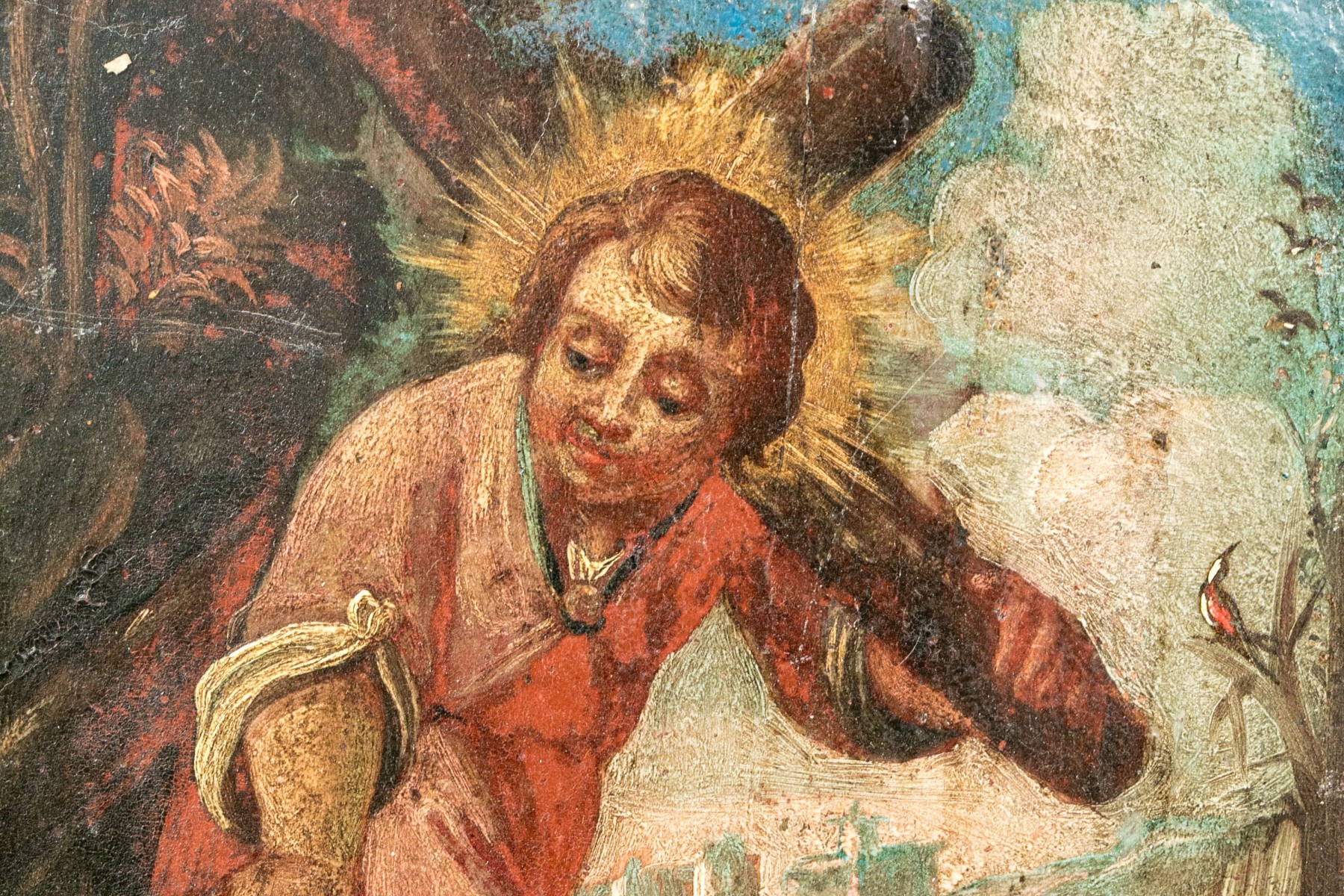 A well rendered antique oil painting on panel depicting an allegorical scene of Christ the Good Shepherd in pink and red carrying a cross and leading a lamb to a flock with architecture in the distance beneath a clouded blue sky.