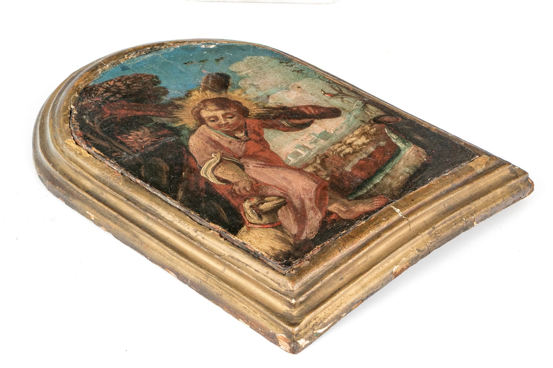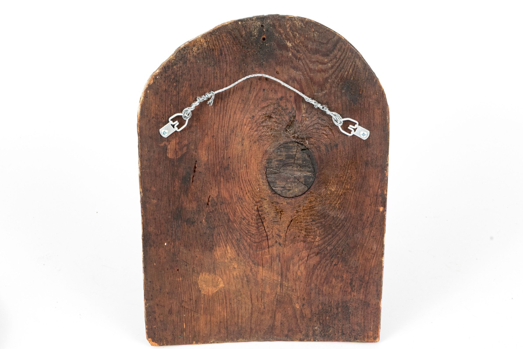 Displayed with a gilded, arched, and tiered wood plaque with a wire on the verso for hanging.