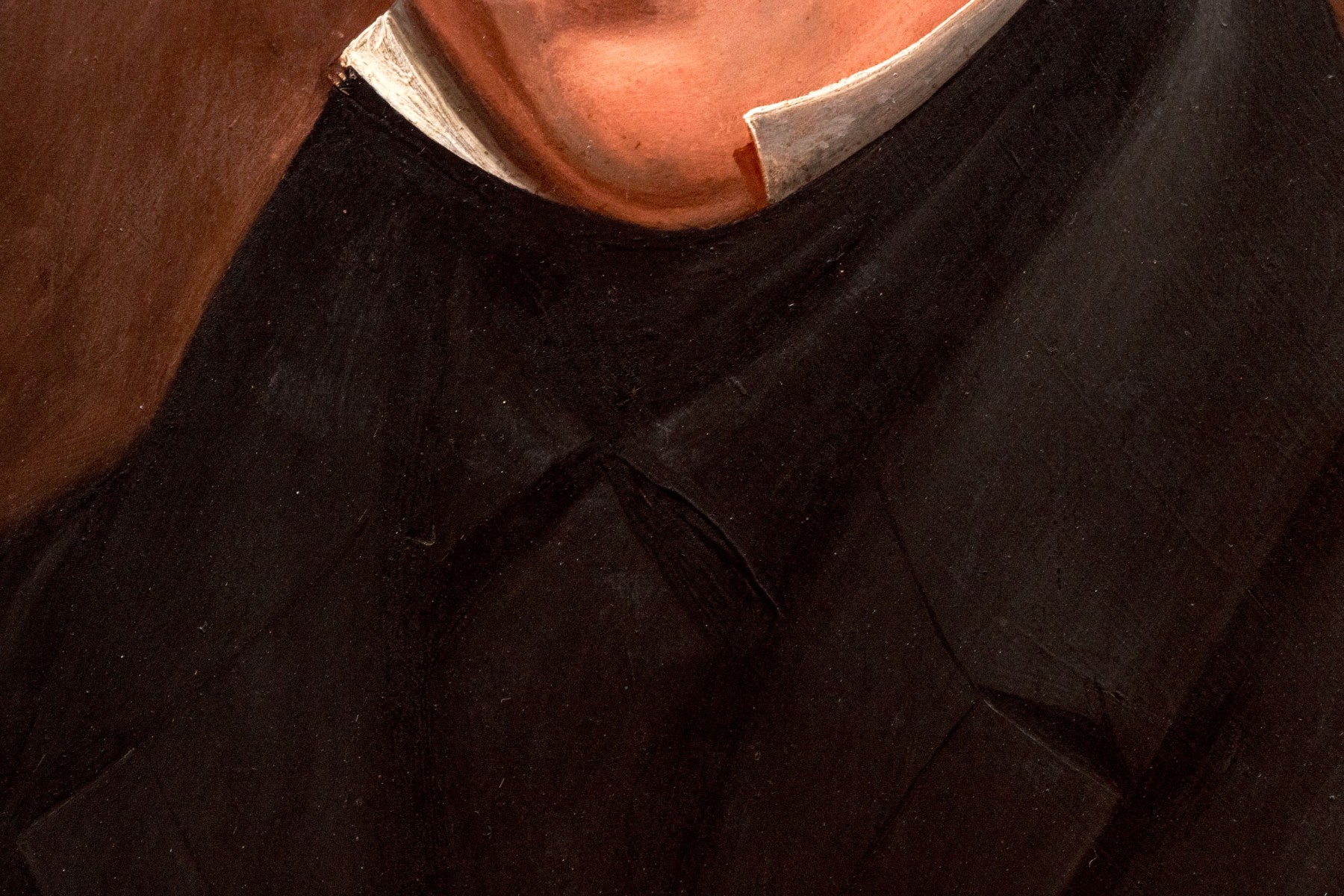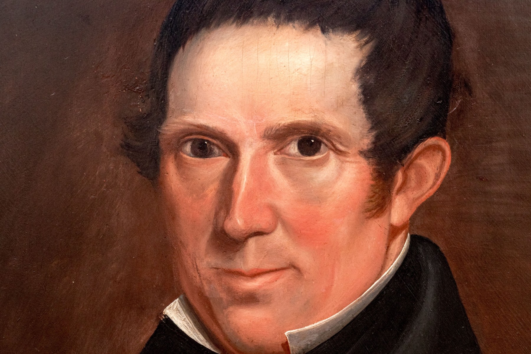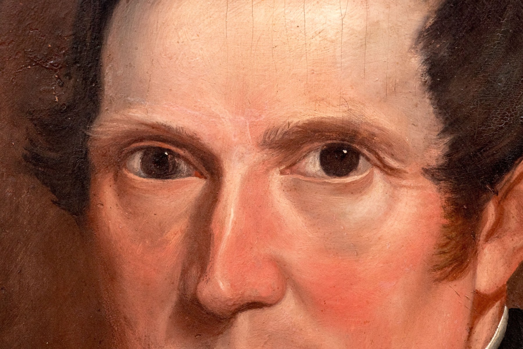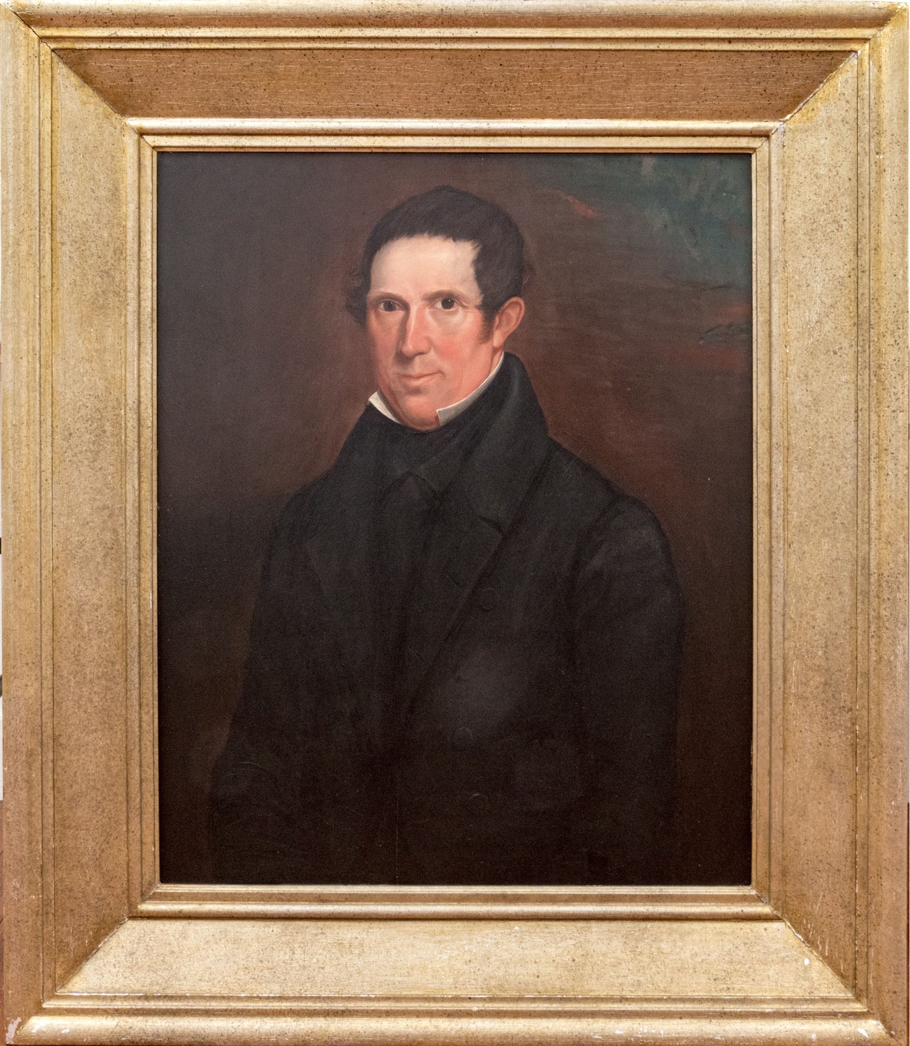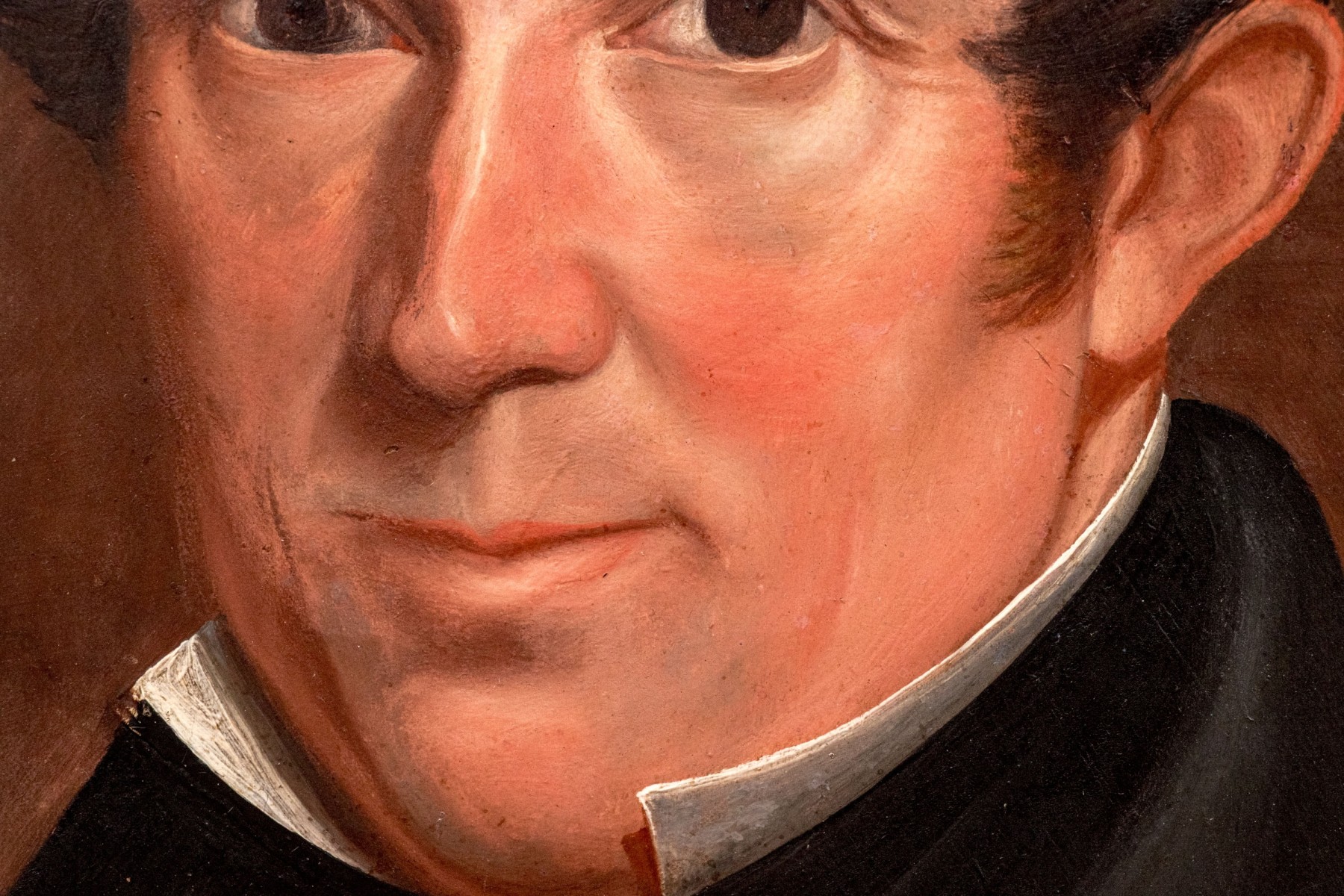 A handsome 19th century American school oil on board portrait of a gentleman with short or slicked back dark brown hair, wearing a sharp white collar with a black shirt and coat. The man faces the left with dark brown eyes gazing towards the viewer, standing against a dark red background.