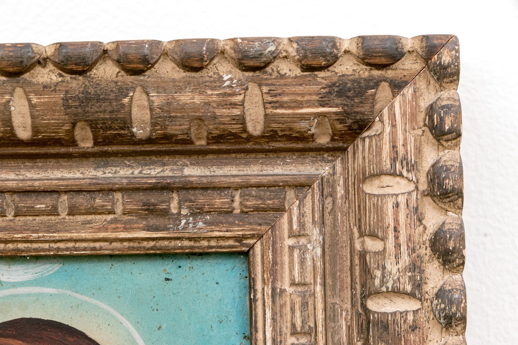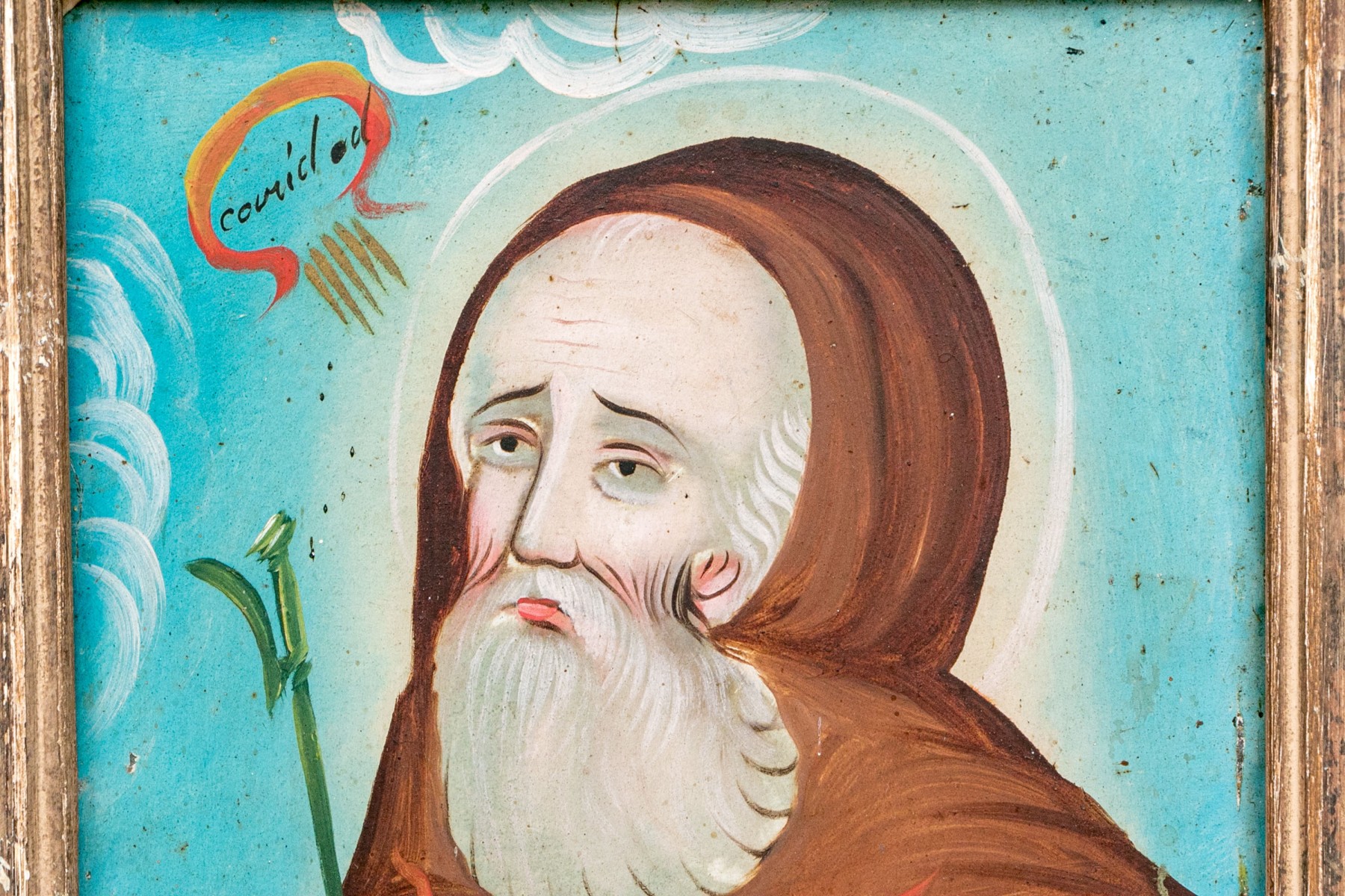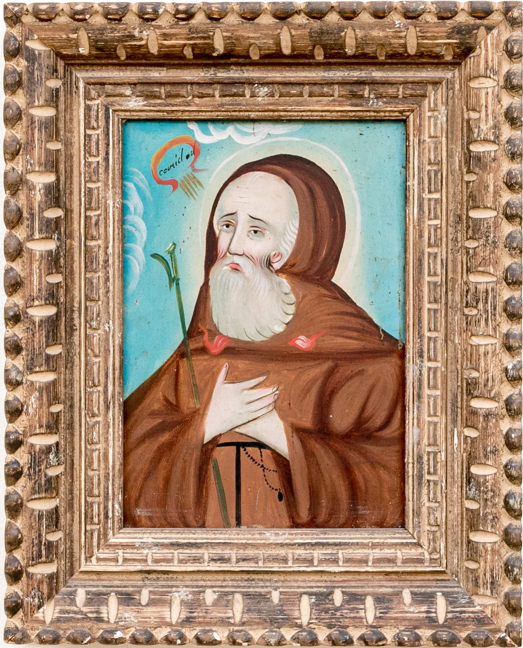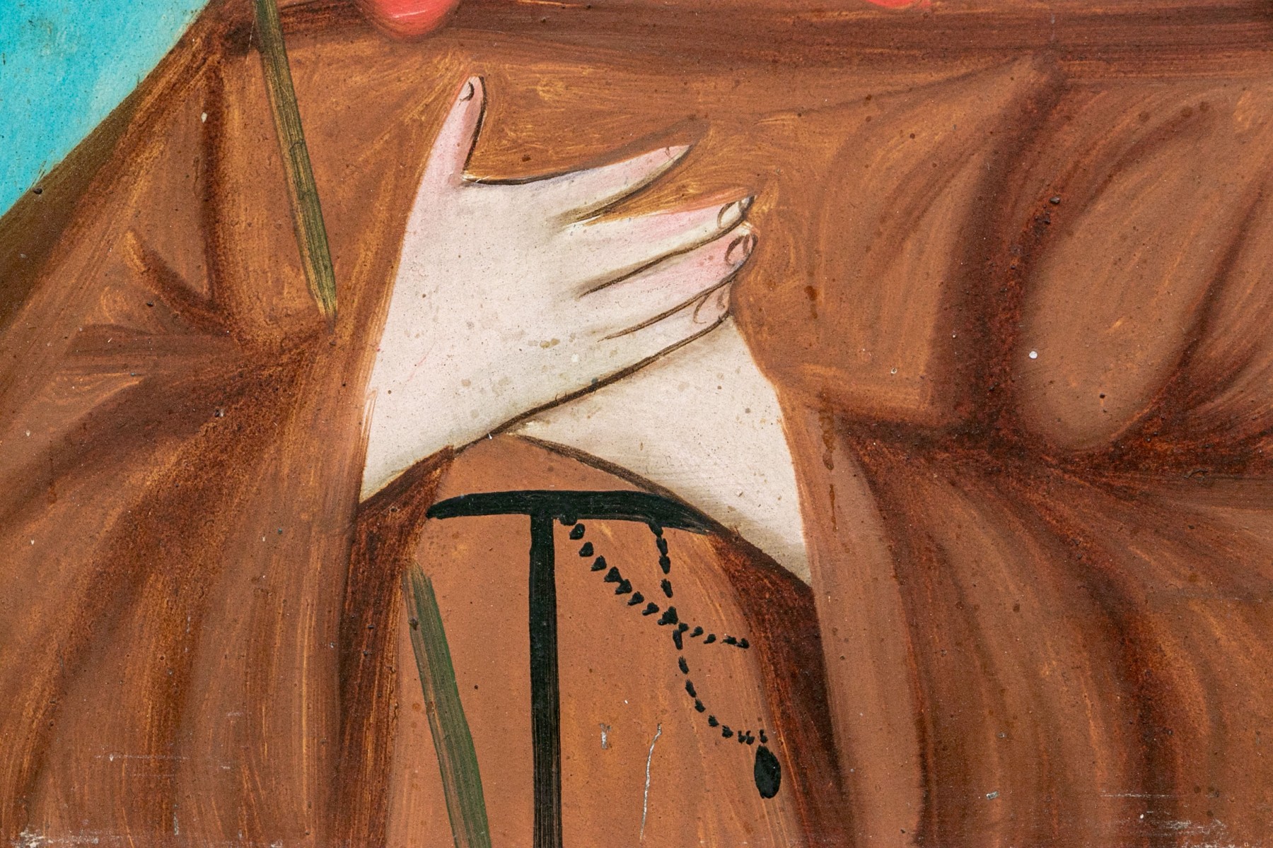 The oil on panel painting depicts Saint Francis in his brown tunic with hands clasped with rosary beads draped down.