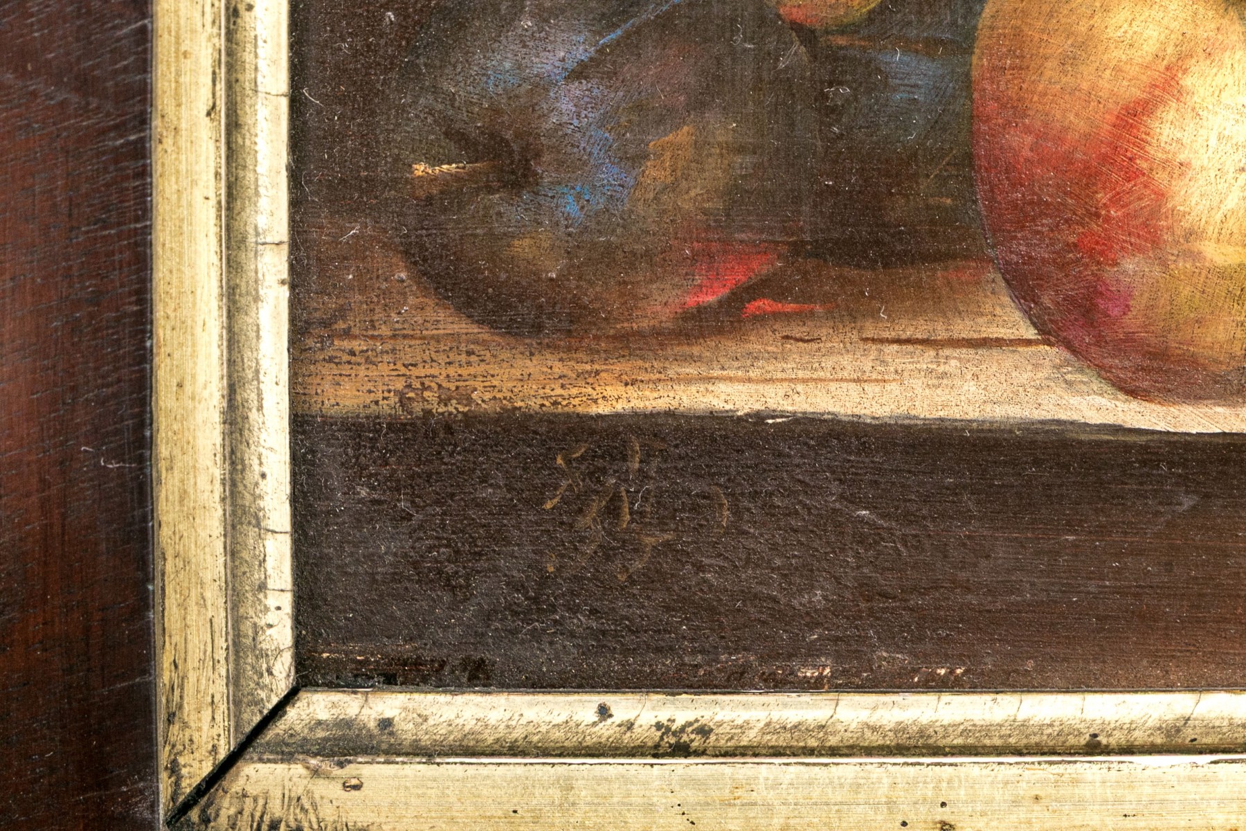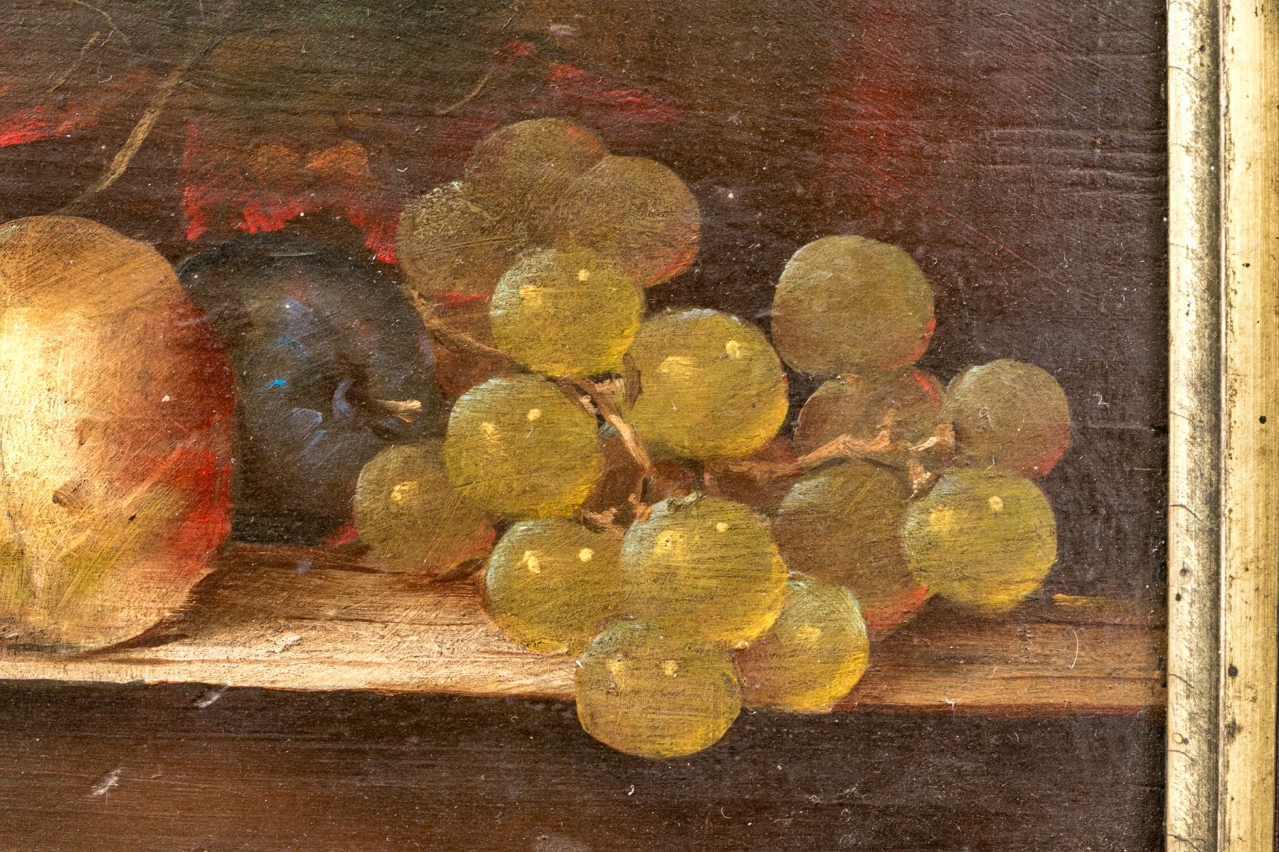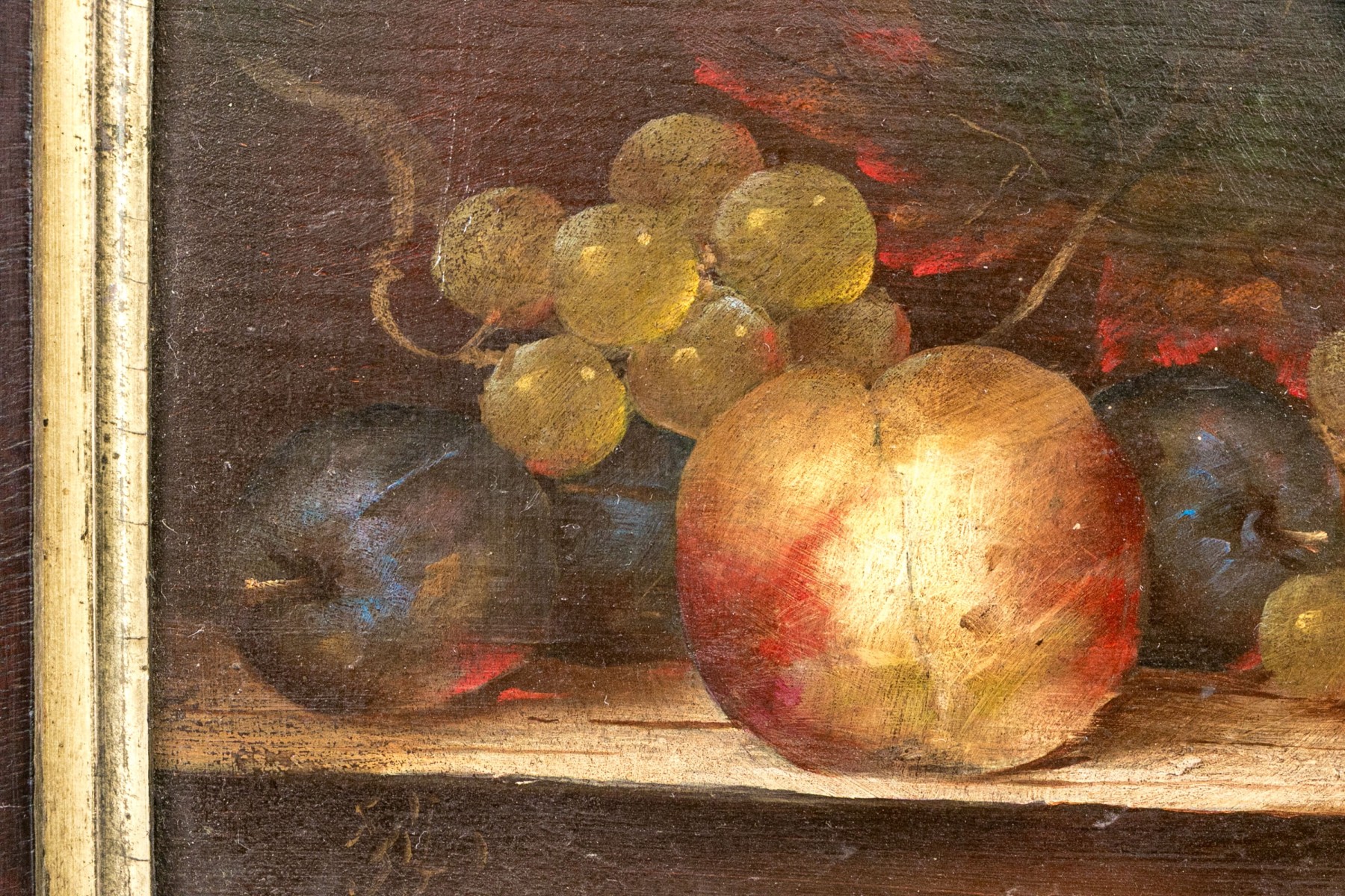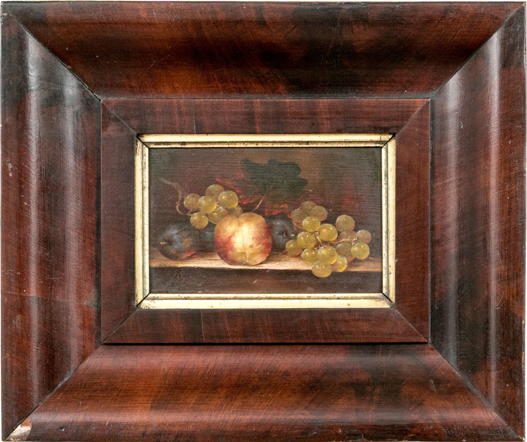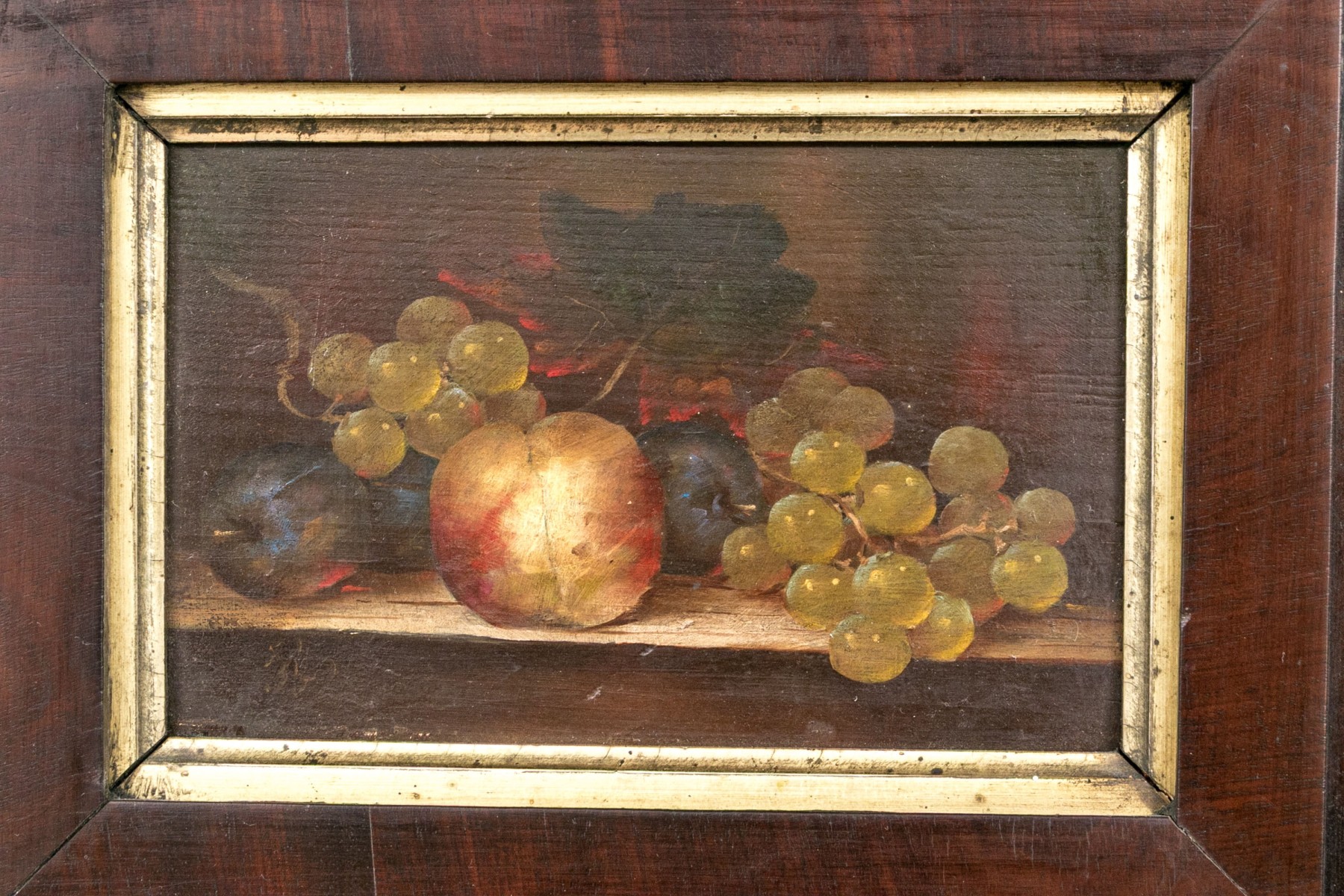 A wonderful antique oil painting on panel depicting a still life of fruit including an apple, white grapes, and plums set atop a light brown surface against a dark, warm brown ground. Appears to be unsigned.