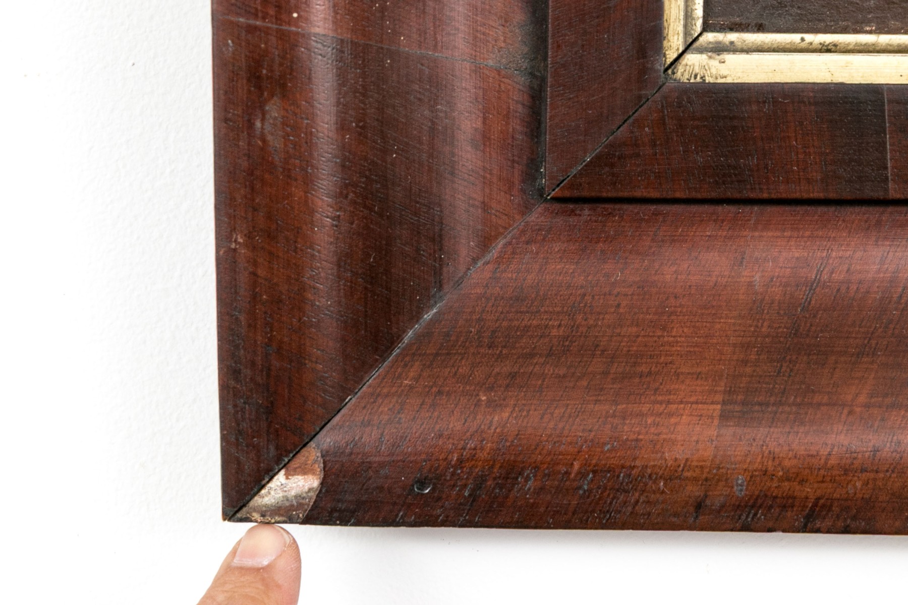 Displayed with a silvered fillet in a beautifully veneered warm brown wood frame.
