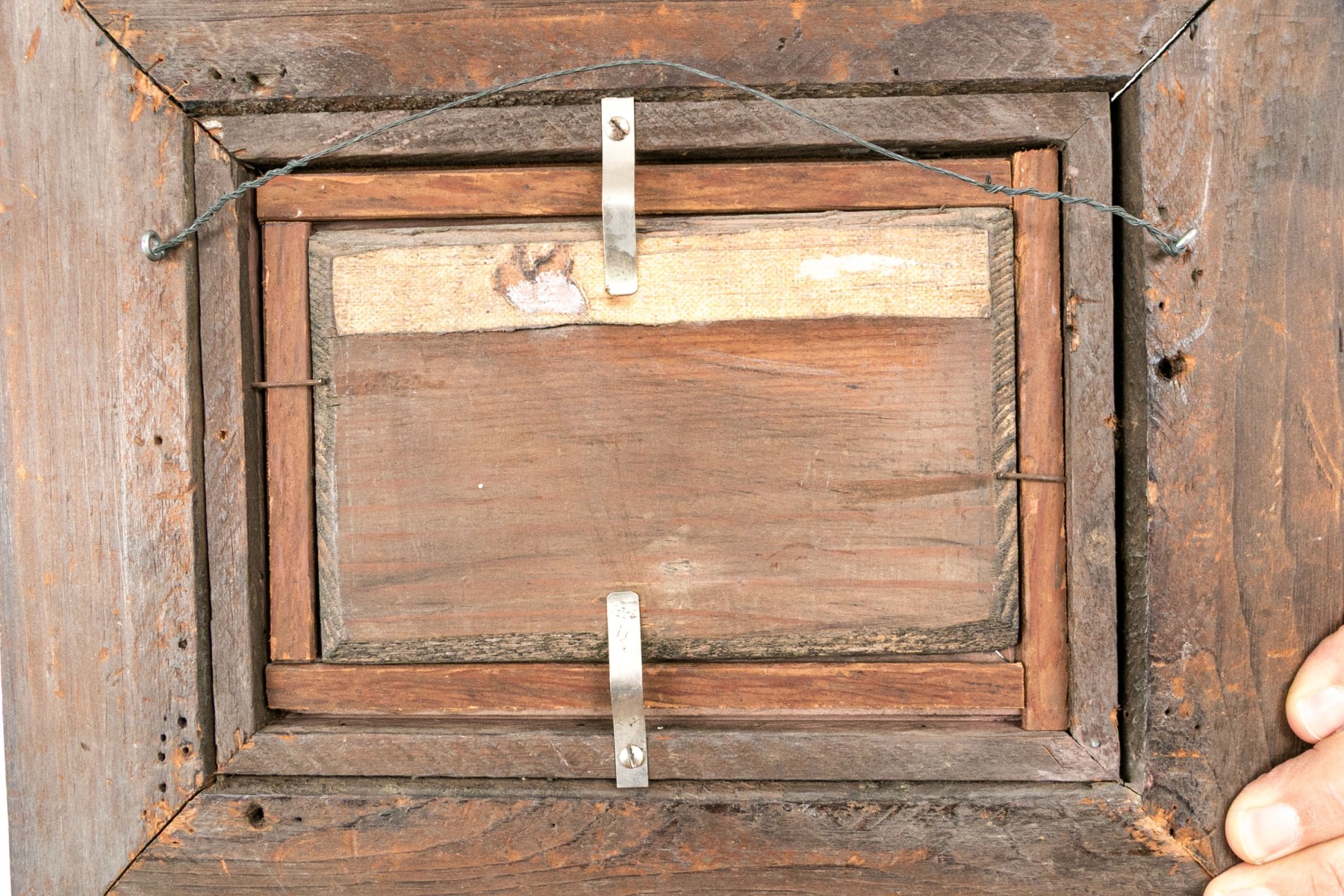 Slight scratches to the panel with wear to paint. Losses to veneer on frame in lower left corner. Despite wear presents well overall.