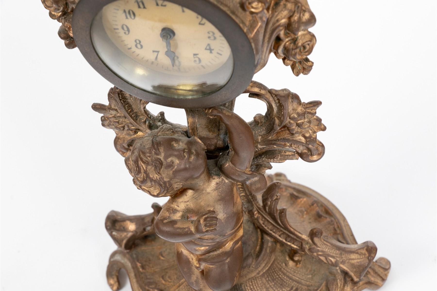 A vintage ornate gilt cast brass desk clock with a scrolled floral gilt case with a glass and brass panel at front behind which is visible a white clock face with black numerals marked made in Germany. Beneath is a scrolled standard with cherub with upturned face on a scrolled footed base.