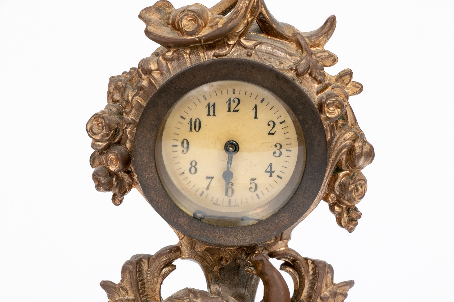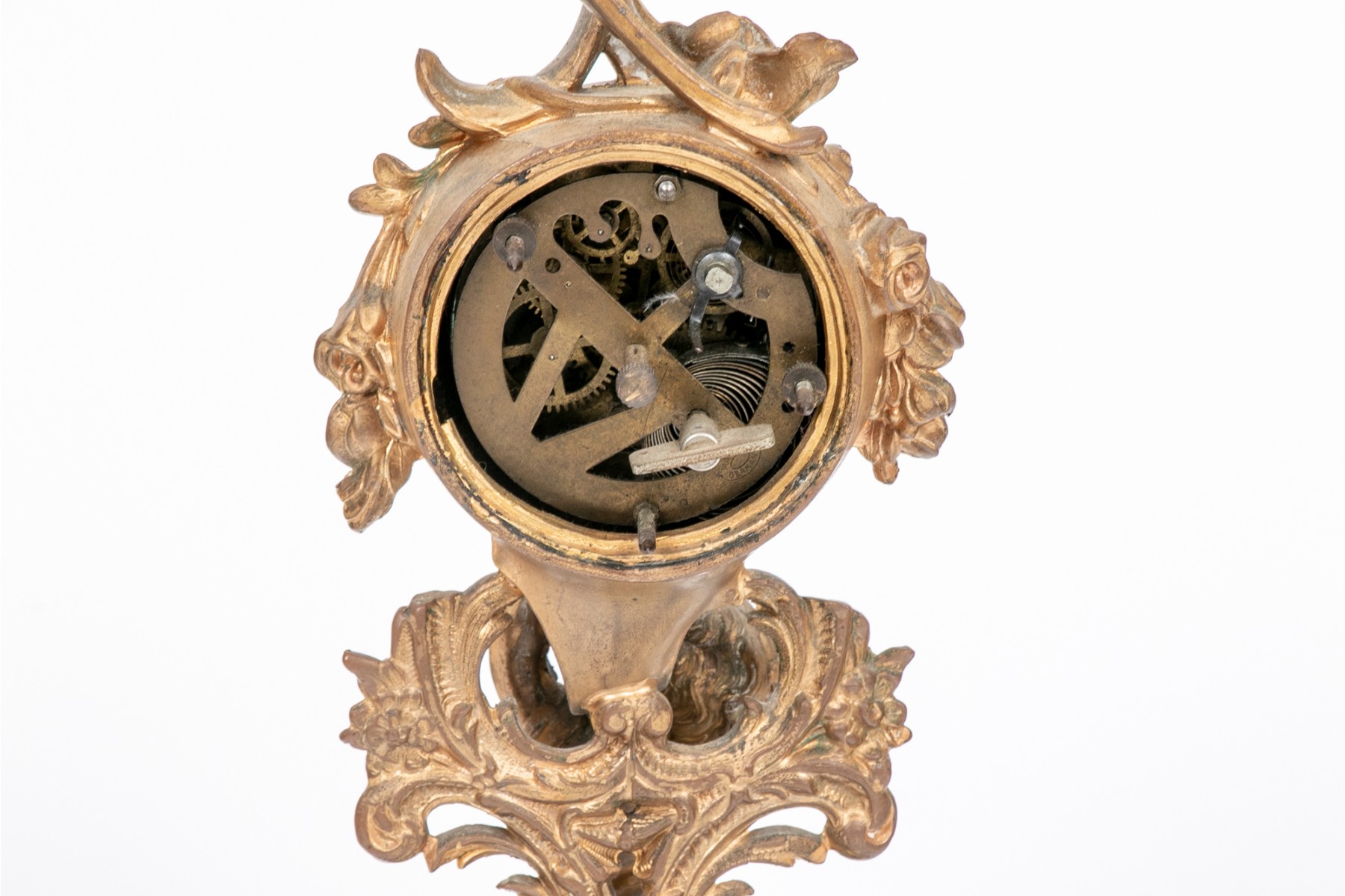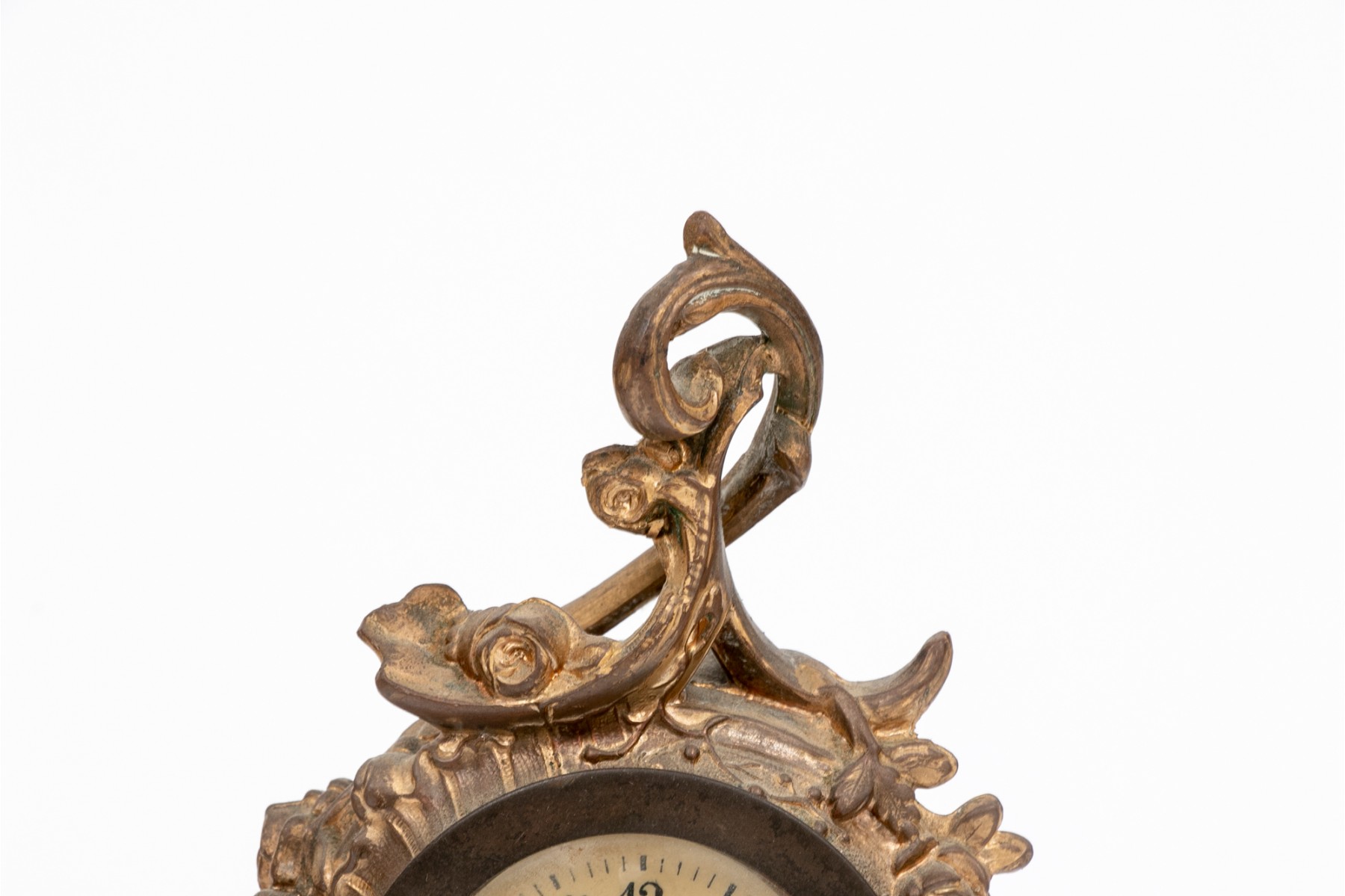 Overall good condition with expected signs of age including a missing rear cover, one hand has become detached, and some loss to gilt finish. Clocks winds and ticks. Not tested for accuracy.
