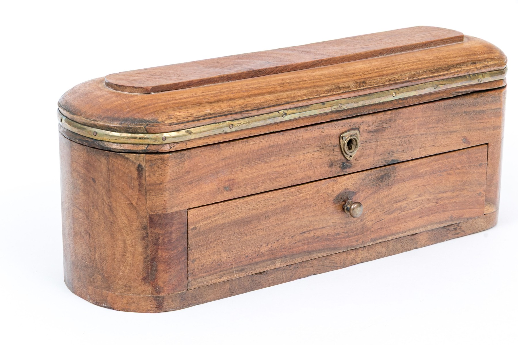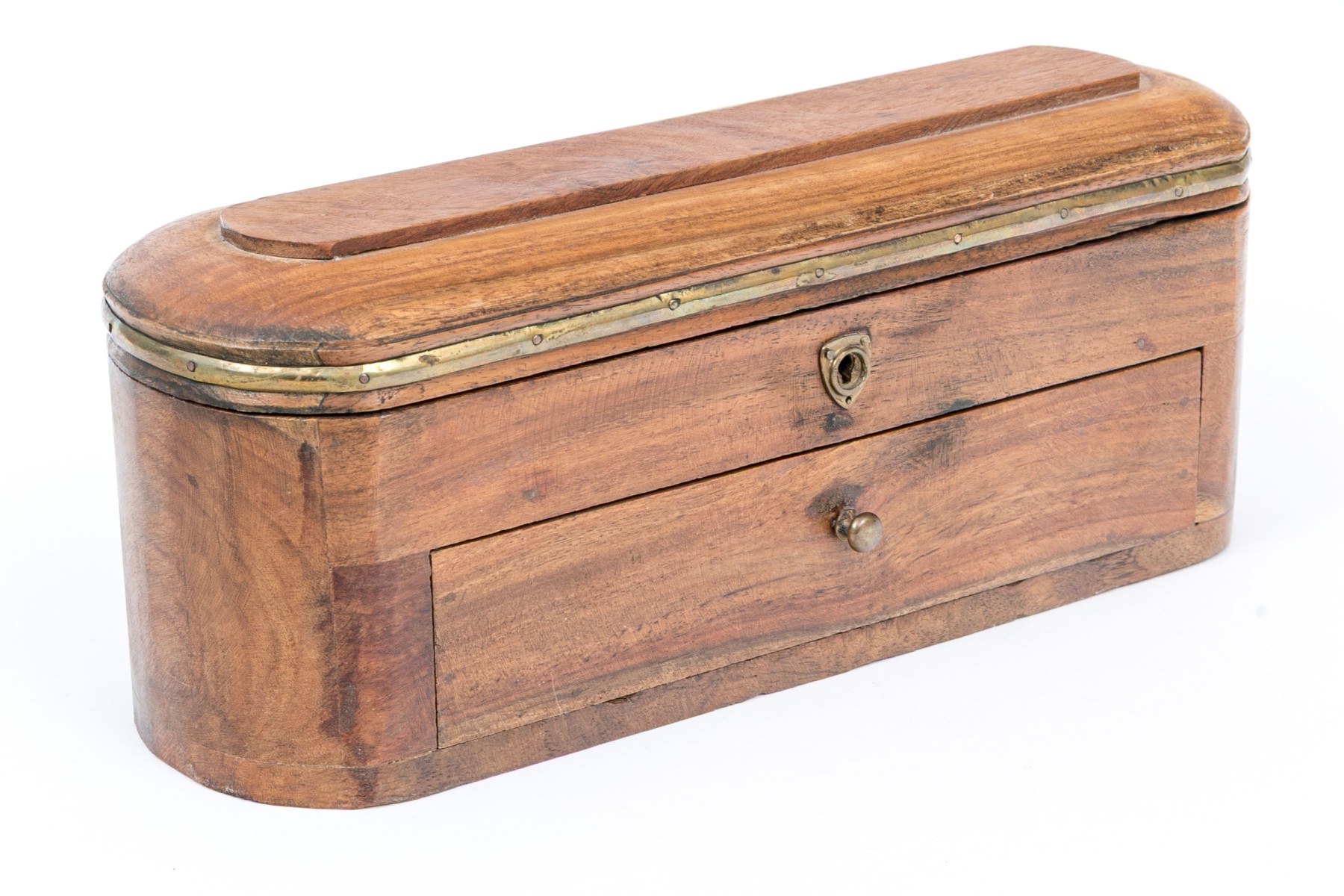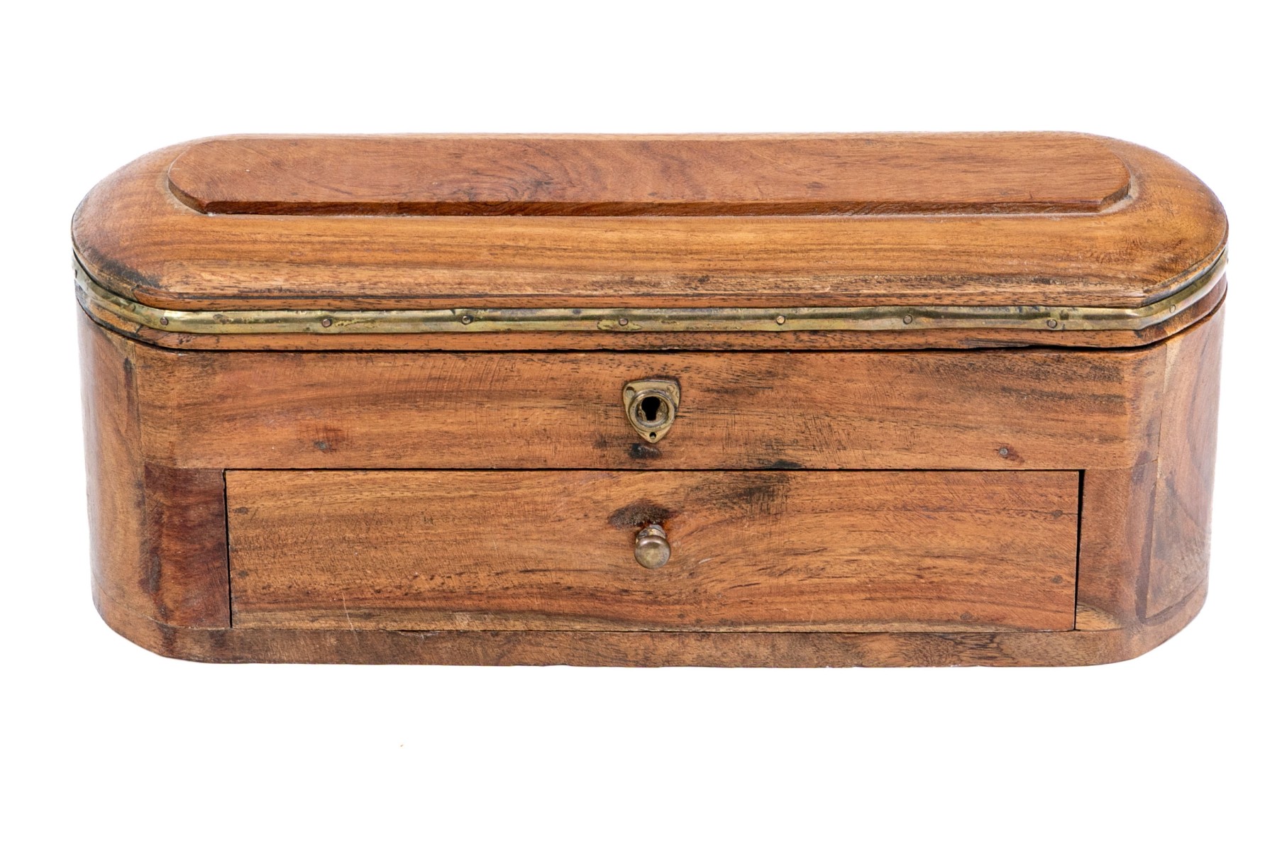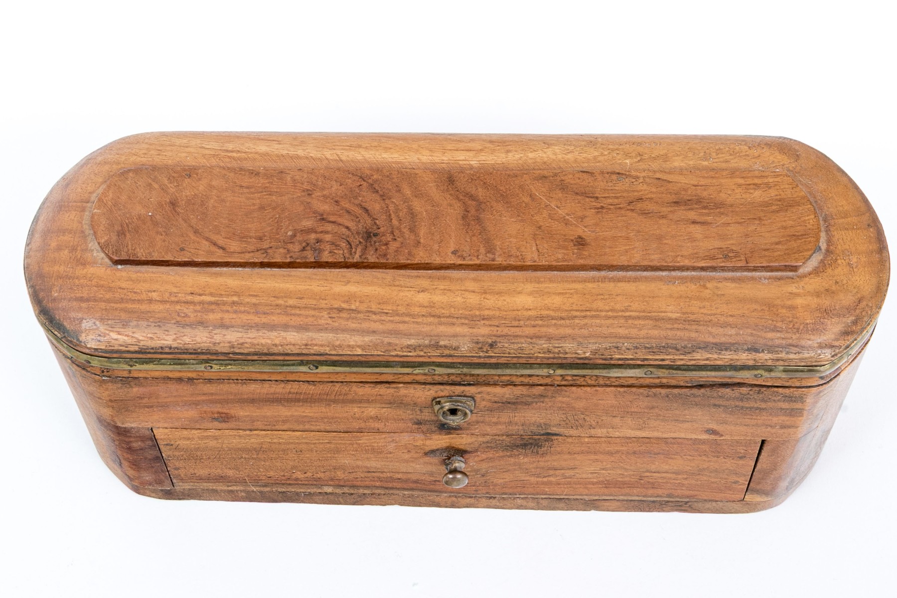 A lovely antique lidded box in honeyed brown wood, showcasing a tall oval form with a tiered, hinged lid and brass banded rim. Detailed below with a key escutcheon and lower drawer adorned by a brass pull.