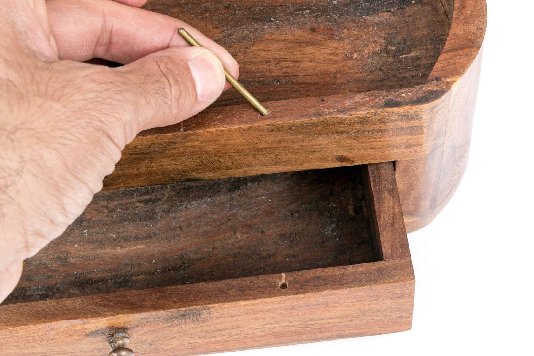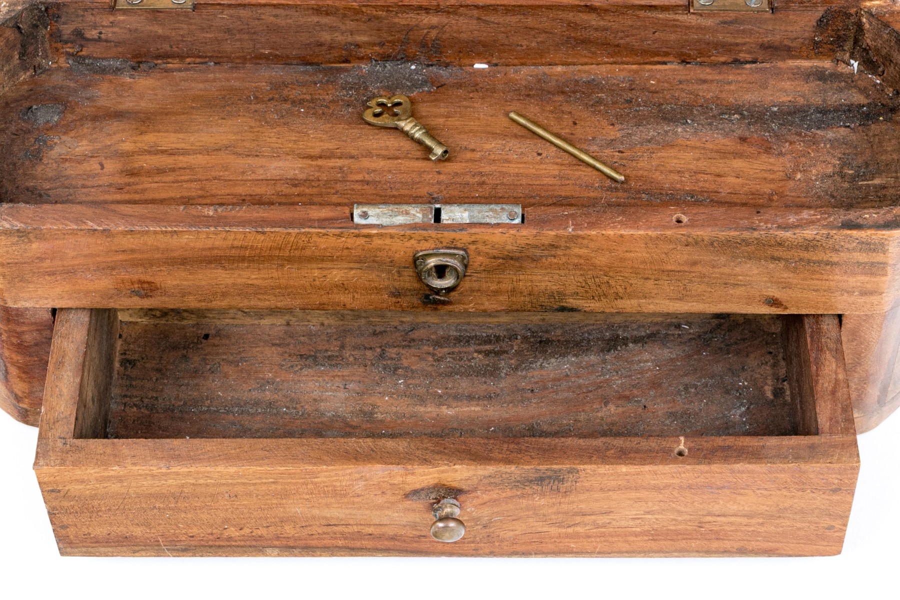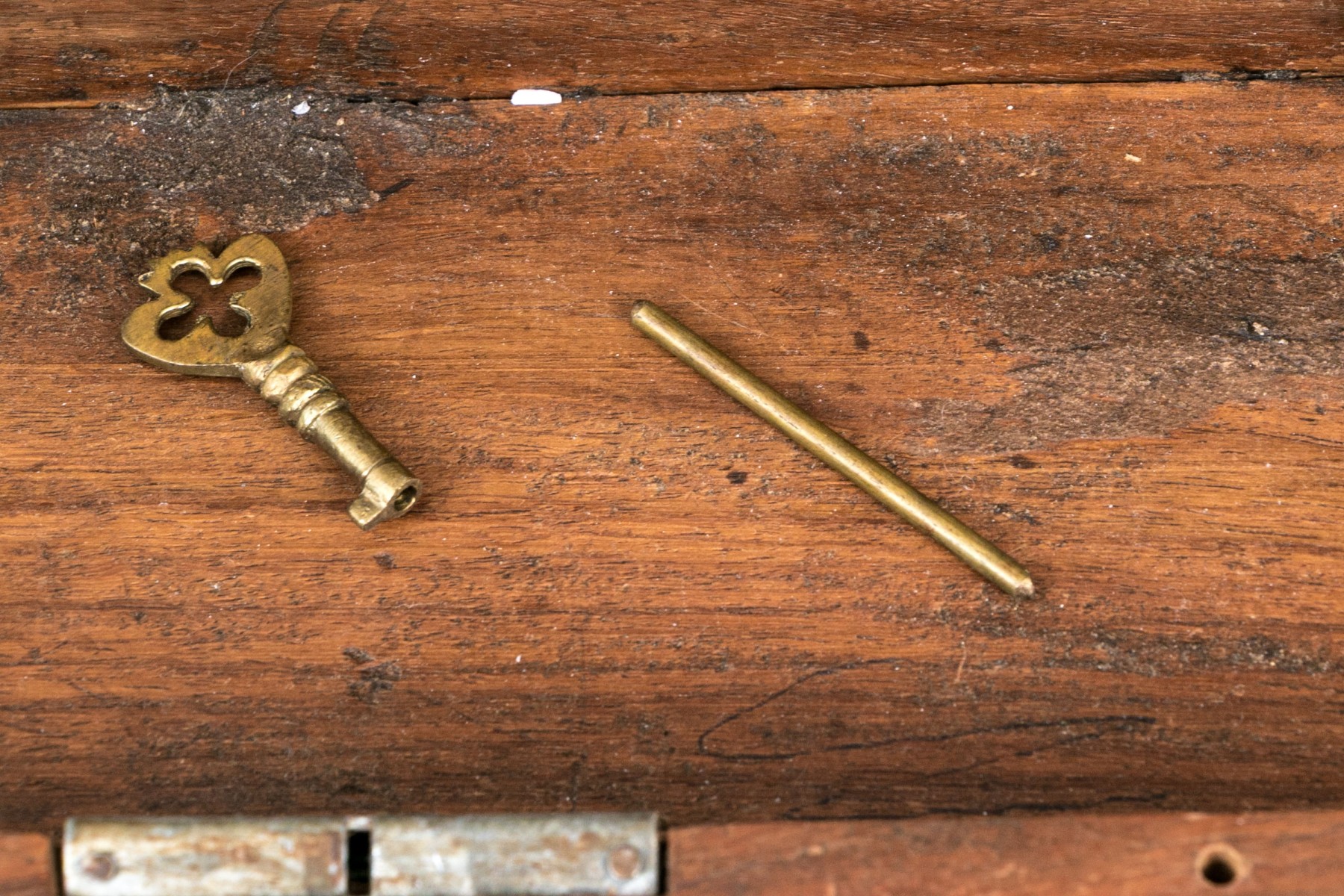 The interior locking mechanism is broken and needs to be repaired; some bends to the brass bound trim commensurate with age and use.