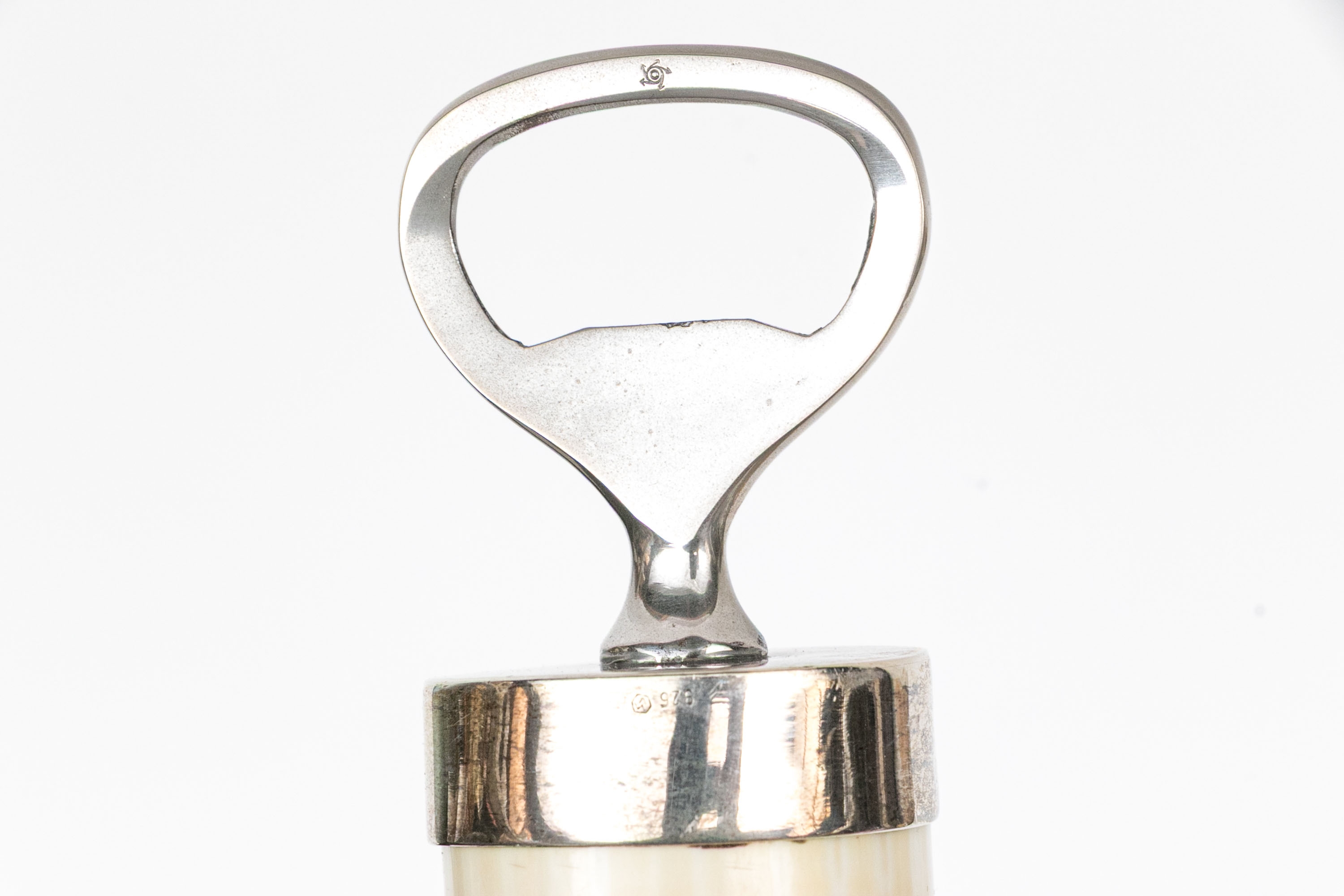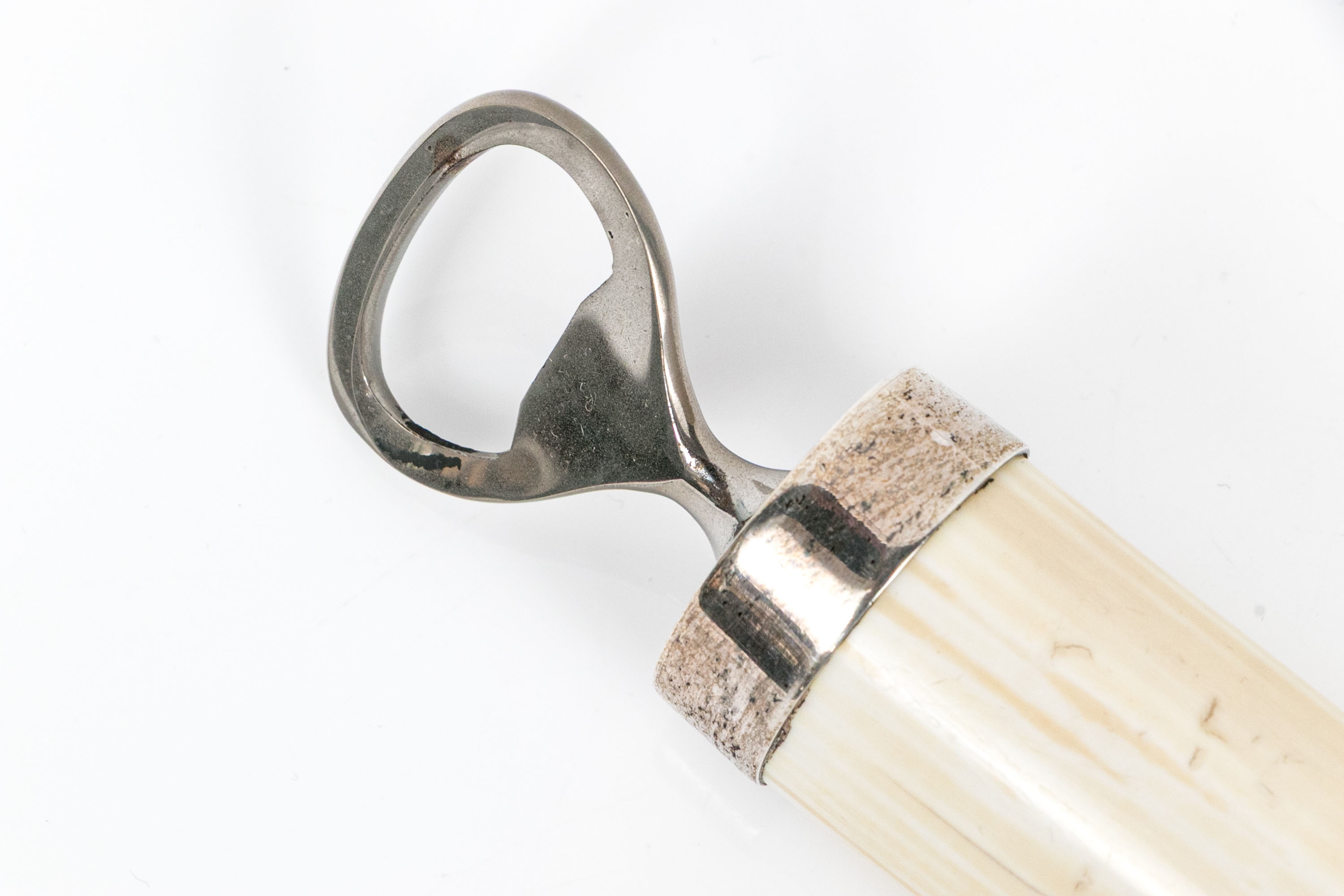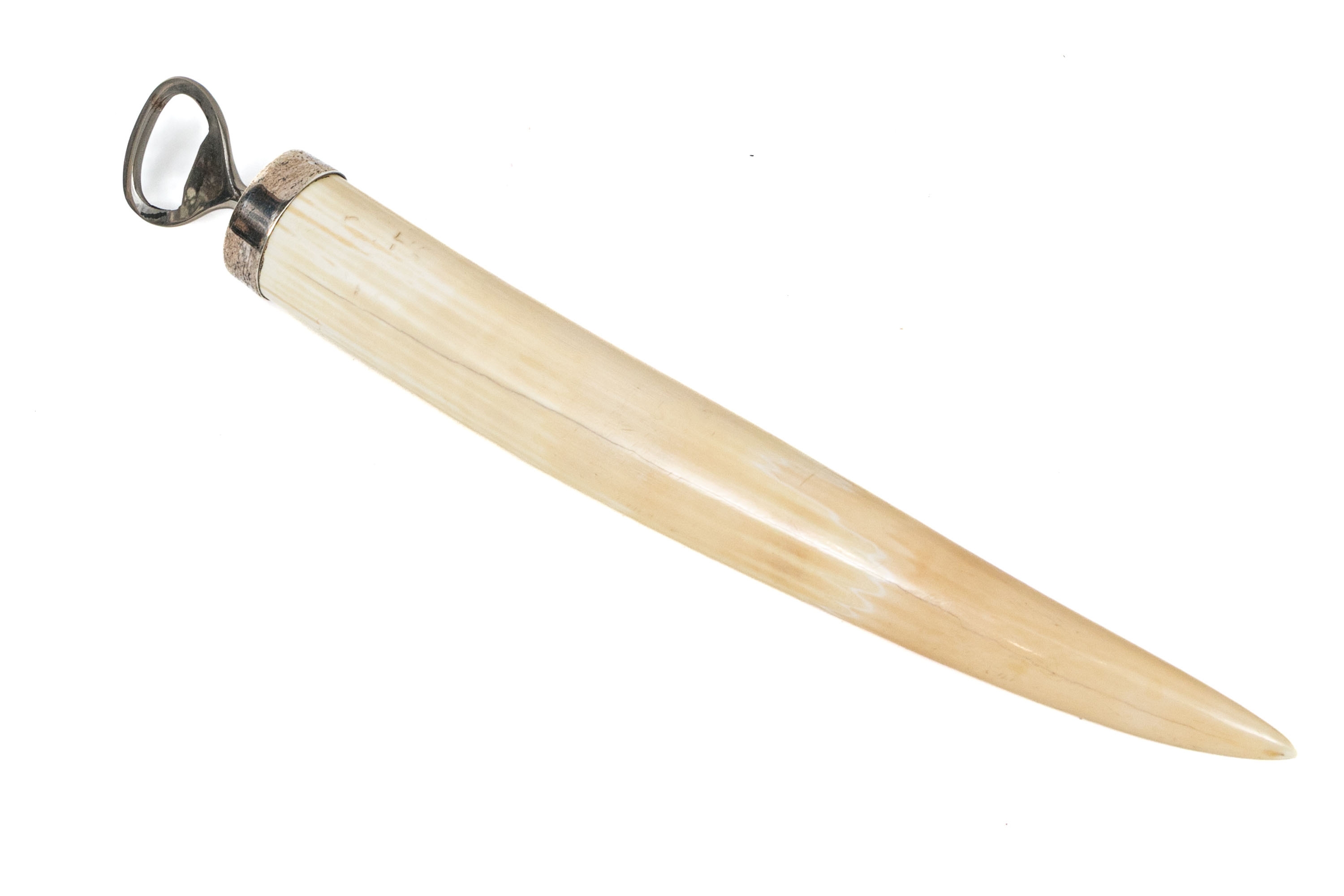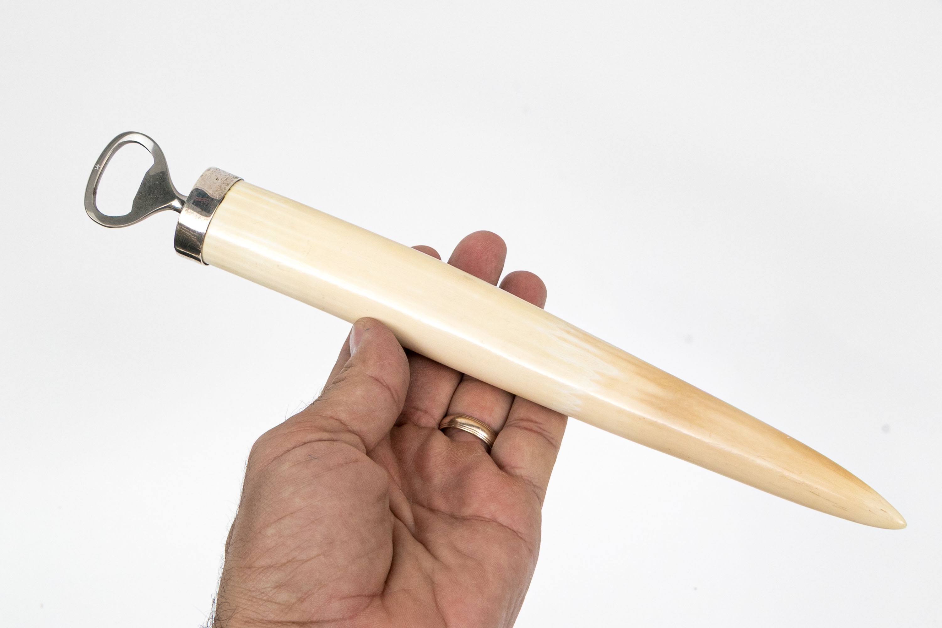 A long pointed tusk piece with silverplate mounted top for the bottle opener.