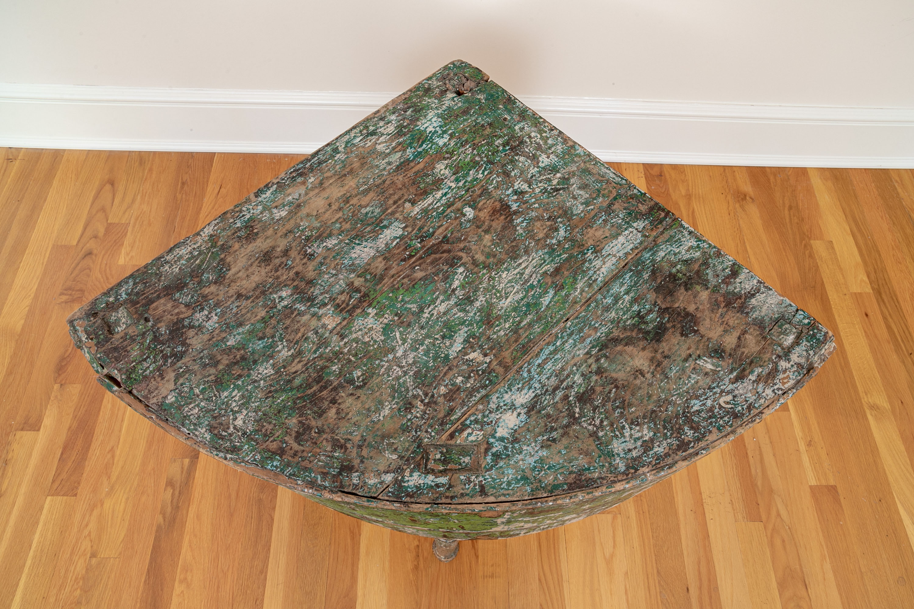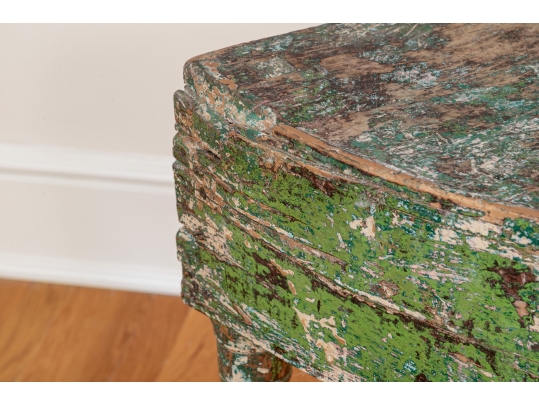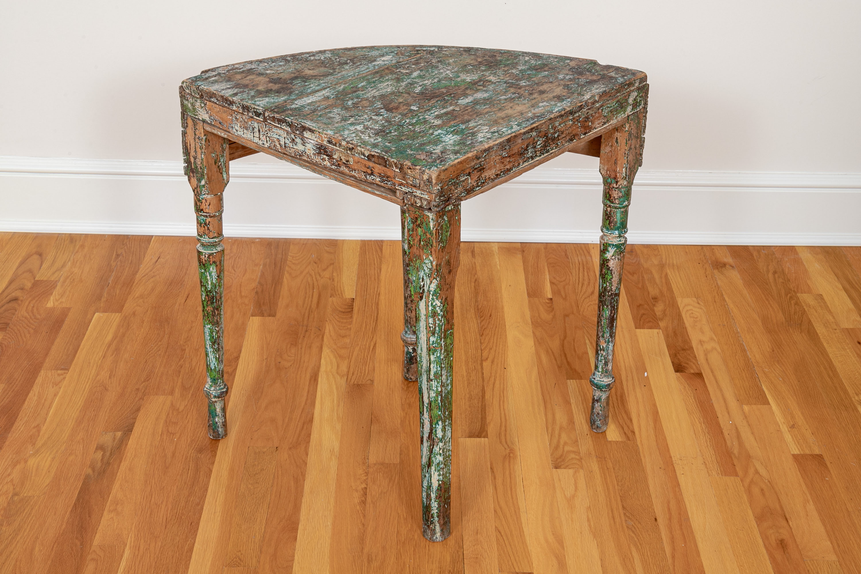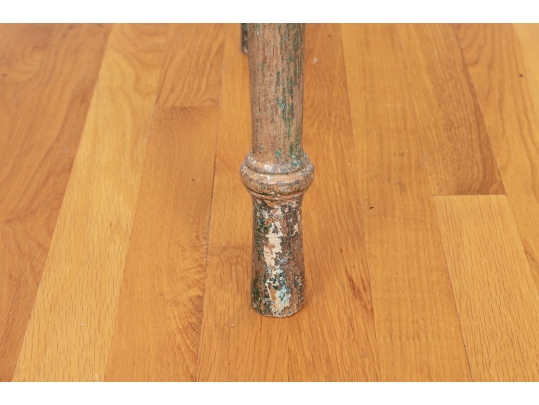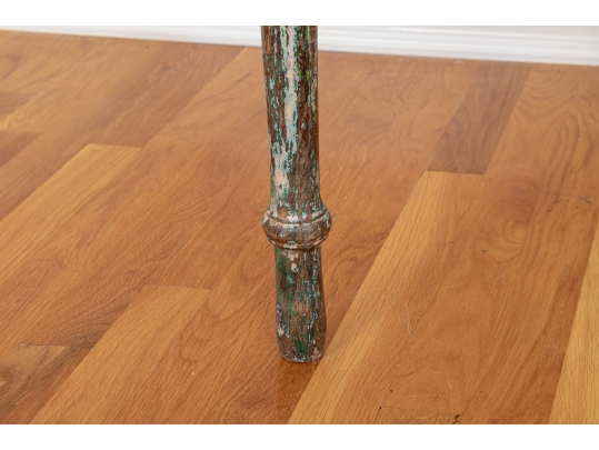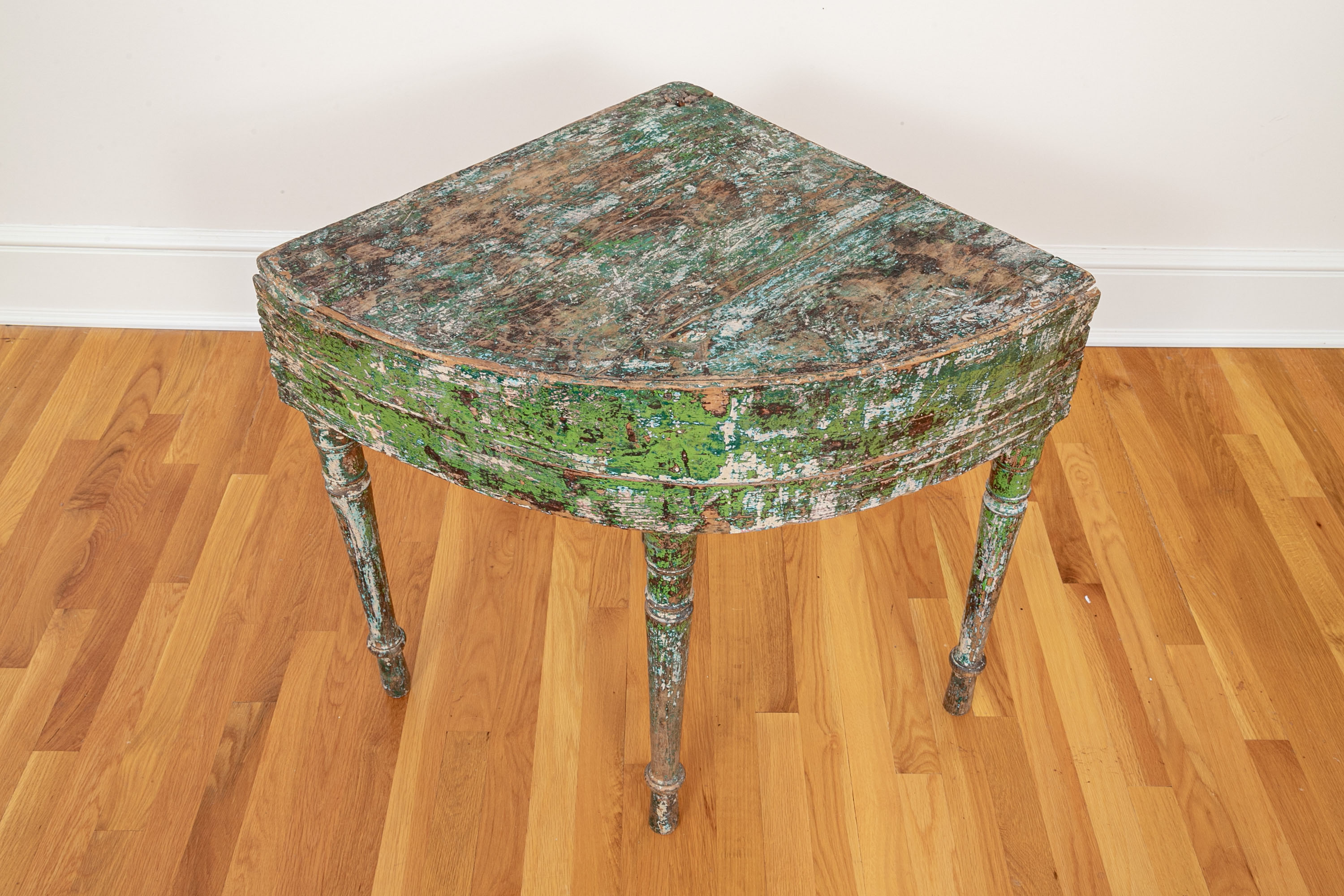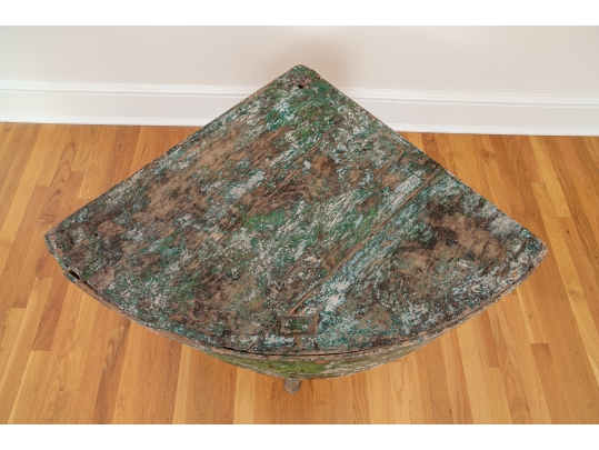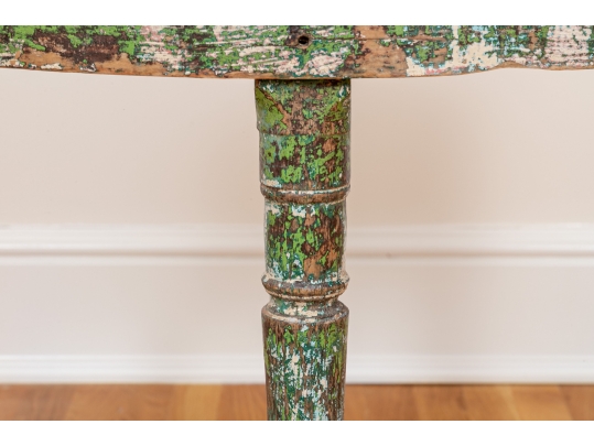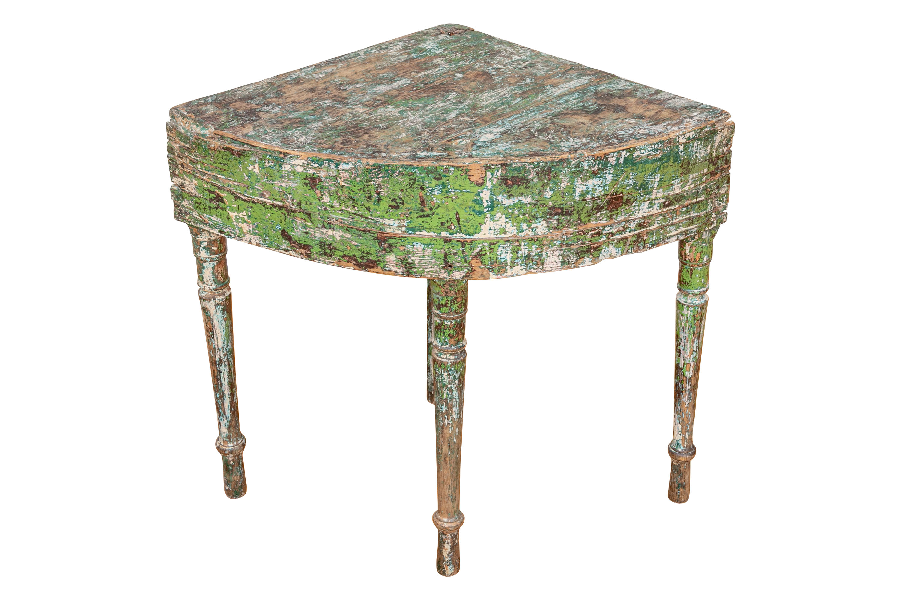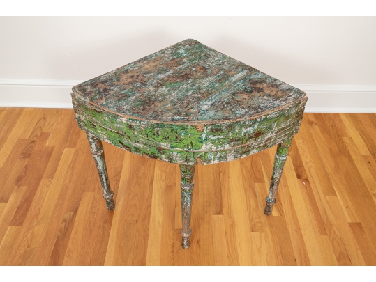 Originally acquired at the iconic New Preston, Connecticut design shop J. Seitz. A Unique 19th Century Corner Table, likely a one time Wash-Stand, with Turned Legs and desirable time-worn surfaces. Featuring a Desert Color Palette of Sage, Deep Ochre and White, the Table has been stripped and painted over several times resulting in an astonishing Patchwork surface. Nail and Tenon construction in keeping with the truly Primitive Nature of this great piece.