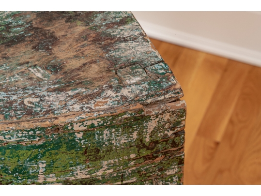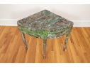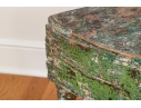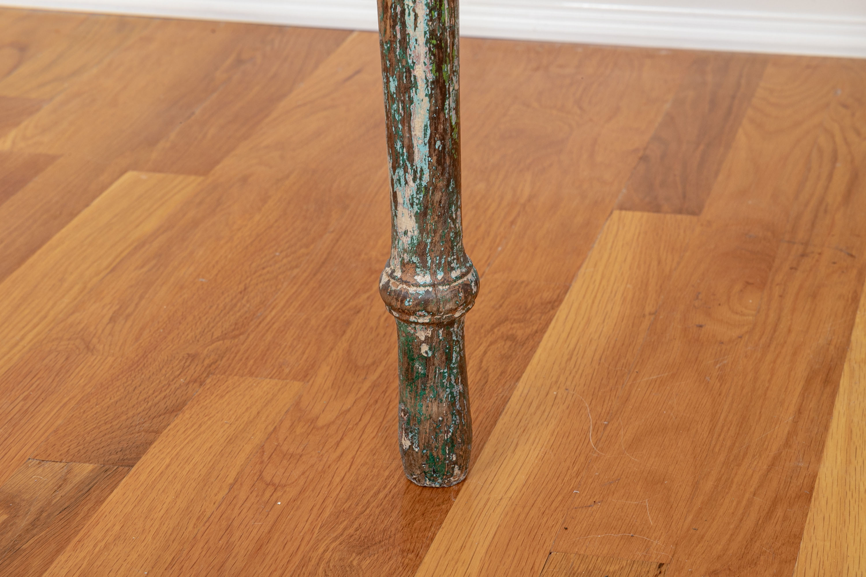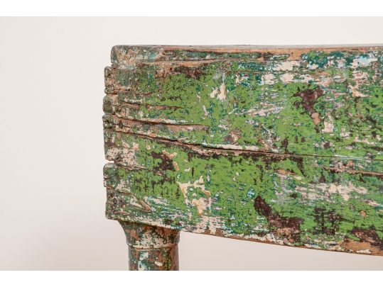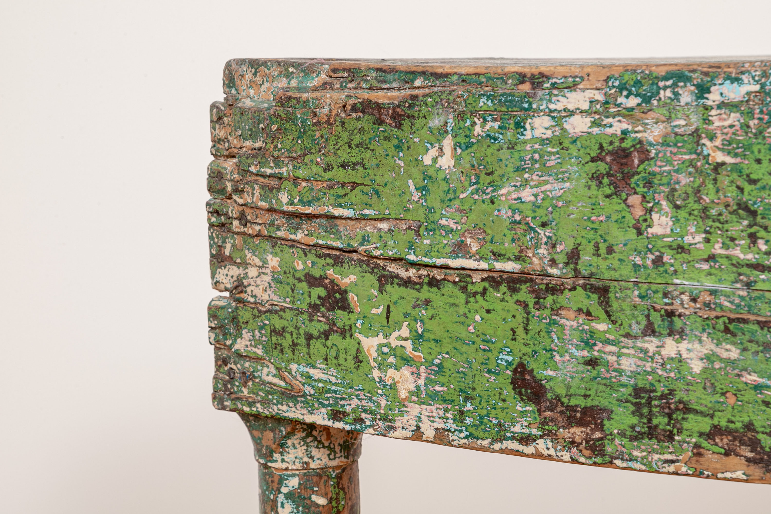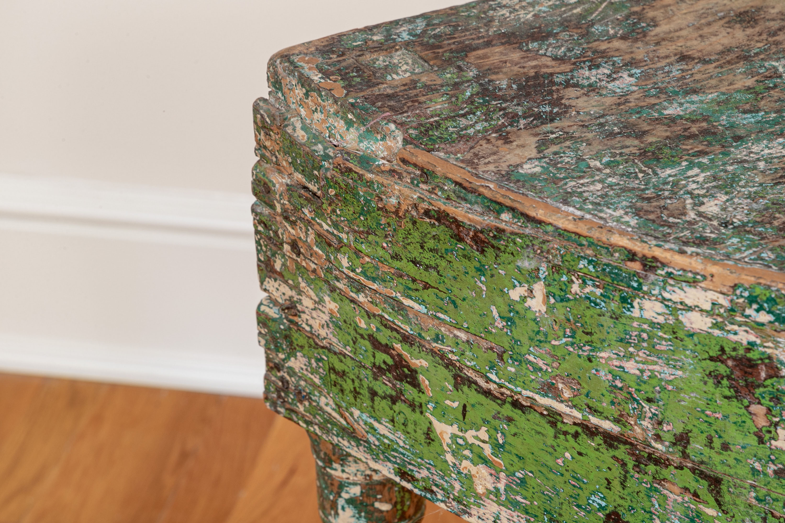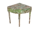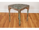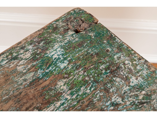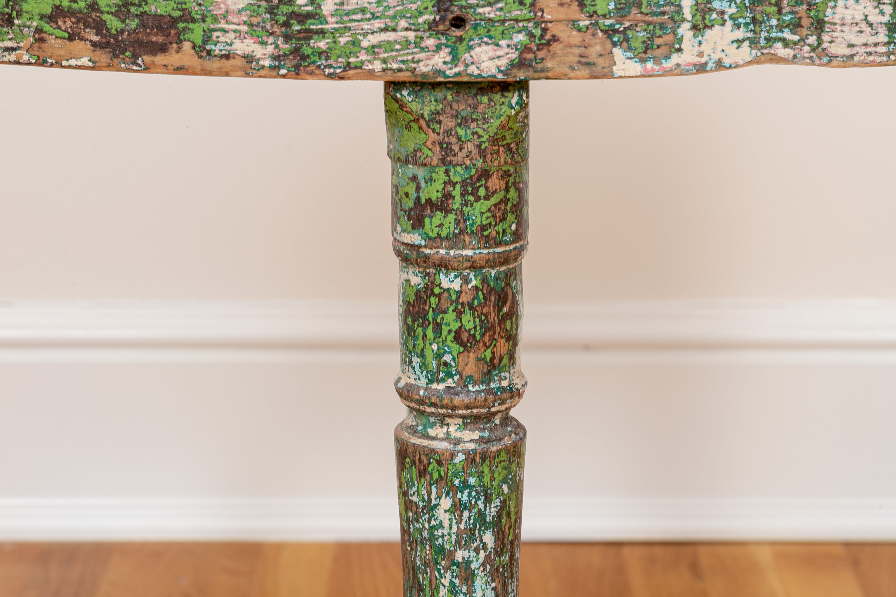 Originally acquired at the iconic New Preston, Connecticut design shop J. Seitz. A Unique 19th Century Corner Table, likely a one time Wash-Stand, with Turned Legs and desirable time-worn surfaces. Featuring a Desert Color Palette of Sage, Deep Ochre and White, the Table has been stripped and painted over several times resulting in an astonishing Patchwork surface. Nail and Tenon construction in keeping with the truly Primitive Nature of this great piece.