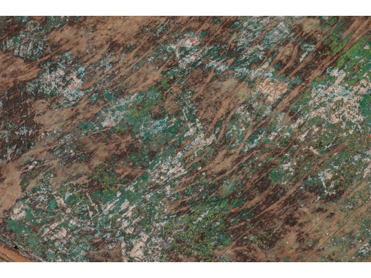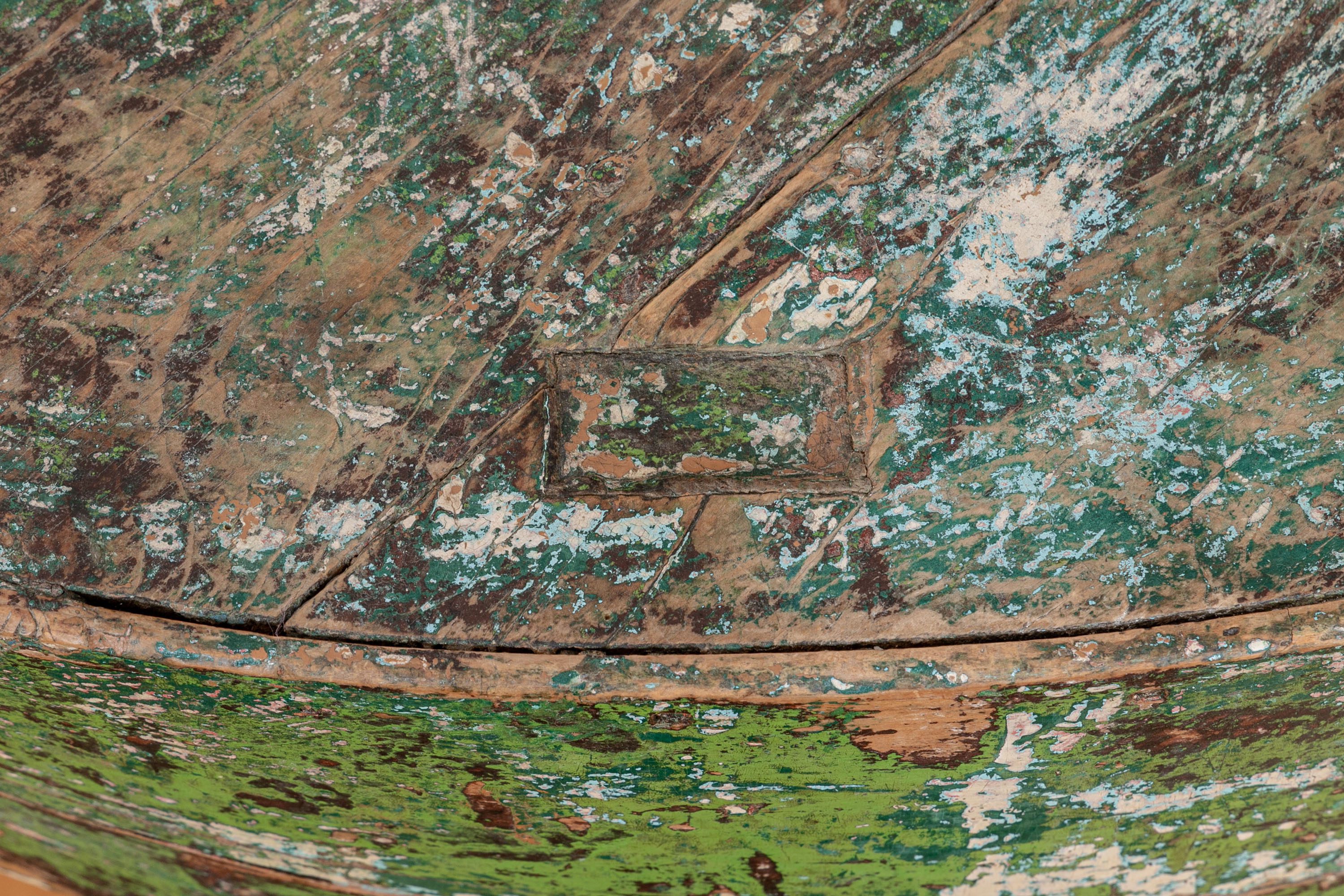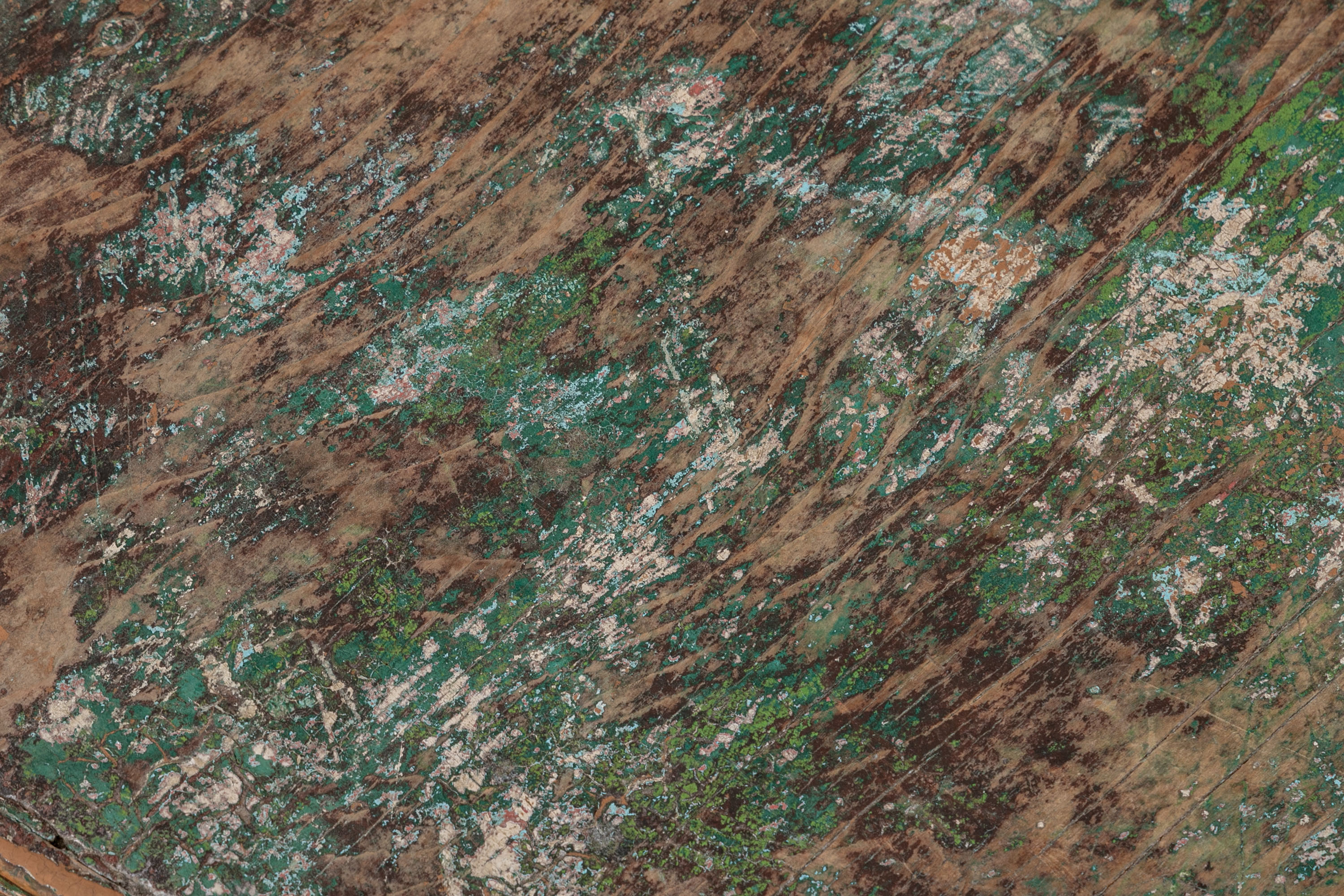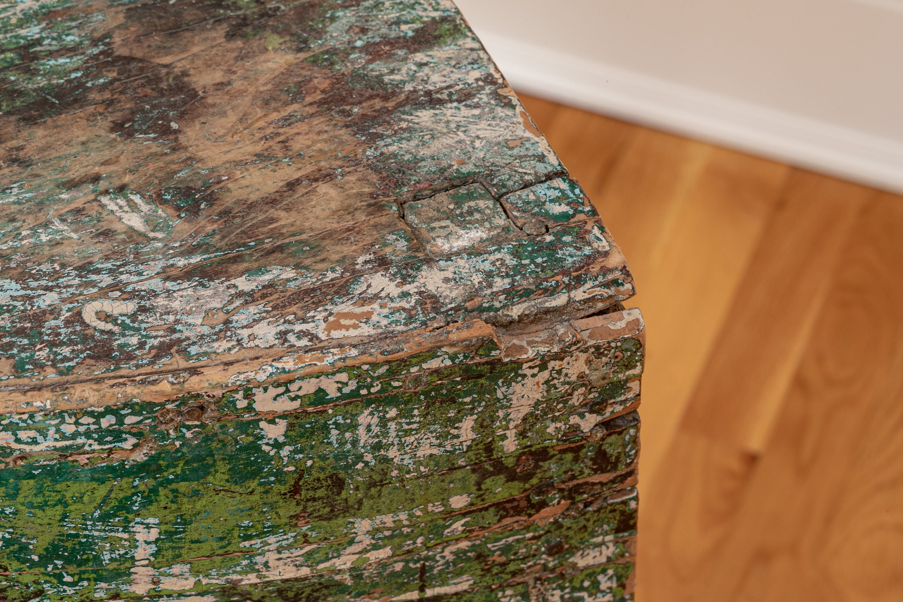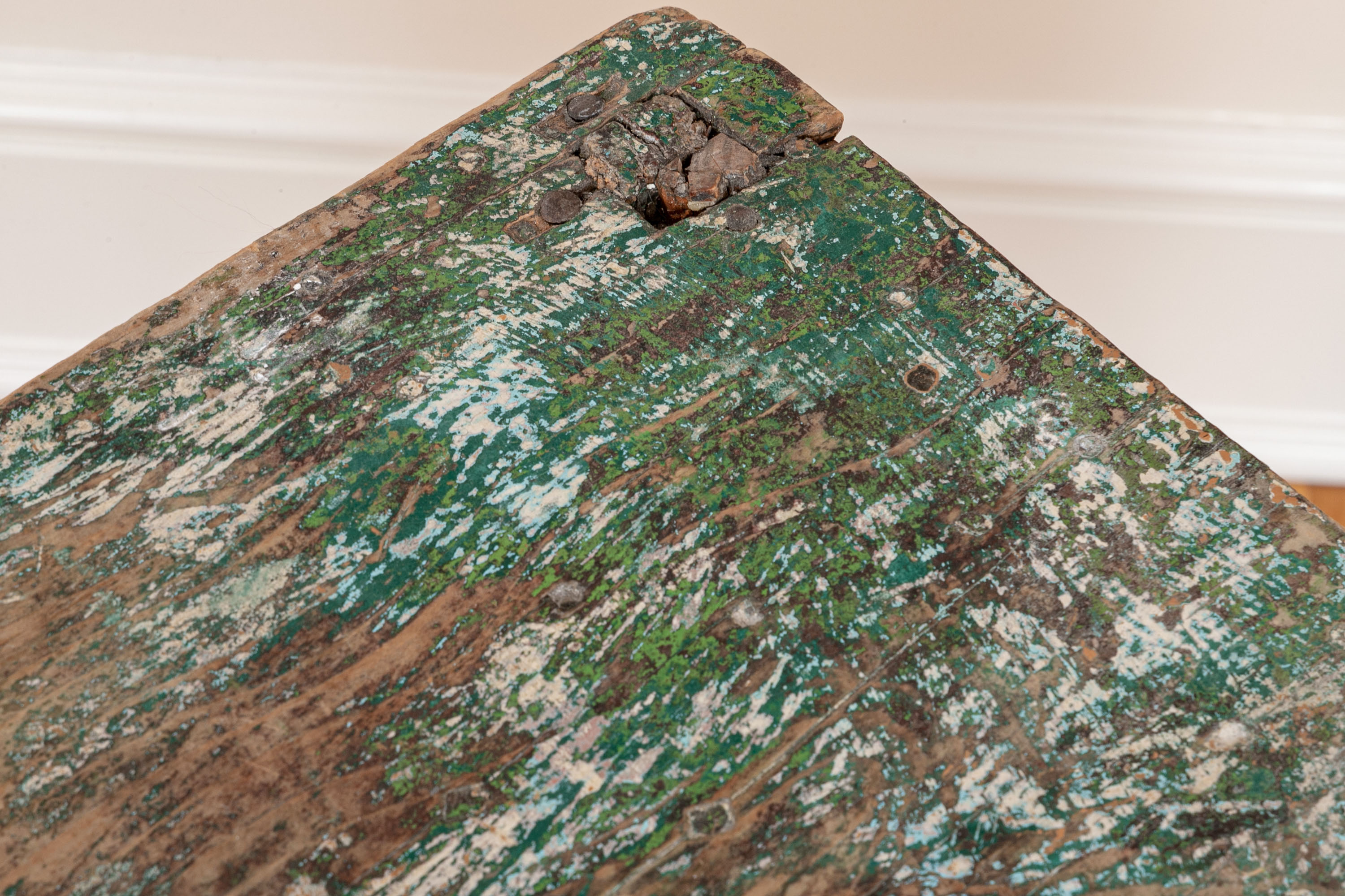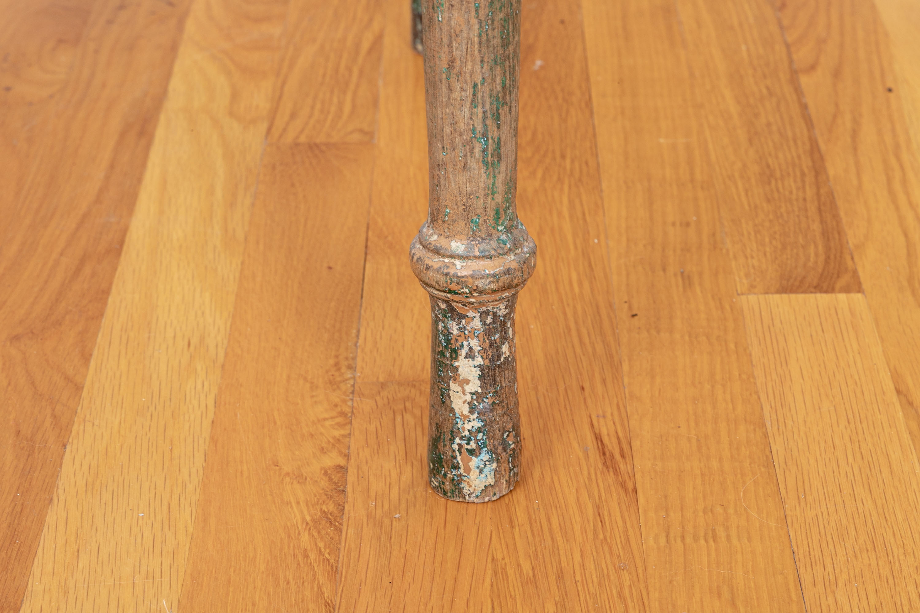 Originally acquired at the iconic New Preston, Connecticut design shop J. Seitz. A Unique 19th Century Corner Table, likely a one time Wash-Stand, with Turned Legs and desirable time-worn surfaces. Featuring a Desert Color Palette of Sage, Deep Ochre and White, the Table has been stripped and painted over several times resulting in an astonishing Patchwork surface. Nail and Tenon construction in keeping with the truly Primitive Nature of this great piece.
