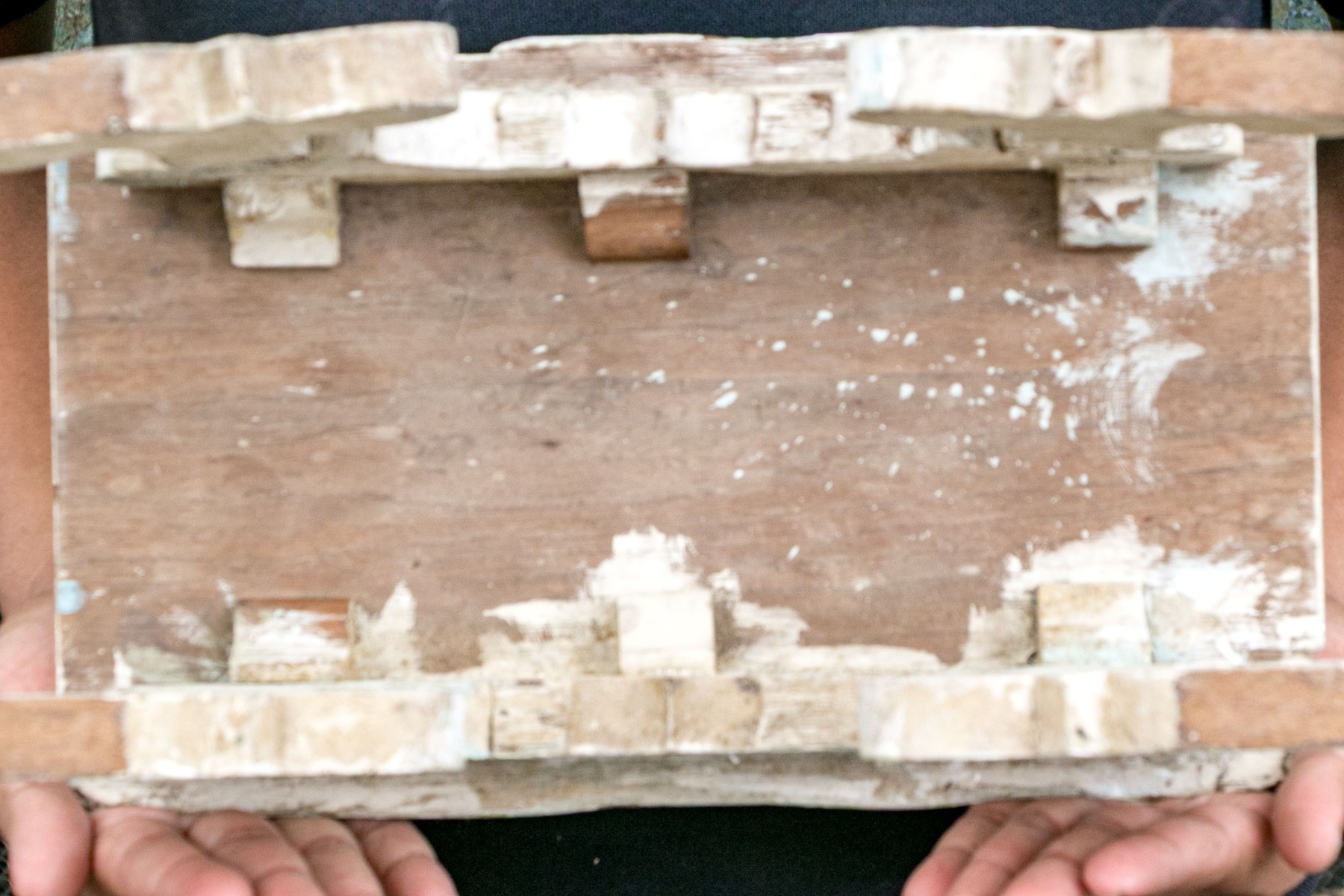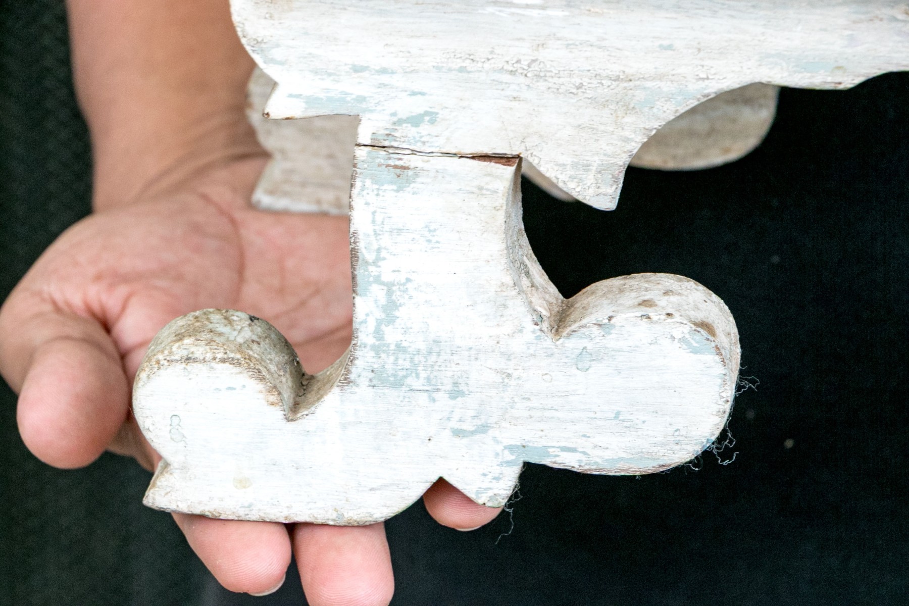 Wear including splits and cracks with one leg having a break and not standing straight. Overall there is heavy wear to the painted finish commensurate with age that adds to the rustic charm of the piece.