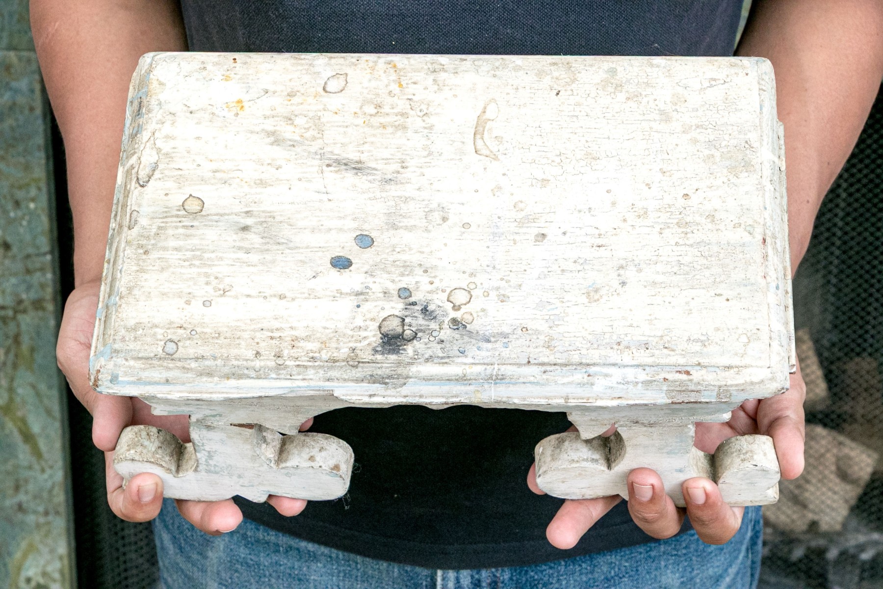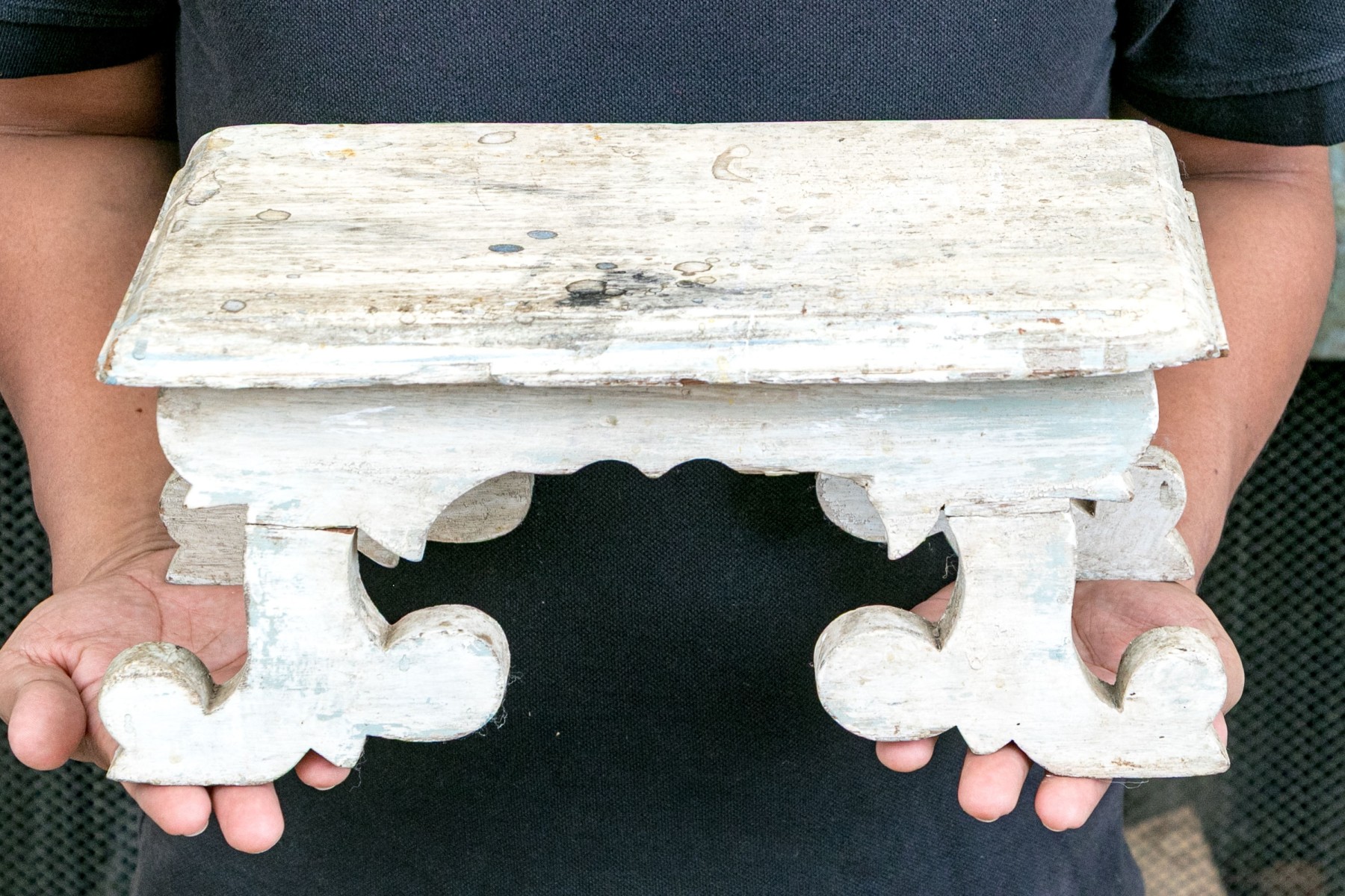 A darling little step stool or display stand painted rustic white, detailed with a rectangular top with an ogee edge overhanging a shapely apron with bracket legs reminiscent of old gingerbread designs.