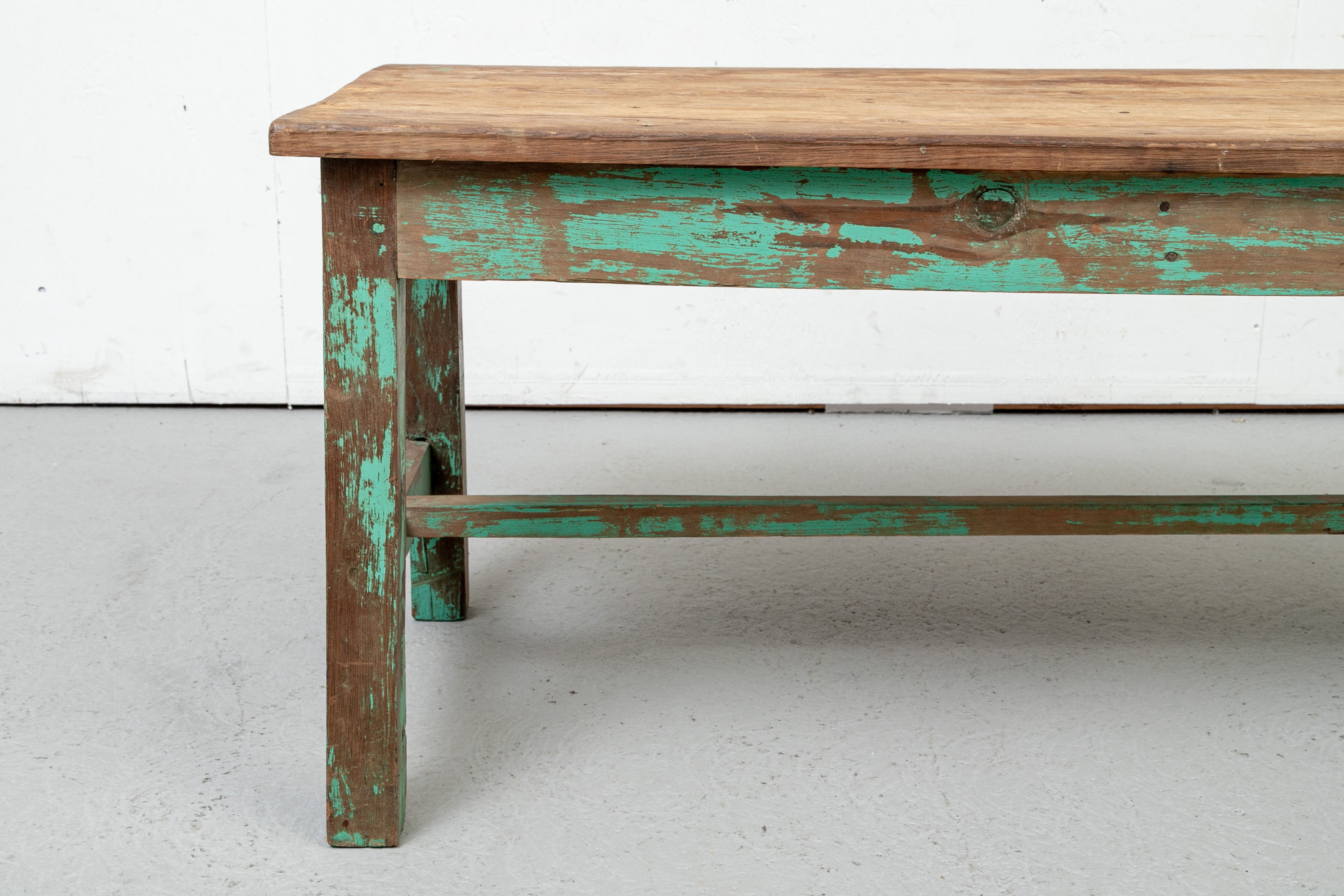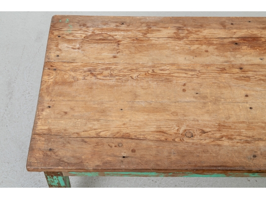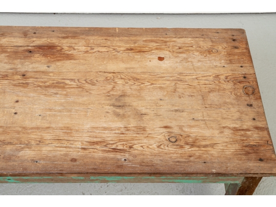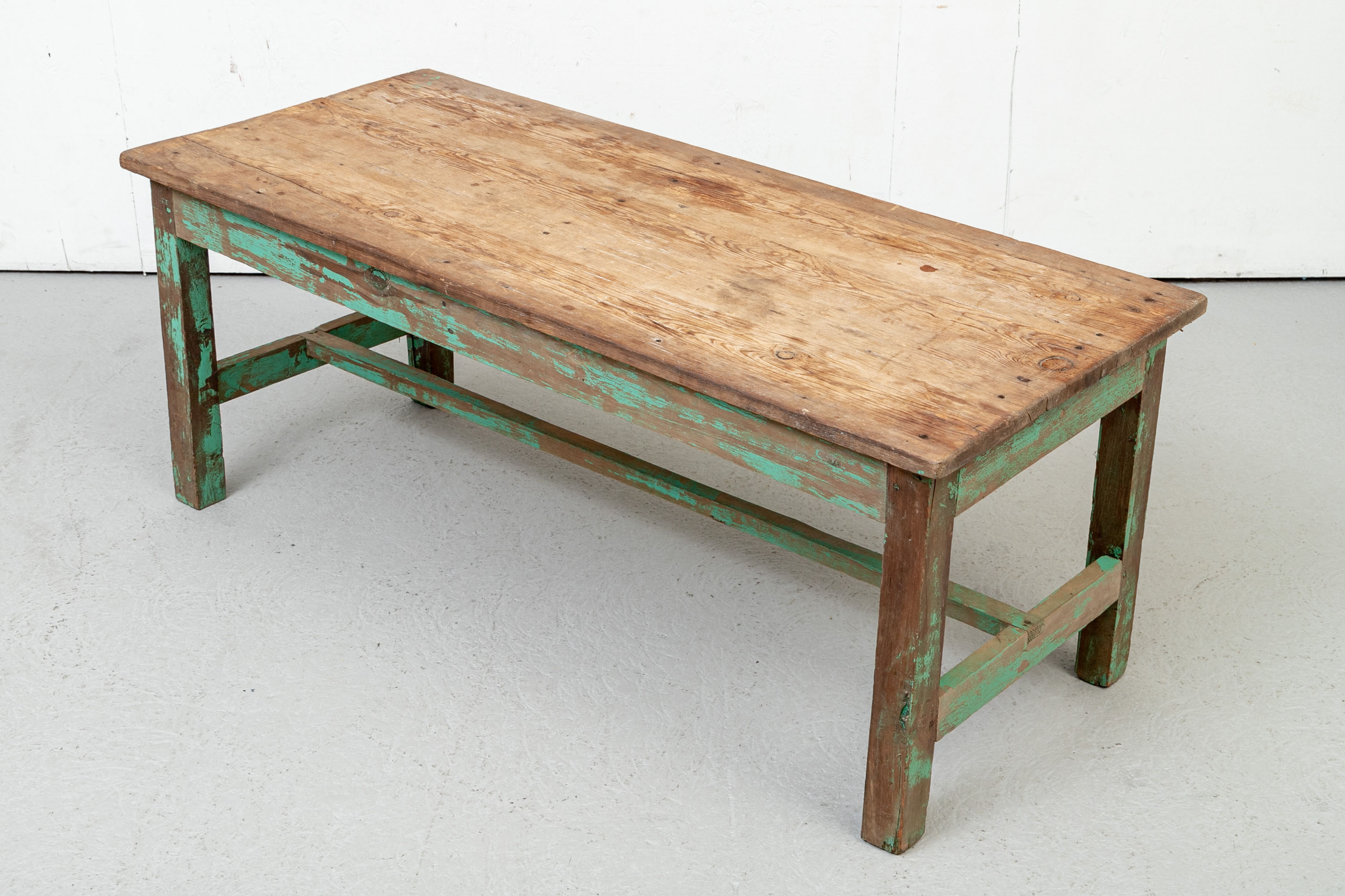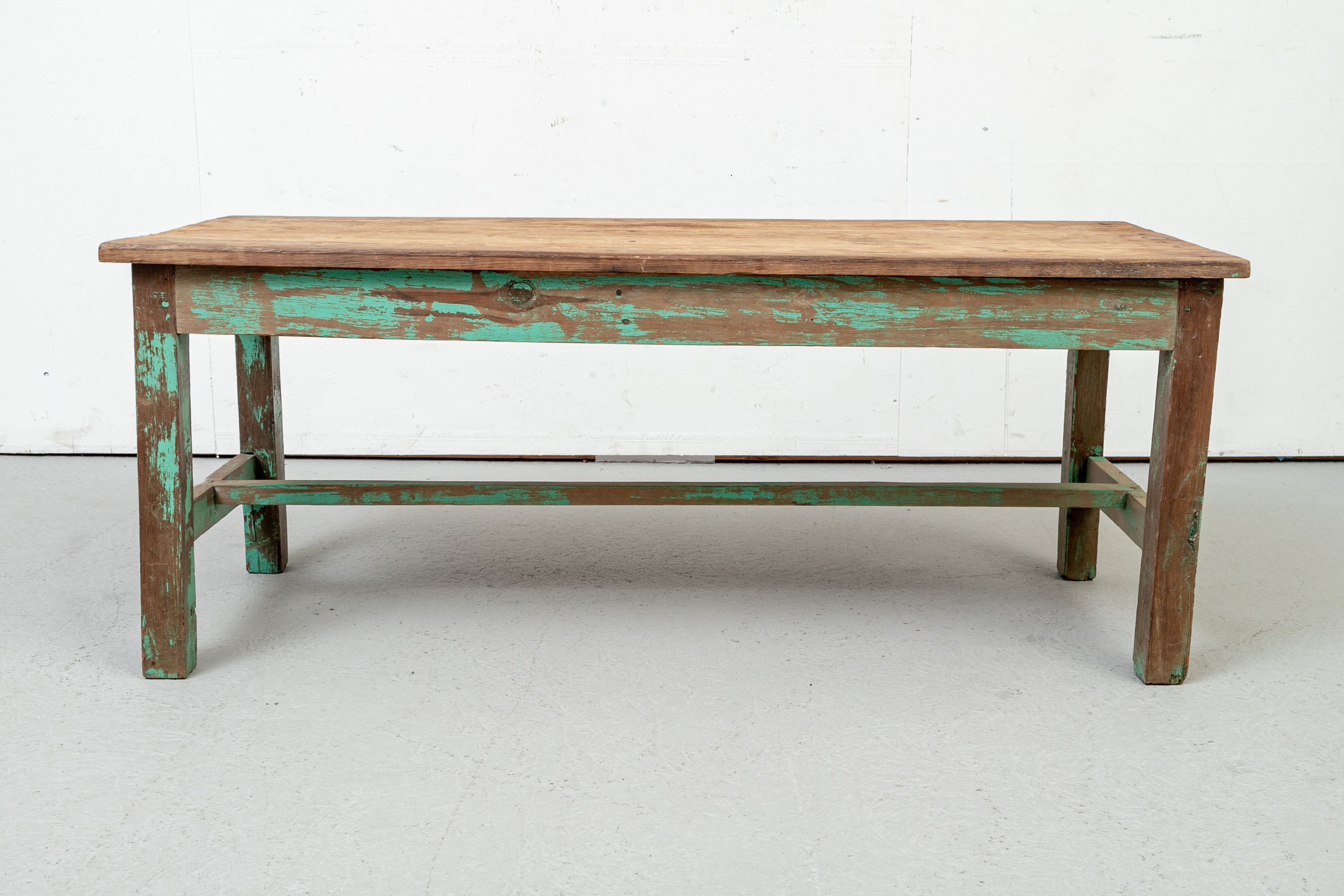 Originally acquired at the iconic New Preston, Connecticut design shop J. Seitz. A very well made Antique Table from New Mexico with Natural Wood plank top and having wonderful Sage Green traces of paint on the frame. A charming and simple Primitive Table in all original condition.