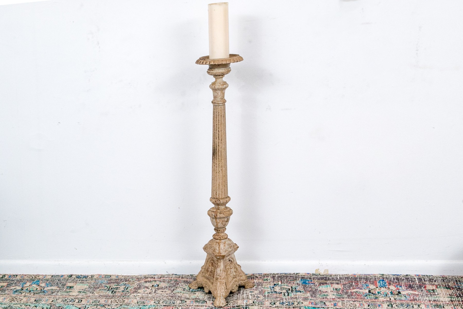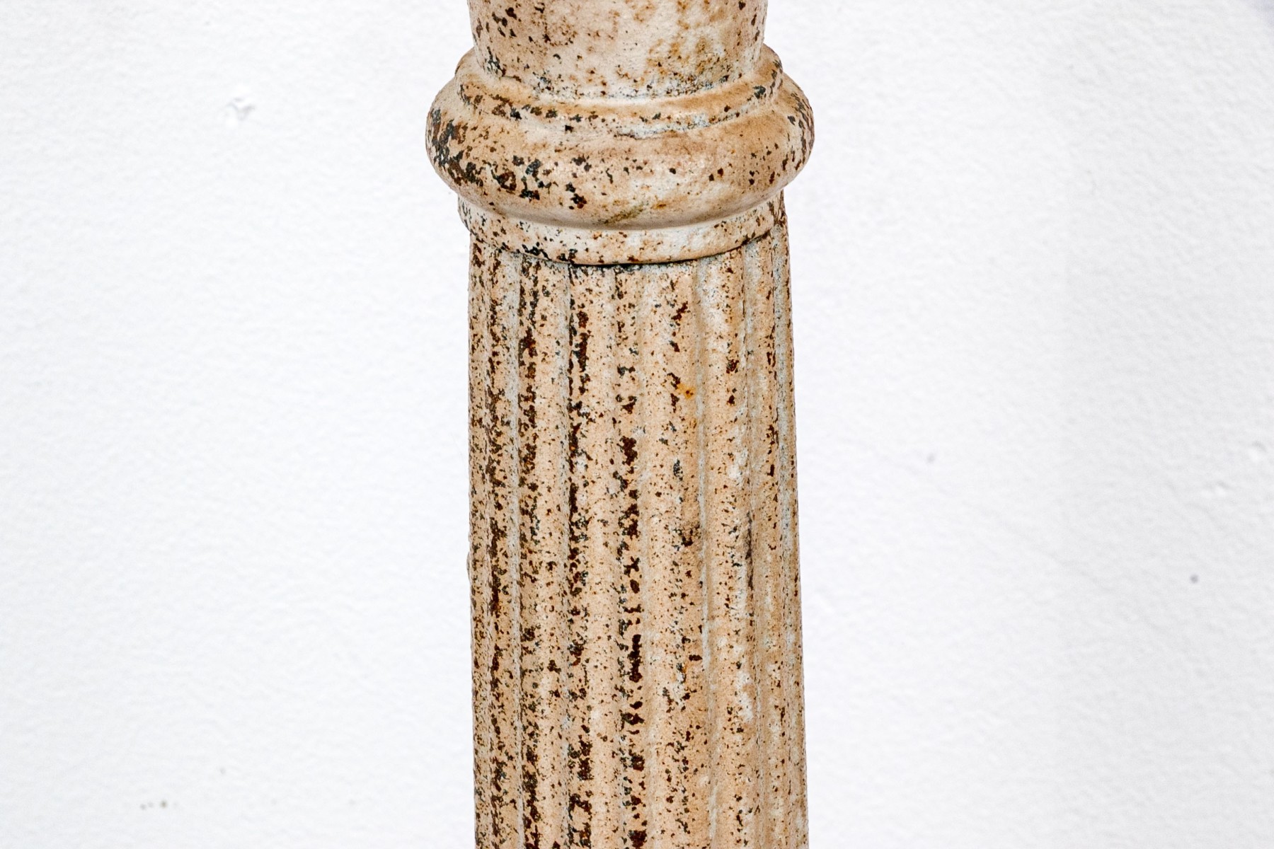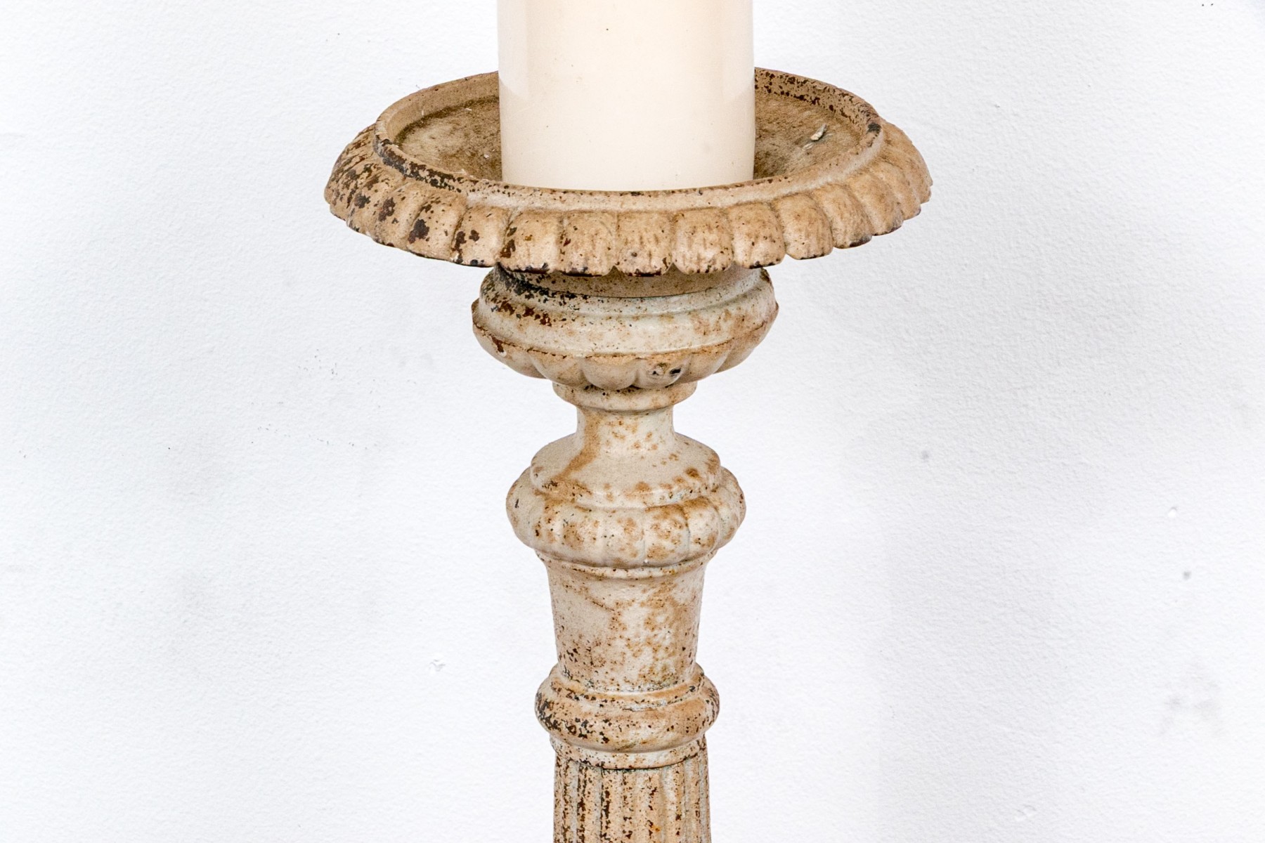 A wonderful antique iron floor standing candle prick featuring an everted lappet rim over an elegant fluted and tapered column leading down to an urn or acorn knop raised over a triangular base with short feet. All in a lovely rustic beige-brown painted finish.