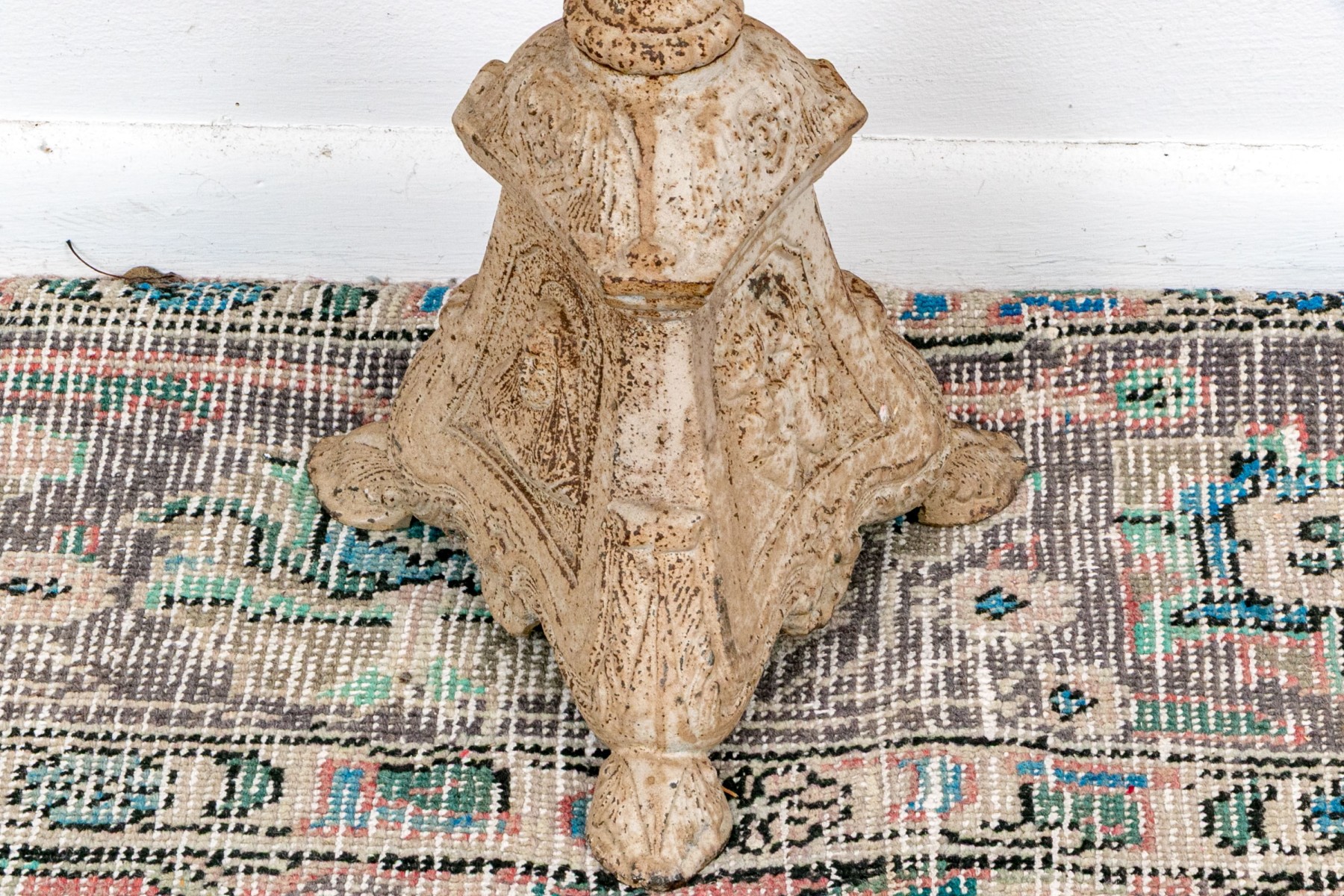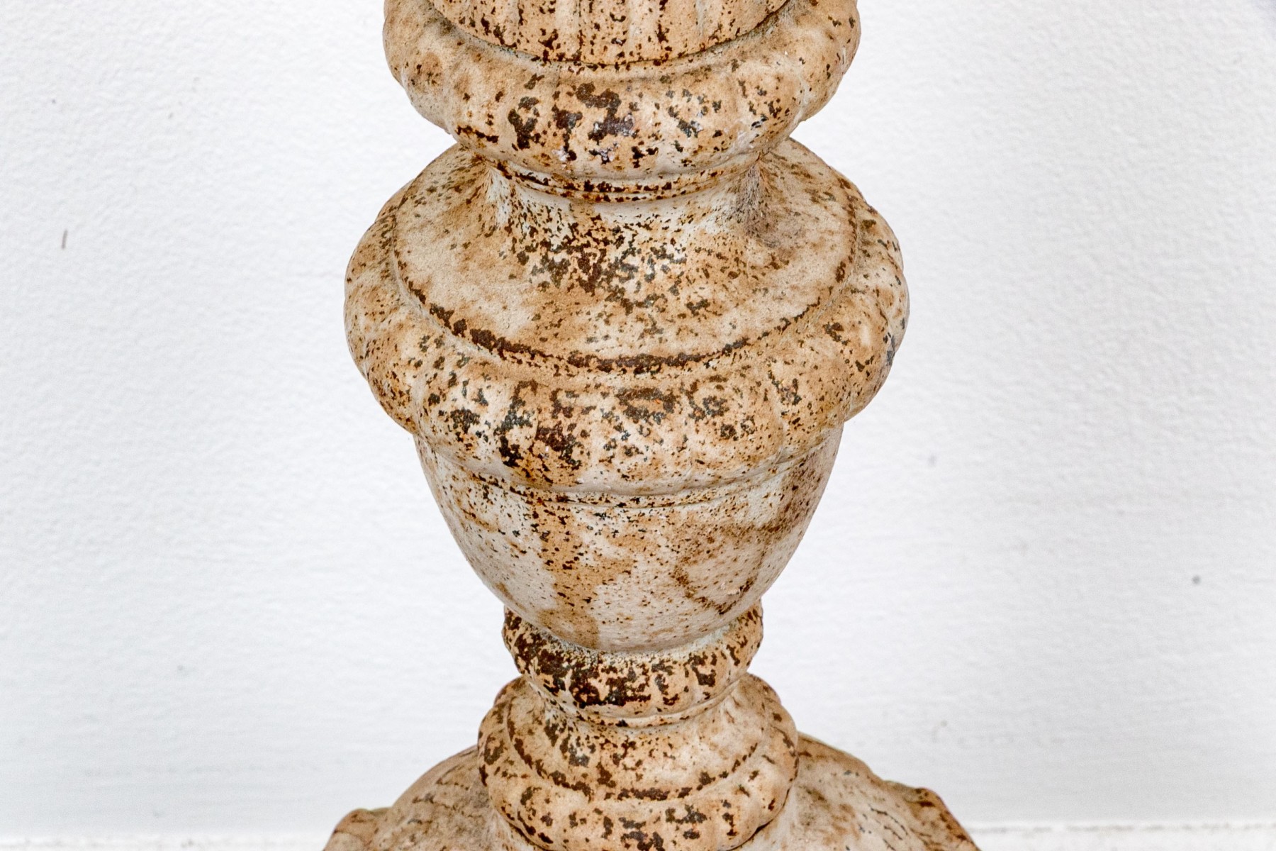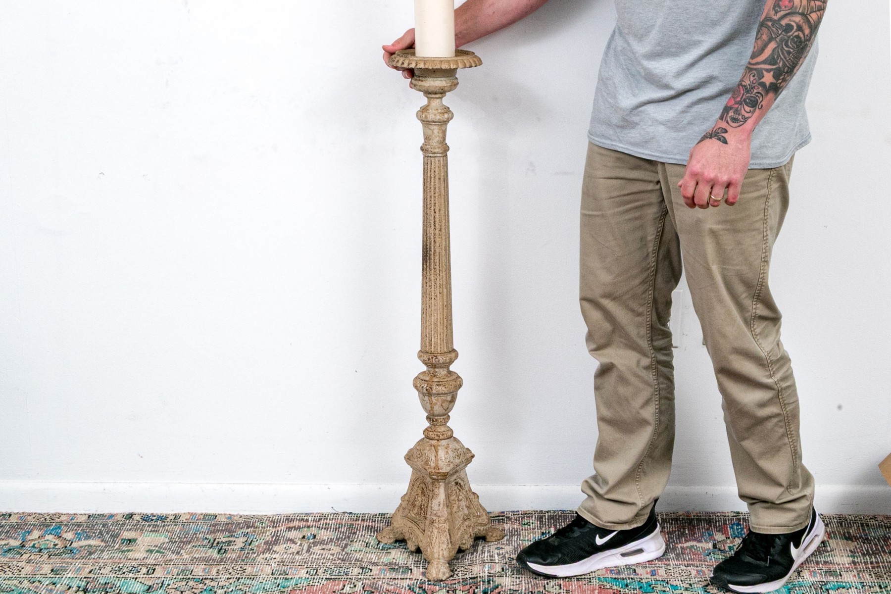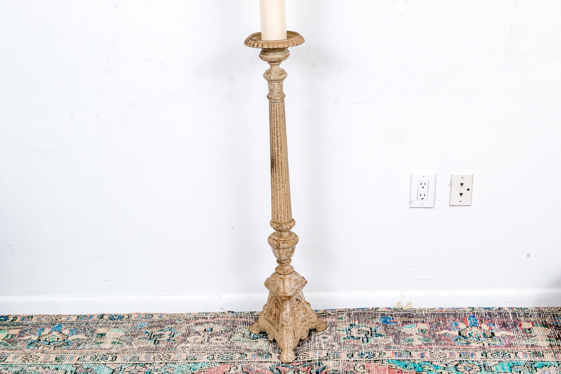 A wonderful antique iron floor standing candle prick featuring an everted lappet rim over an elegant fluted and tapered column leading down to an urn or acorn knop raised over a triangular base with short feet. All in a lovely rustic beige-brown painted finish.