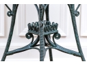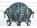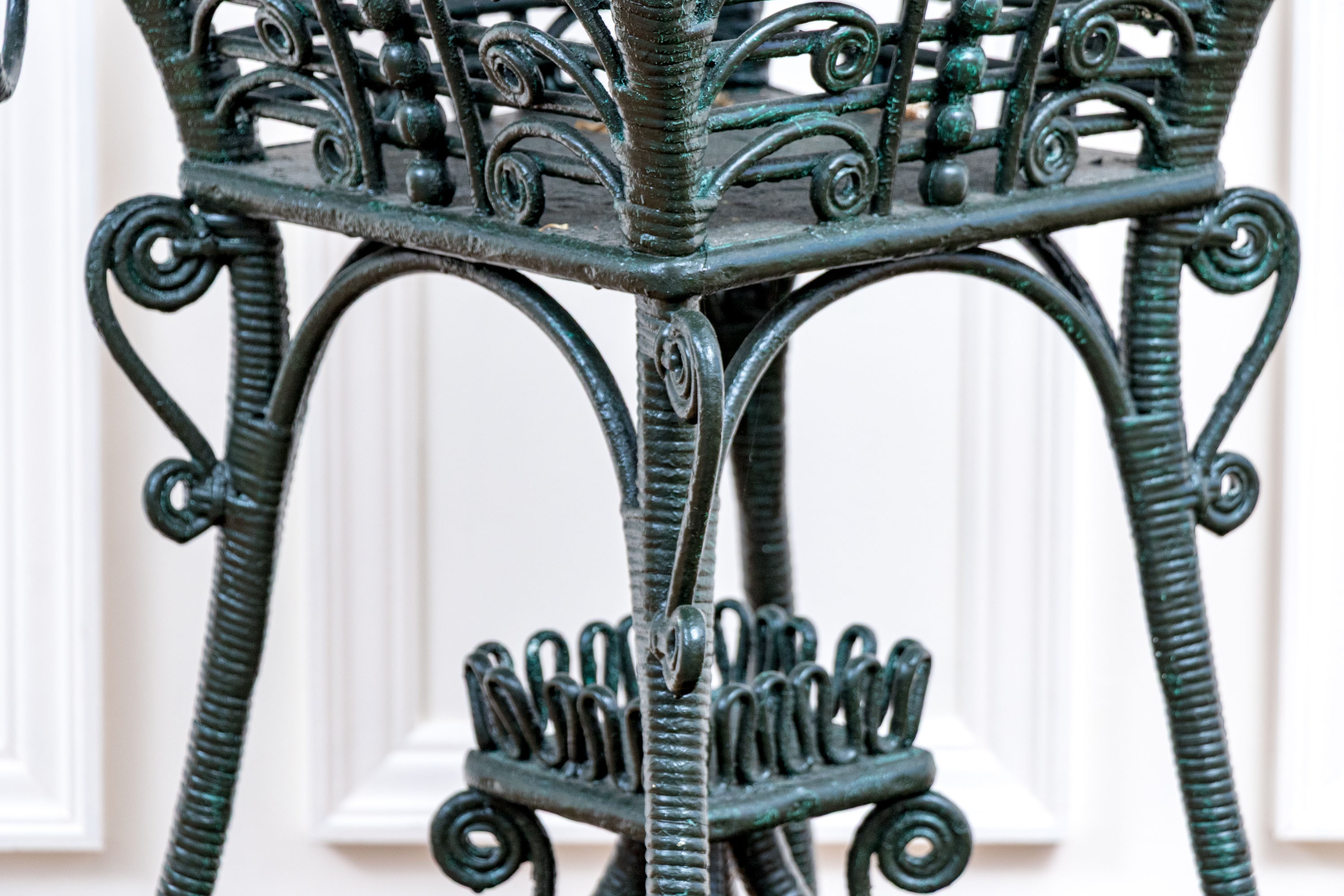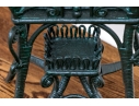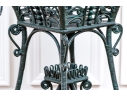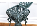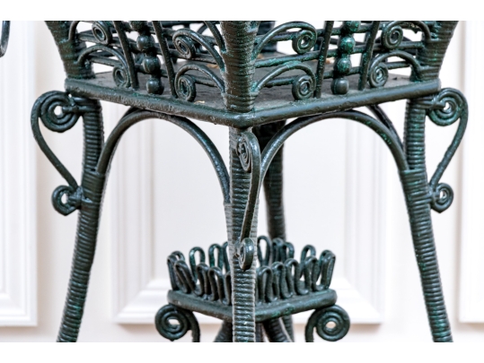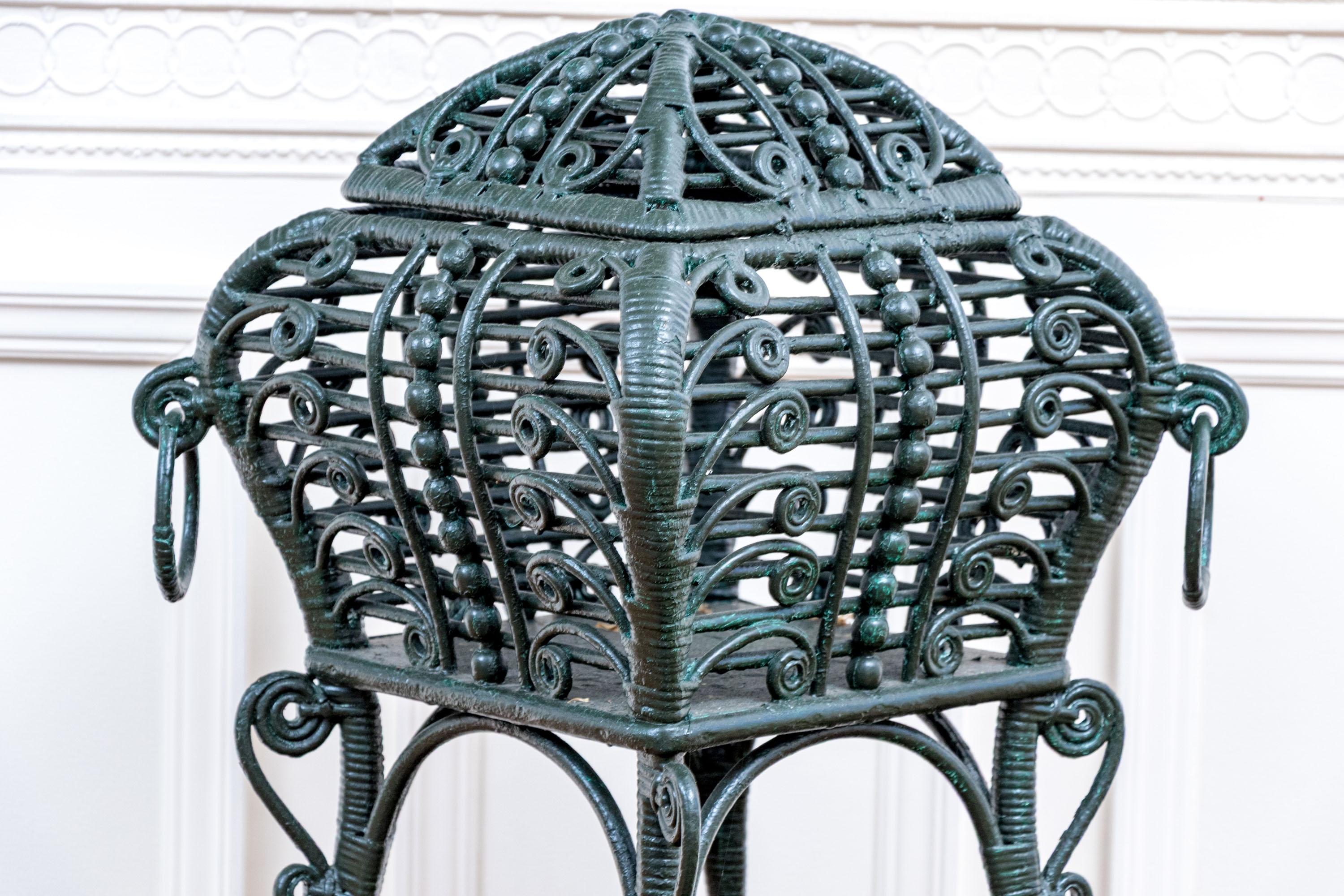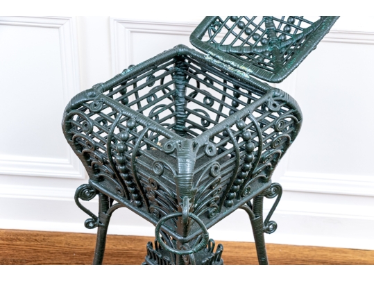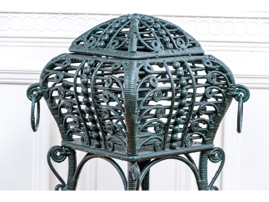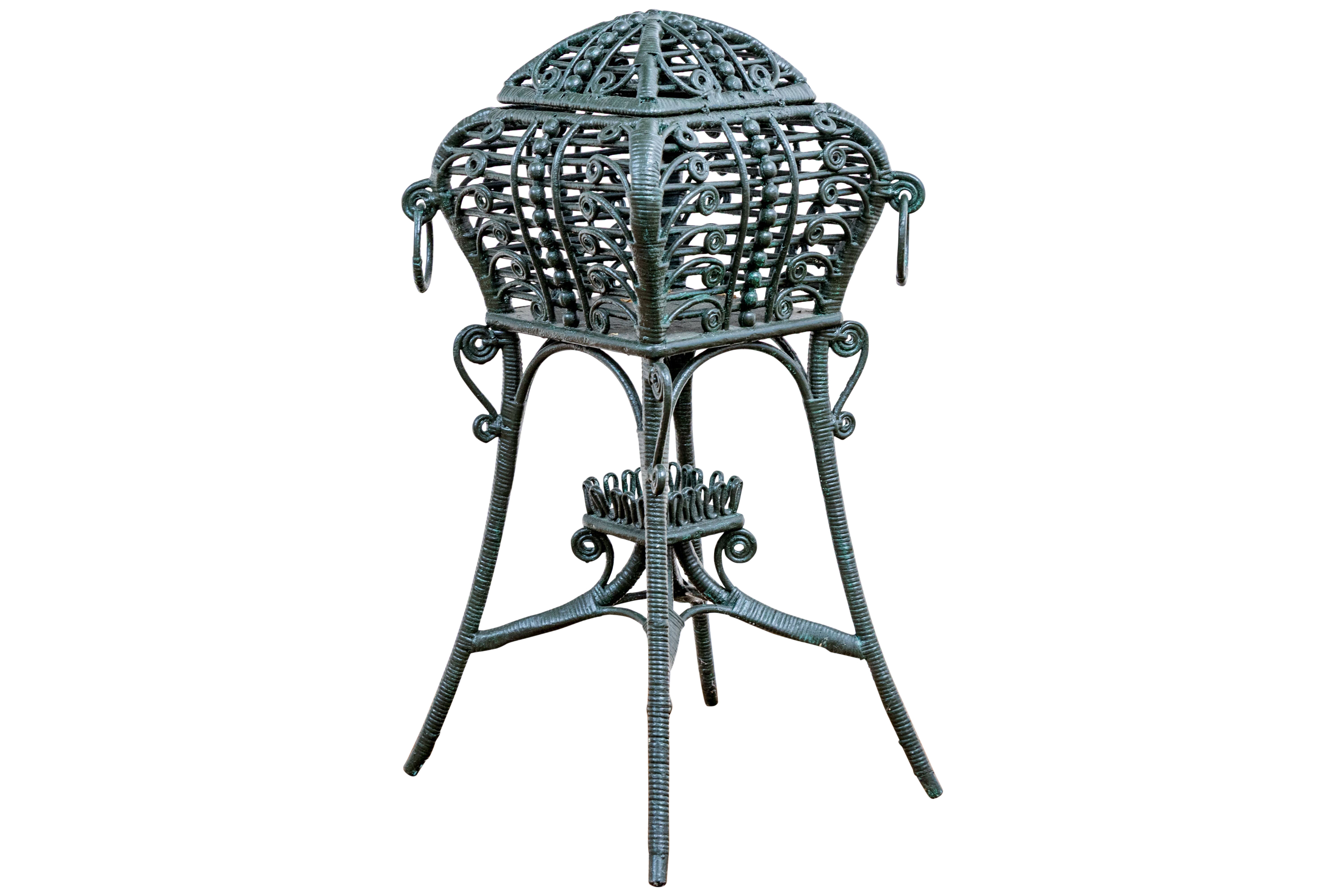 The square lidded box on stand is painted in dark hunter green and finely constructed with beaded and scrolled details. The dome top has a hinged lid and two side corners have rings. Raised on tall splayed legs with stretchers and a small center round shelf.