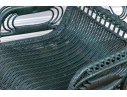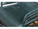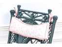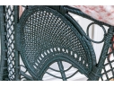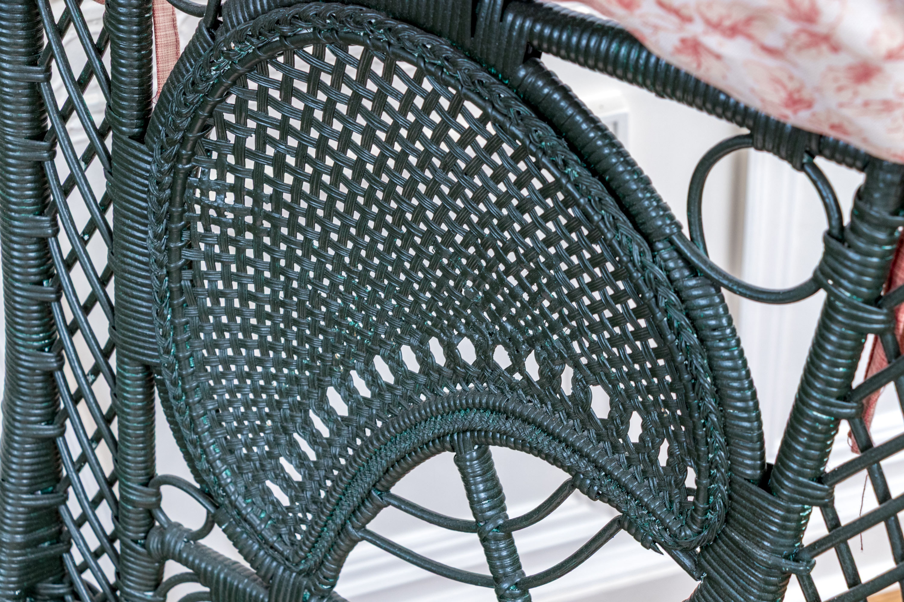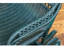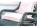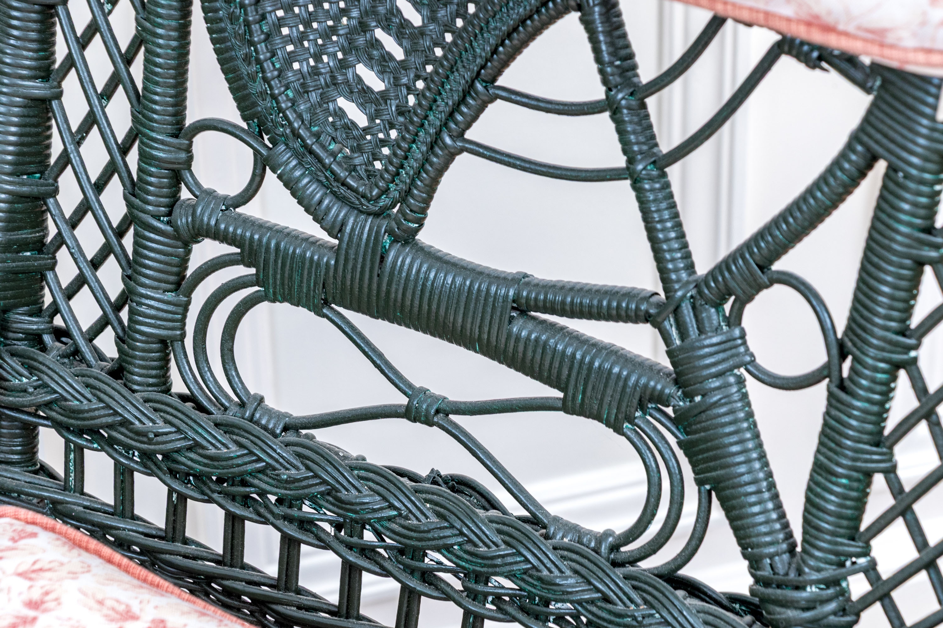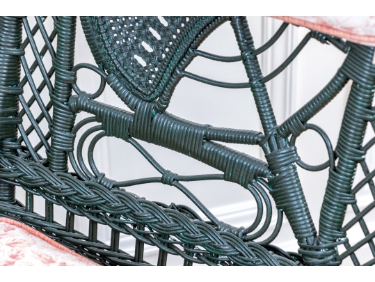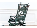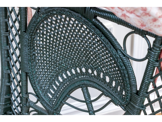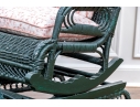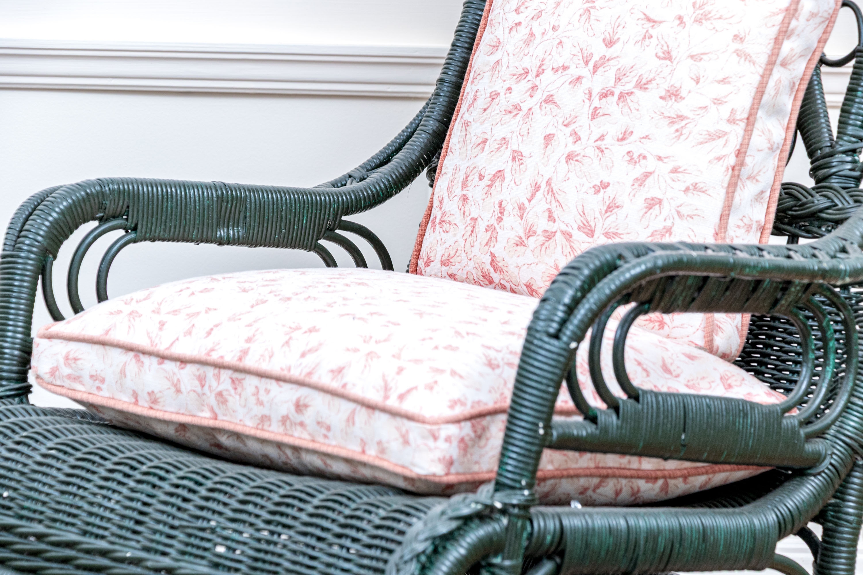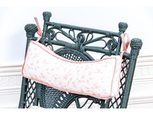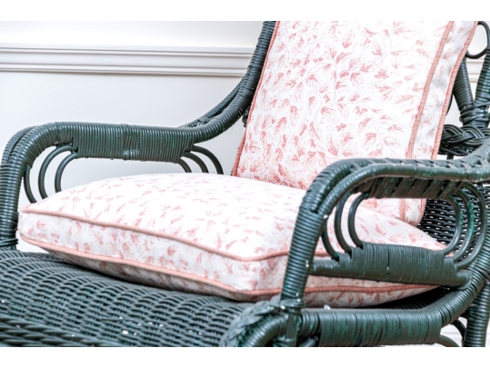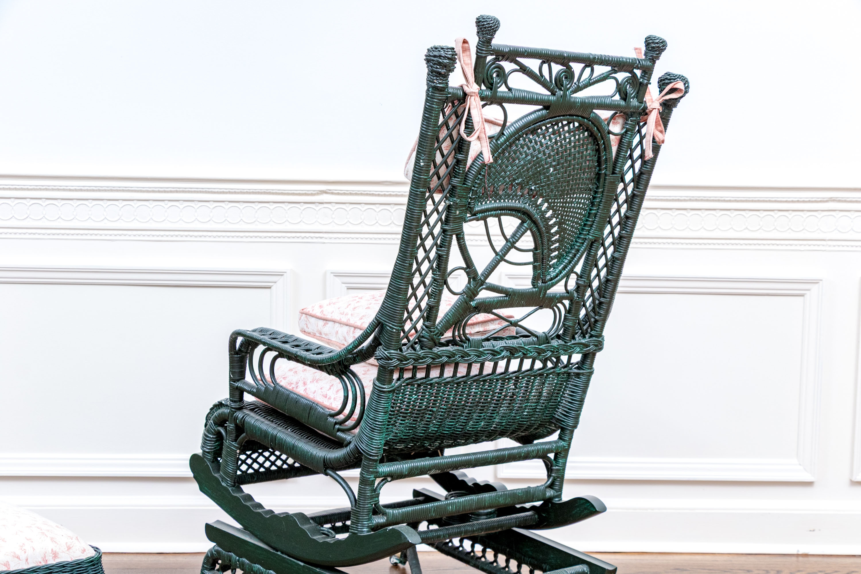 The set is painted in dark hunter green and fine openwork construction. The rocking chair tall back with a fan with handle motif befitting a hot summer's day and four knob finials. Scrolls and lattice work overall and the front legs on casters. Along with loose pink on ecru fabric cushions with zippers for the back, head rest and seat. With a small footstool with splayed legs and upholstered in the same fabric.