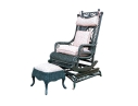 Condition: Please review the detail photos. Various signs of age and use include some minor chips on the chair front frame. The seat and head rest cushions are slightly faded. The footstool has a few chips on the legs and the front frame edge and the upholstery is faded and stained.