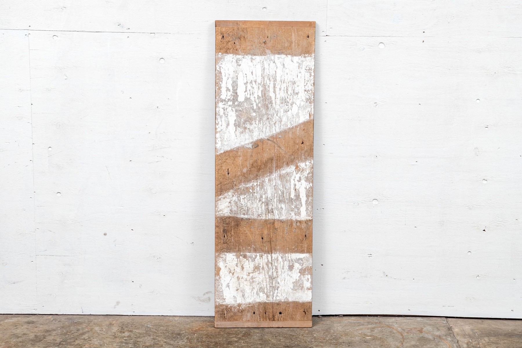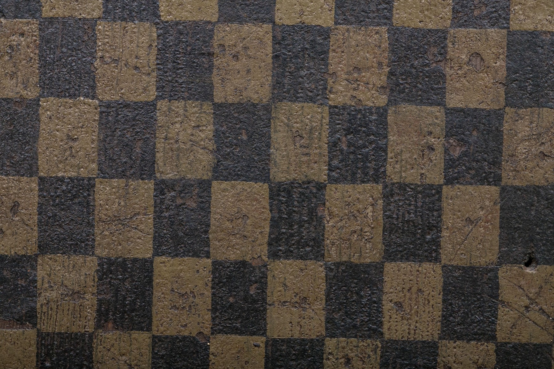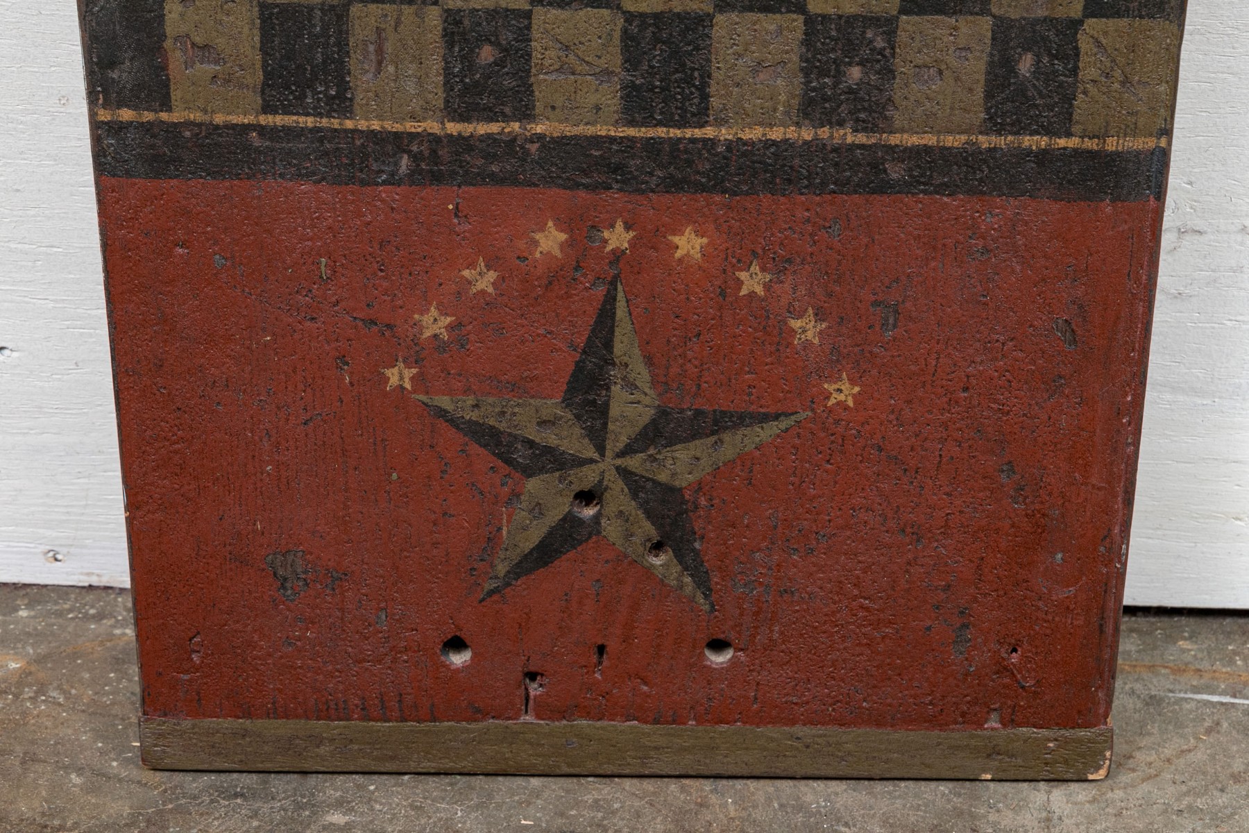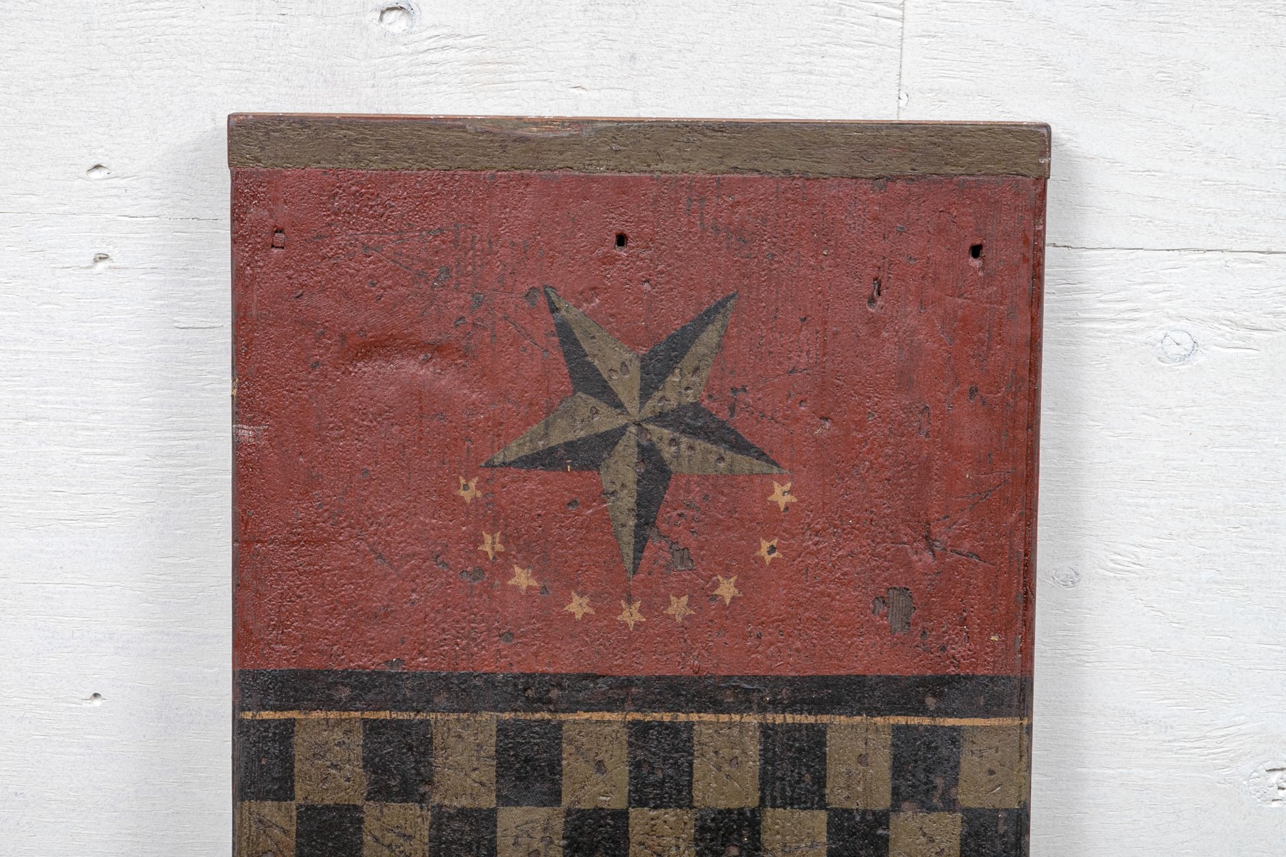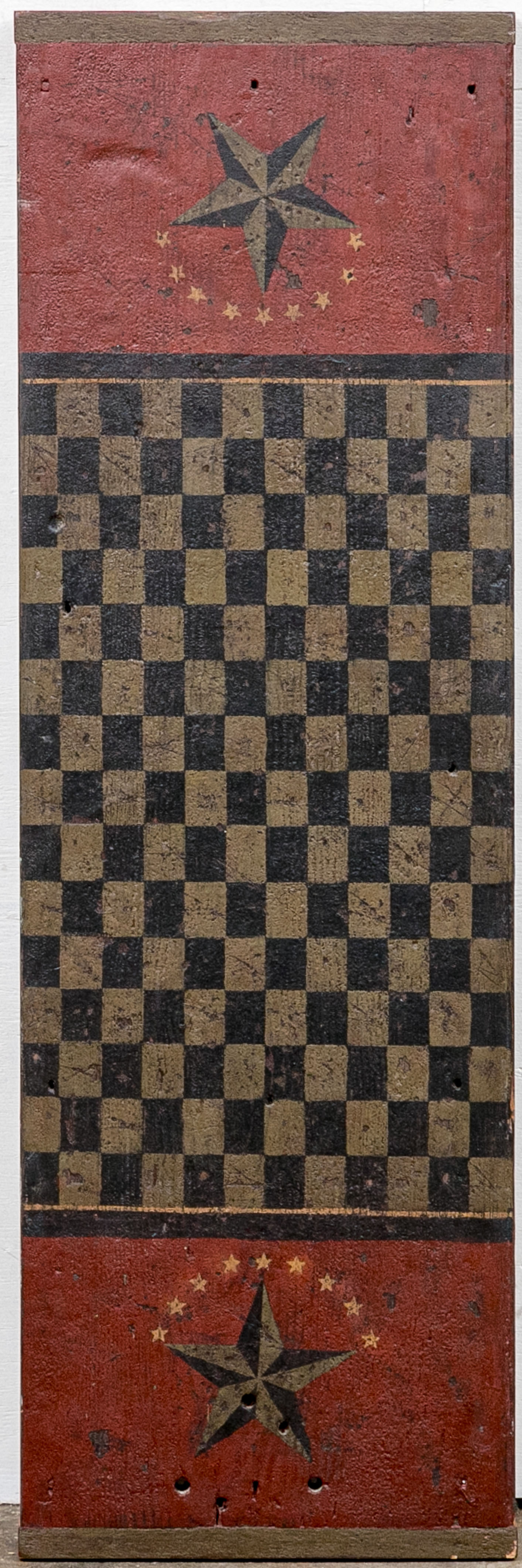 A long rectangular piece of wood painted with a large tan and black checkerboard and a star on barn red ground at each end. Patches of white wash on verso.