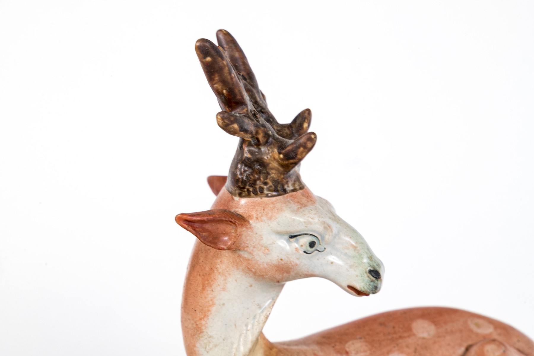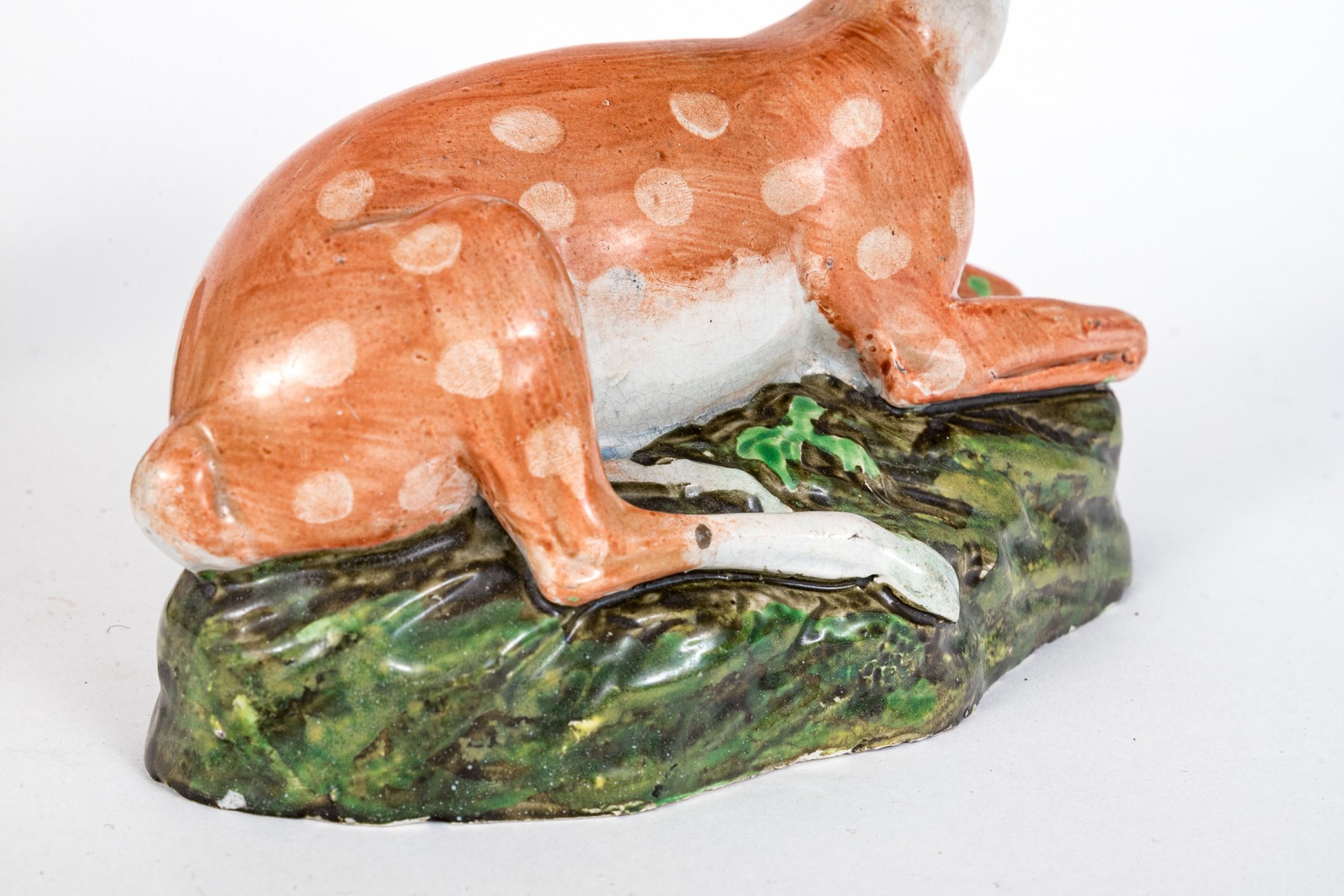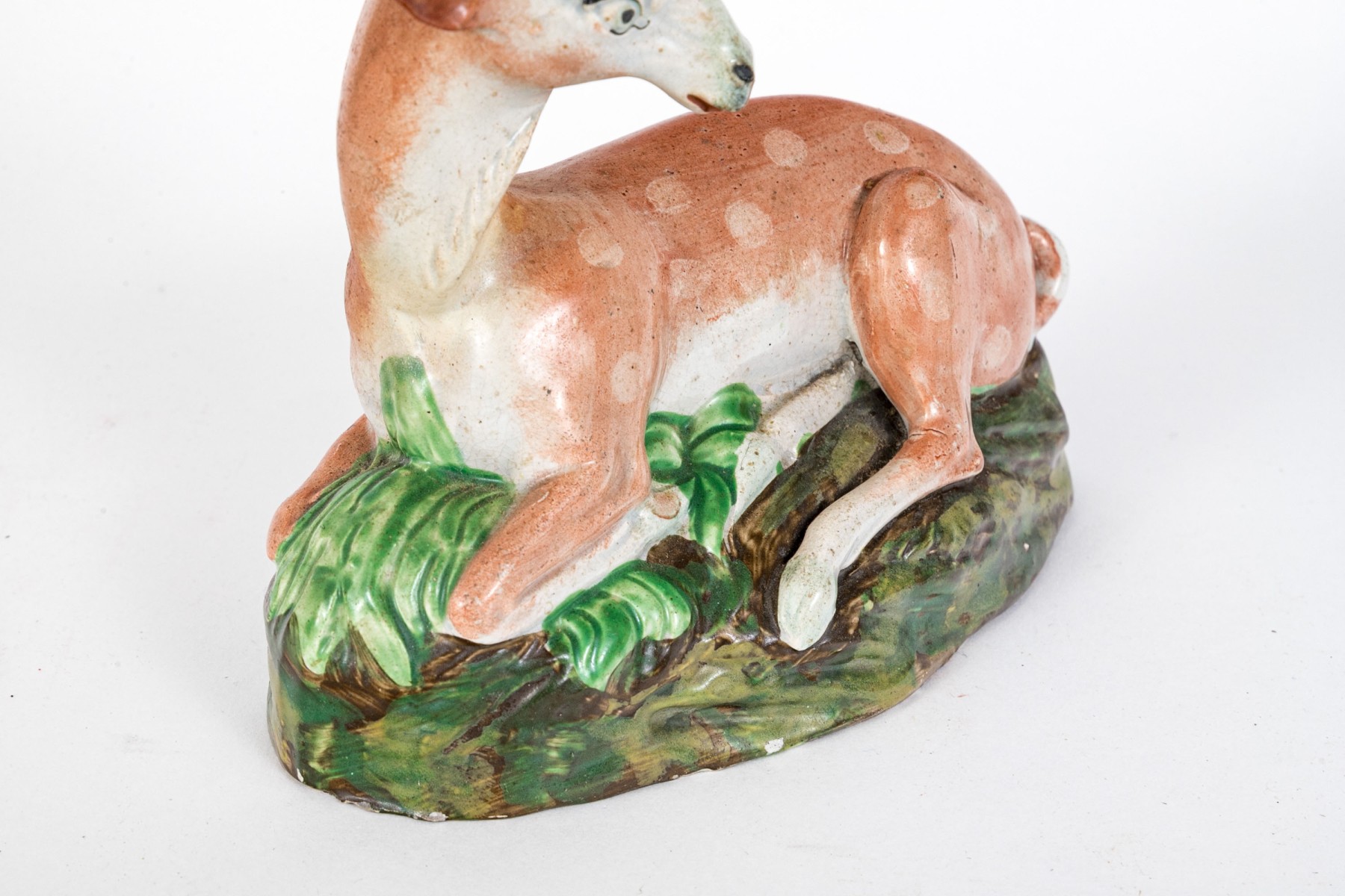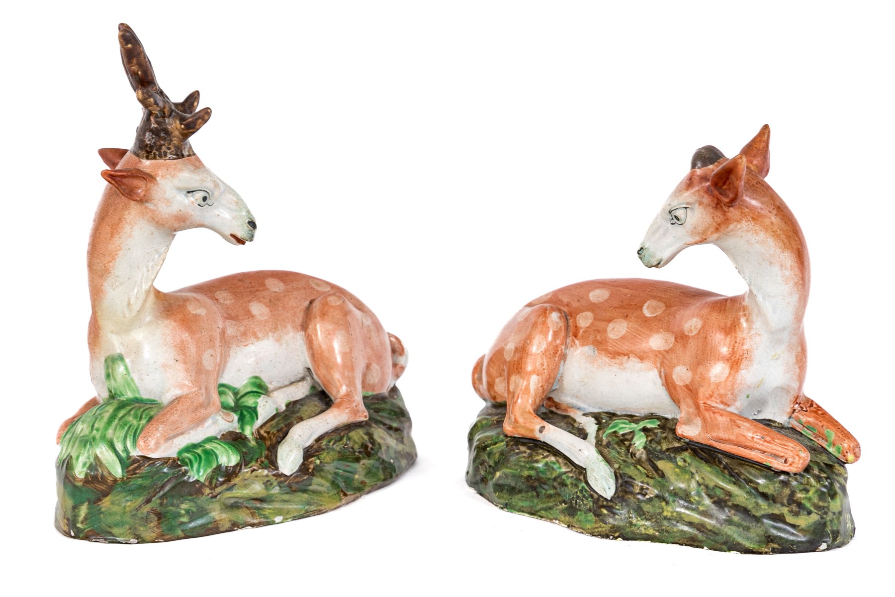 An antique pair of English, Staffordshire hand painted ceramic recumbent deer, depicted reclining on bases decorated with naturalistic grass and earth.