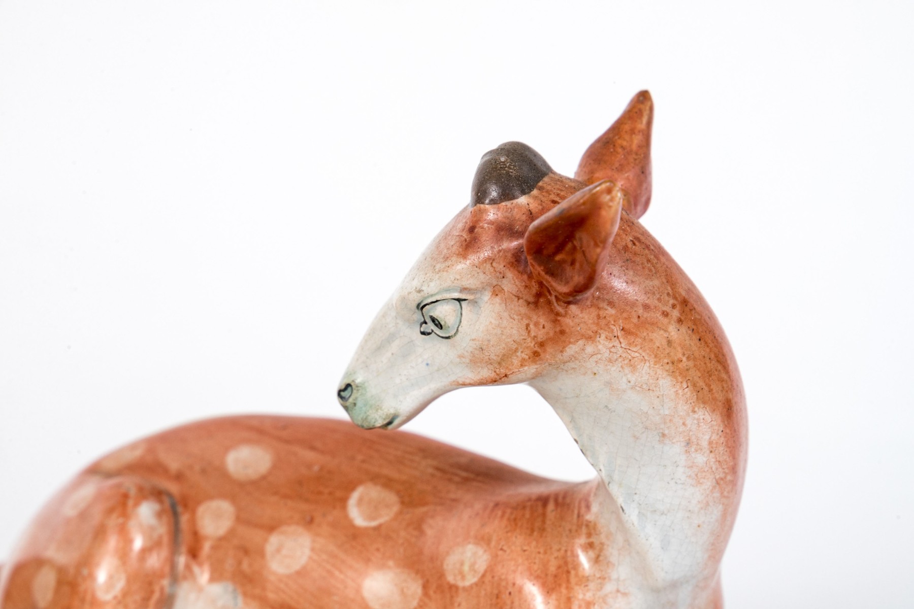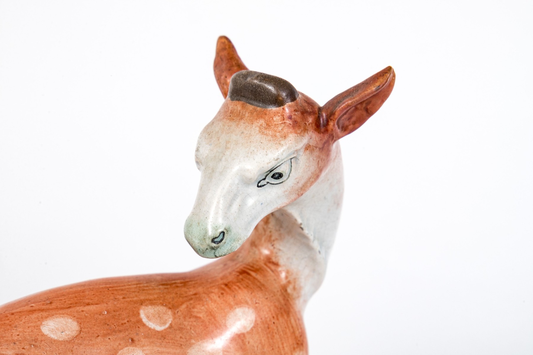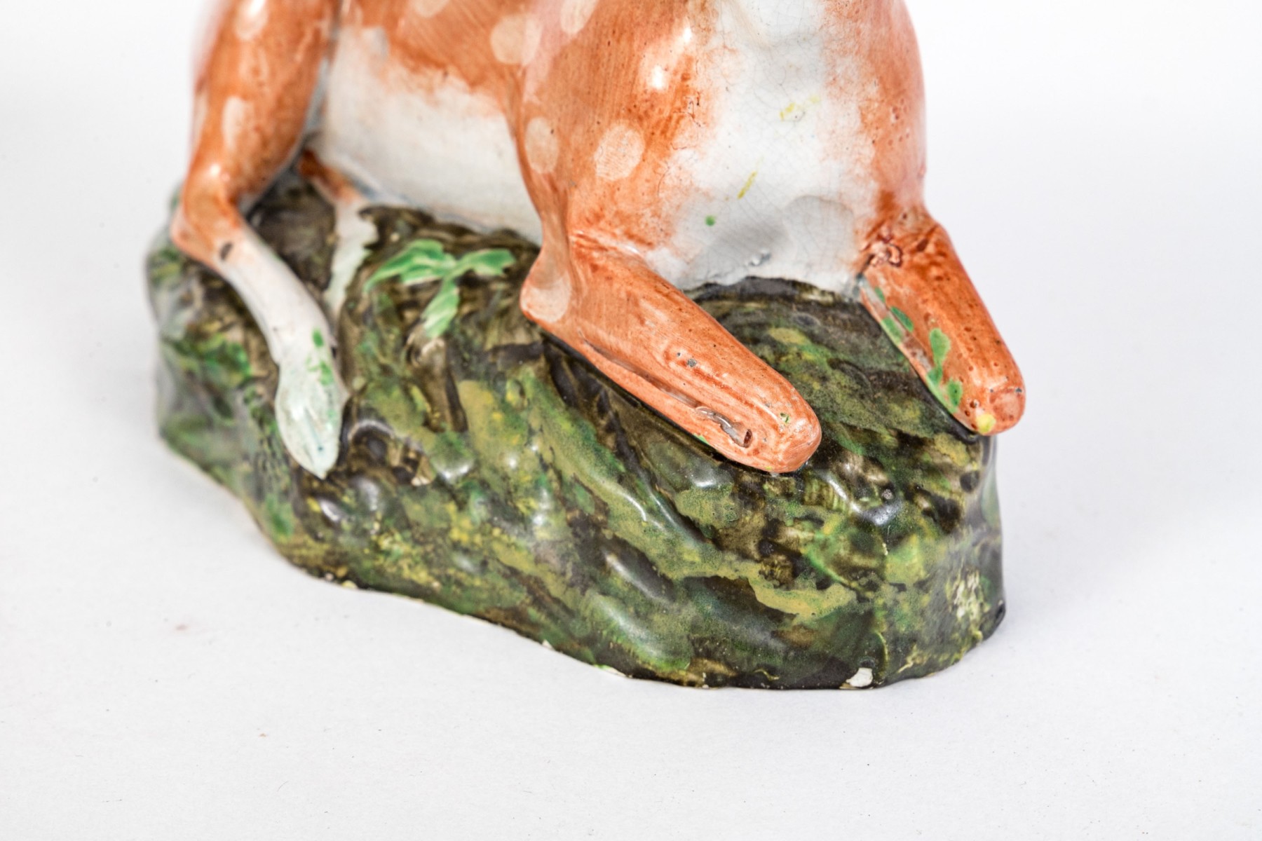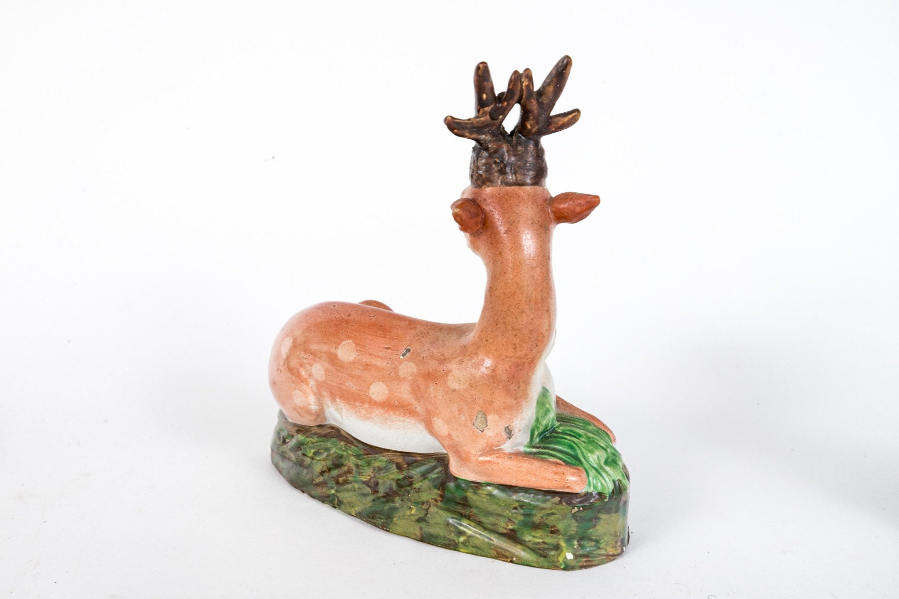 An antique pair of English, Staffordshire hand painted ceramic recumbent deer, depicted reclining on bases decorated with naturalistic grass and earth.