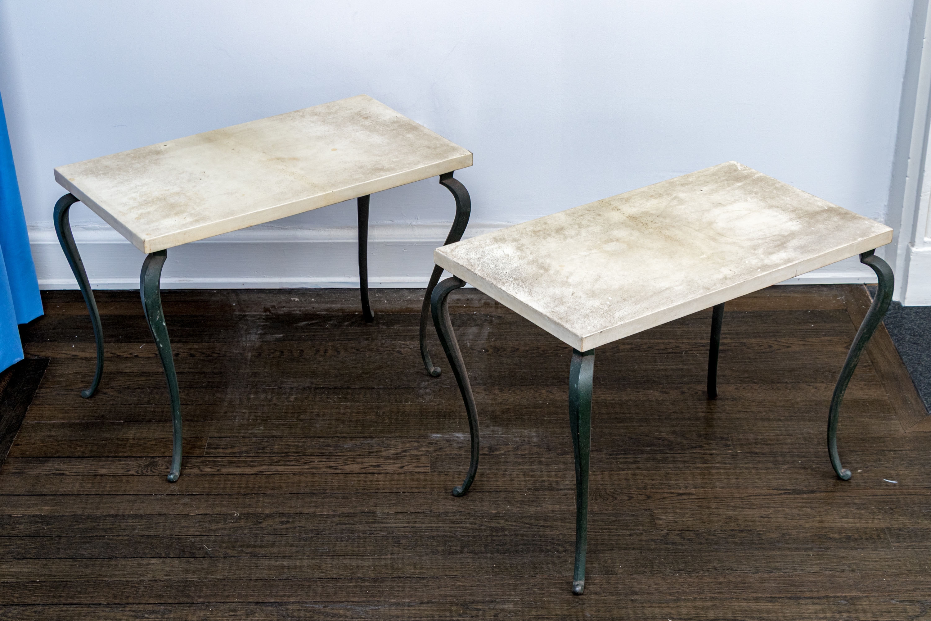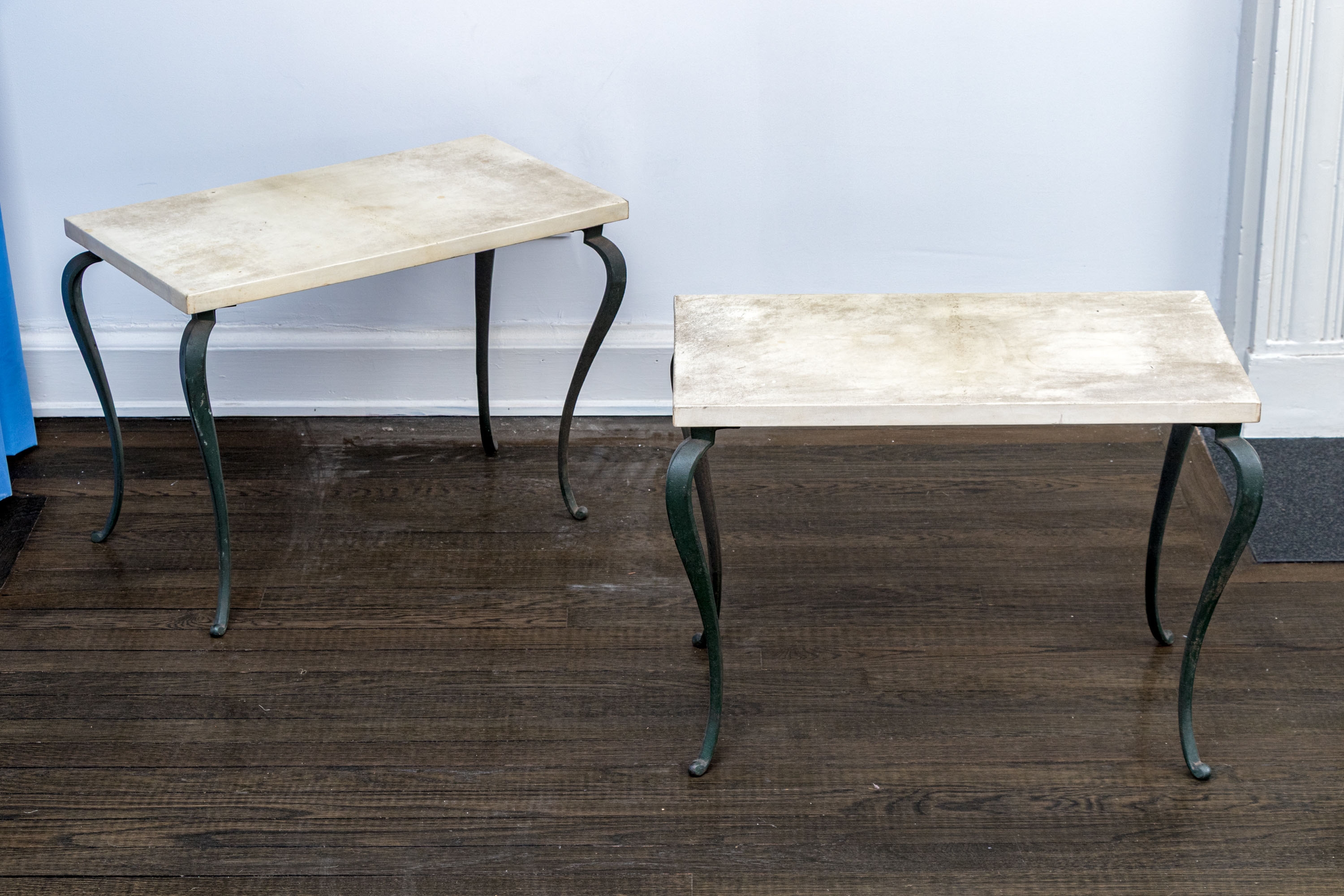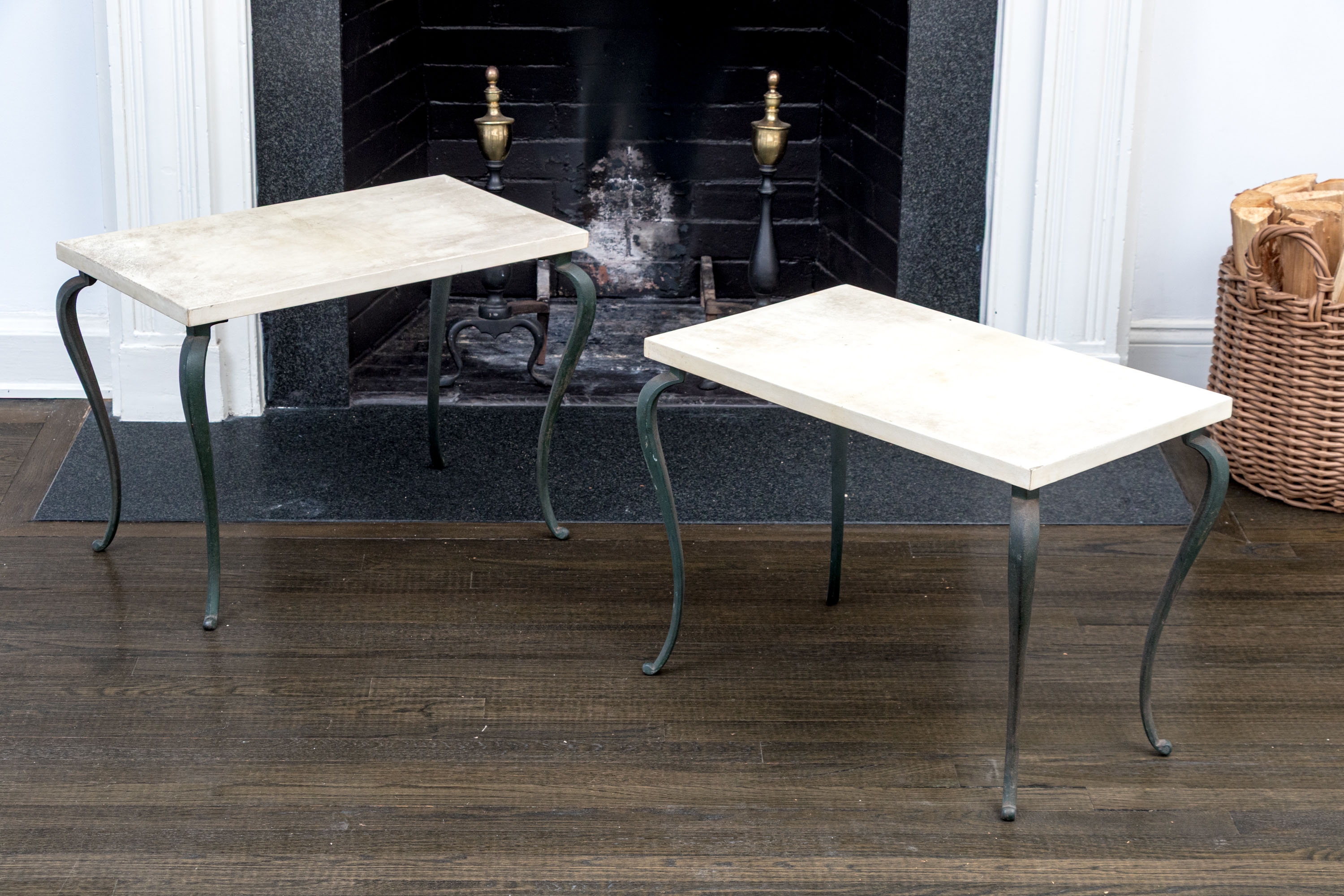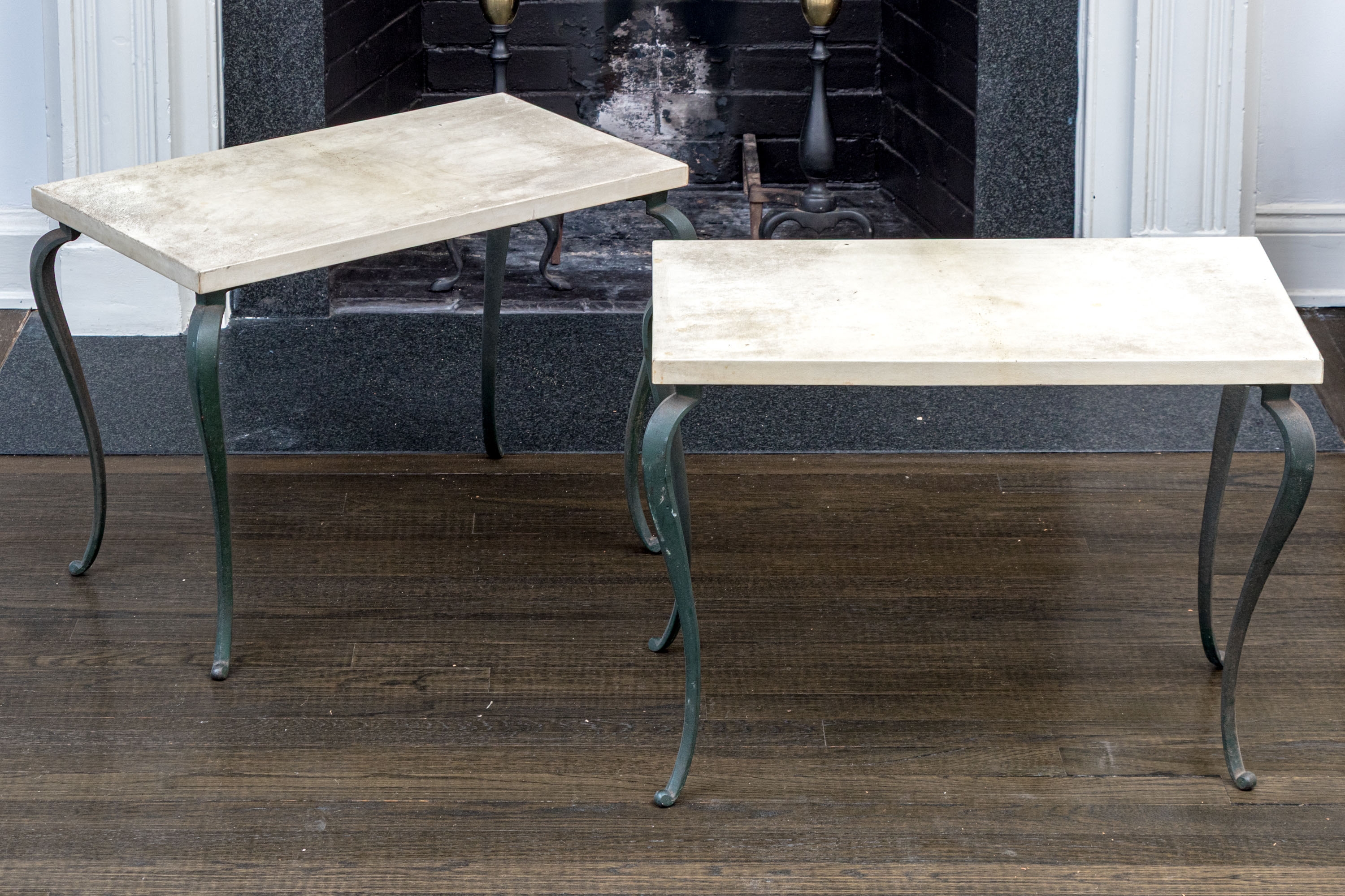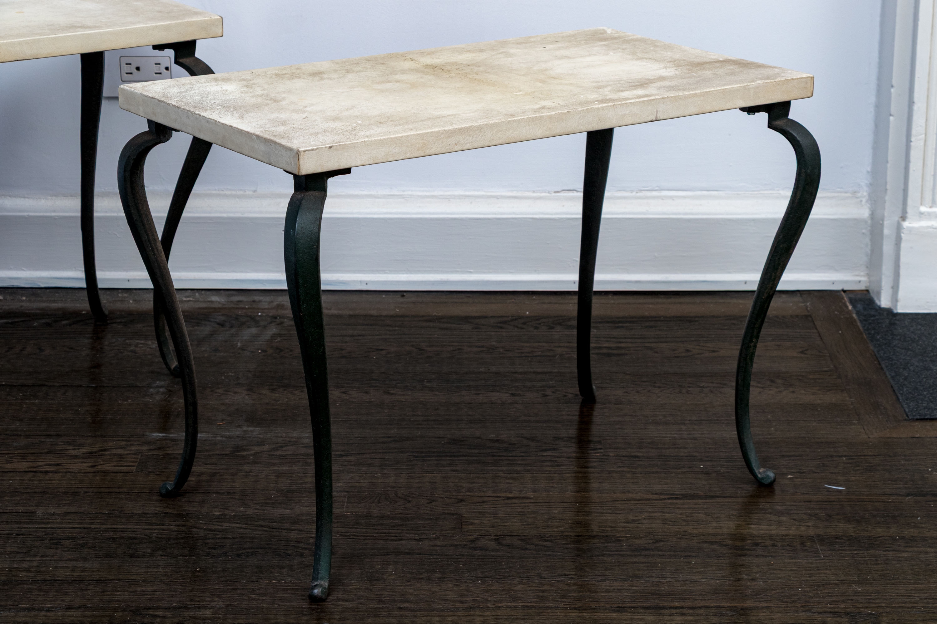 A fabulous pair of first quarter 20th century side tables with light weight forms beautifully balancing tradition with timeless elegance. The tables sport goatskin wrapped rectangular table tops supported by cabriole legs in a subtle verdigris finish with faceted curves that dramatically taper to dainty scrolled feet.