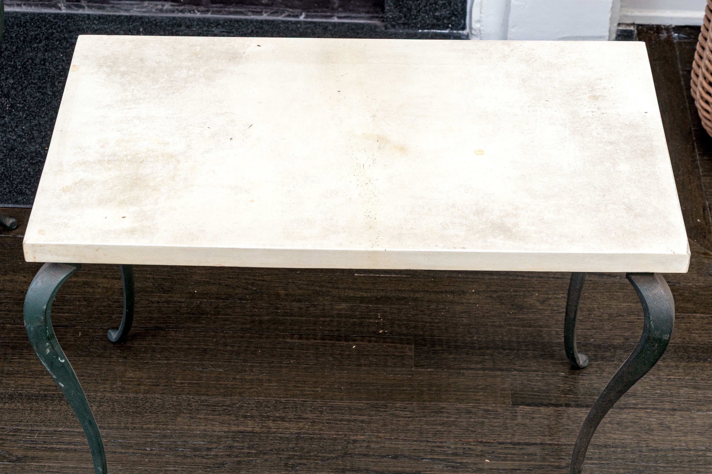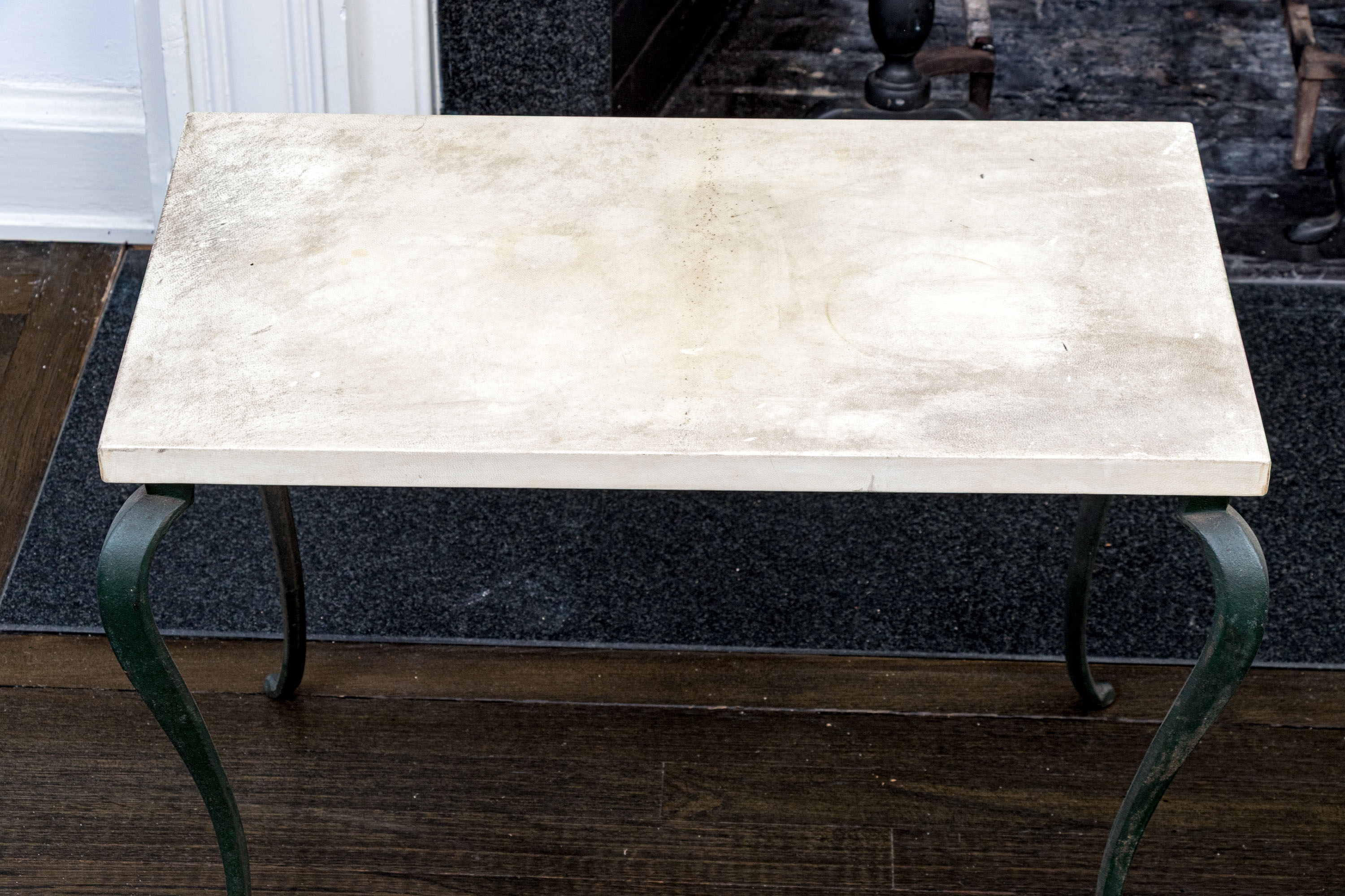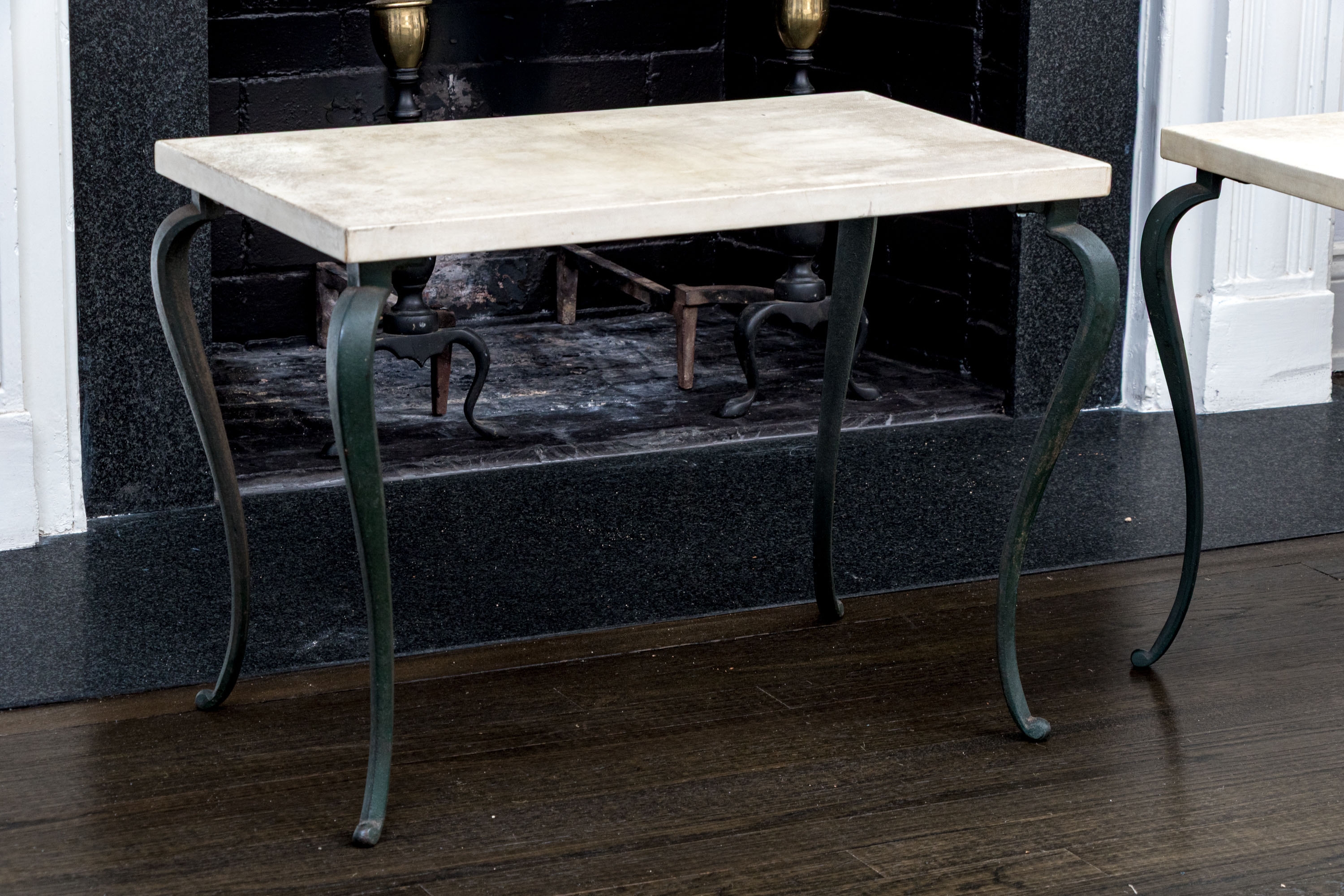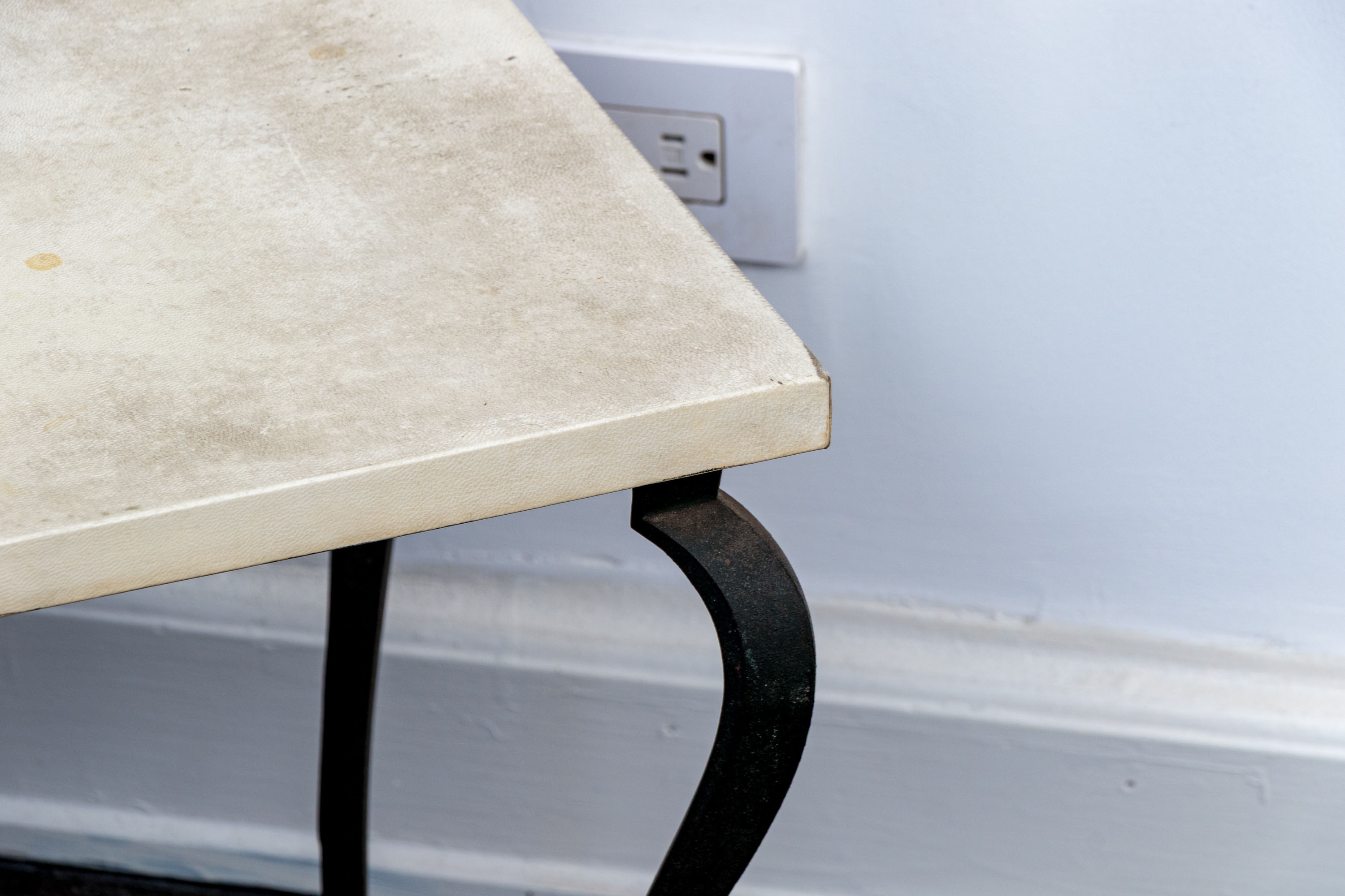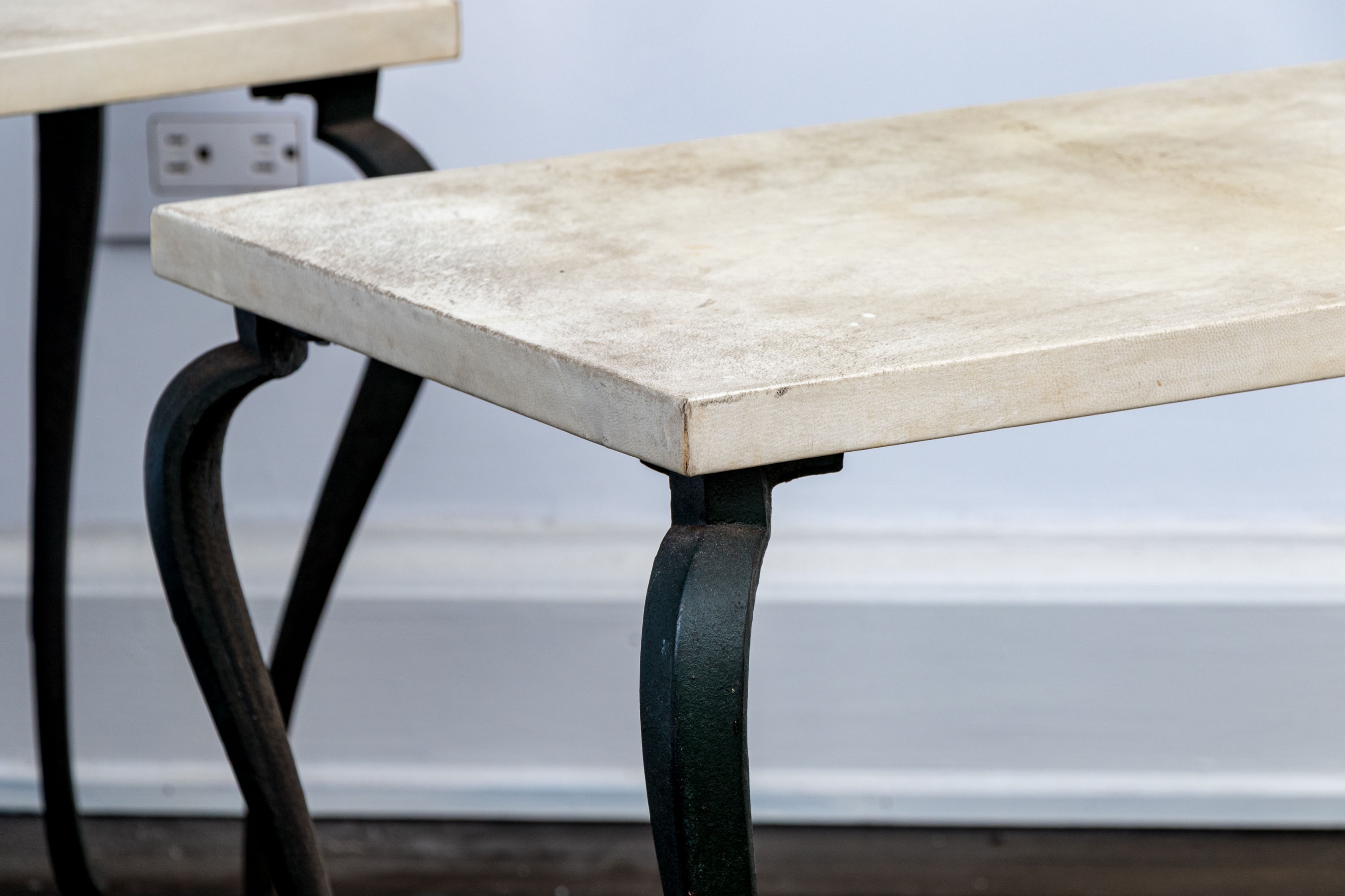 A fabulous pair of first quarter 20th century side tables with light weight forms beautifully balancing tradition with timeless elegance. The tables sport goatskin wrapped rectangular table tops supported by cabriole legs in a subtle verdigris finish with faceted curves that dramatically taper to dainty scrolled feet.