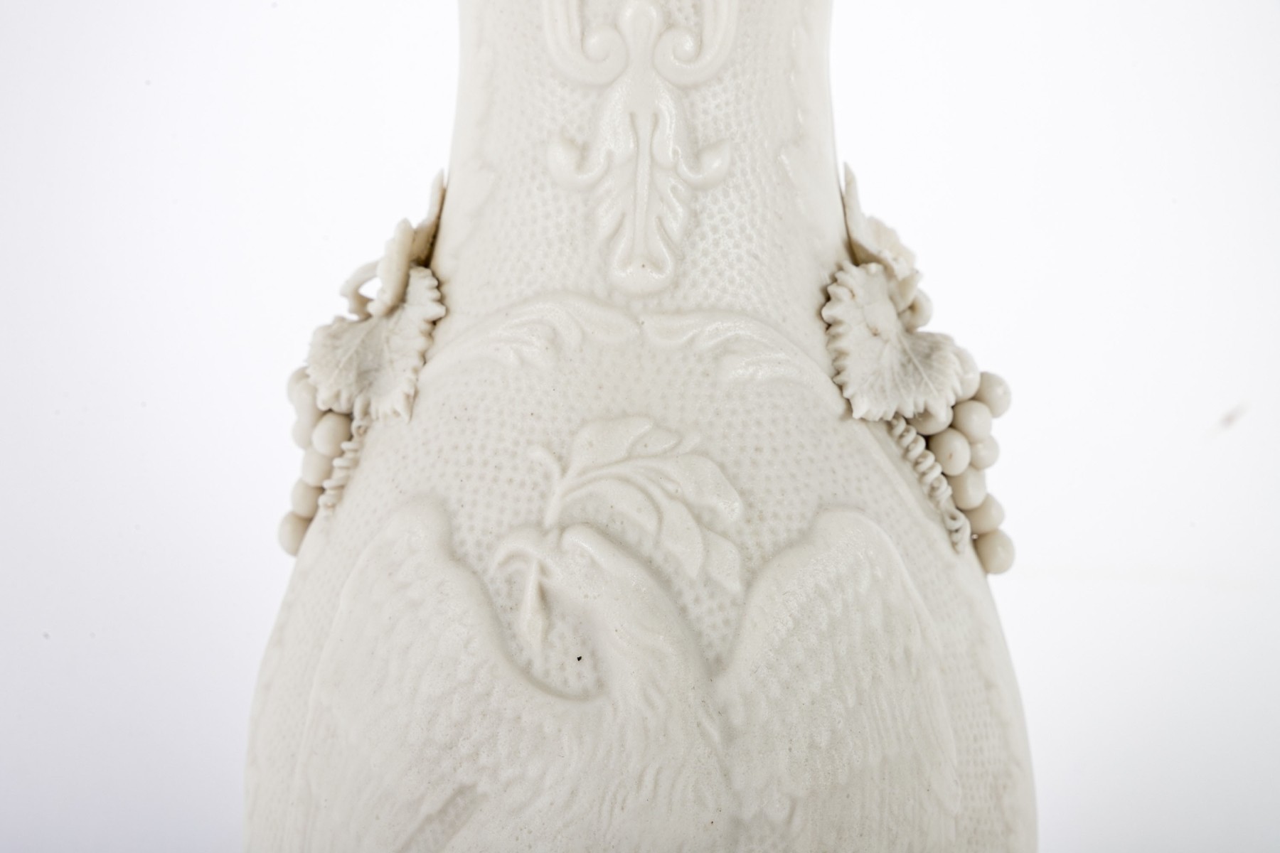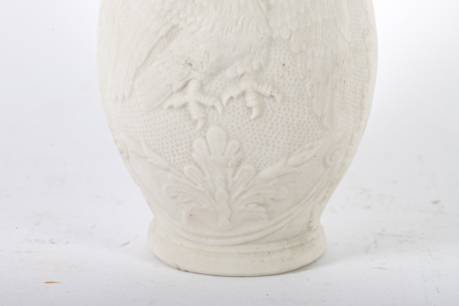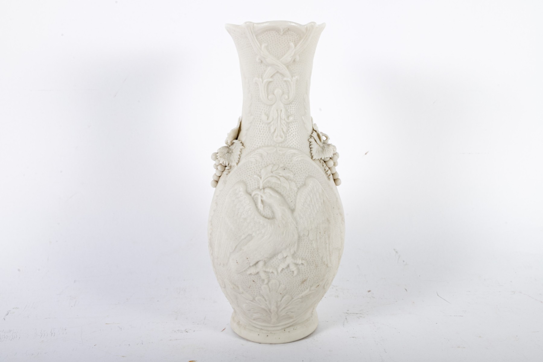 A fabulous antique Parian porcelain vase, likely Bennington, displaying a scalloped rim and a tall, tapered neck over an egg-shaped body finely detailed with relief eagles, scrolls, and leafy flourishes complimenting sculptural grape, leaf, and vine handles.
