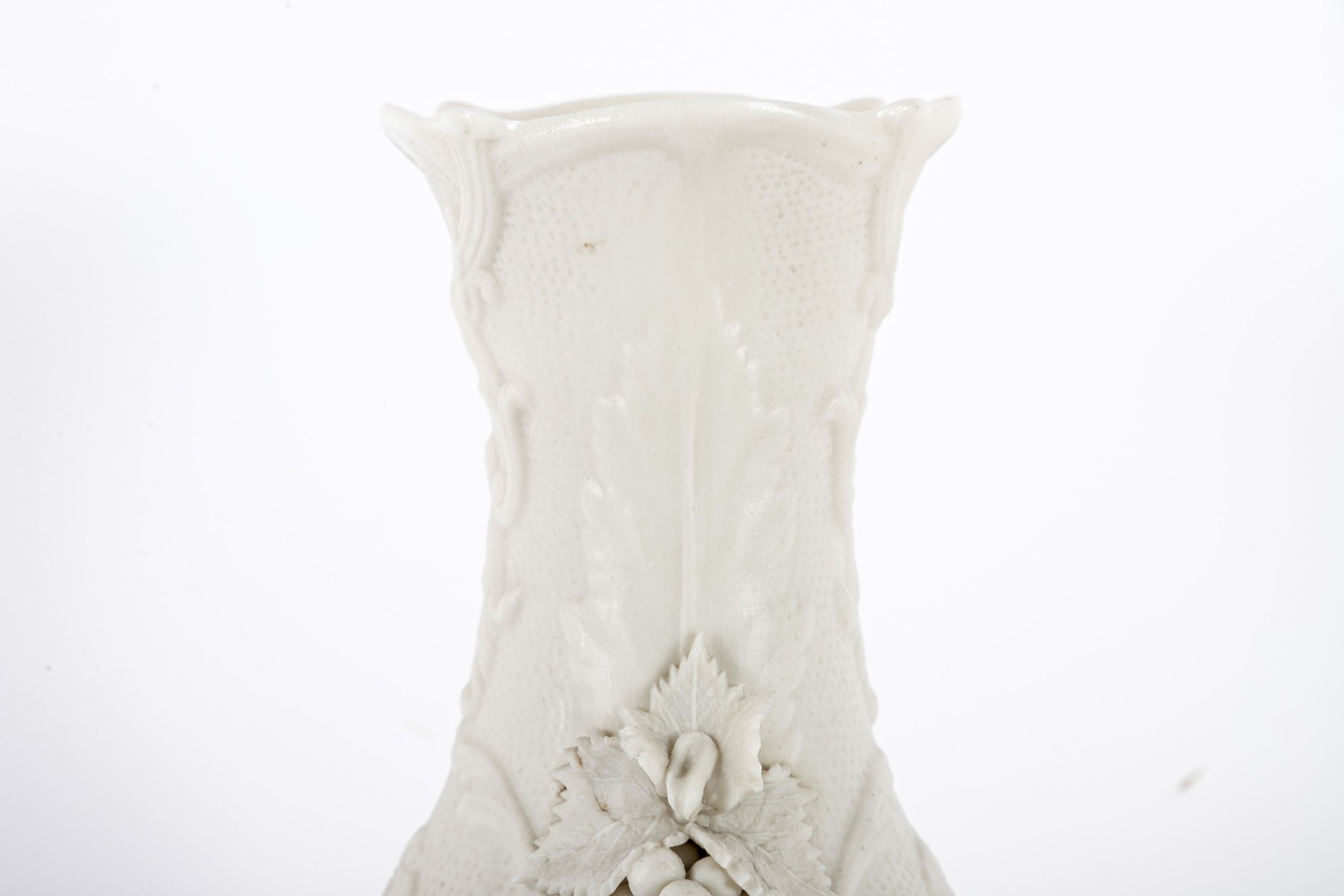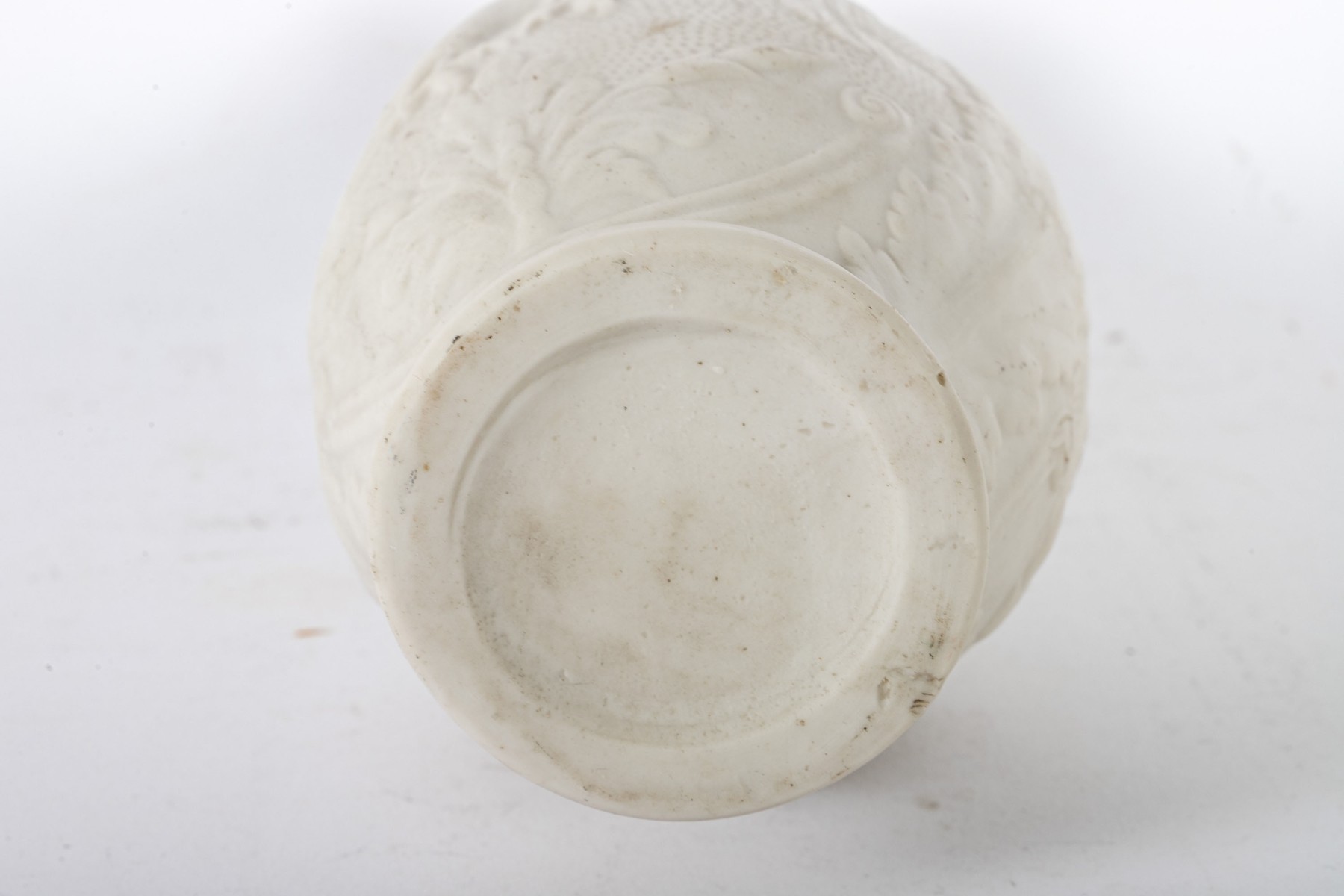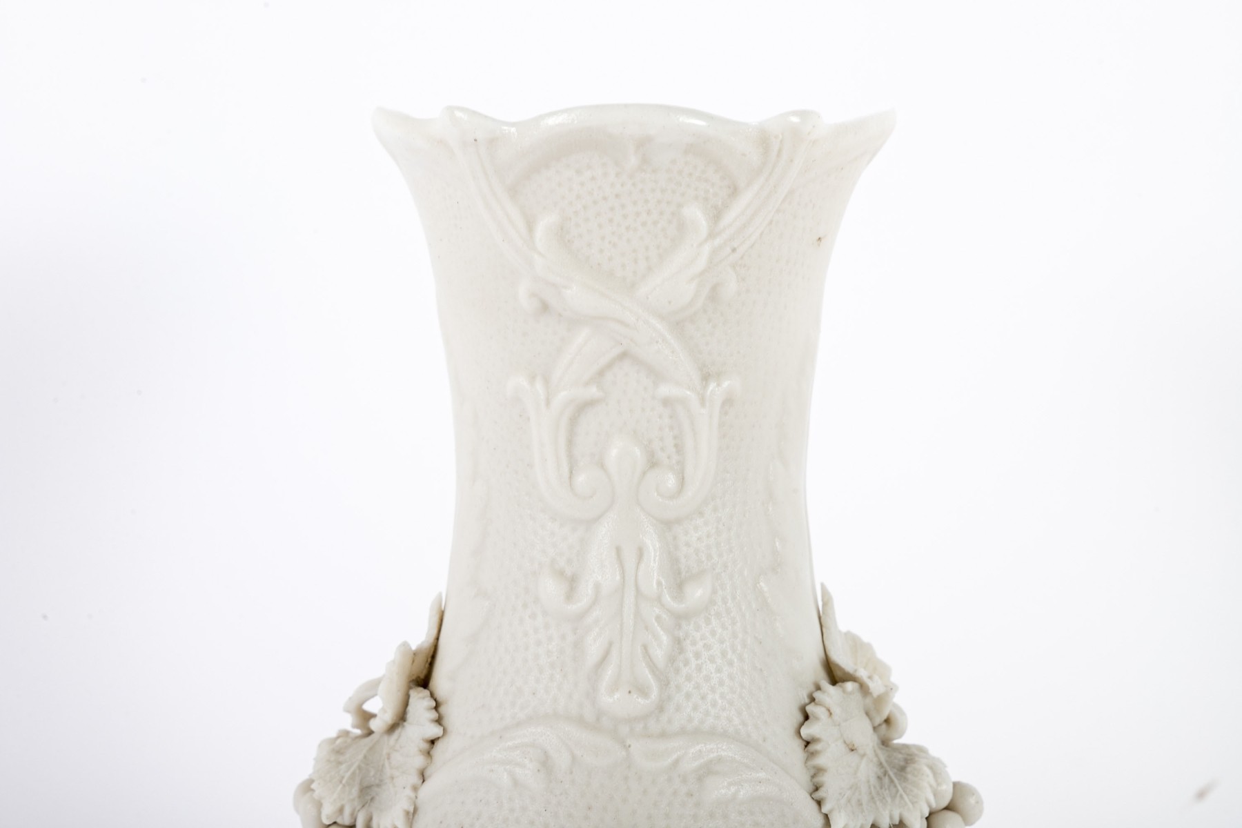 A fabulous antique Parian porcelain vase, likely Bennington, displaying a scalloped rim and a tall, tapered neck over an egg-shaped body finely detailed with relief eagles, scrolls, and leafy flourishes complimenting sculptural grape, leaf, and vine handles.