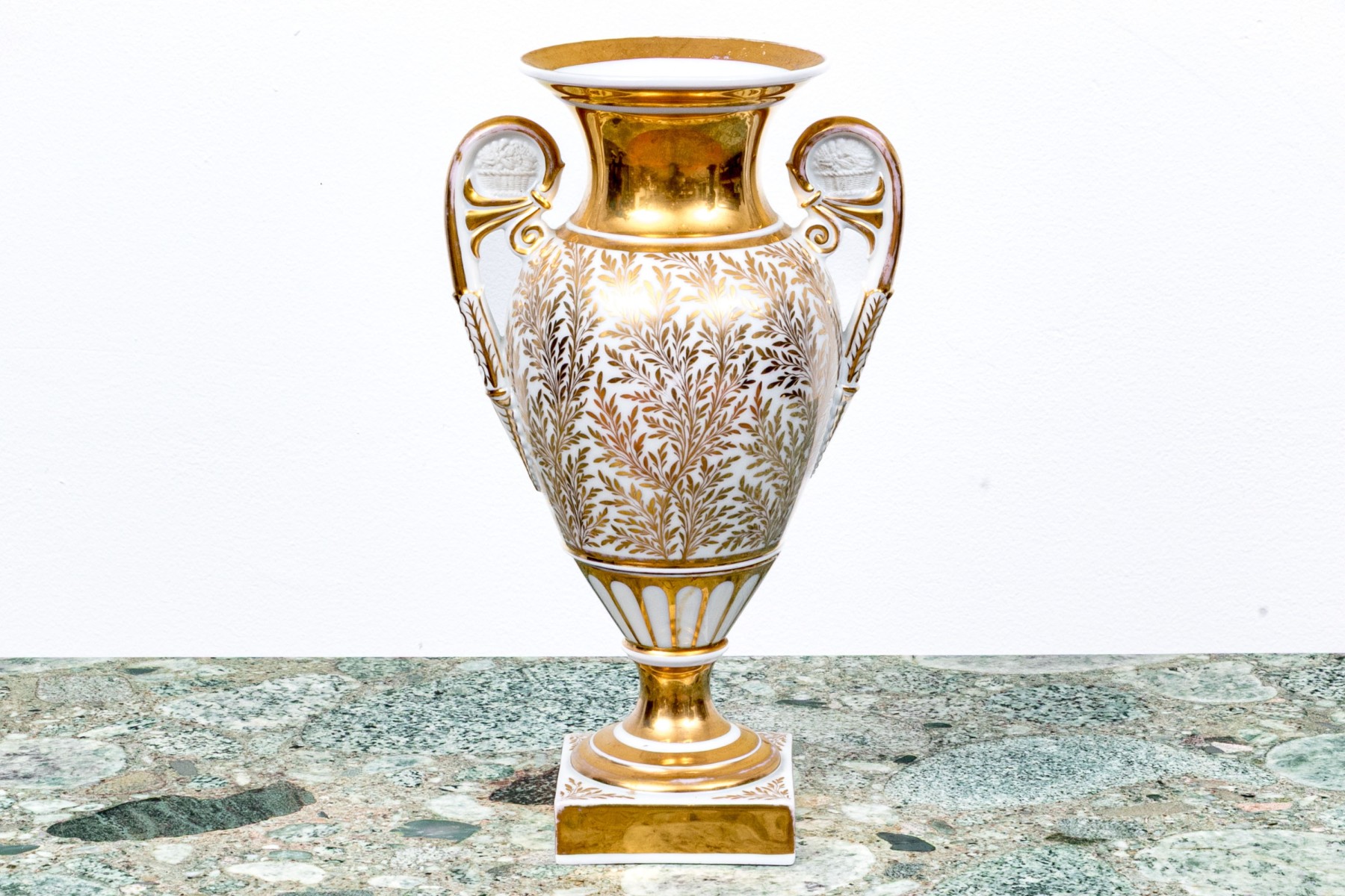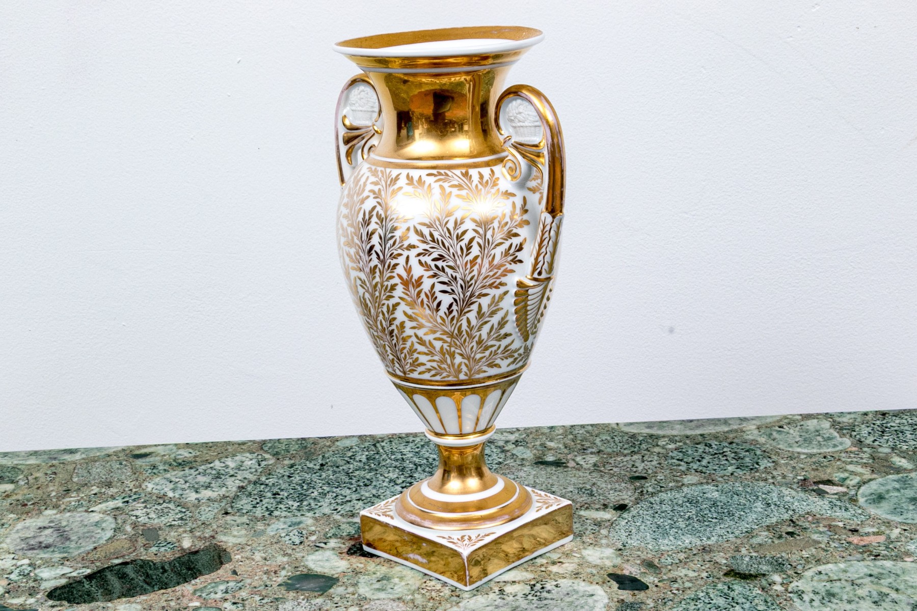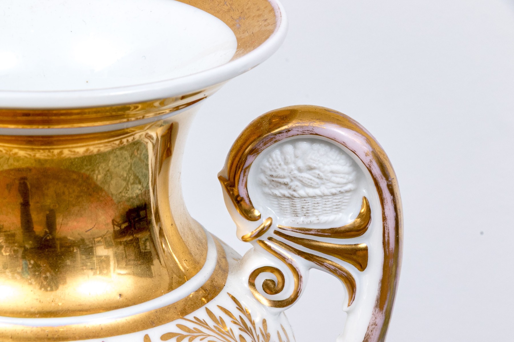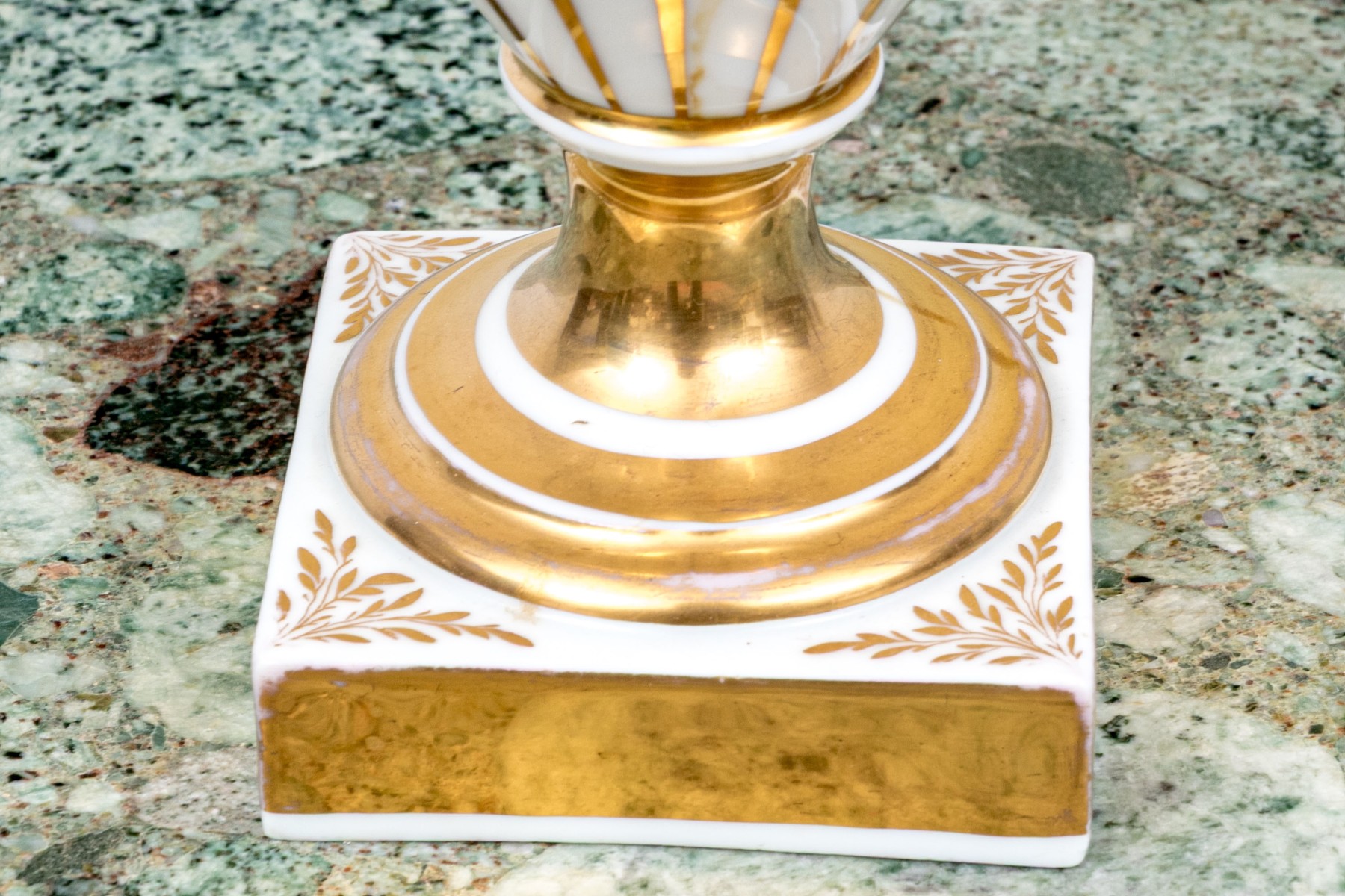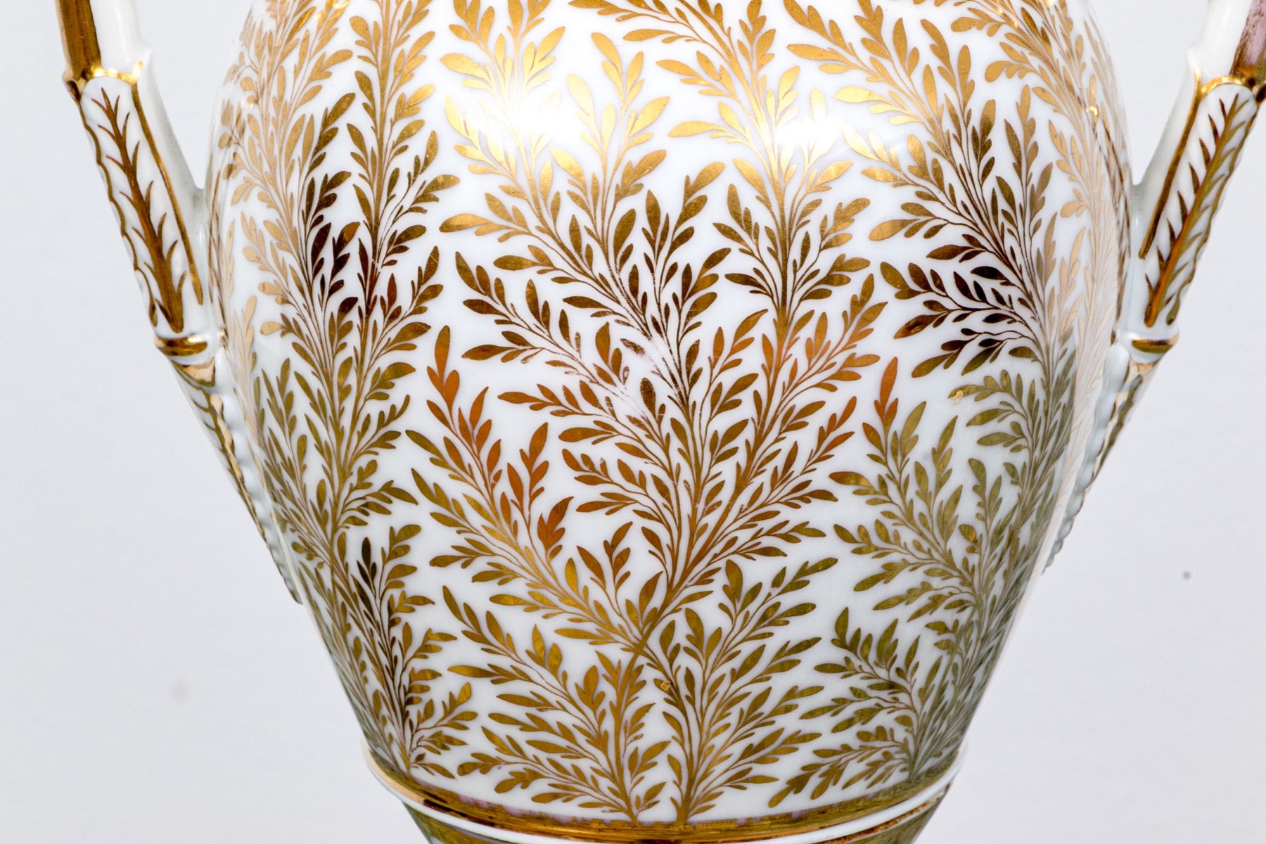 An elegant antique Paris porcelain urn circa 1840-1860 showcasing a stately neoclassical form with a wide flared mouth, tall neck, and elongated ovoid body flanked by twin handles leading down to an affixed pedestal foot with a square base. The vase is lavishly decorated with gilt rims, neck, banded borders and a center field of ornate branching foliage throughout the body. Handles feature striking flourished ends circling around relief scenes of bountiful harvest baskets within.