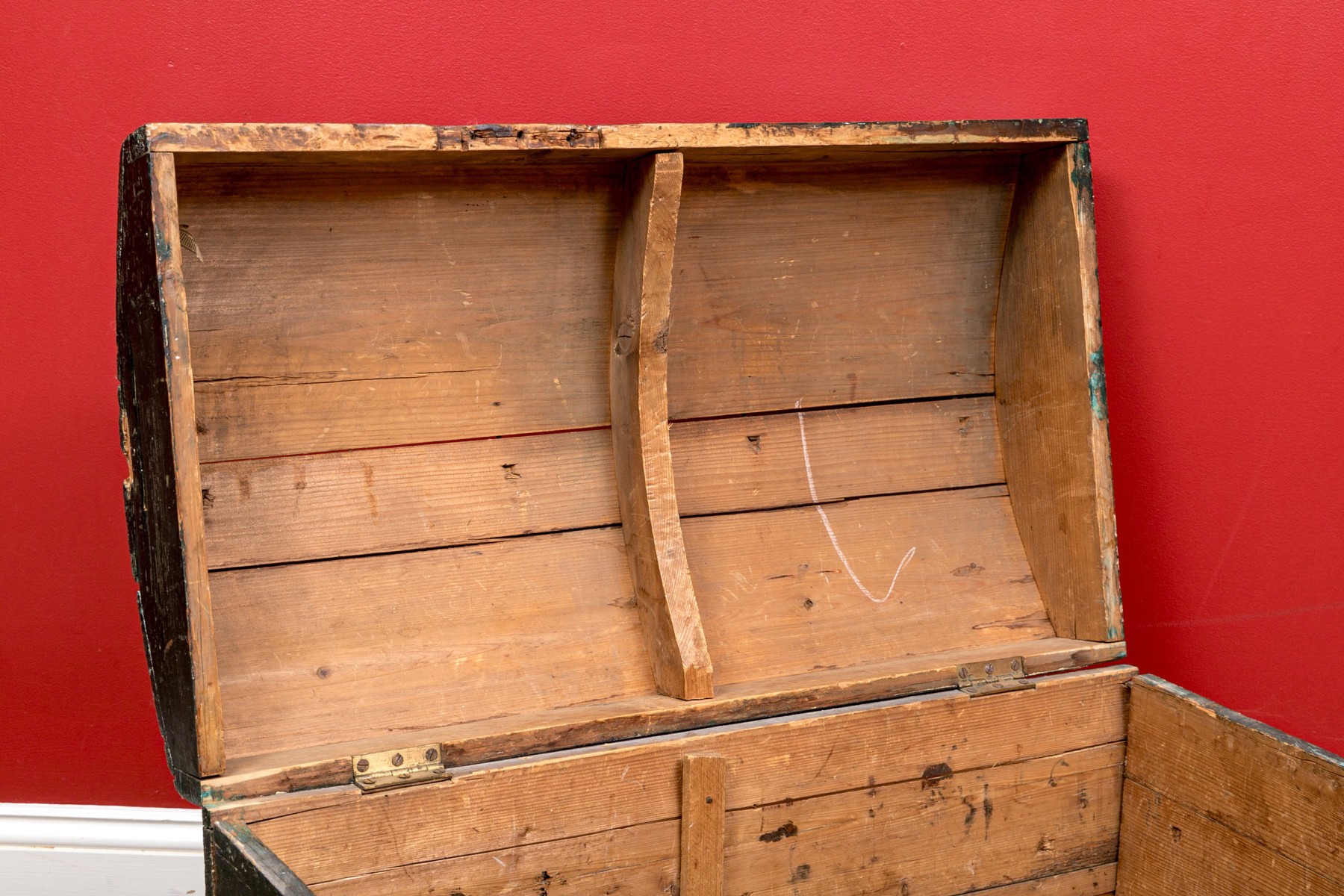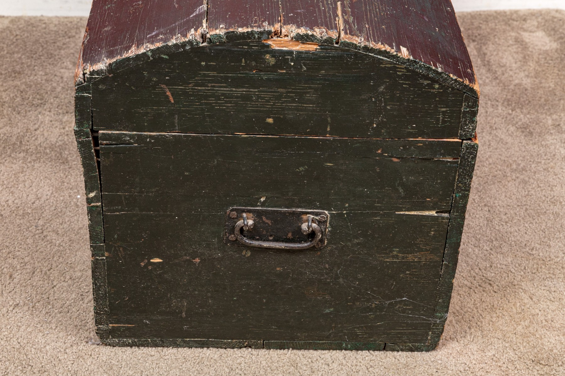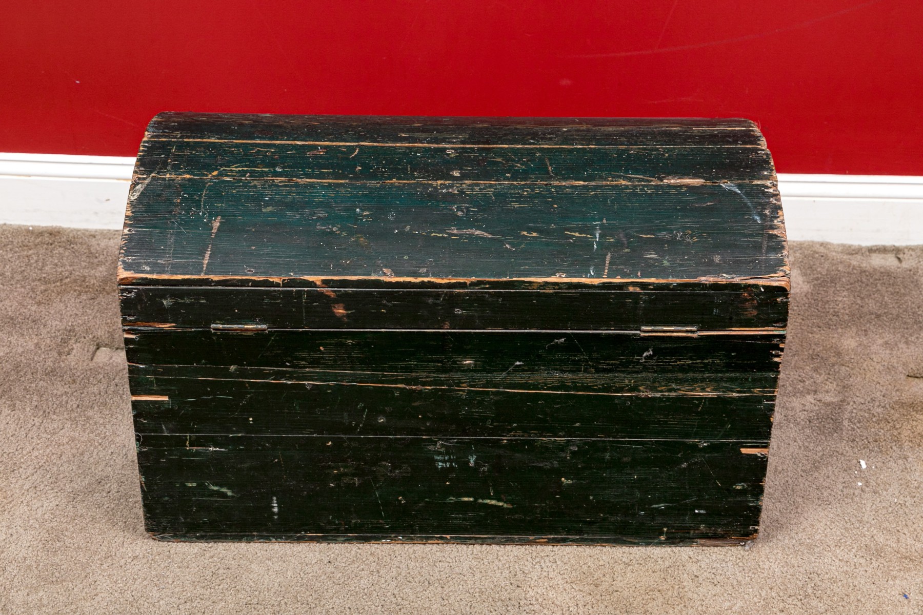 An antique paint finished wooden steamer trunk with rectangular body, hinged and domed top with brass mounts and hardware.