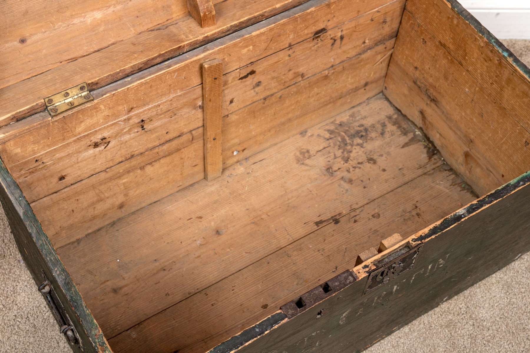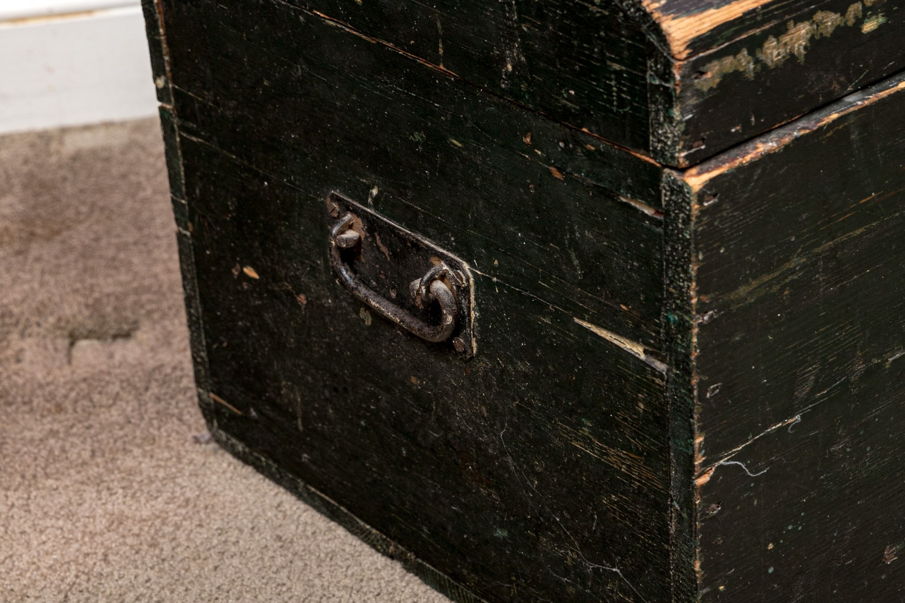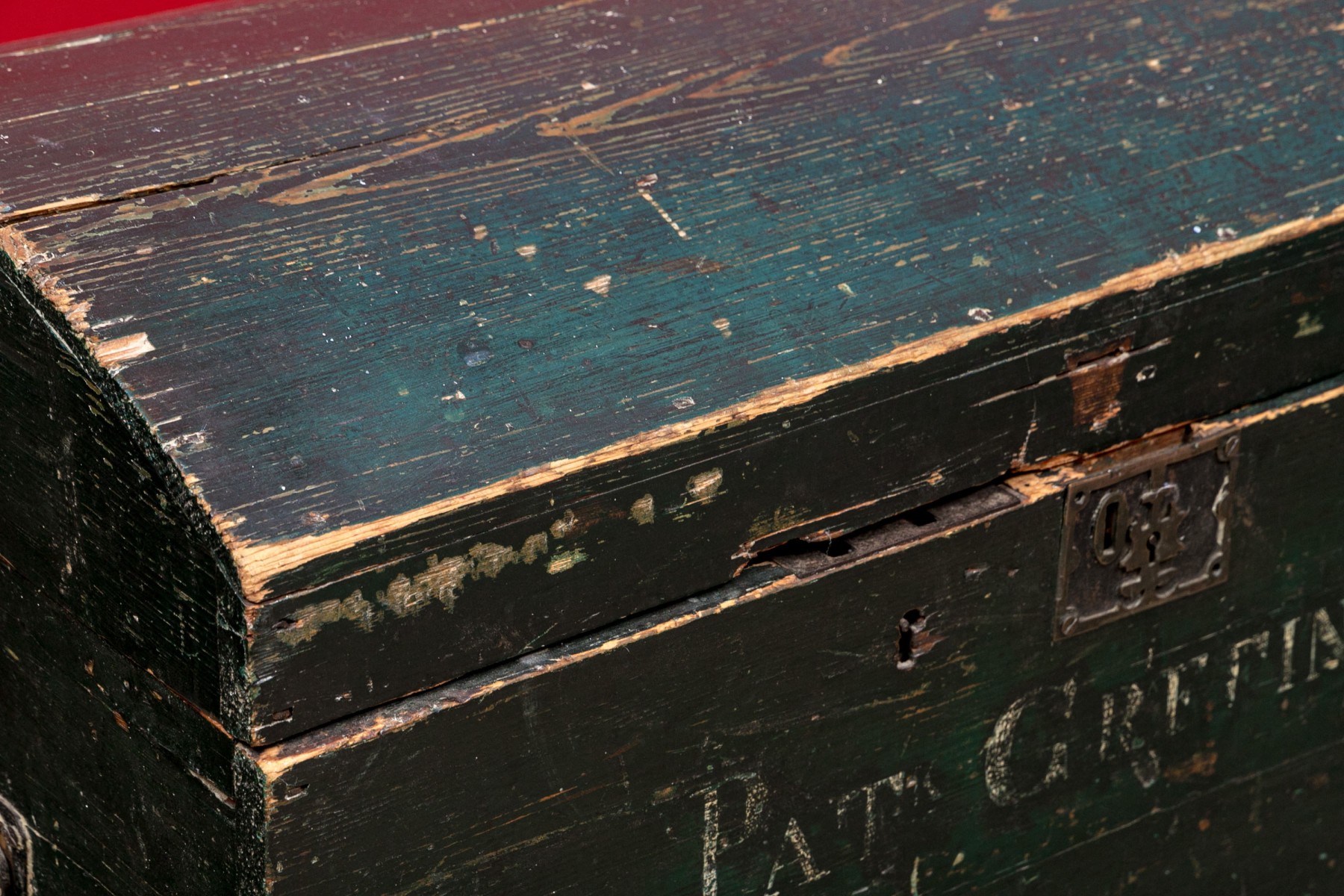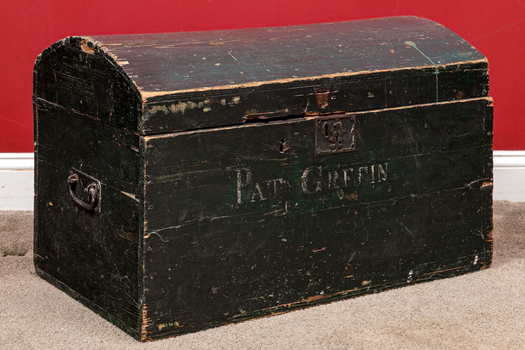 An antique paint finished wooden steamer trunk with rectangular body, hinged and domed top with brass mounts and hardware.