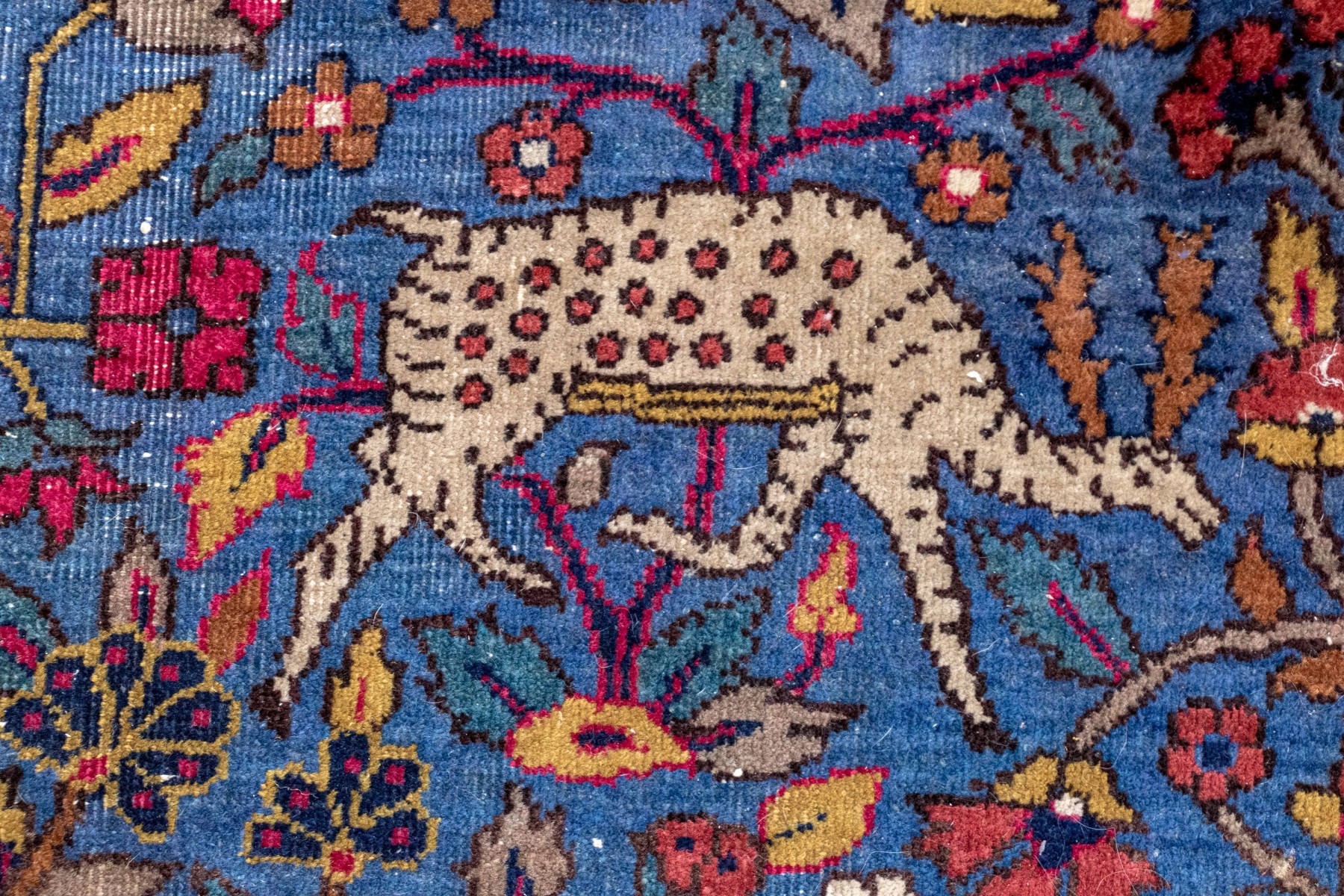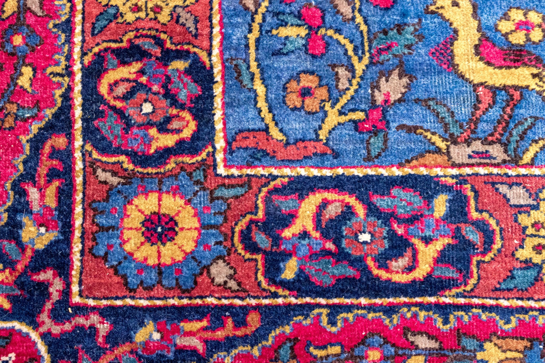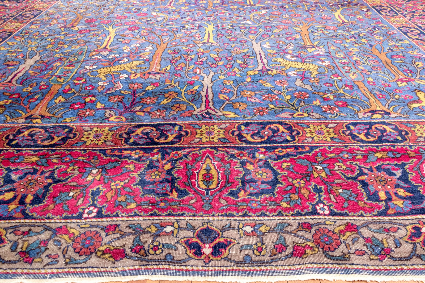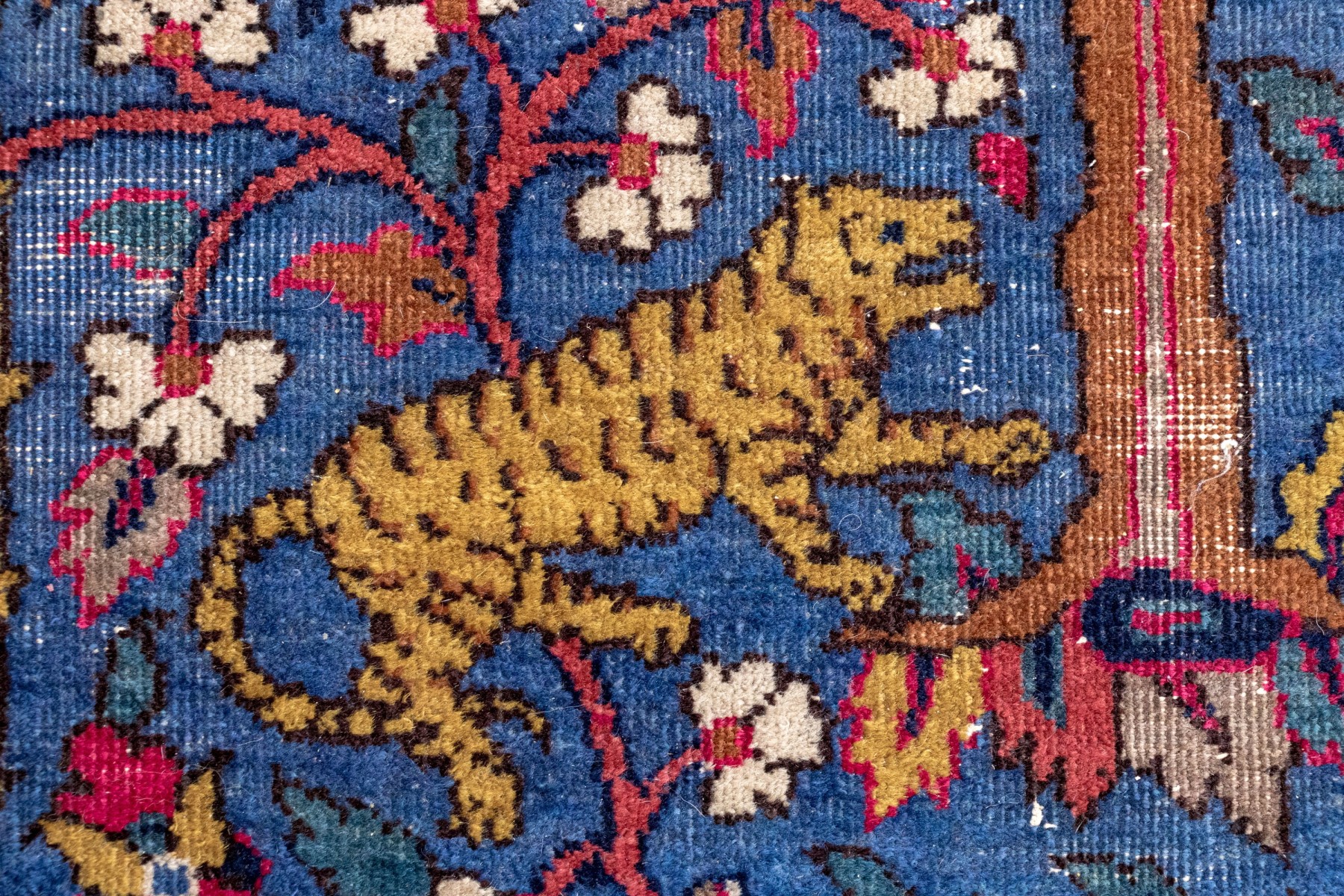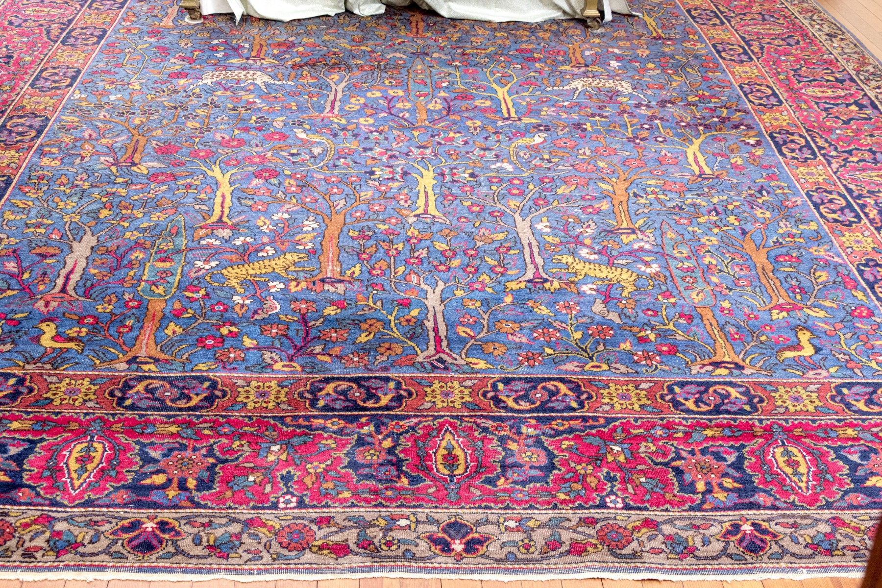 A stunning antique hand-knotted Persian wool area carpet showcasing a fuchsia-pink main border flanked by wide beige and orange guard borders around a blue field. The field is detailed with beautiful pictorial flowering trees, horned deer, tigers, and birds in vibrant yellow, pink, blue, and white.