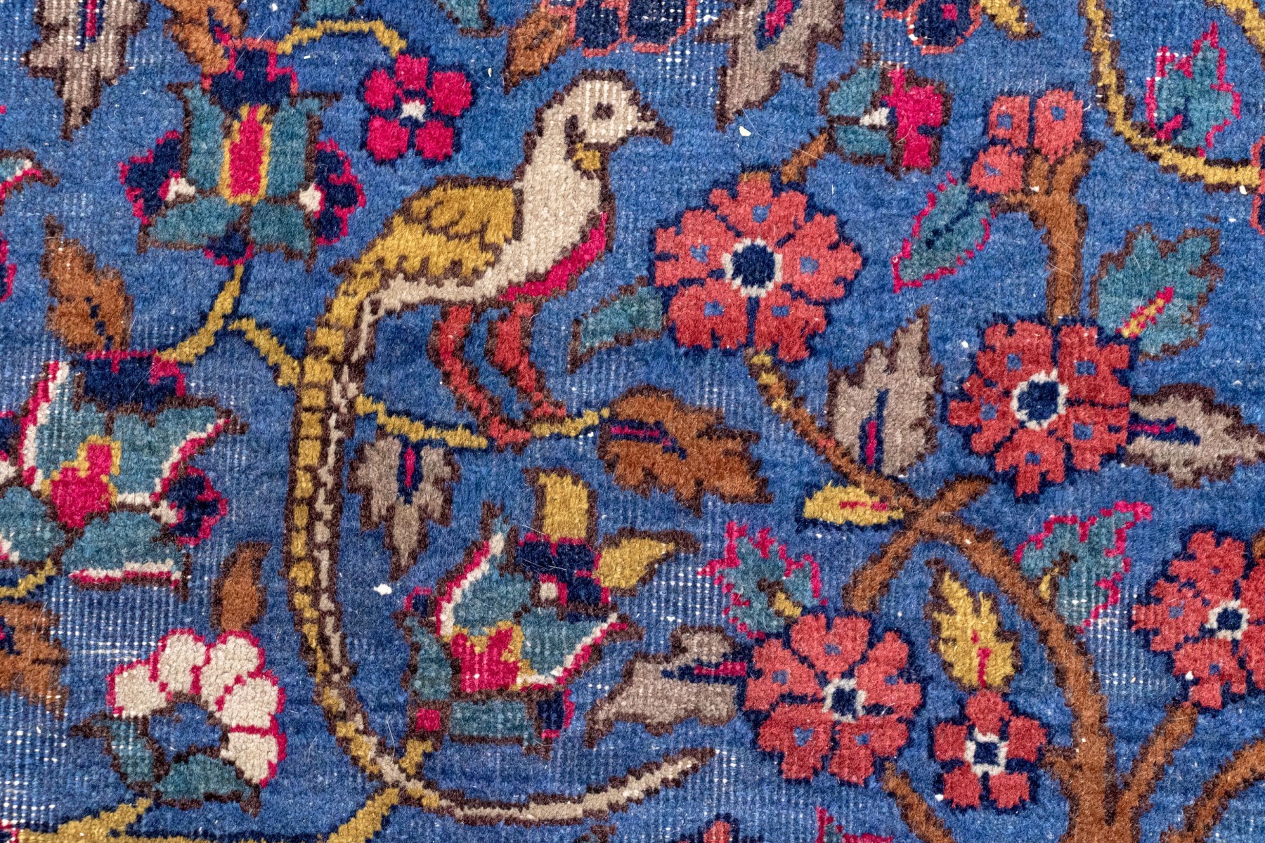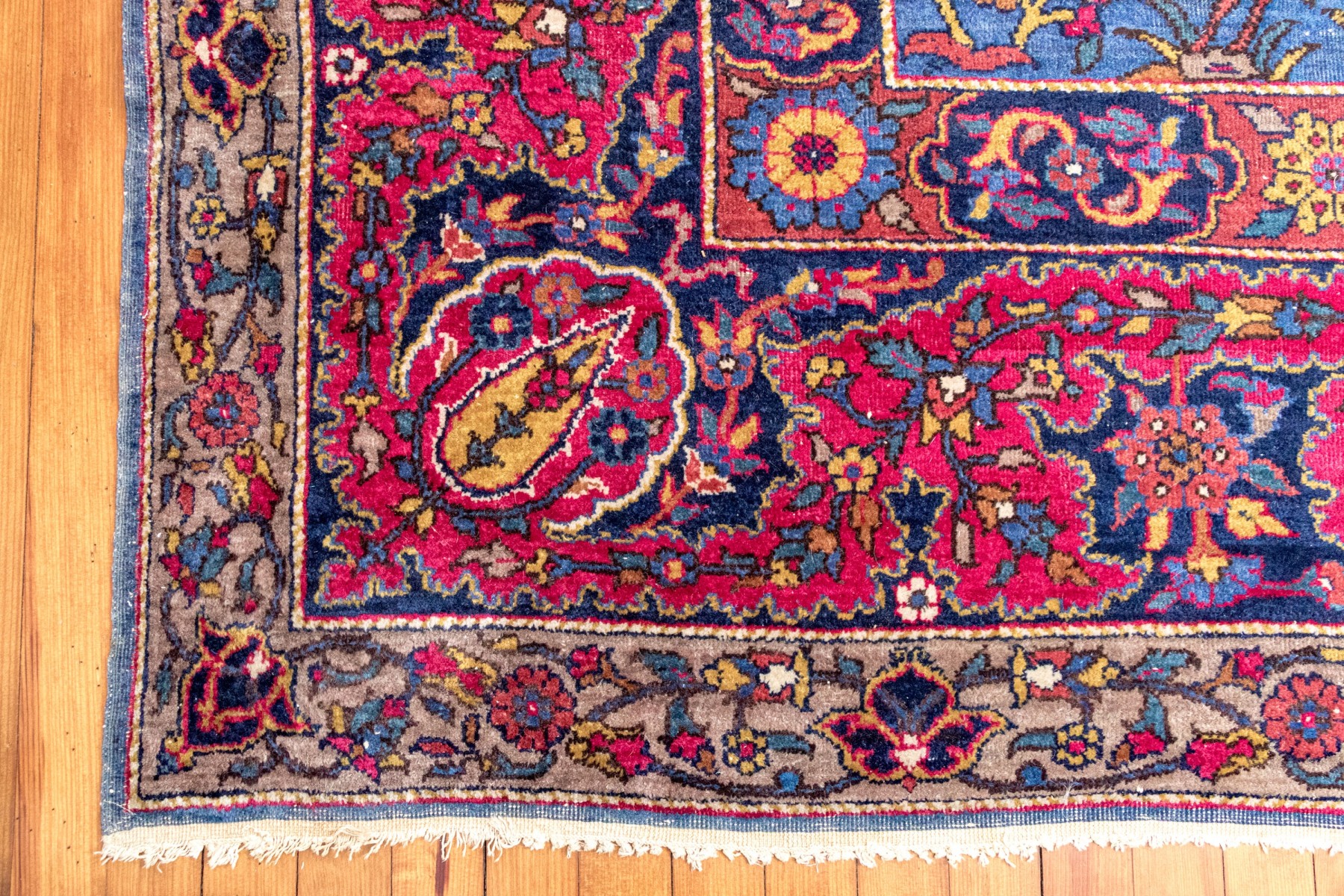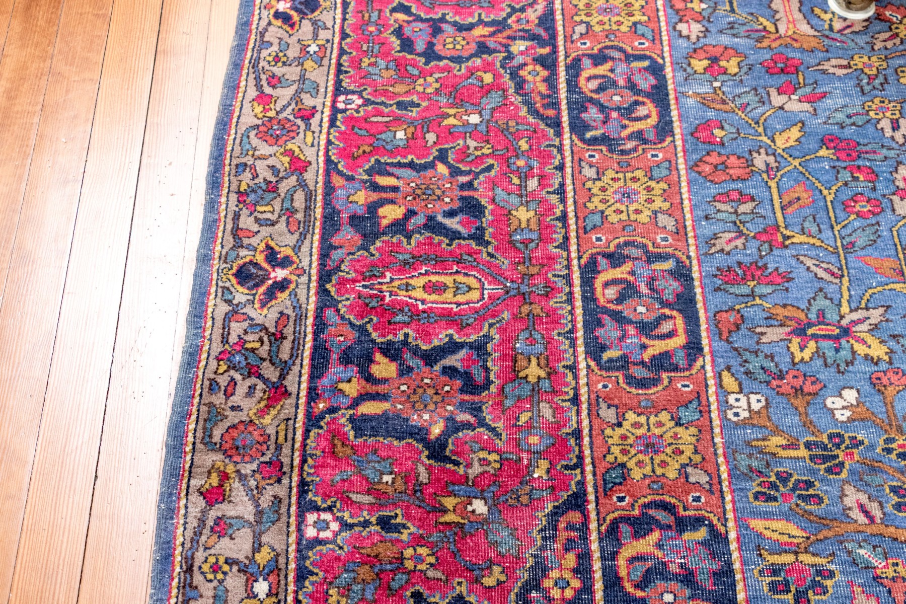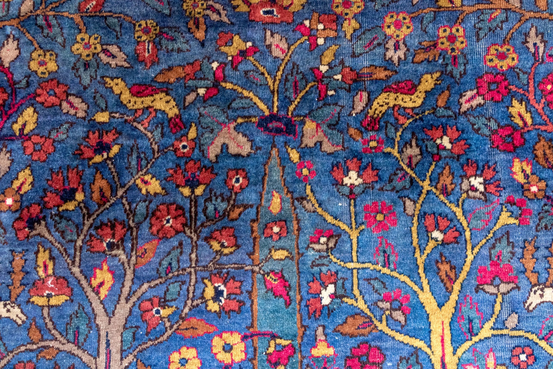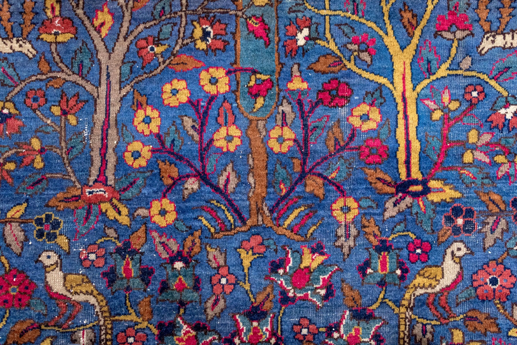 A stunning antique hand-knotted Persian wool area carpet showcasing a fuchsia-pink main border flanked by wide beige and orange guard borders around a blue field. The field is detailed with beautiful pictorial flowering trees, horned deer, tigers, and birds in vibrant yellow, pink, blue, and white.