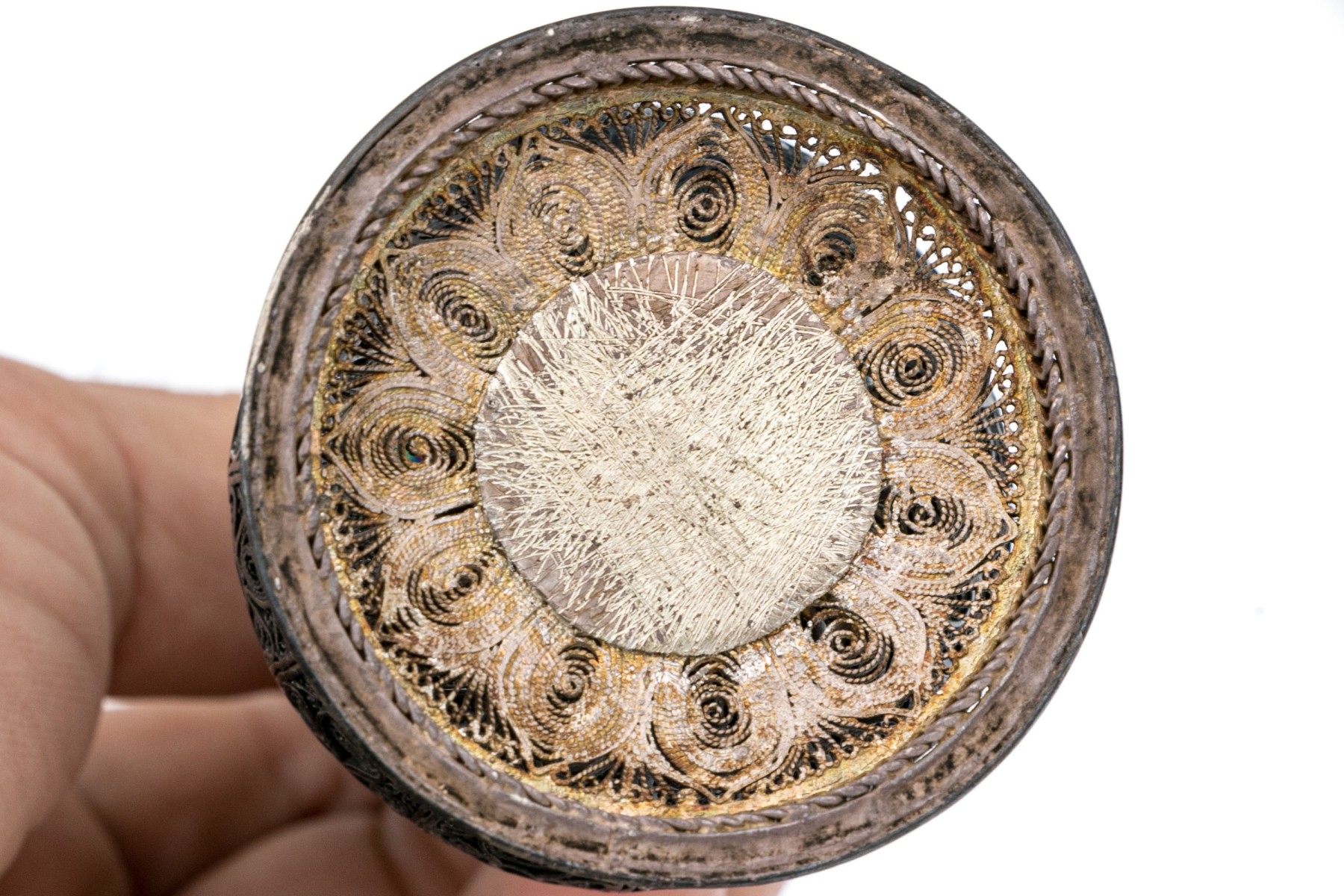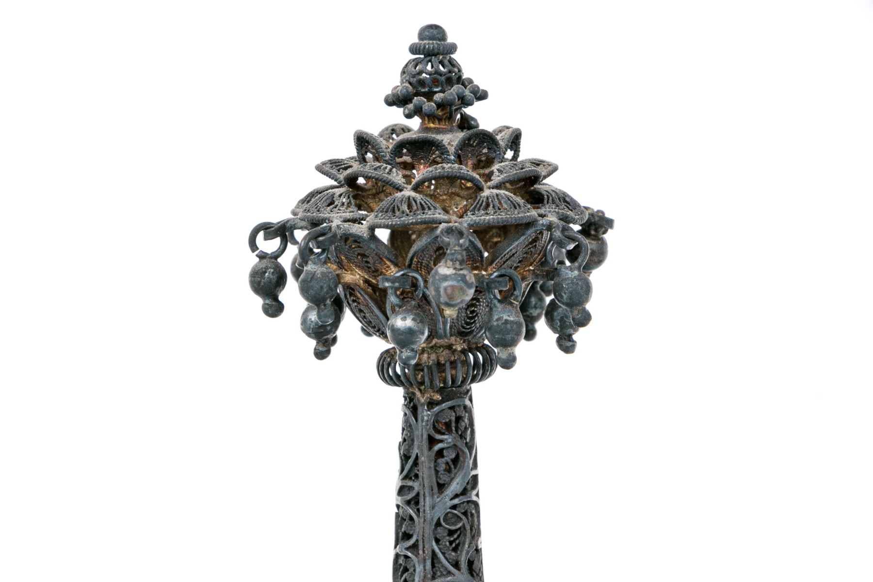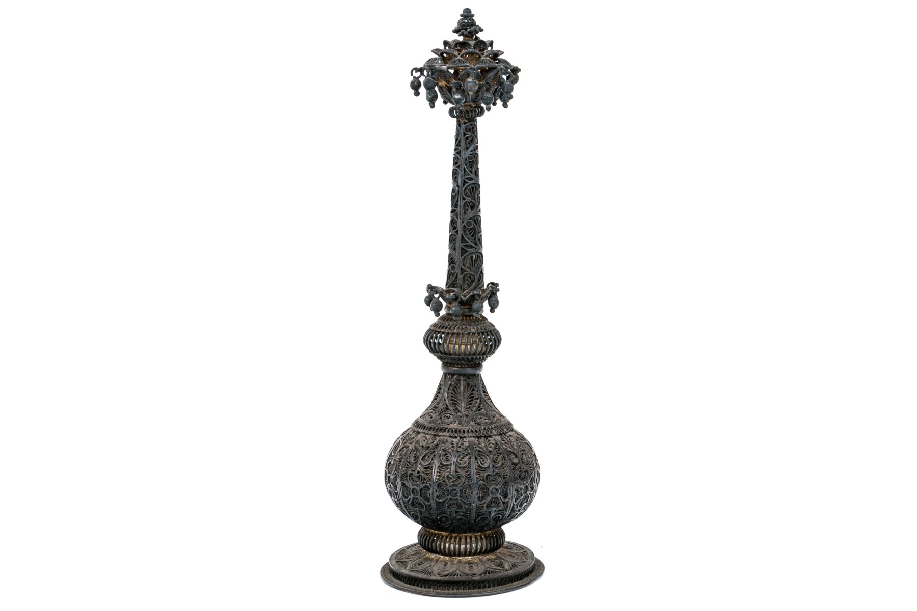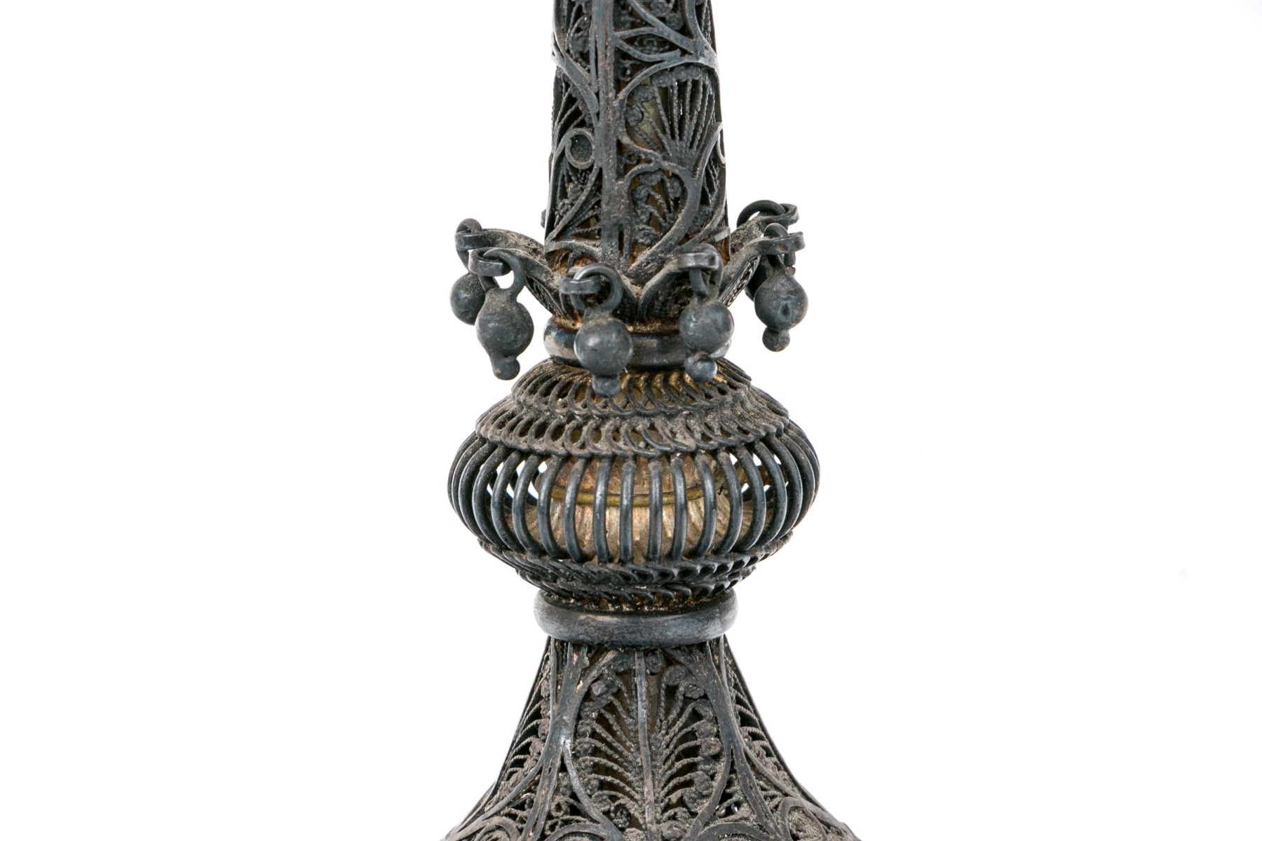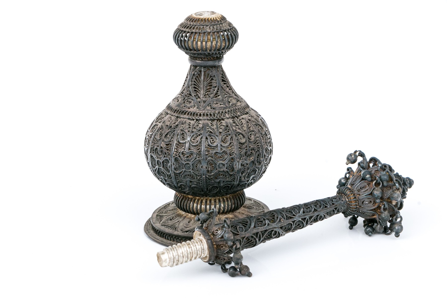 A bulbous container with a removable stem that screws into the base for filling. The finial and center with pendant balls.