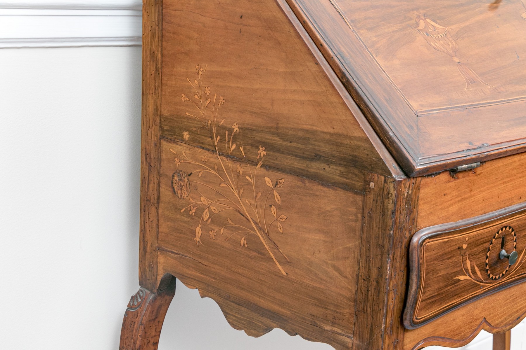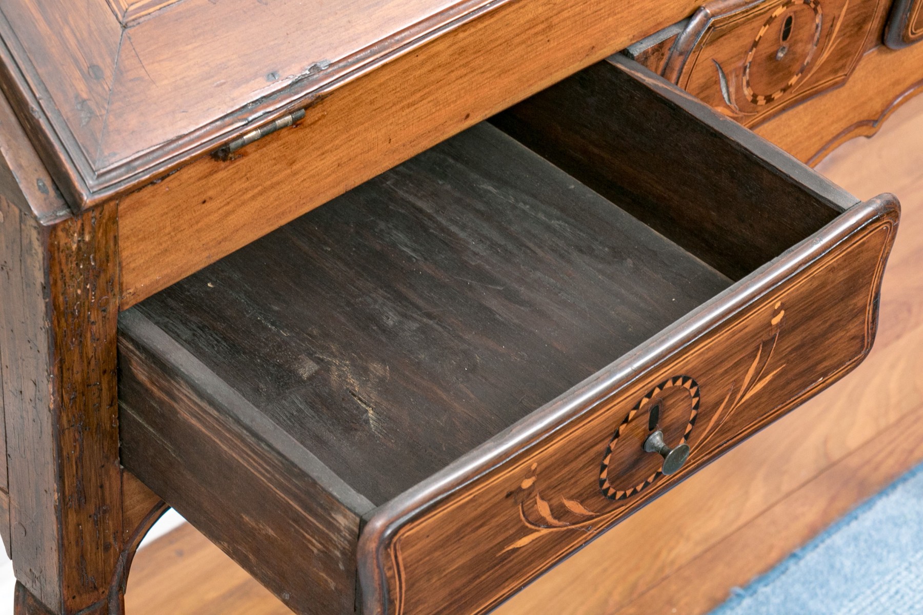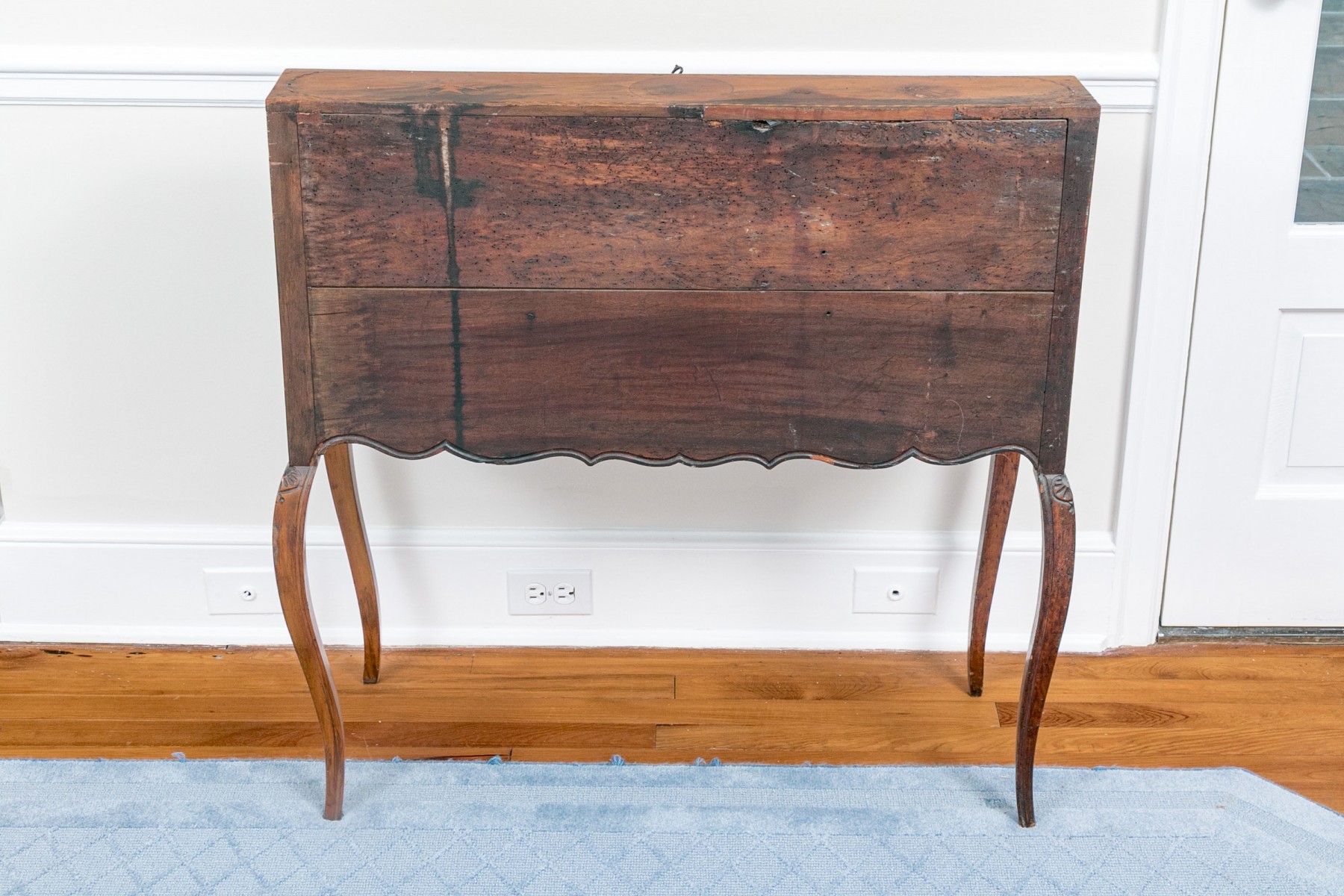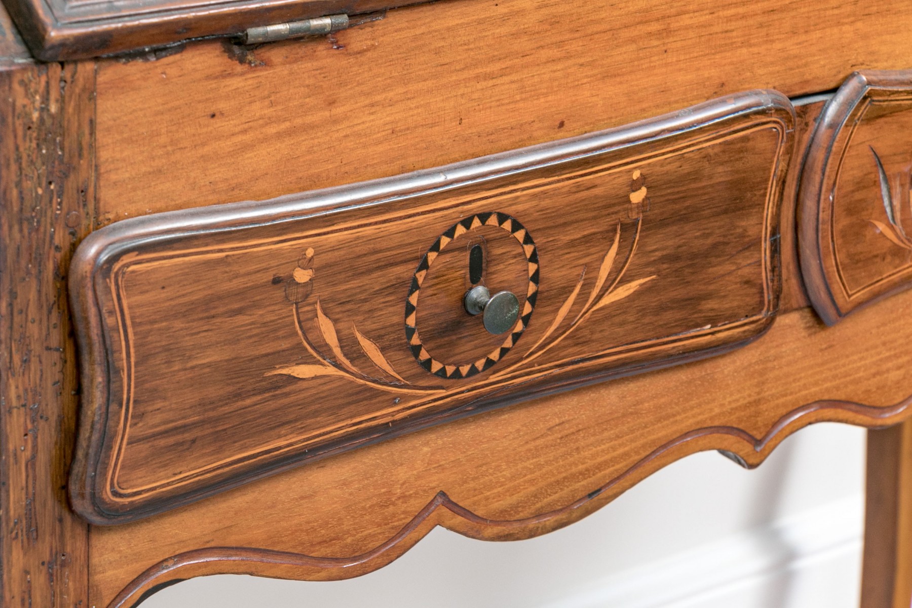 Condition: The hinge for the flip top writing desk on the right hand side is broken and needs to be replaced. The lip of the drop down writing surface is cracked all along the from left to right, it will need to be glued. There are other nics, chips and losses commensurate with age and use. Despite an excellent example of 18th century French craftsmanship and certainly worthy of restoration to restore to former glory.