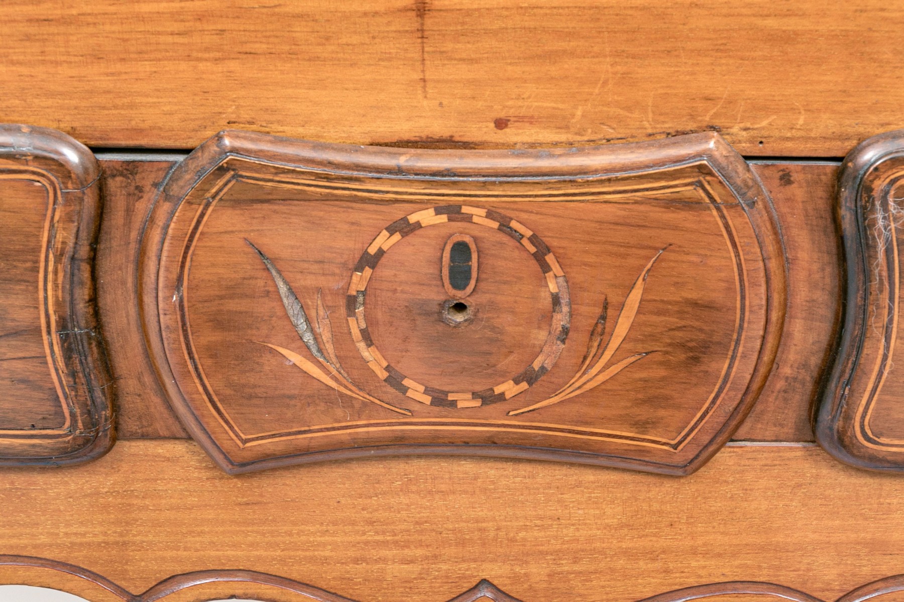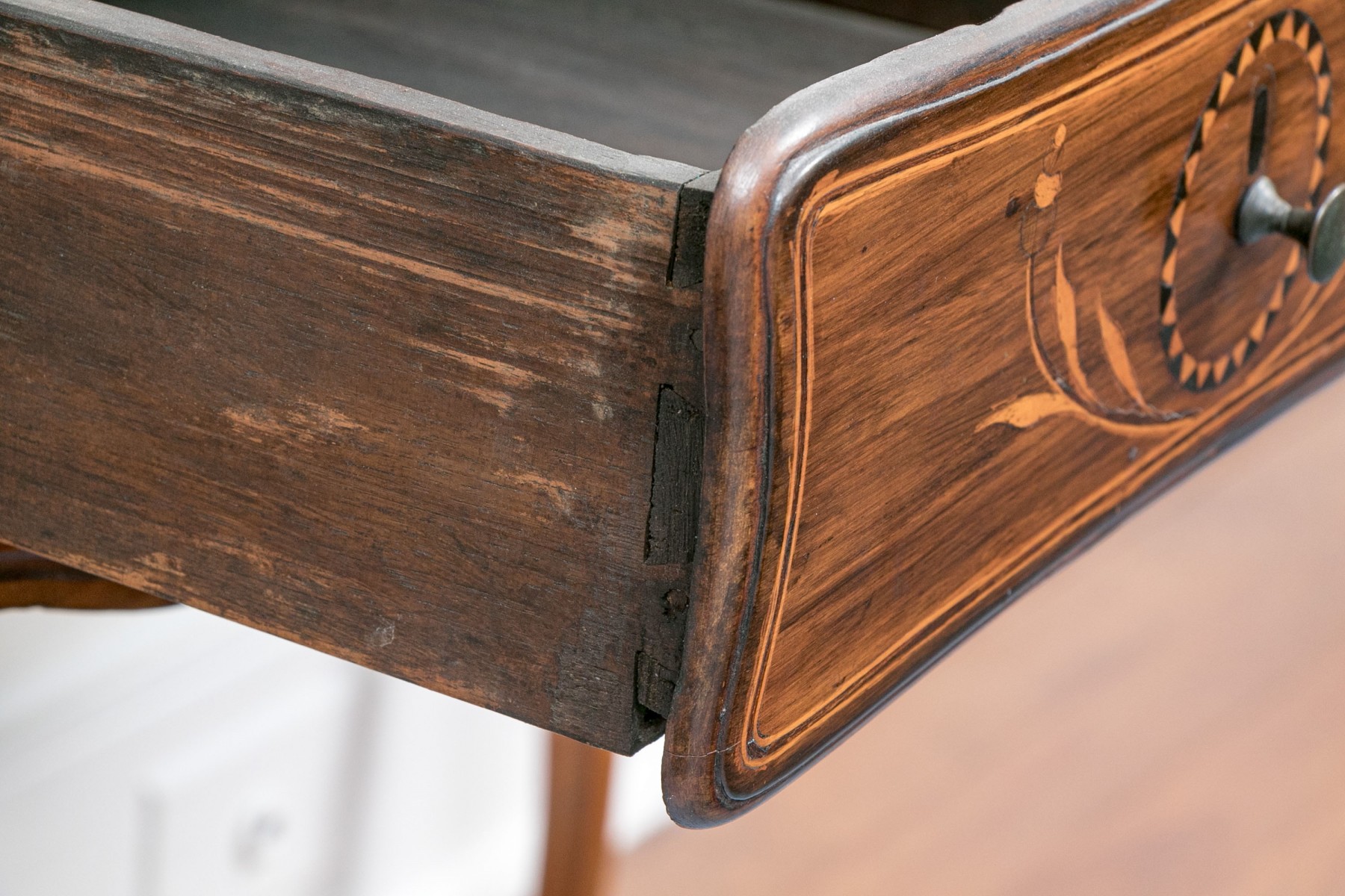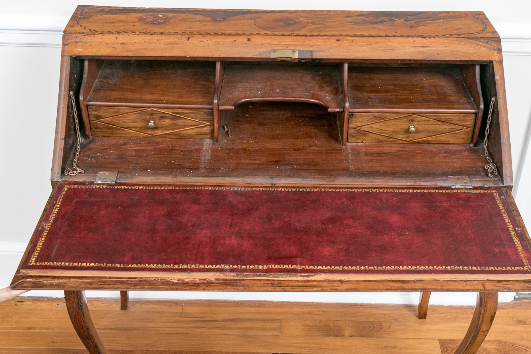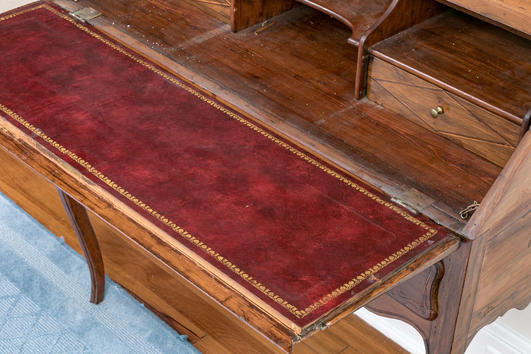 Condition: The hinge for the flip top writing desk on the right hand side is broken and needs to be replaced. The lip of the drop down writing surface is cracked all along the from left to right, it will need to be glued. There are other nics, chips and losses commensurate with age and use. Despite an excellent example of 18th century French craftsmanship and certainly worthy of restoration to restore to former glory.