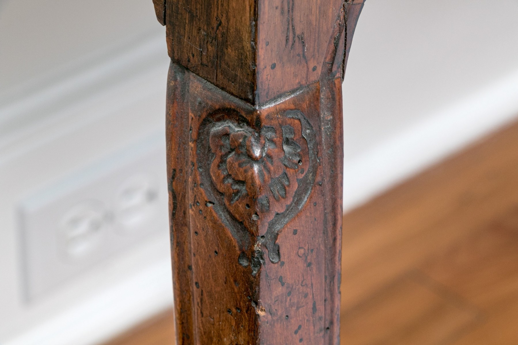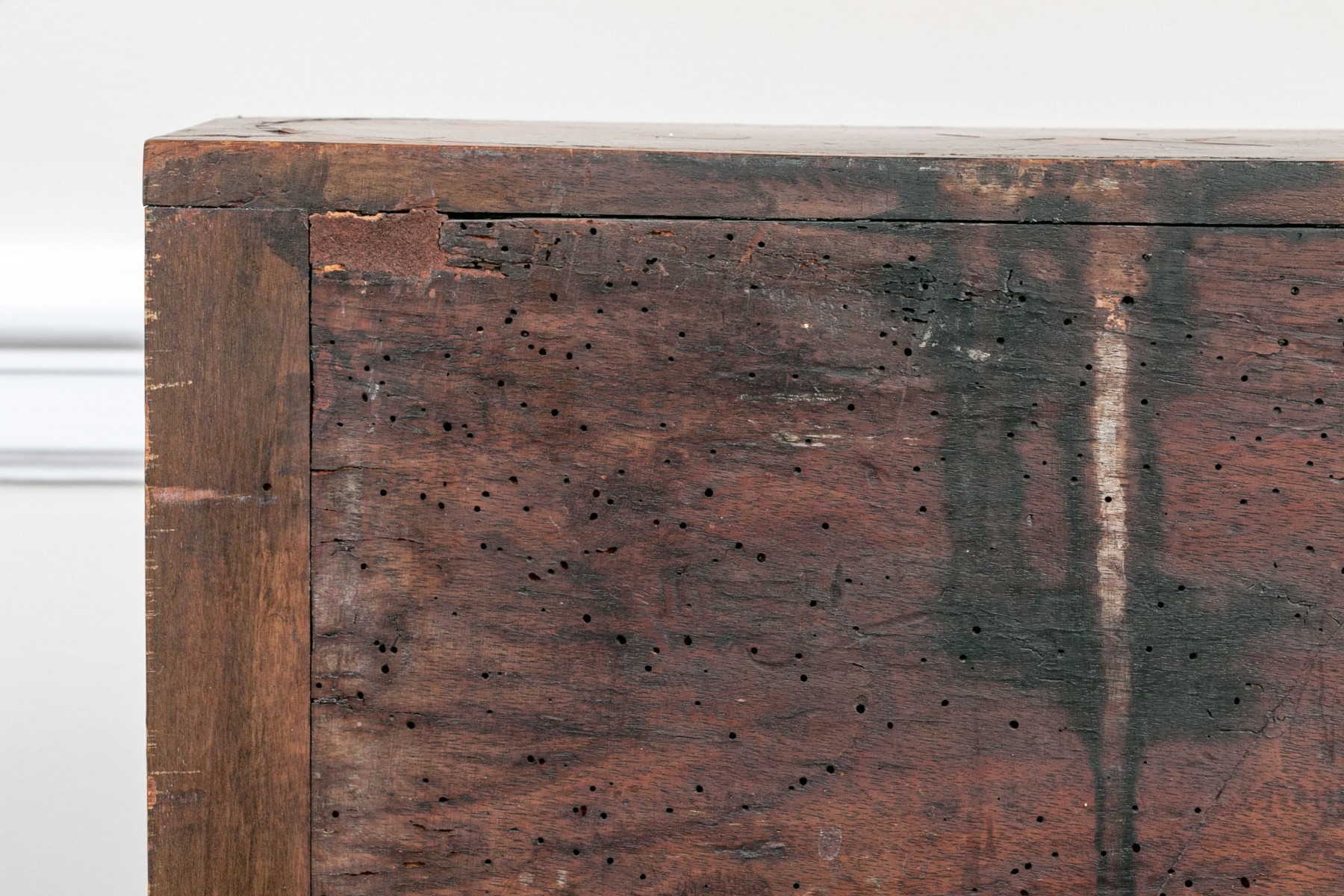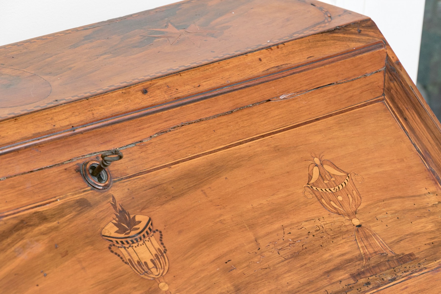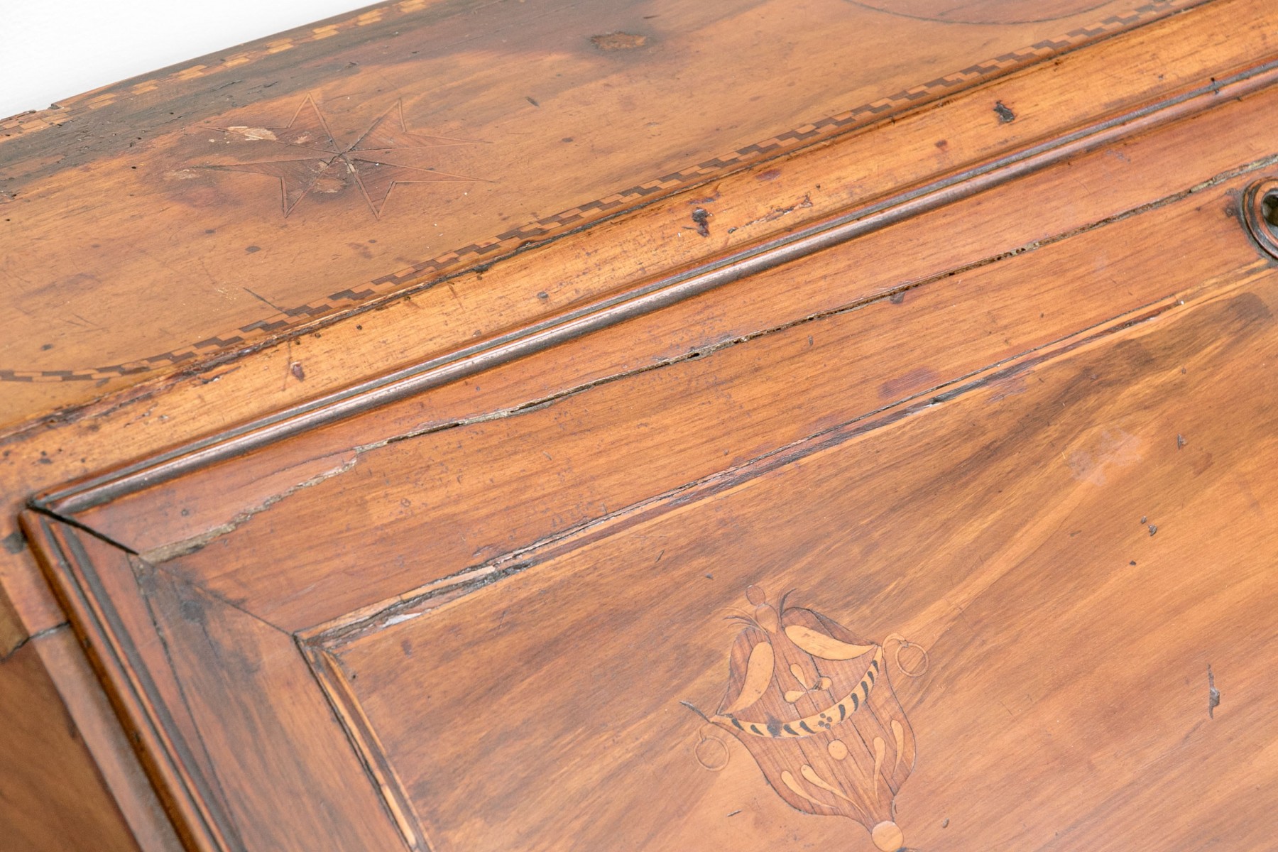 Condition: The hinge for the flip top writing desk on the right hand side is broken and needs to be replaced. The lip of the drop down writing surface is cracked all along the from left to right, it will need to be glued. There are other nics, chips and losses commensurate with age and use. Despite an excellent example of 18th century French craftsmanship and certainly worthy of restoration to restore to former glory.