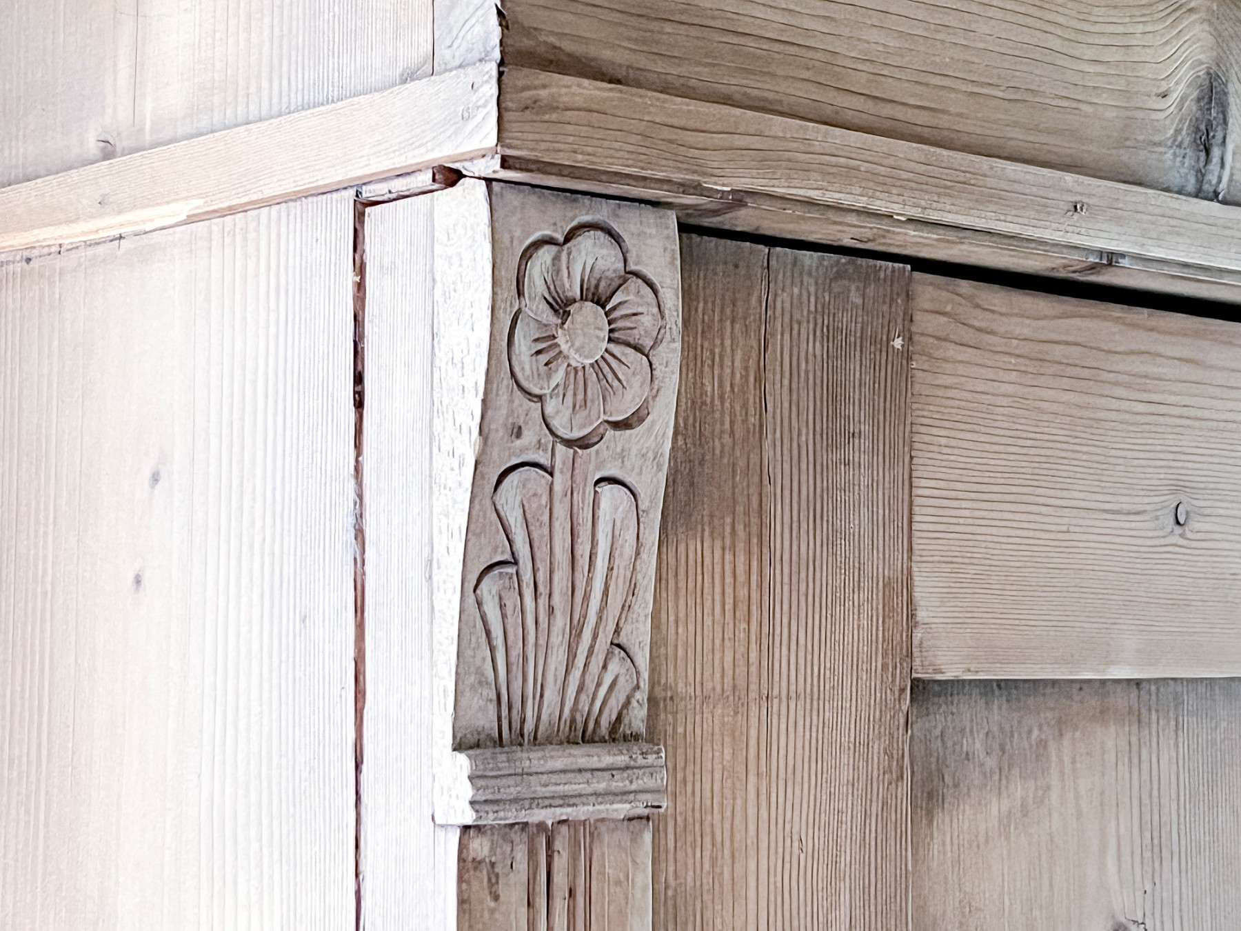 The large cornice gracefully crowns the piece, leading the eye to the double doors adorned with beautifully carved floral medallions. Practicality meets elegance with the inclusion of a spacious lower drawer, all resting on bun-style feet.