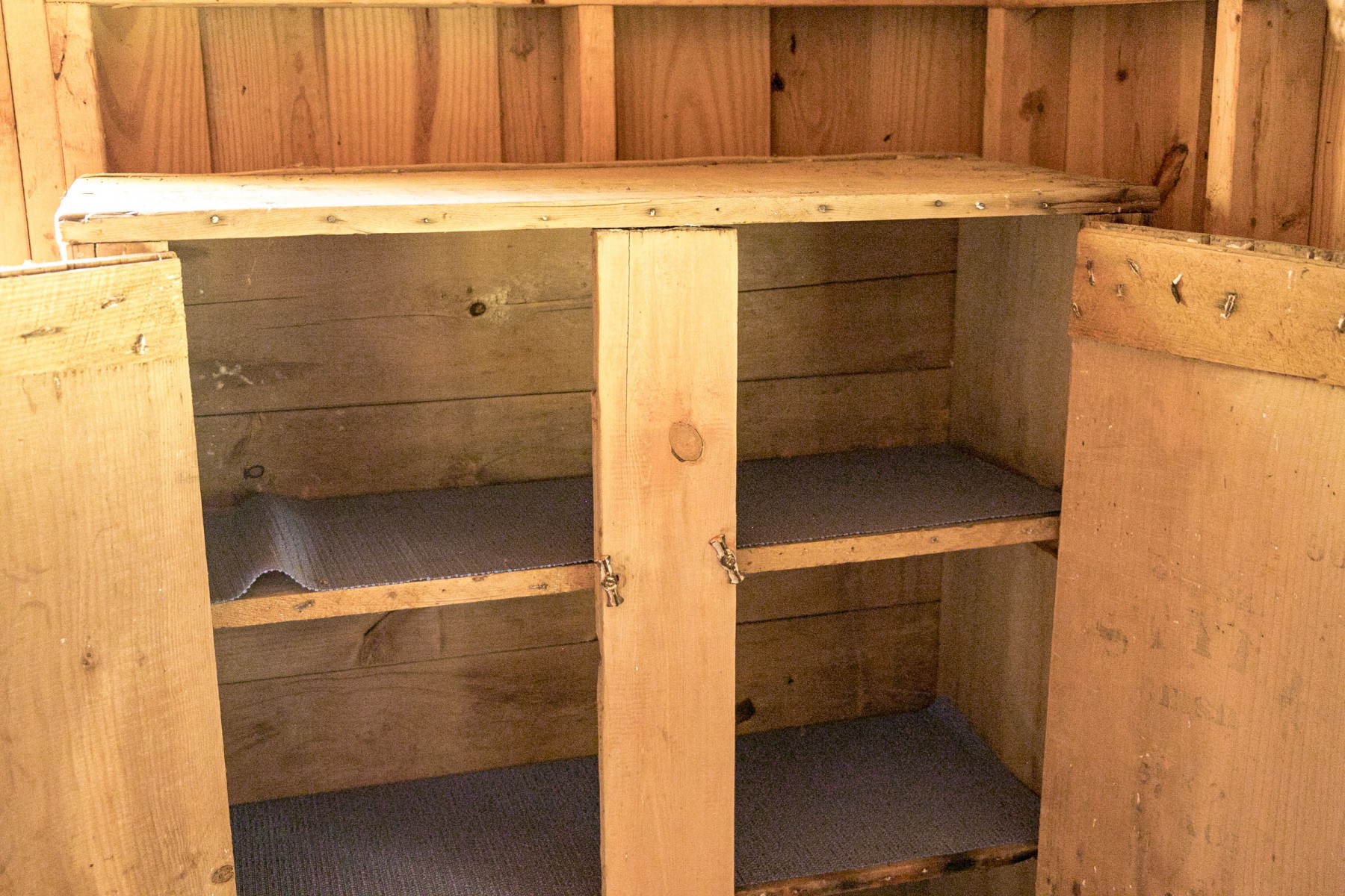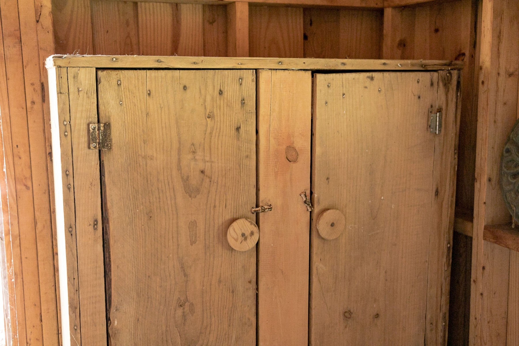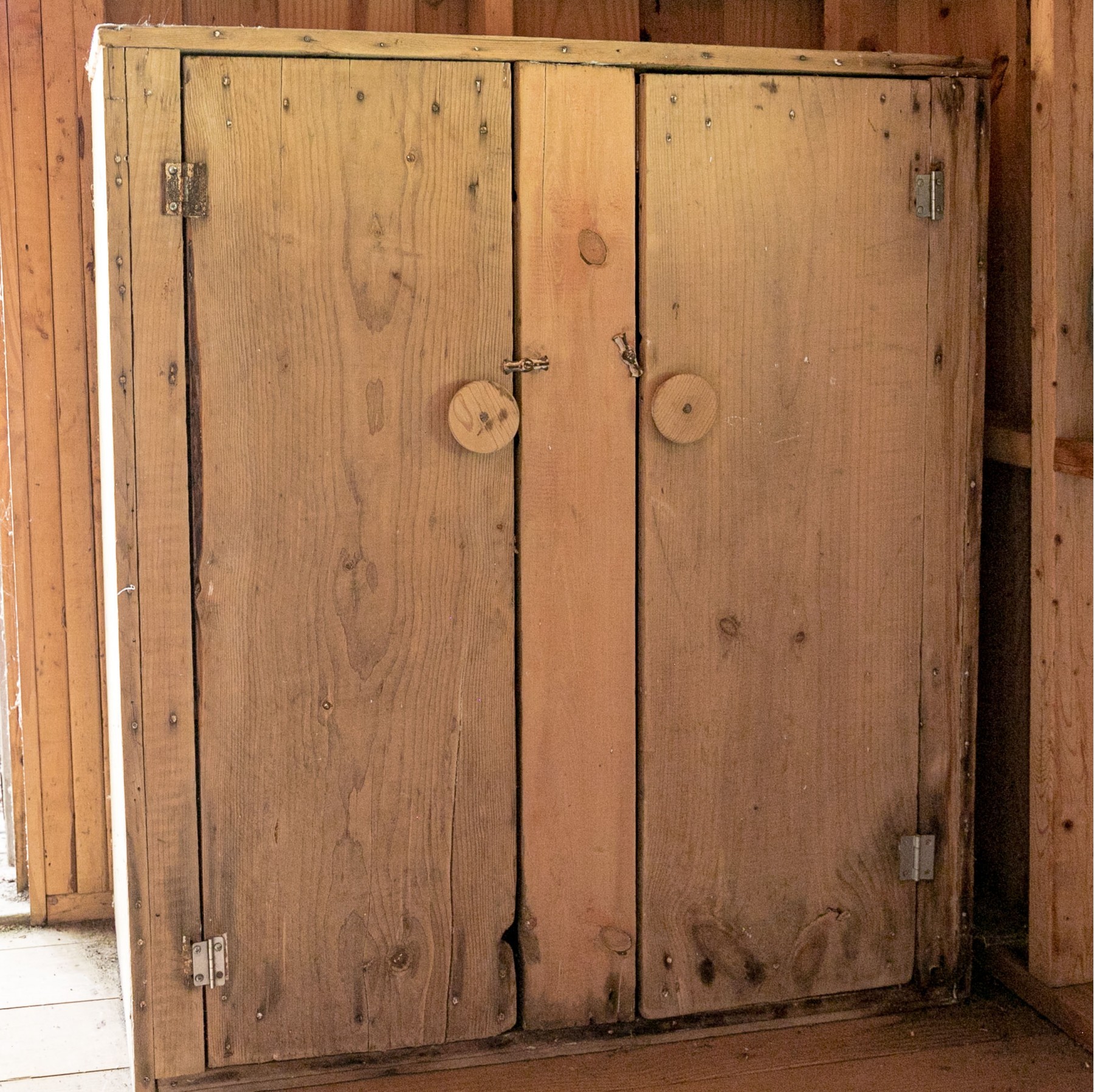 An antique pine storage cabinet, in rectangular form and showcasing a rich pine exterior, featuring two hinged doors accented with circular knobs which open to reveal a hollow interior lined with shelving for storage.