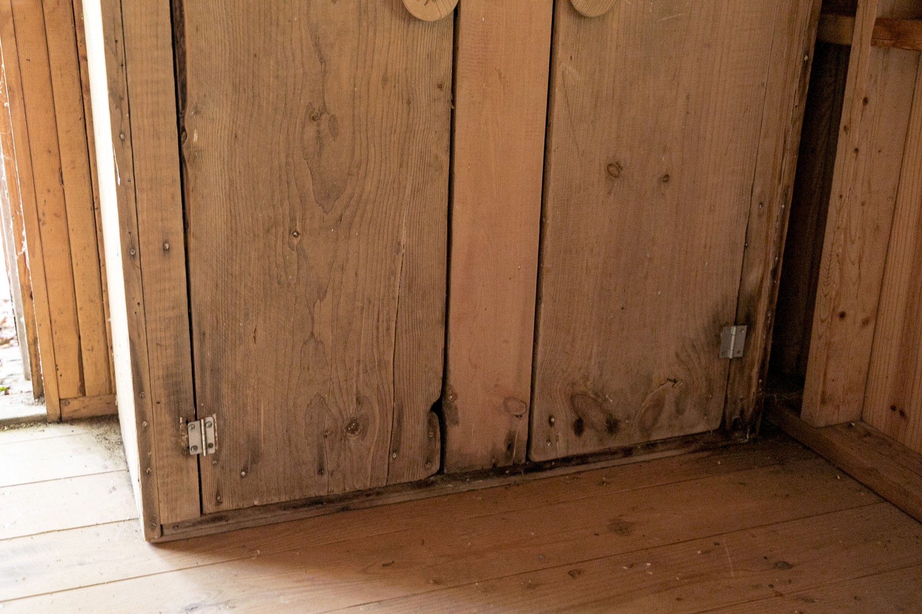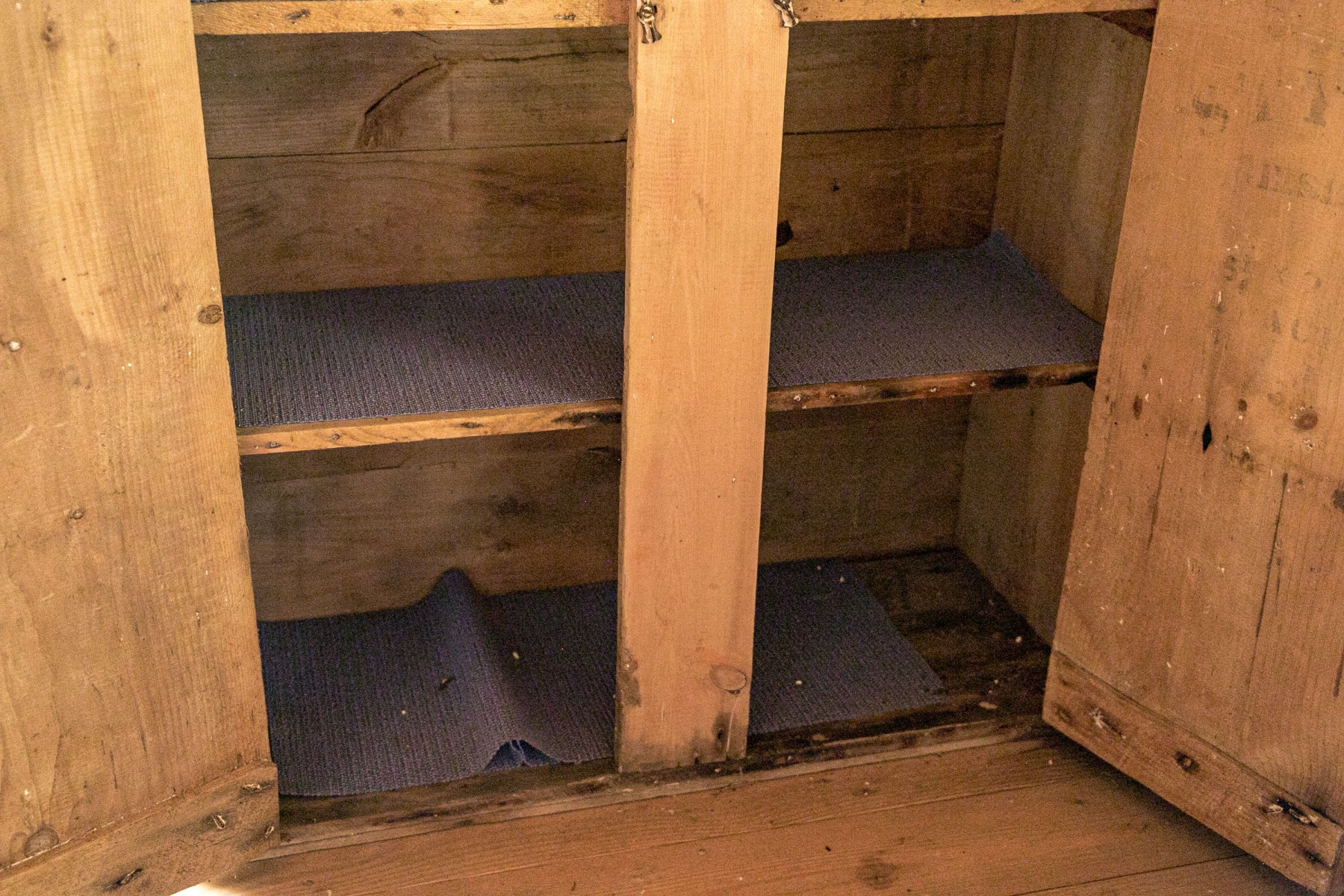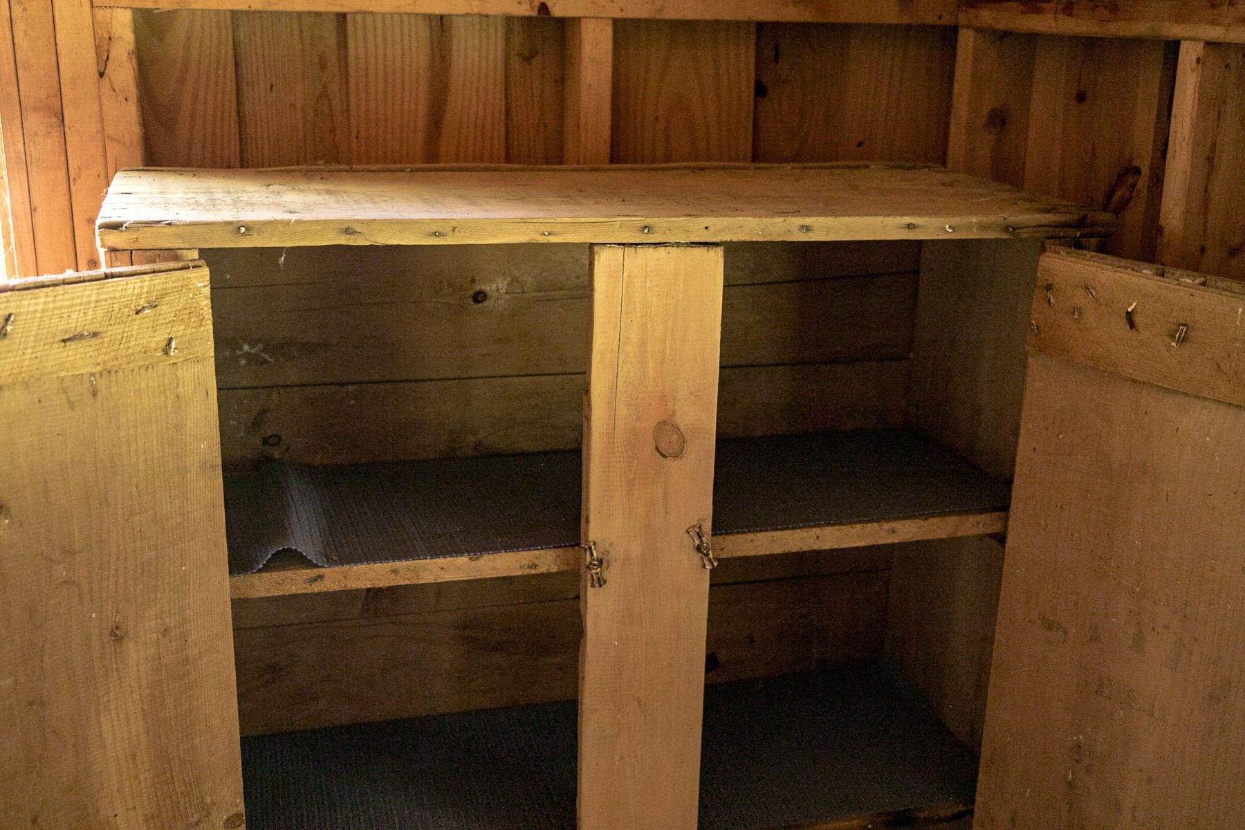An antique pine storage cabinet, in rectangular form and showcasing a rich pine exterior, featuring two hinged doors accented with circular knobs which open to reveal a hollow interior lined with shelving for storage.