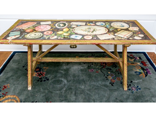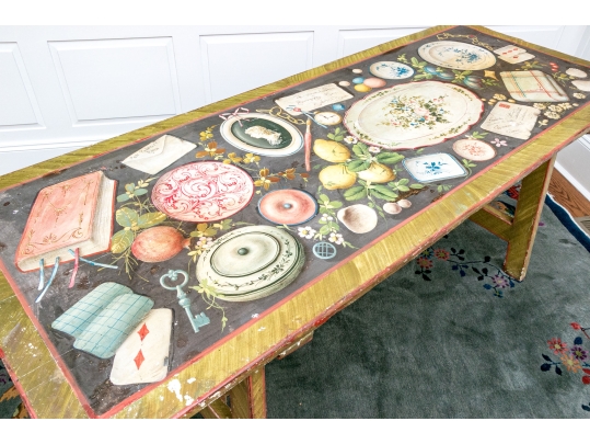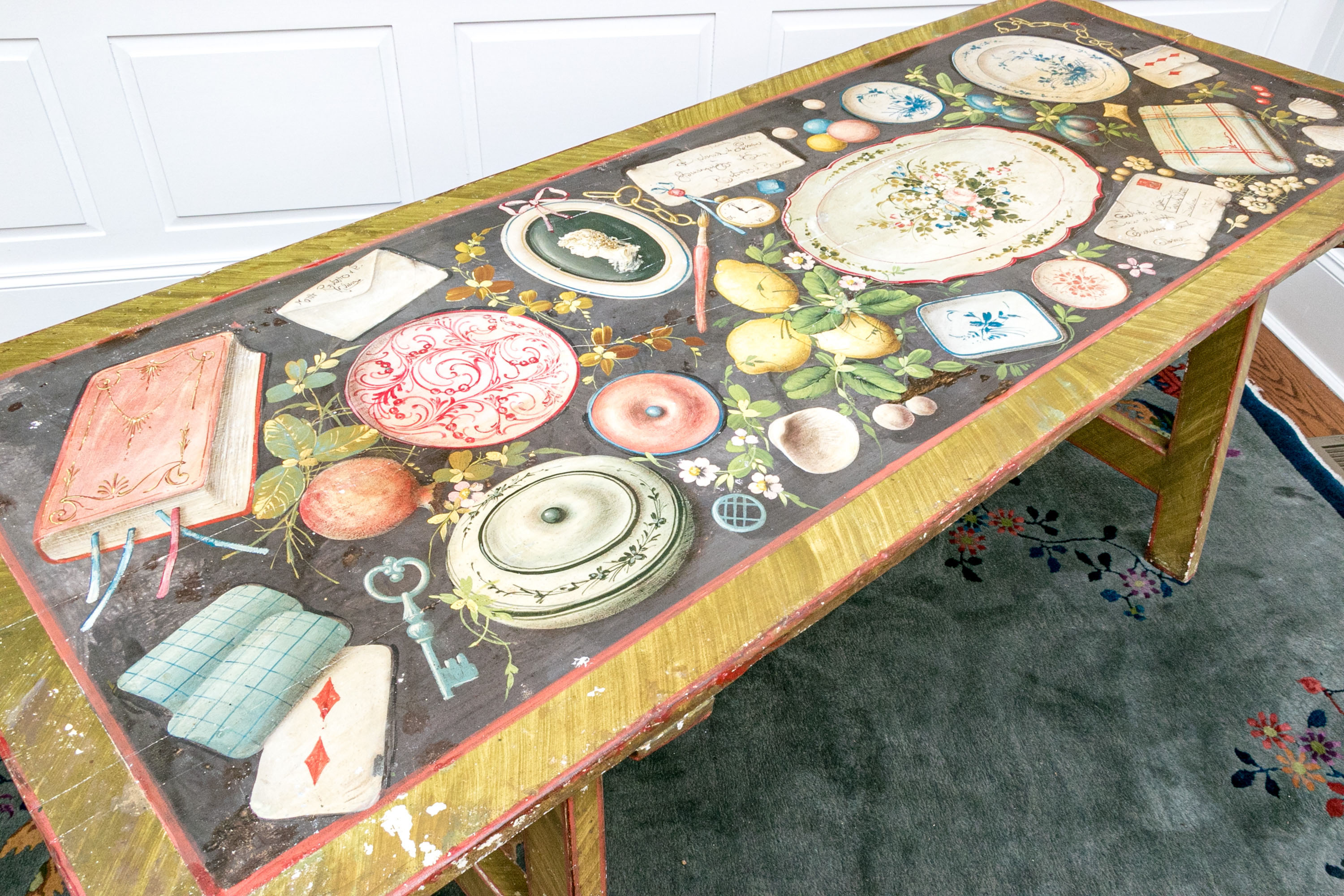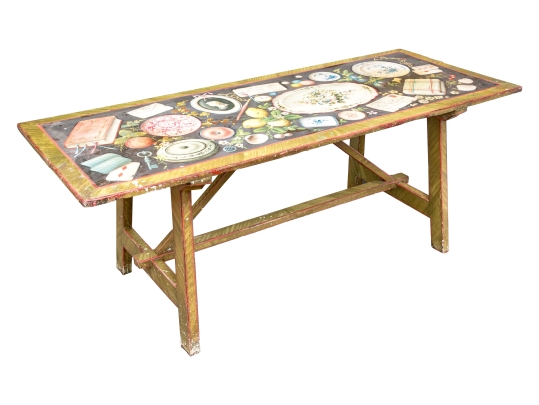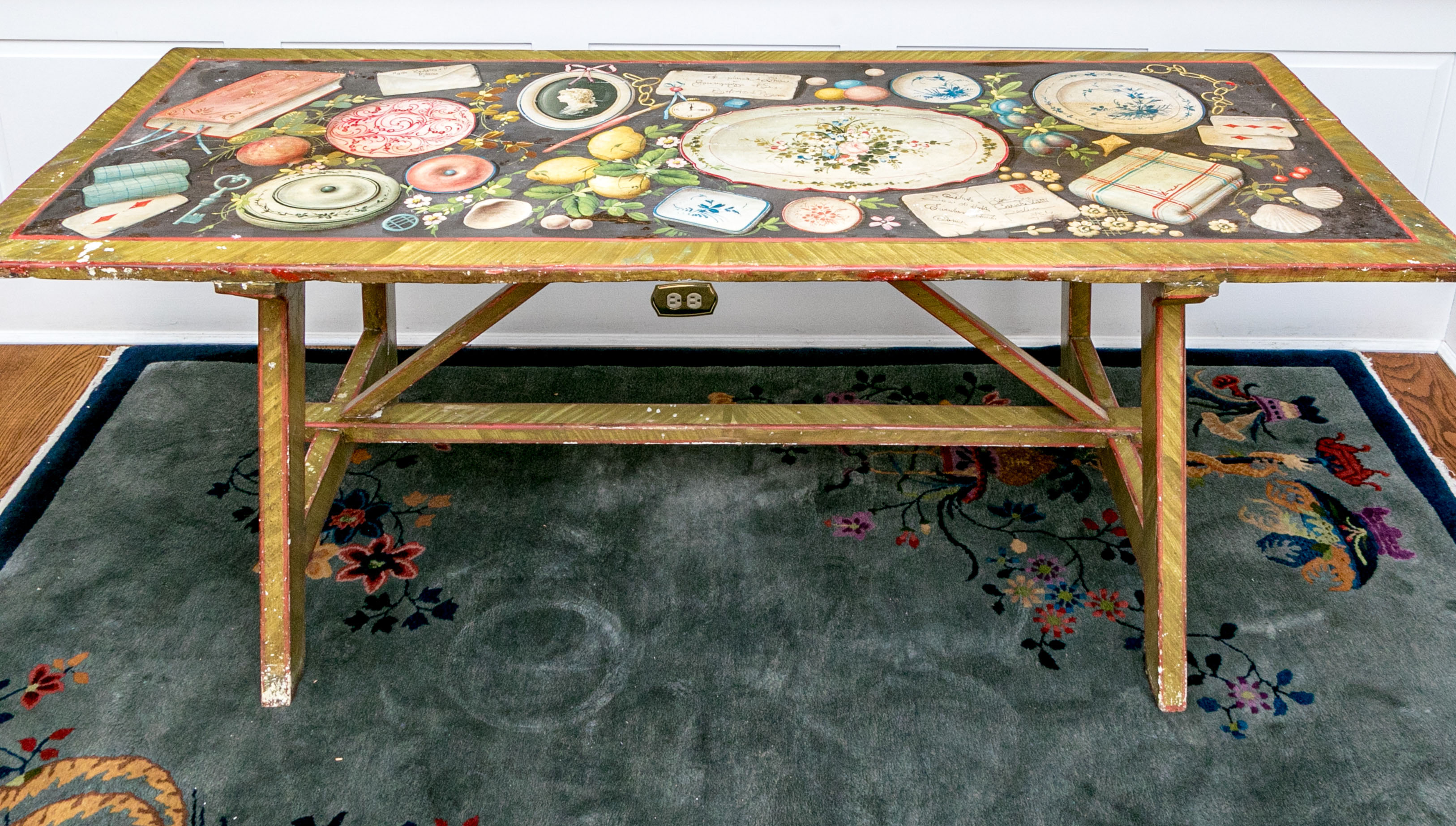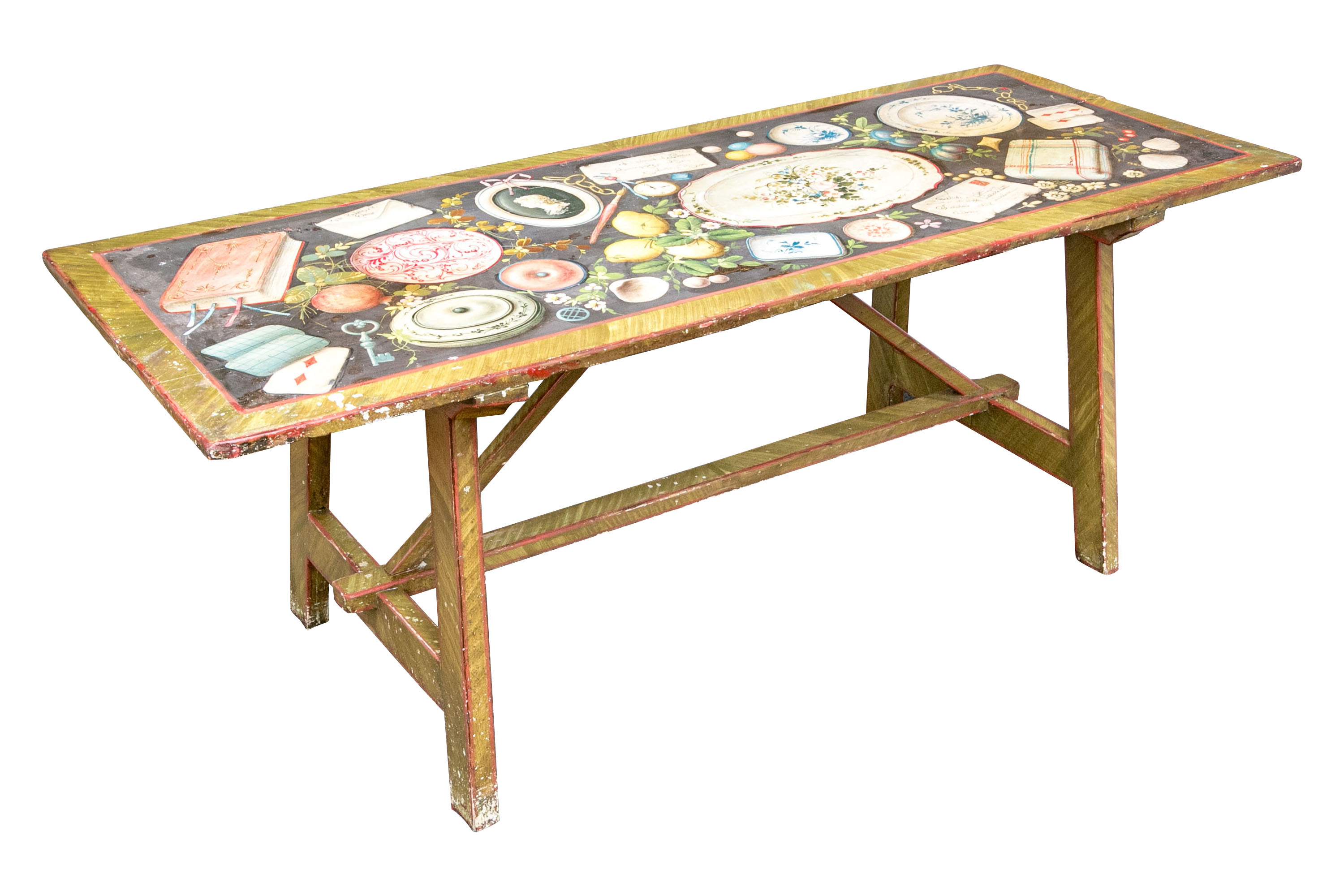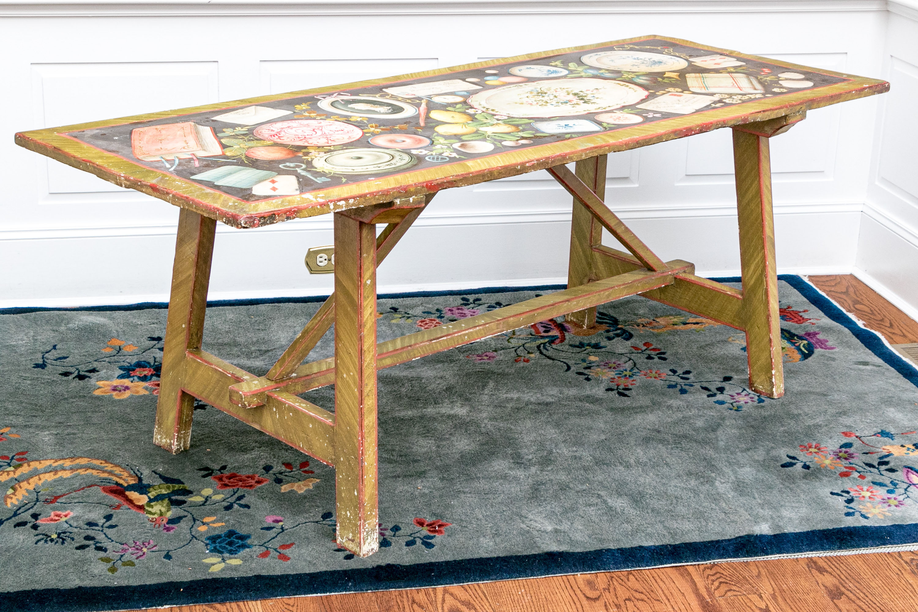 A polychrome painted wood table with a green frame with red edges. The rectangular top with a trompe l'oeil panel, depicting a scattering of various porcelain plates, playing cards, flowers, stationery, et al. Raised on tapering square supports joined by a trestle base with an A-form stretcher.