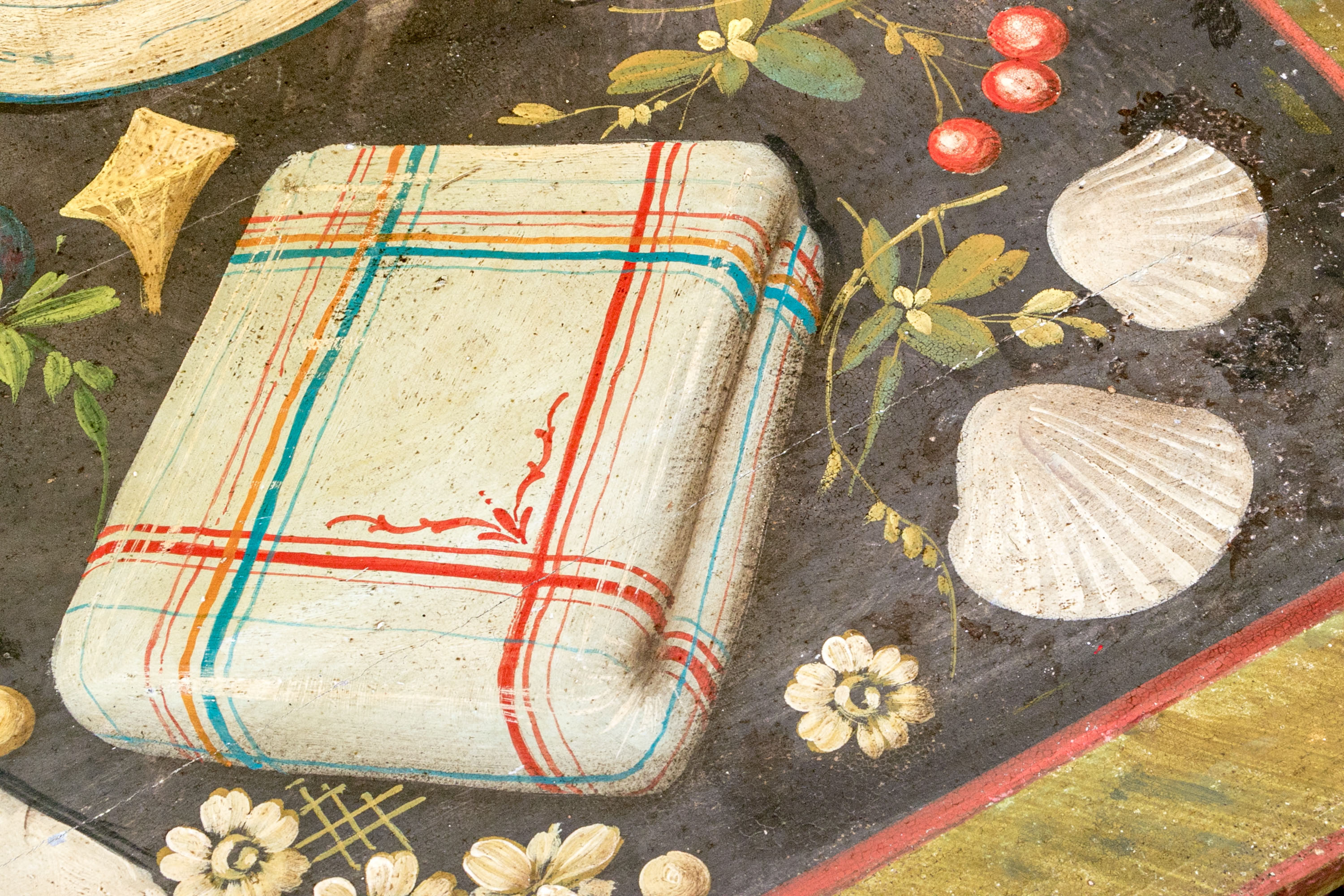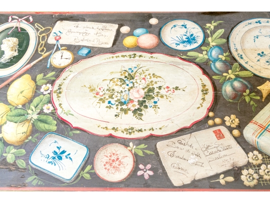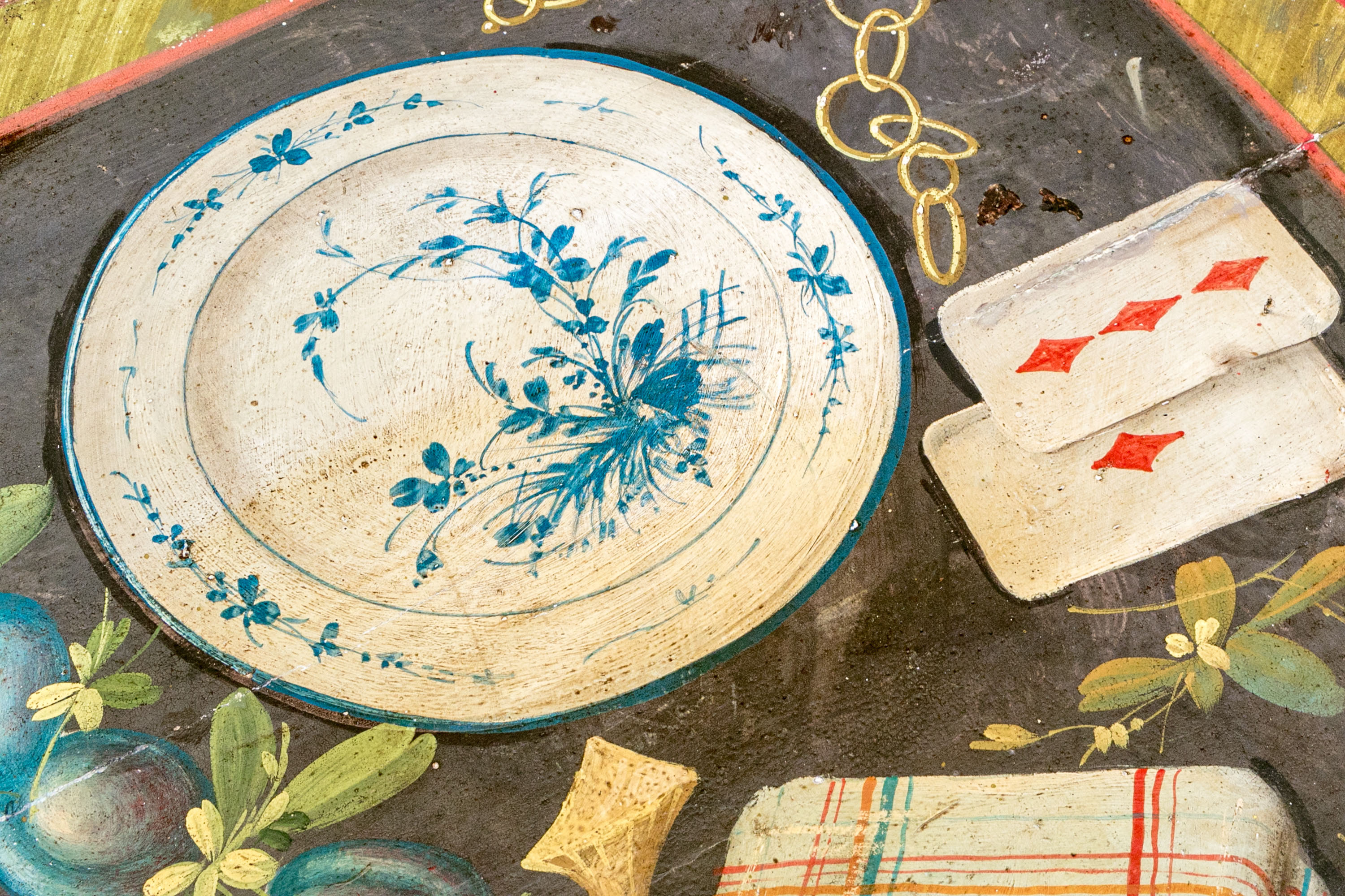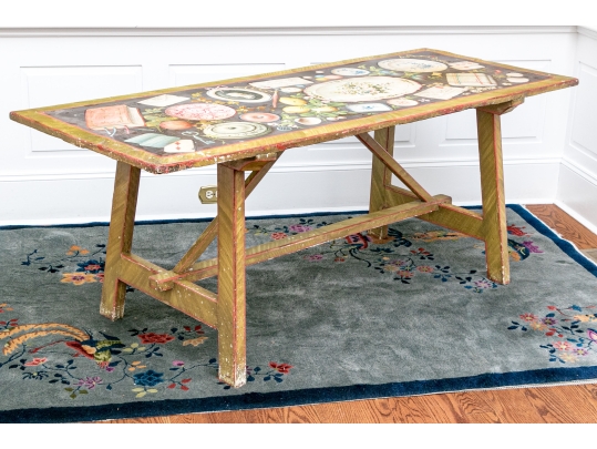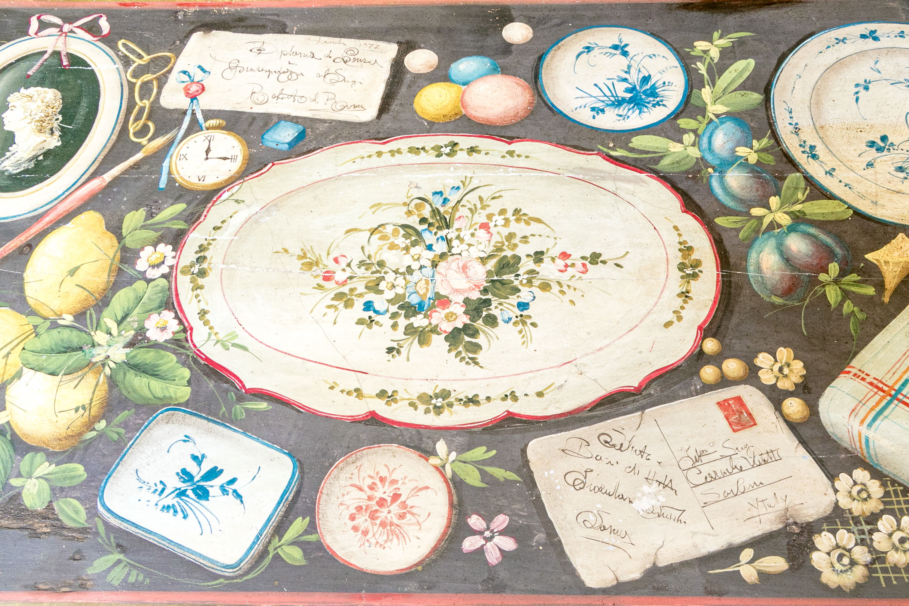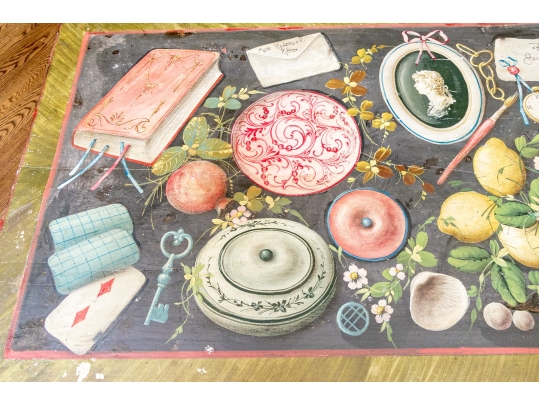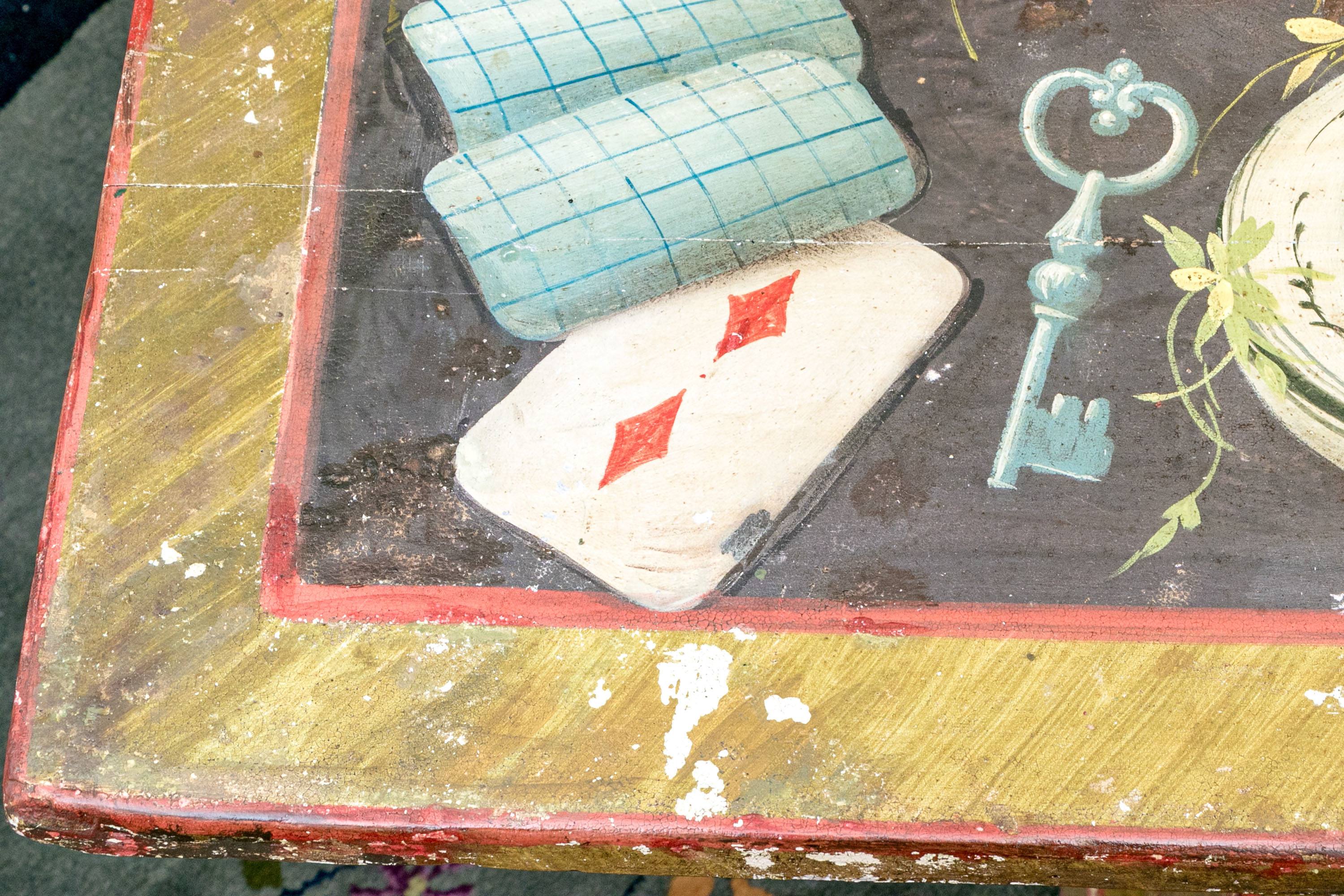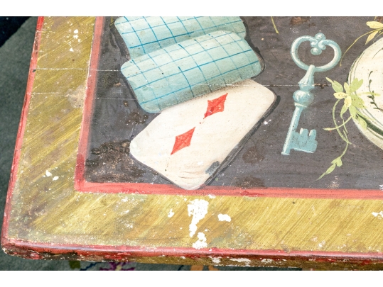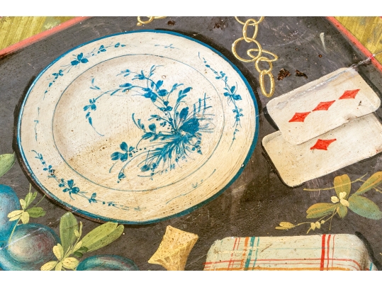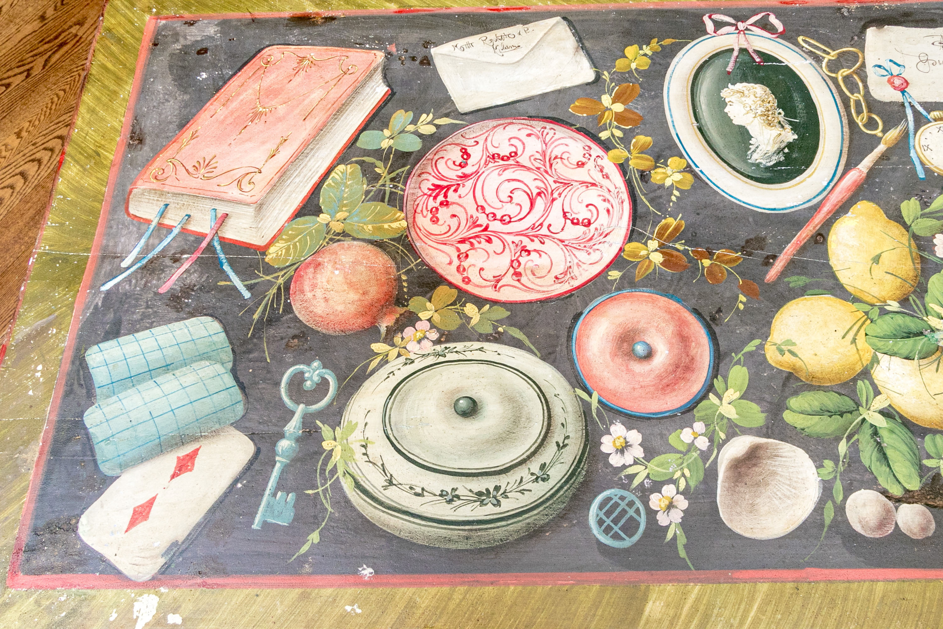 A polychrome painted wood table with a green frame with red edges. The rectangular top with a trompe l'oeil panel, depicting a scattering of various porcelain plates, playing cards, flowers, stationery, et al. Raised on tapering square supports joined by a trestle base with an A-form stretcher.